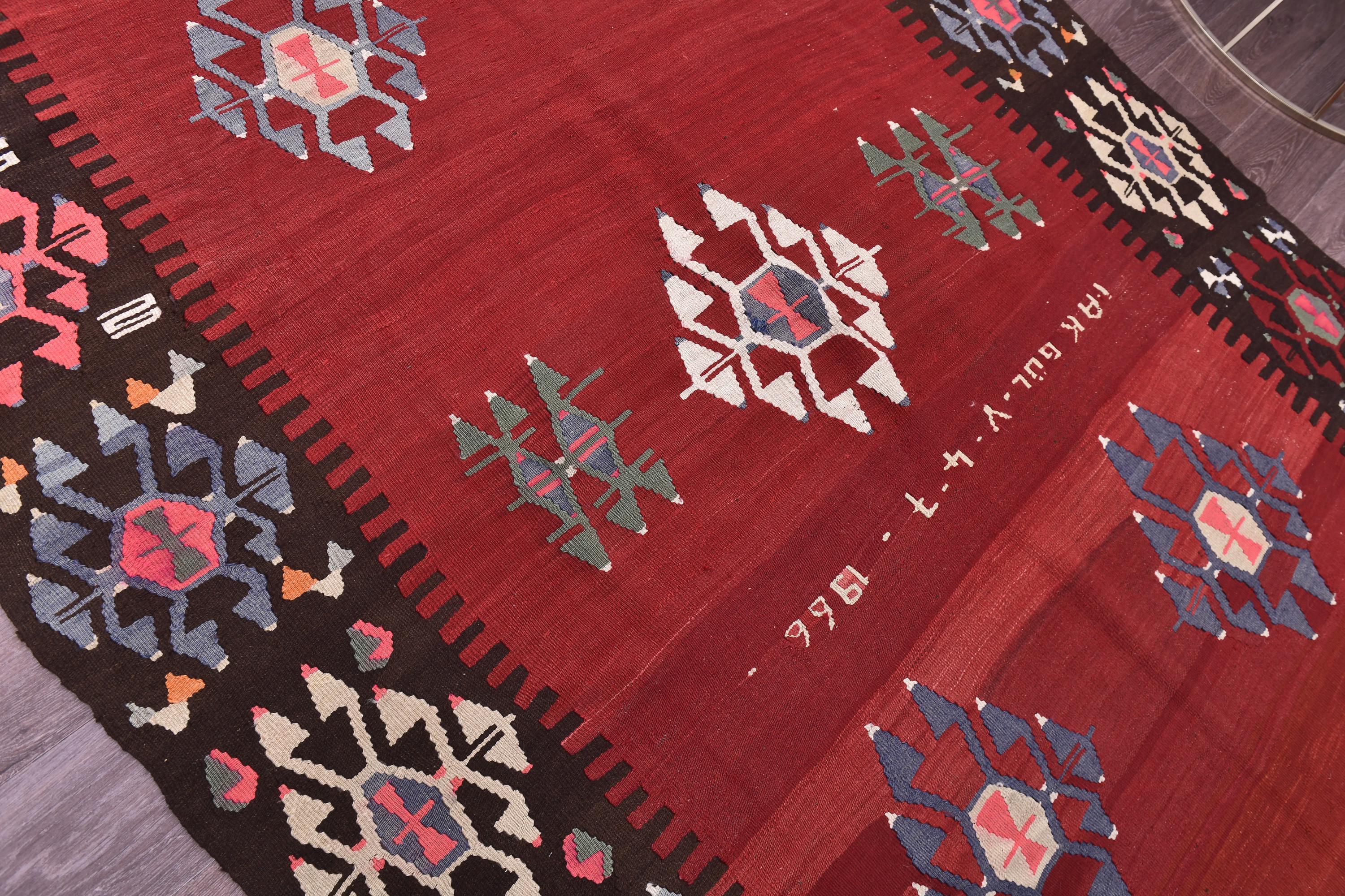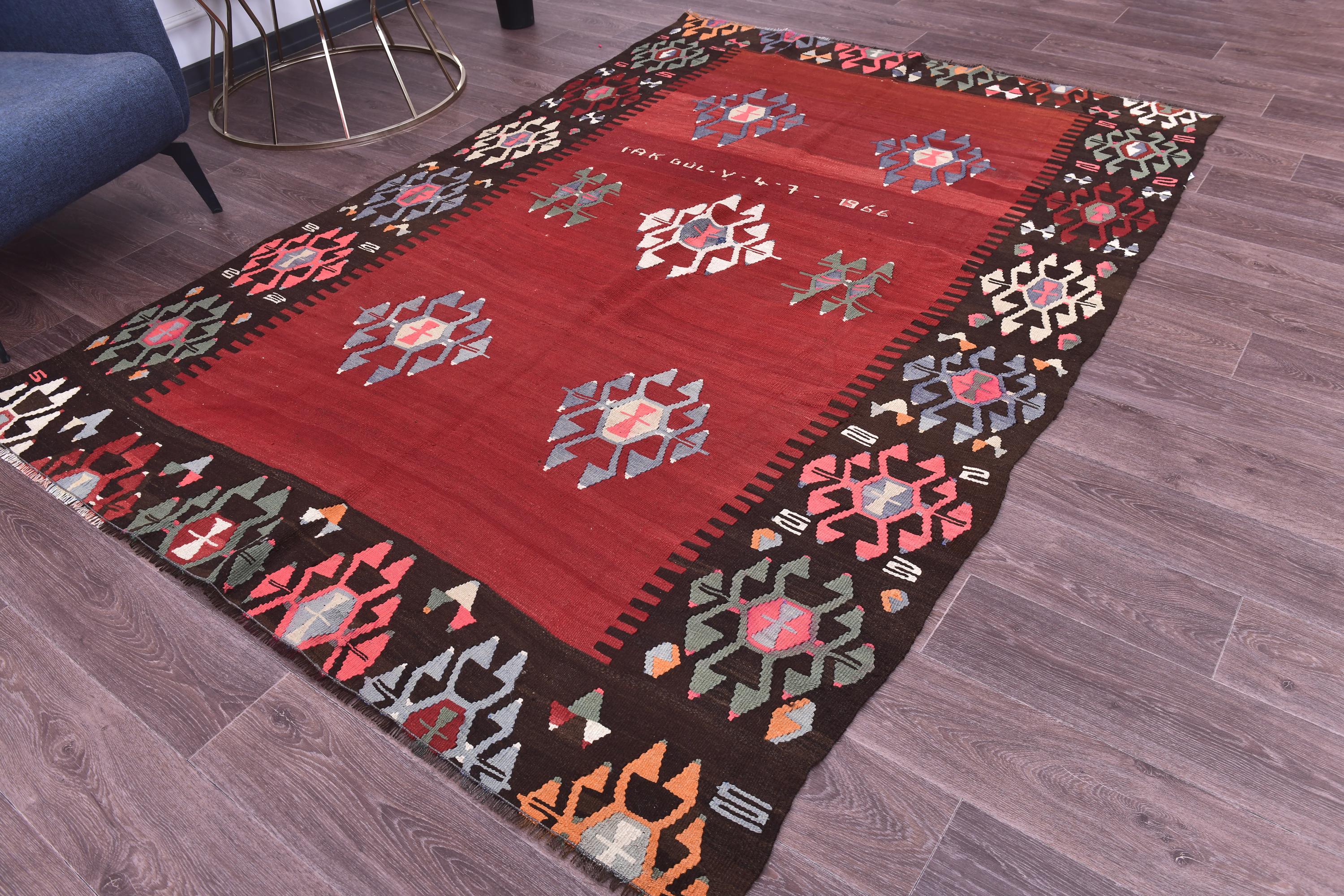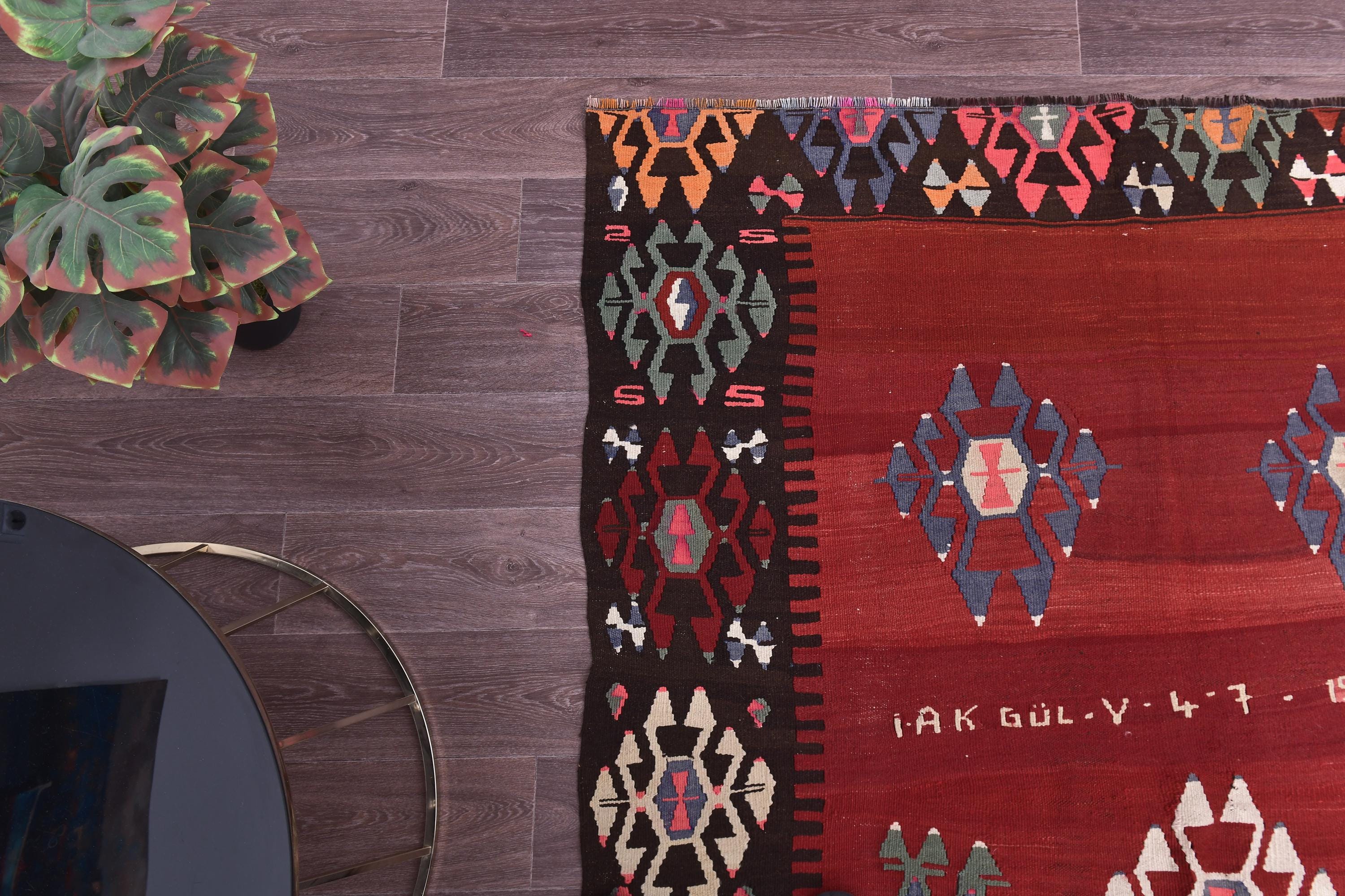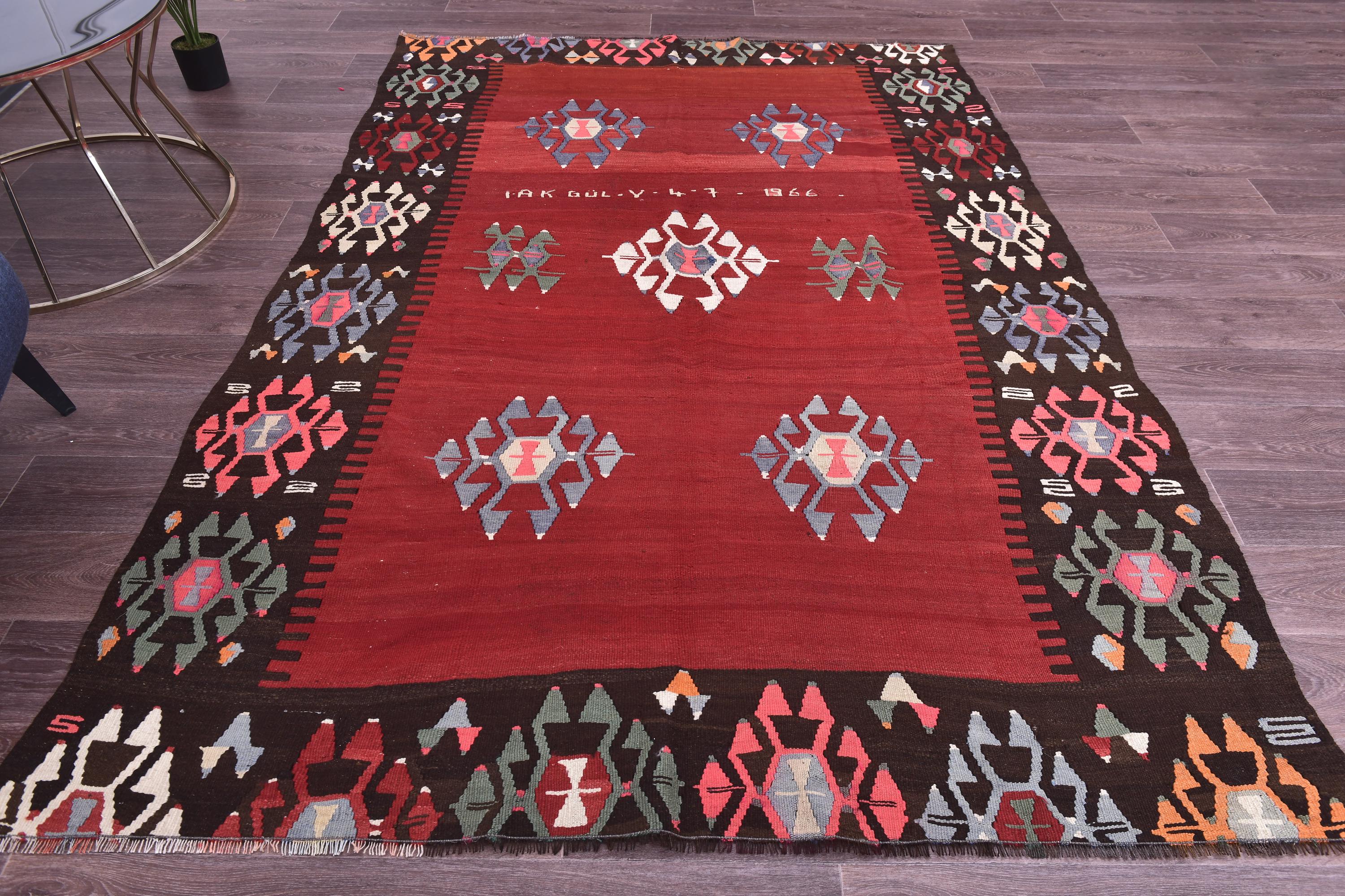 5x8 1966 Antique Turkish Kilim Rug, 5x8 Handmade Turkish Rug, Signed Kilim Rug, 5x8 Wool Jute Kilim Rug, Red Black Color, Living Room Rug