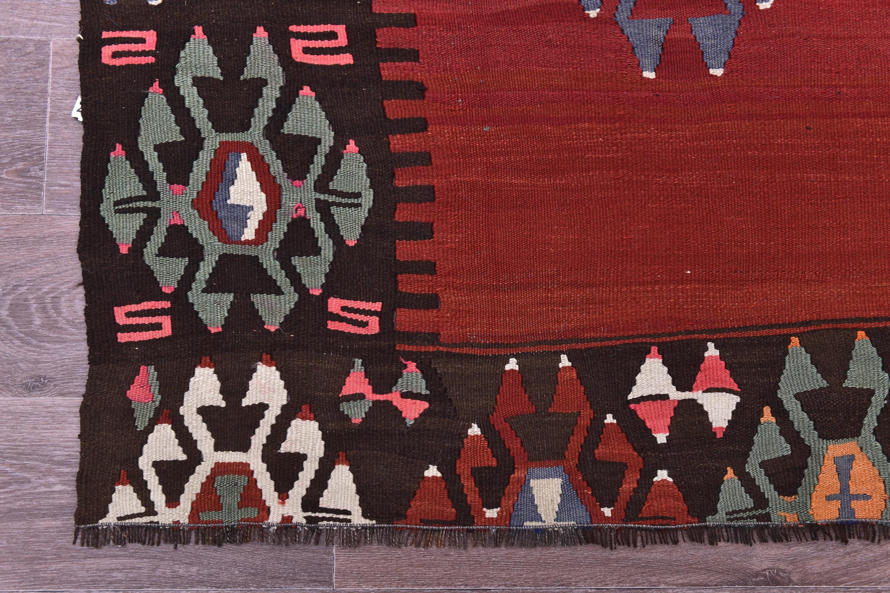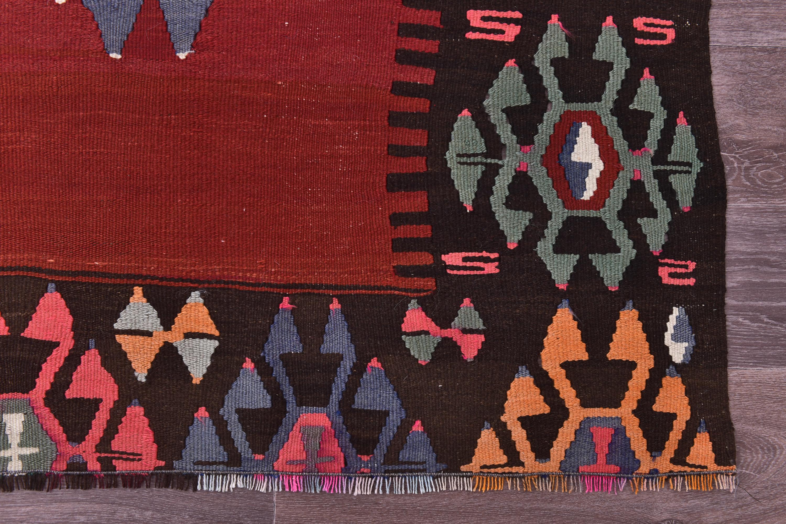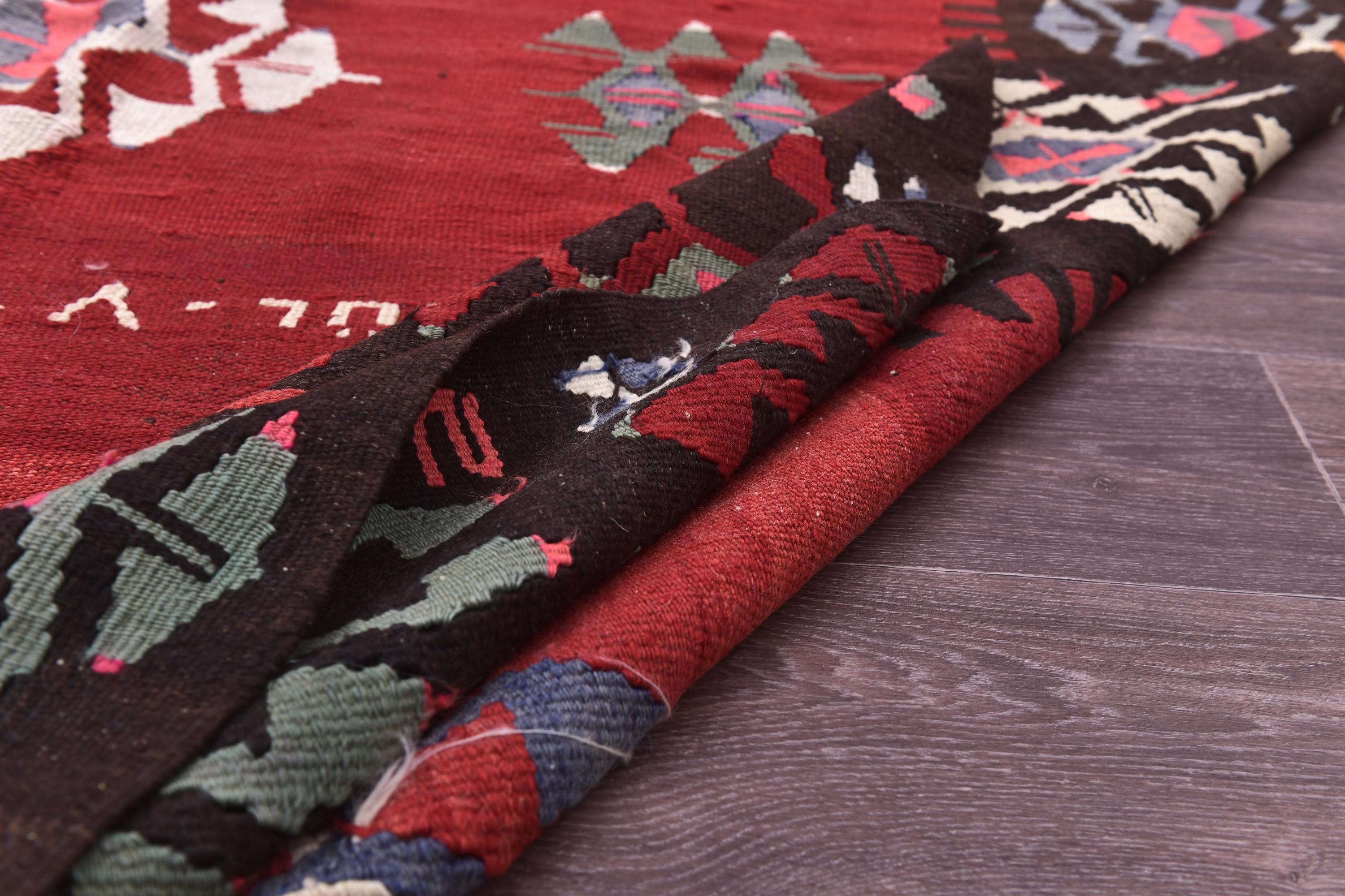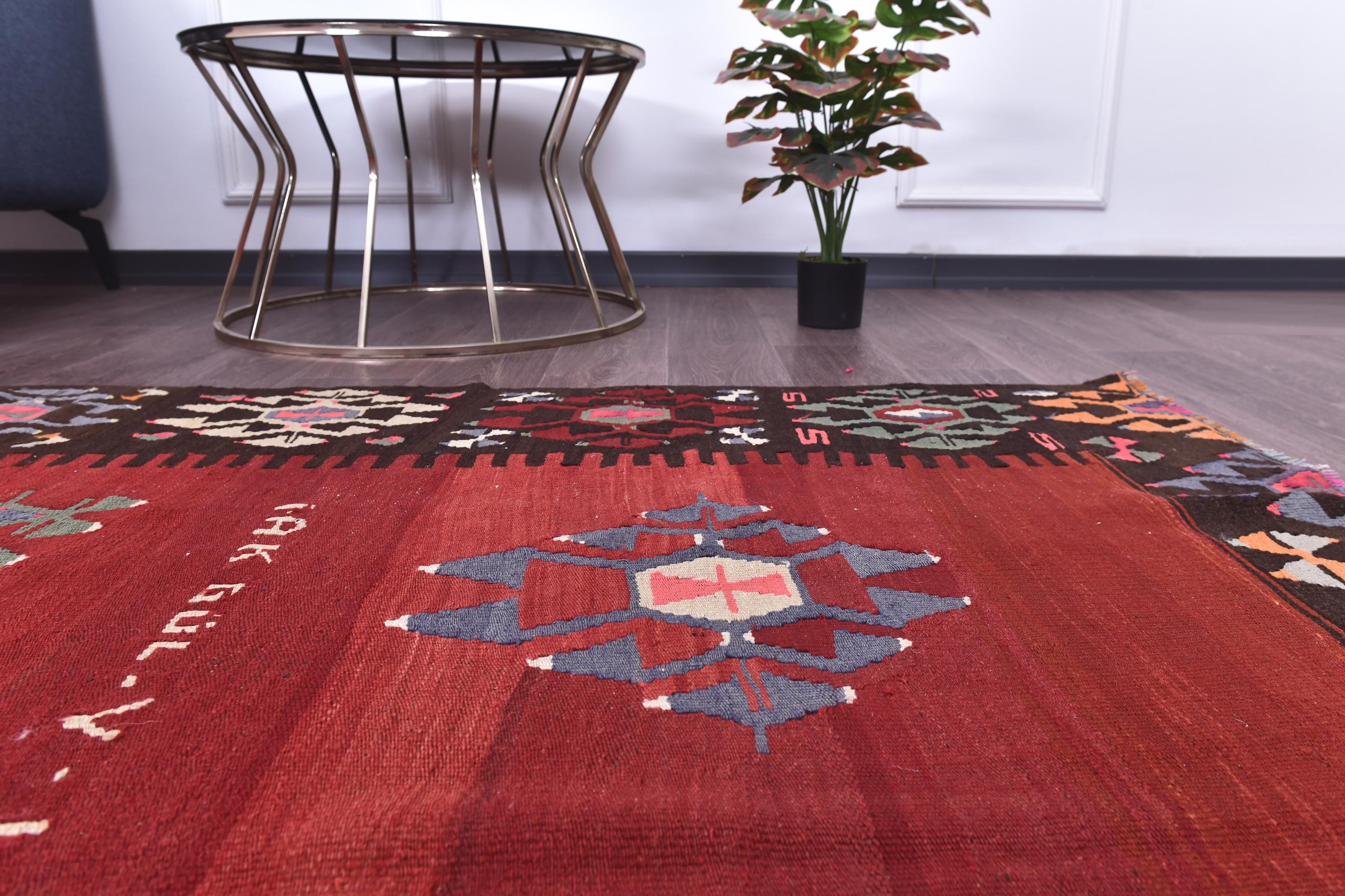 5x8 1966 Antique Turkish Kilim Rug, 5x8 Handmade Turkish Rug, Signed Kilim Rug, 5x8 Wool Jute Kilim Rug, Red Black Color, Living Room Rug