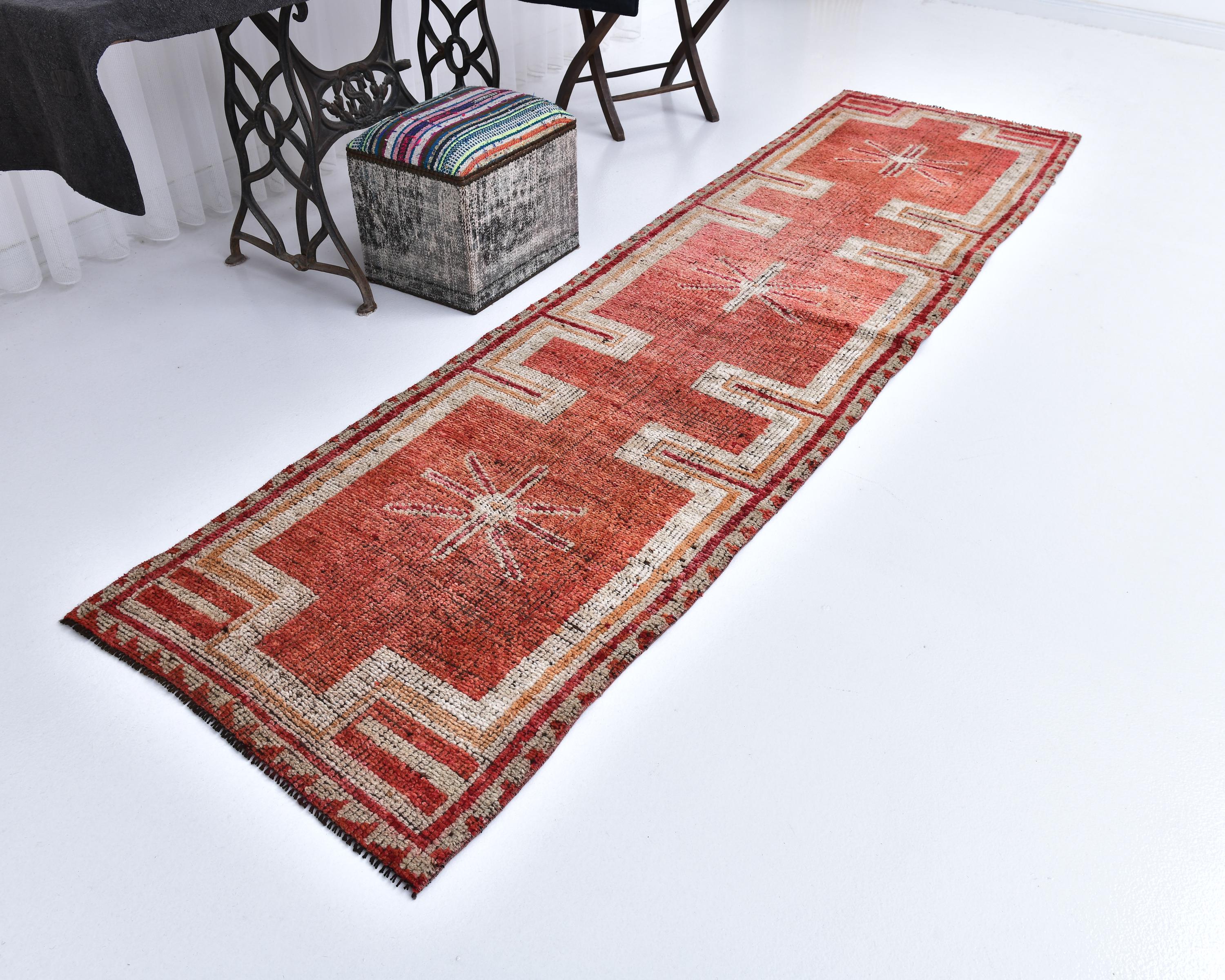 3x11 Red Beige Vintage Runner Rug, 3x11 Vintage Runner, 3x11 Rug, Wool Hand Woven Rug, 3x11 Runner Rug, 3x11 Herki Runner, Farmhouse Hallway