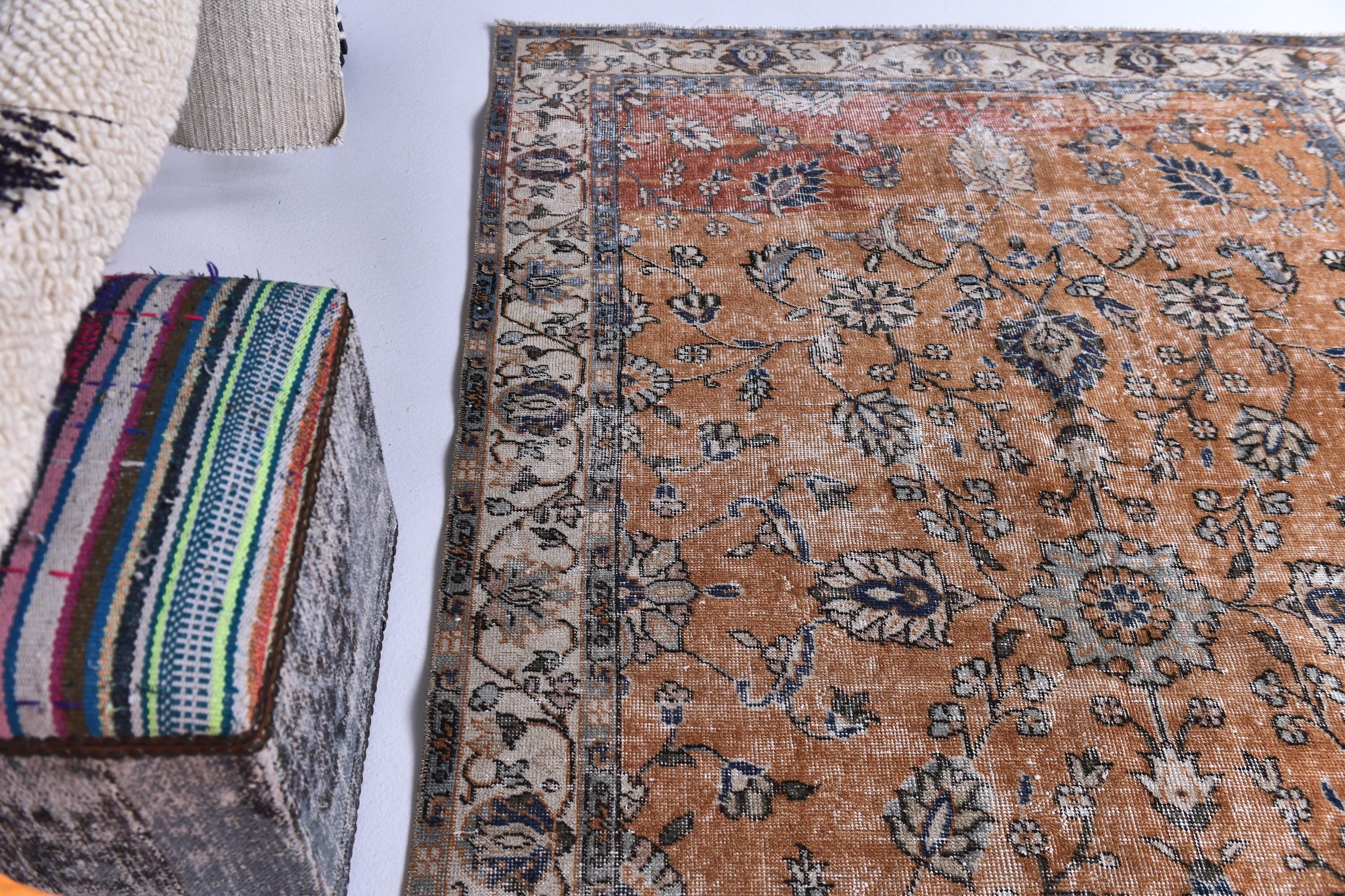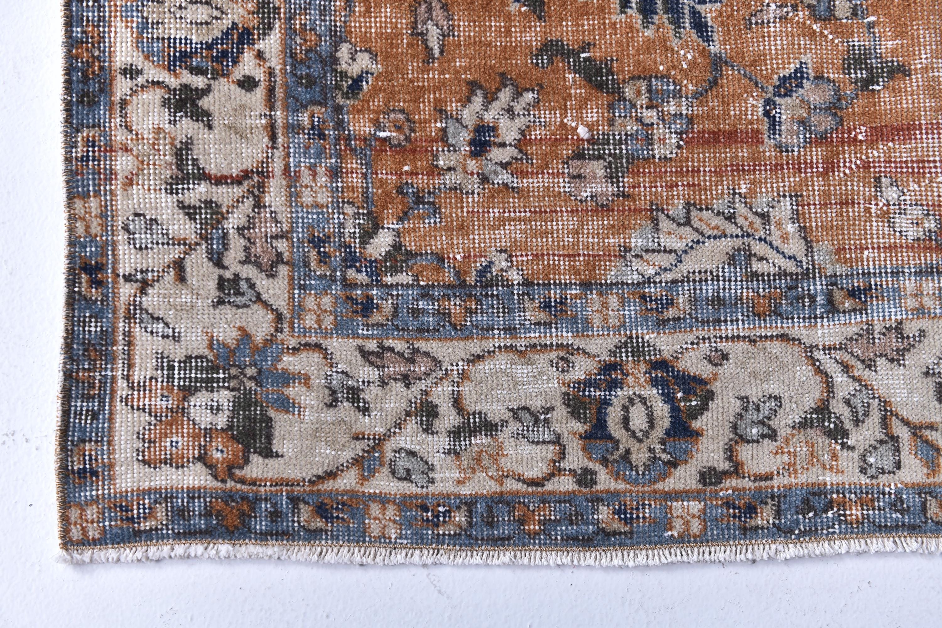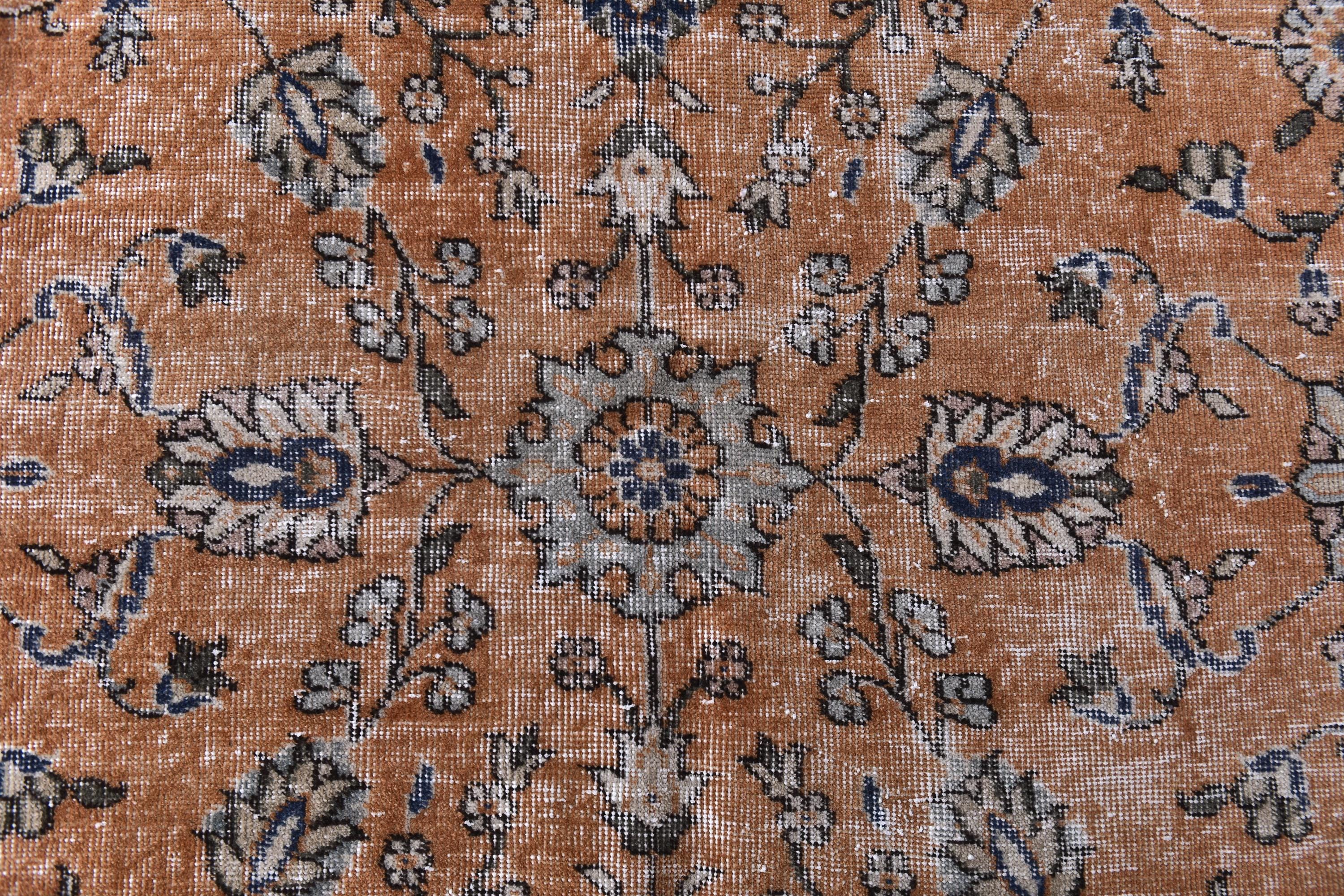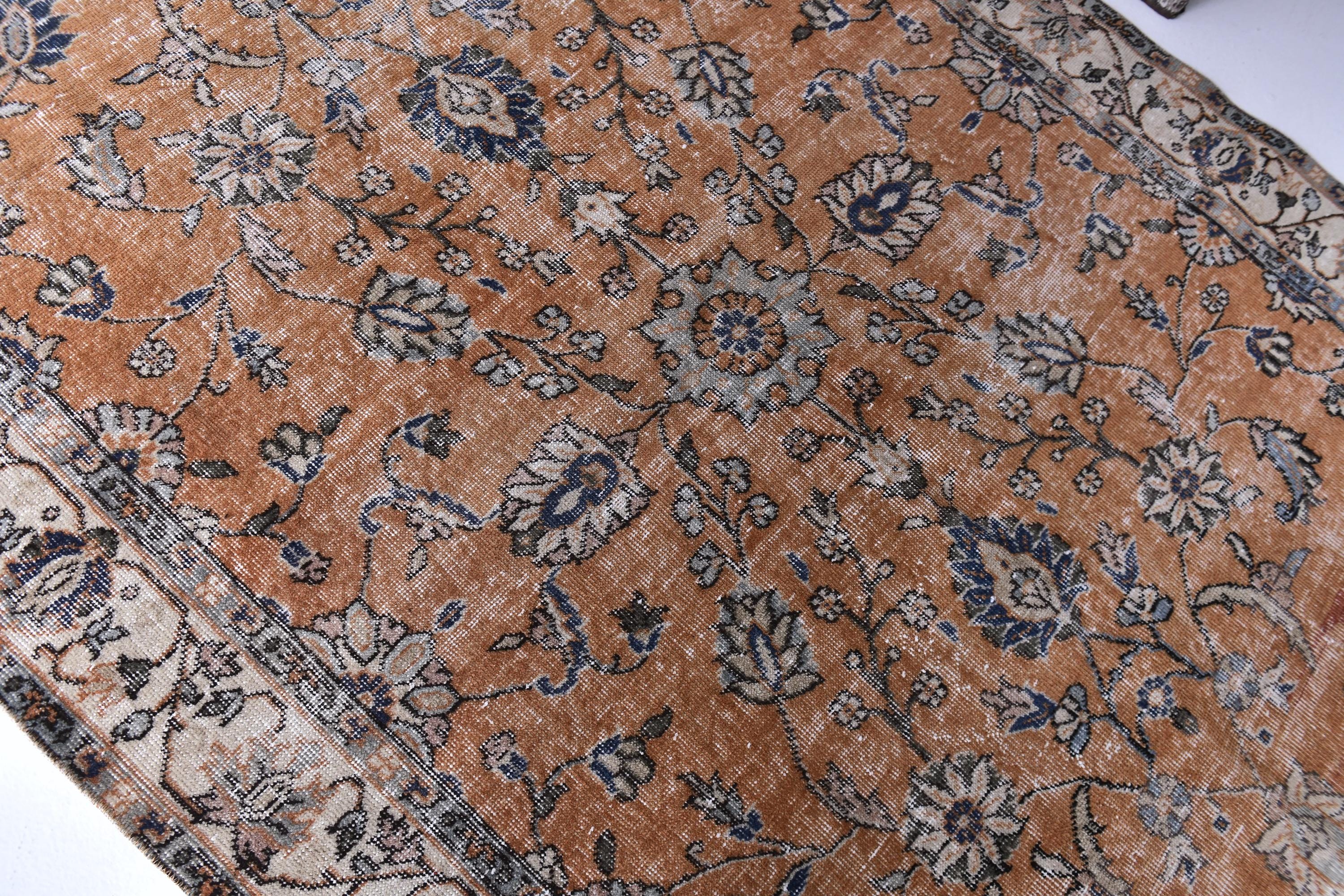 📜📌 Vintage Turkish area rug with a warm caramel brown field showcasing an all-over floral pattern in navy blue, cream, and taupe. The distressed oriental carpet features delicate botanical motifs scattered throughout with a complementary beige border displaying traditional vine designs. Low pile hand-knotted wool construction with authentic vintage wear and faded patina adding character.