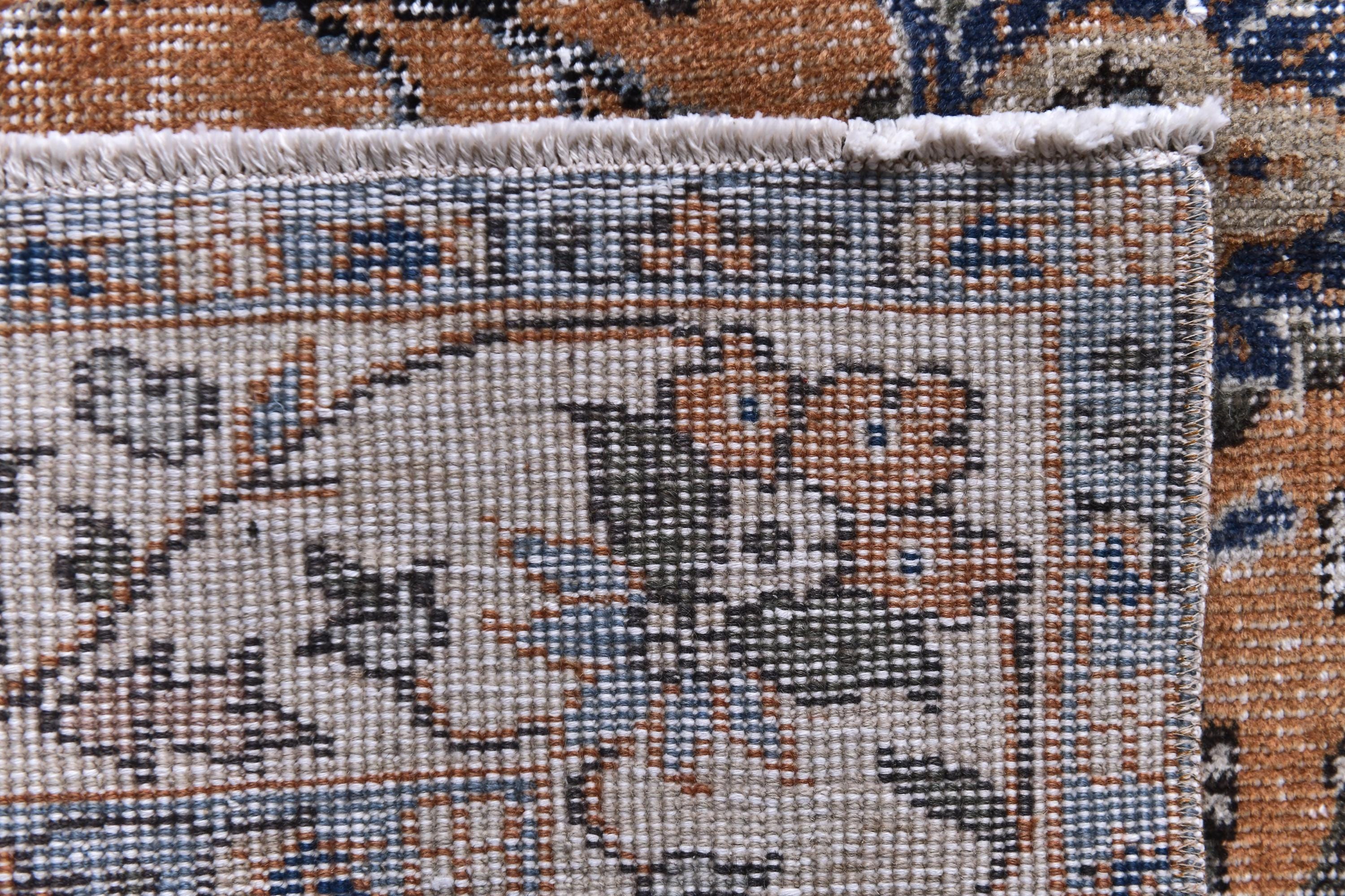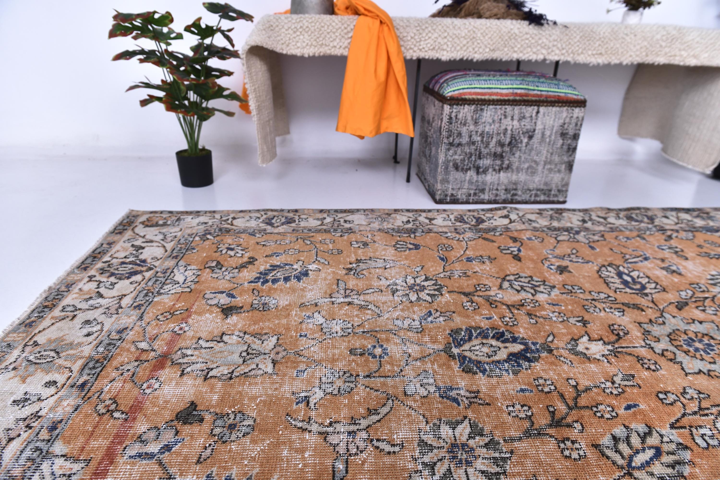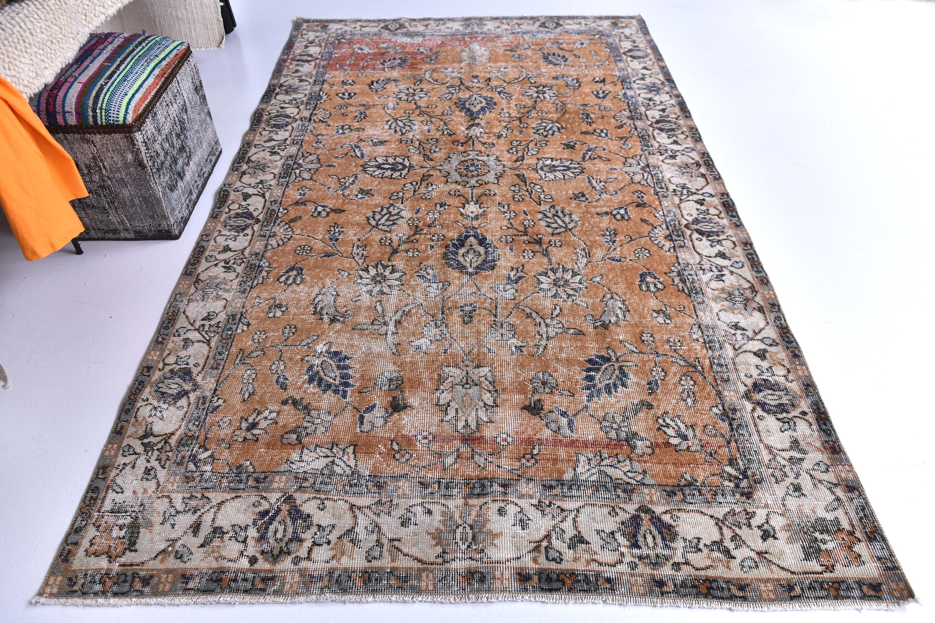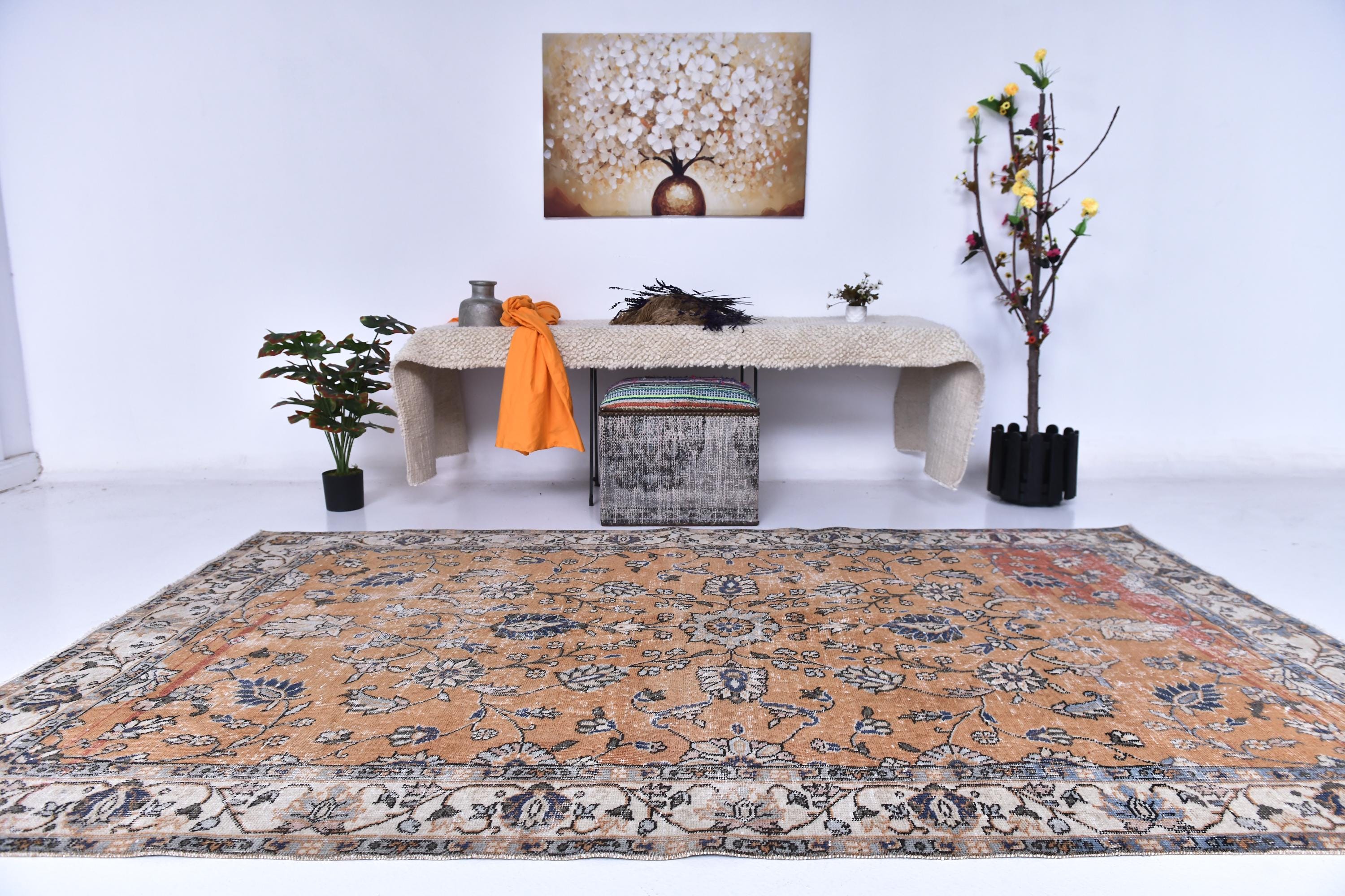 📜📌 Vintage Turkish area rug with a warm caramel brown field showcasing an all-over floral pattern in navy blue, cream, and taupe. The distressed oriental carpet features delicate botanical motifs scattered throughout with a complementary beige border displaying traditional vine designs. Low pile hand-knotted wool construction with authentic vintage wear and faded patina adding character.