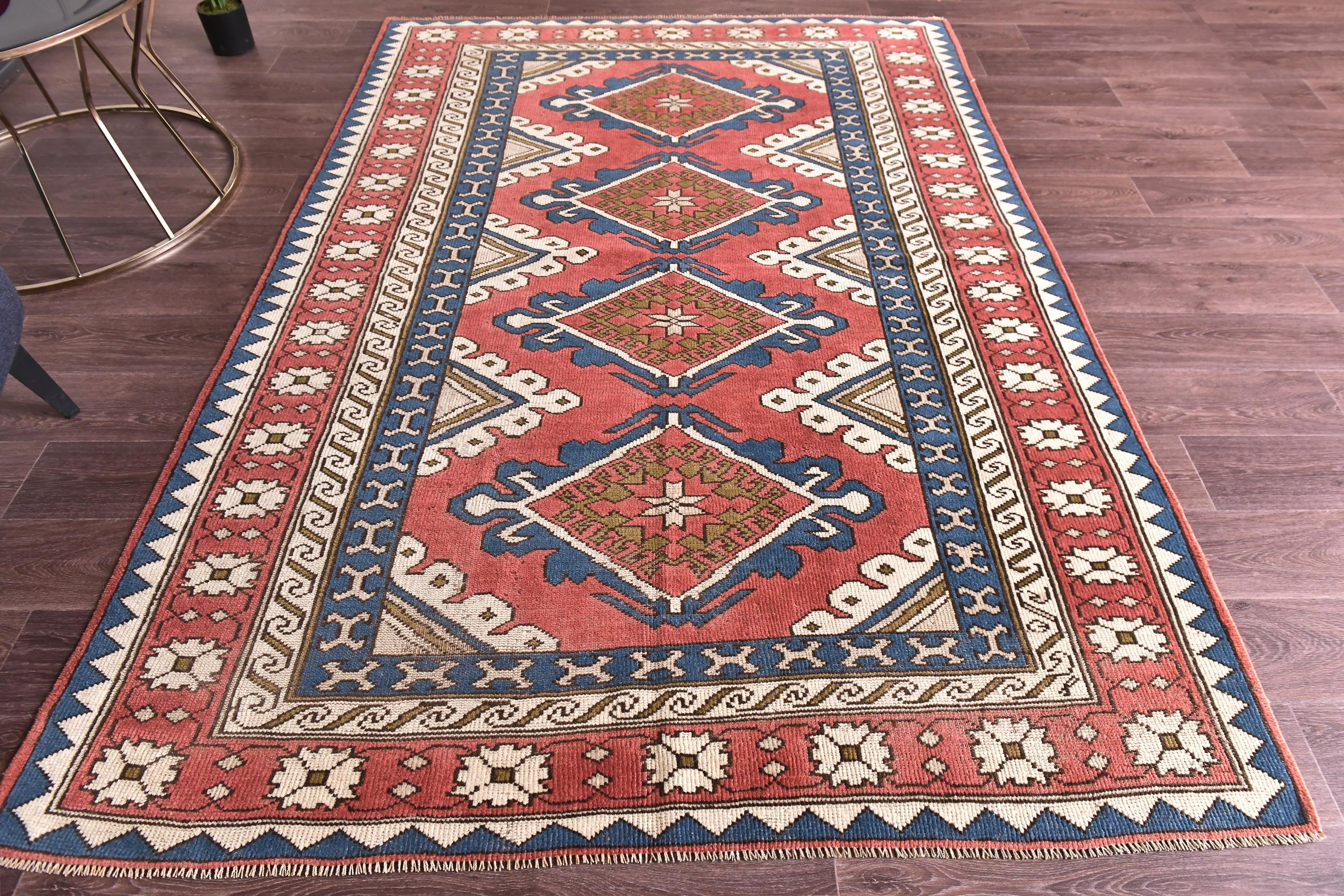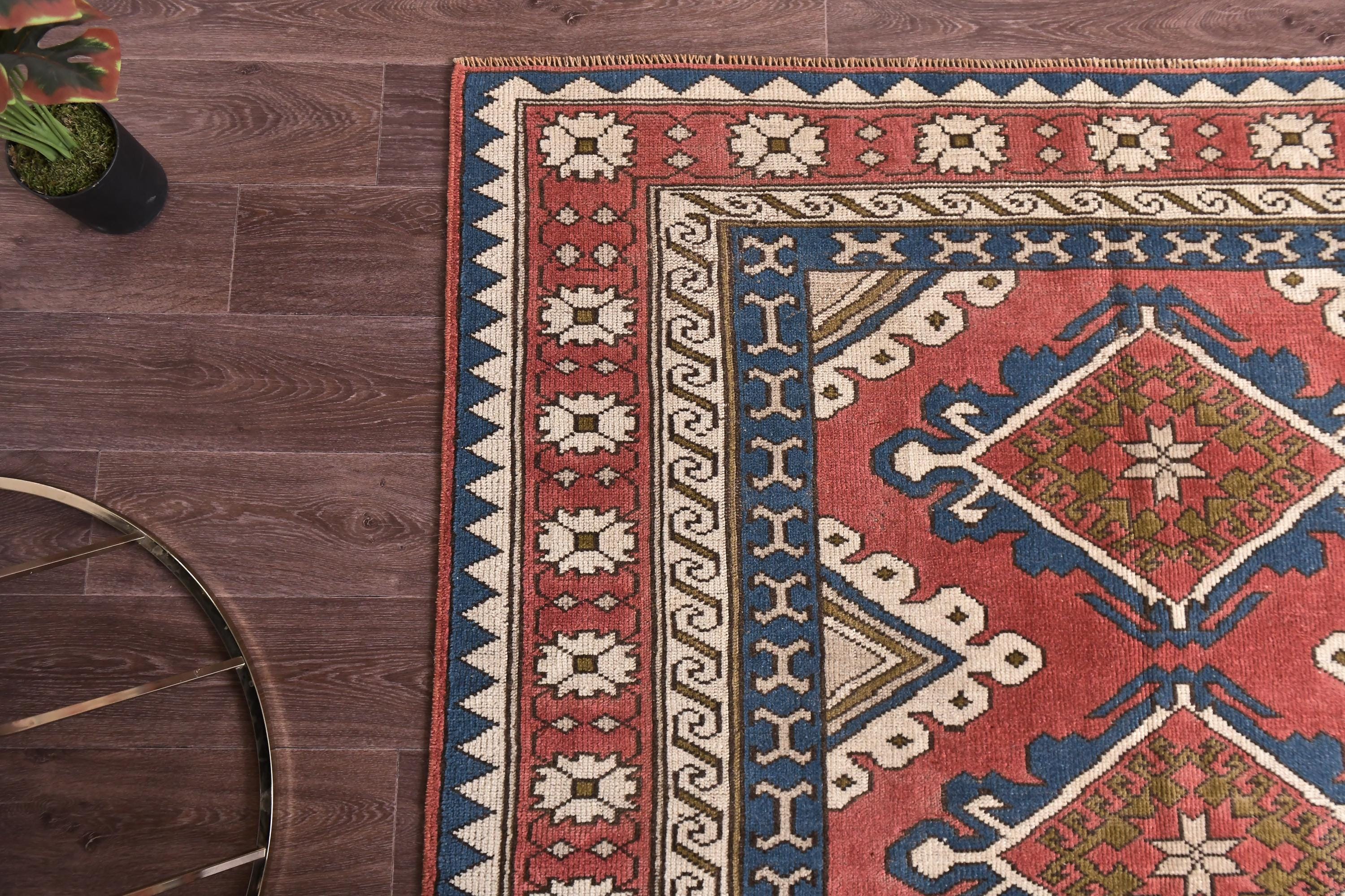 📜📌 Vintage Turkish area rug with coral red field, four geometric diamond medallions, navy blue borders, and traditional star motifs. Hand-knotted wool carpet featuring cream running dog patterns, burgundy floral borders, and tribal designs. Images show flat lay and lifestyle setting on hardwood floor displaying rich terracotta, indigo, ivory tones with natural fringe.