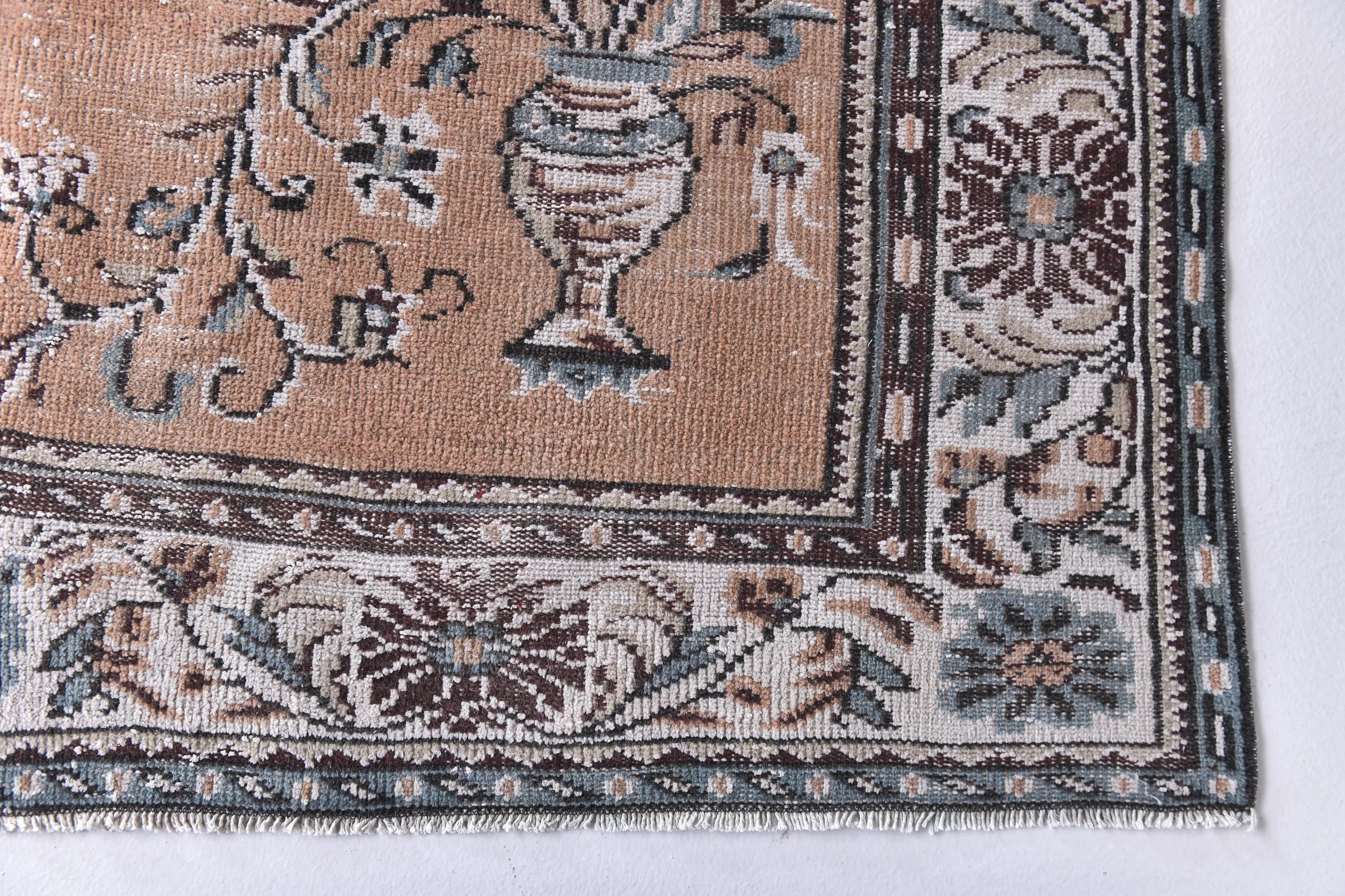 📜📌Antique hand-knotted Turkish Oushak area rug featuring an elegant peach-pink field with ornate floral vase motifs at each corner and center. The wool carpet displays ivory border with blue-gray floral scrollwork and classical urn designs. Measuring 9.6x6 feet, ideal for living rooms and dining spaces.