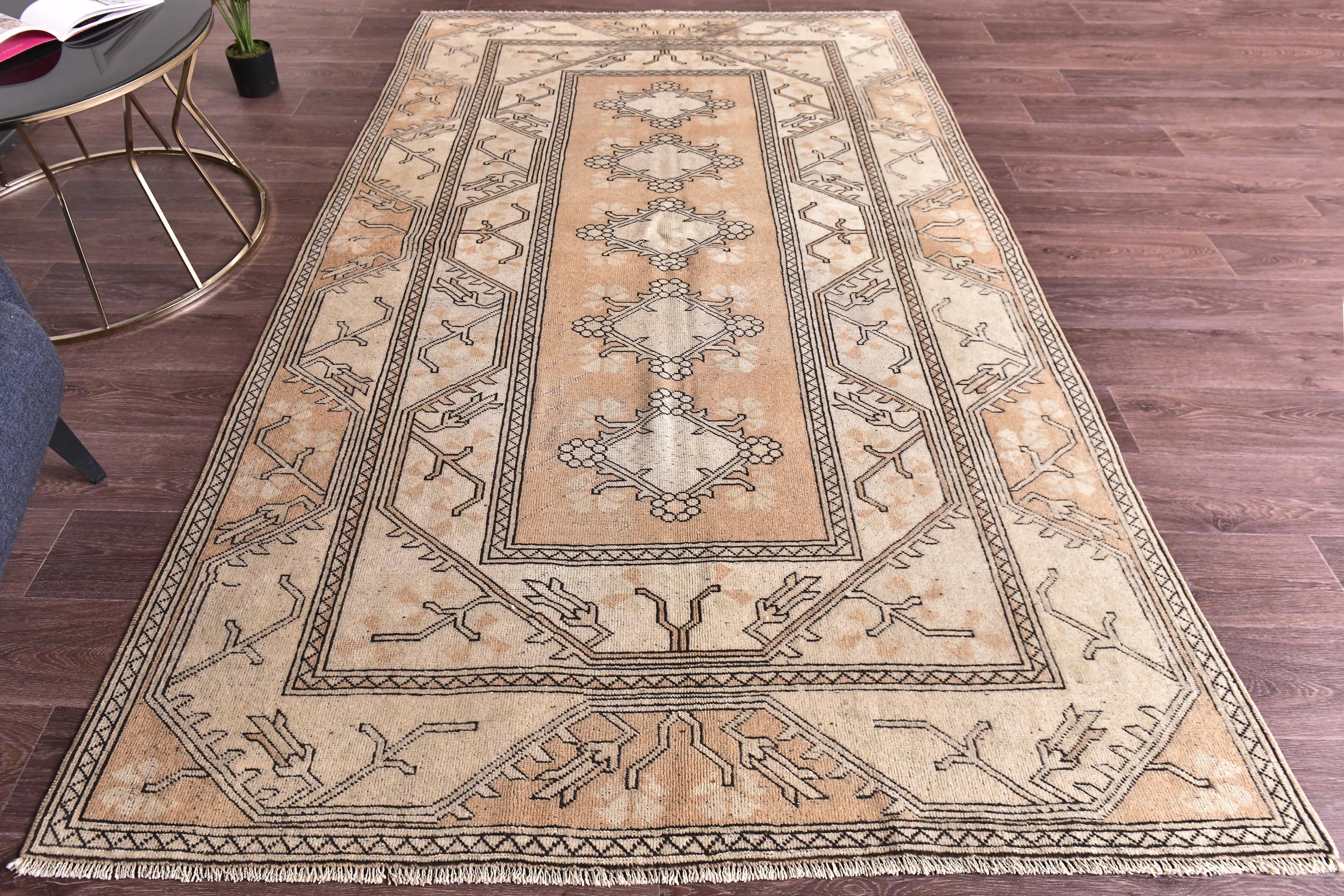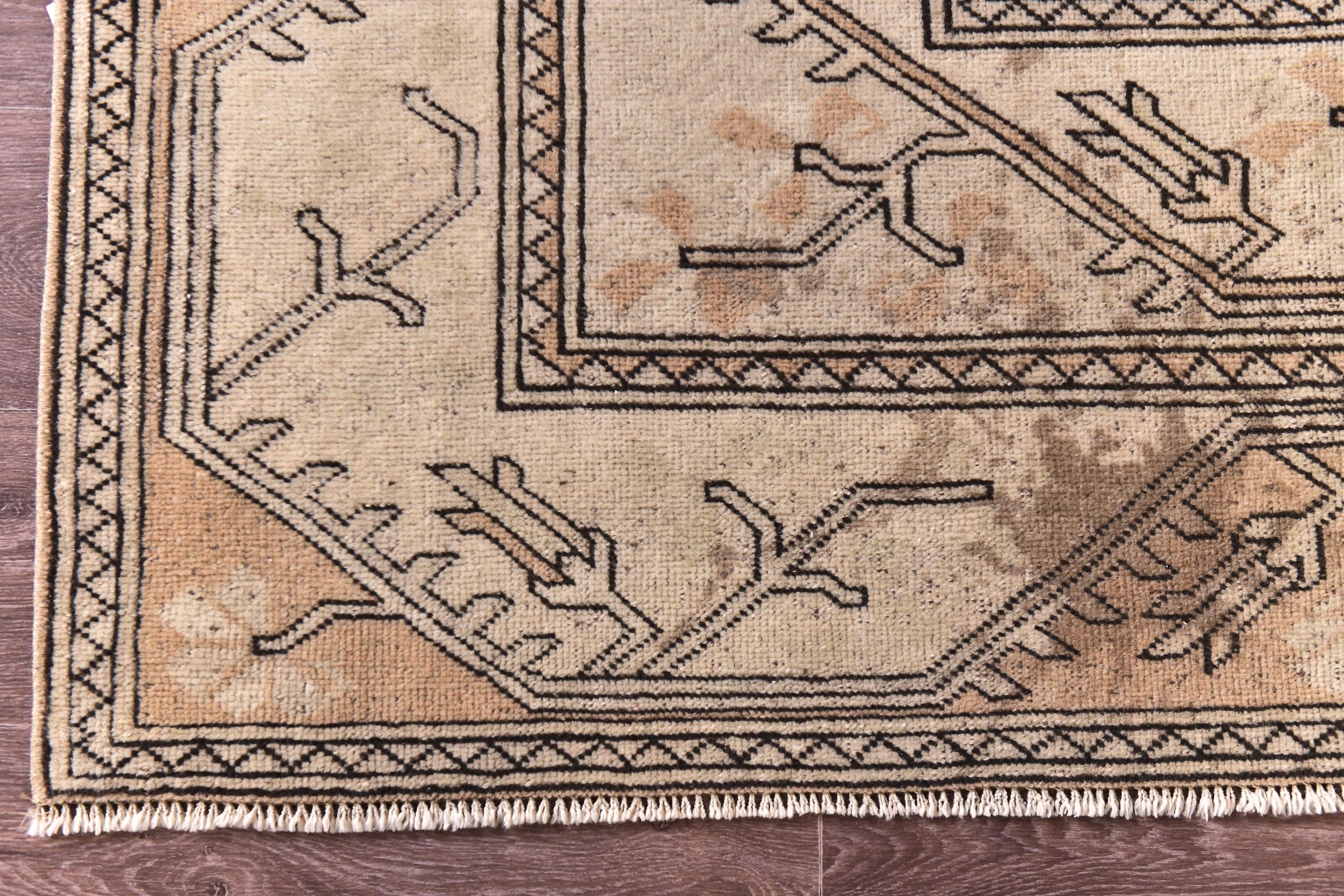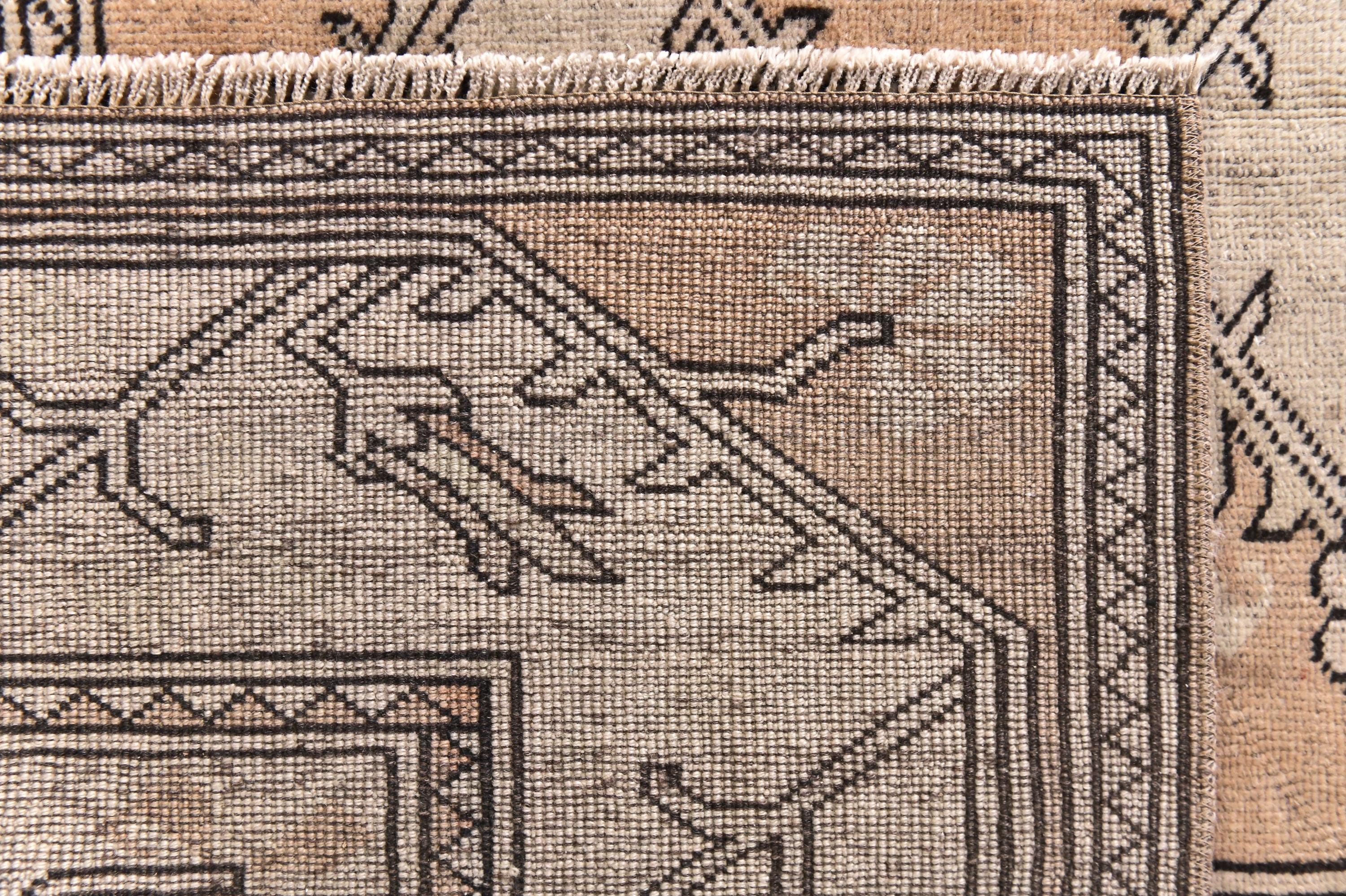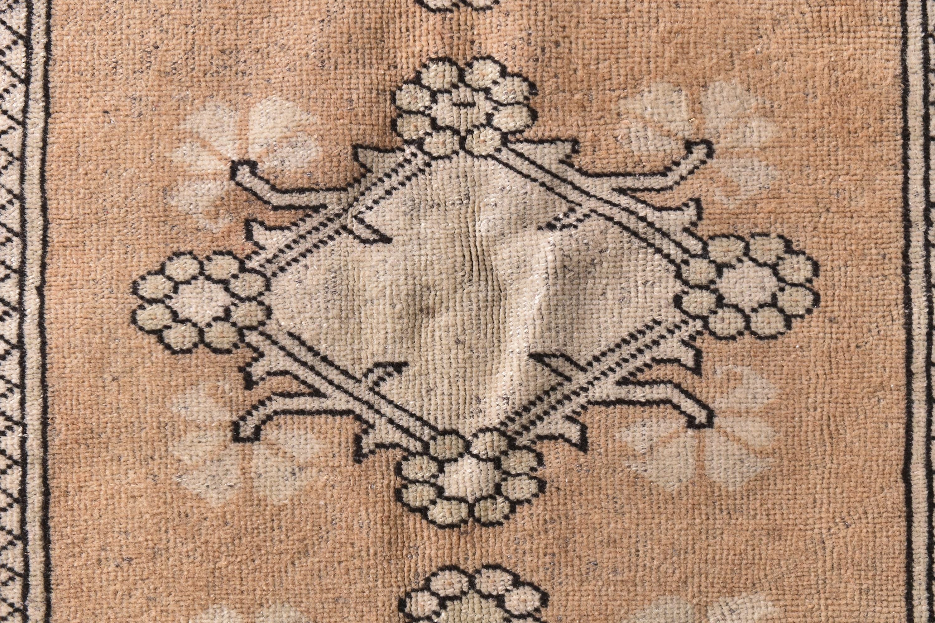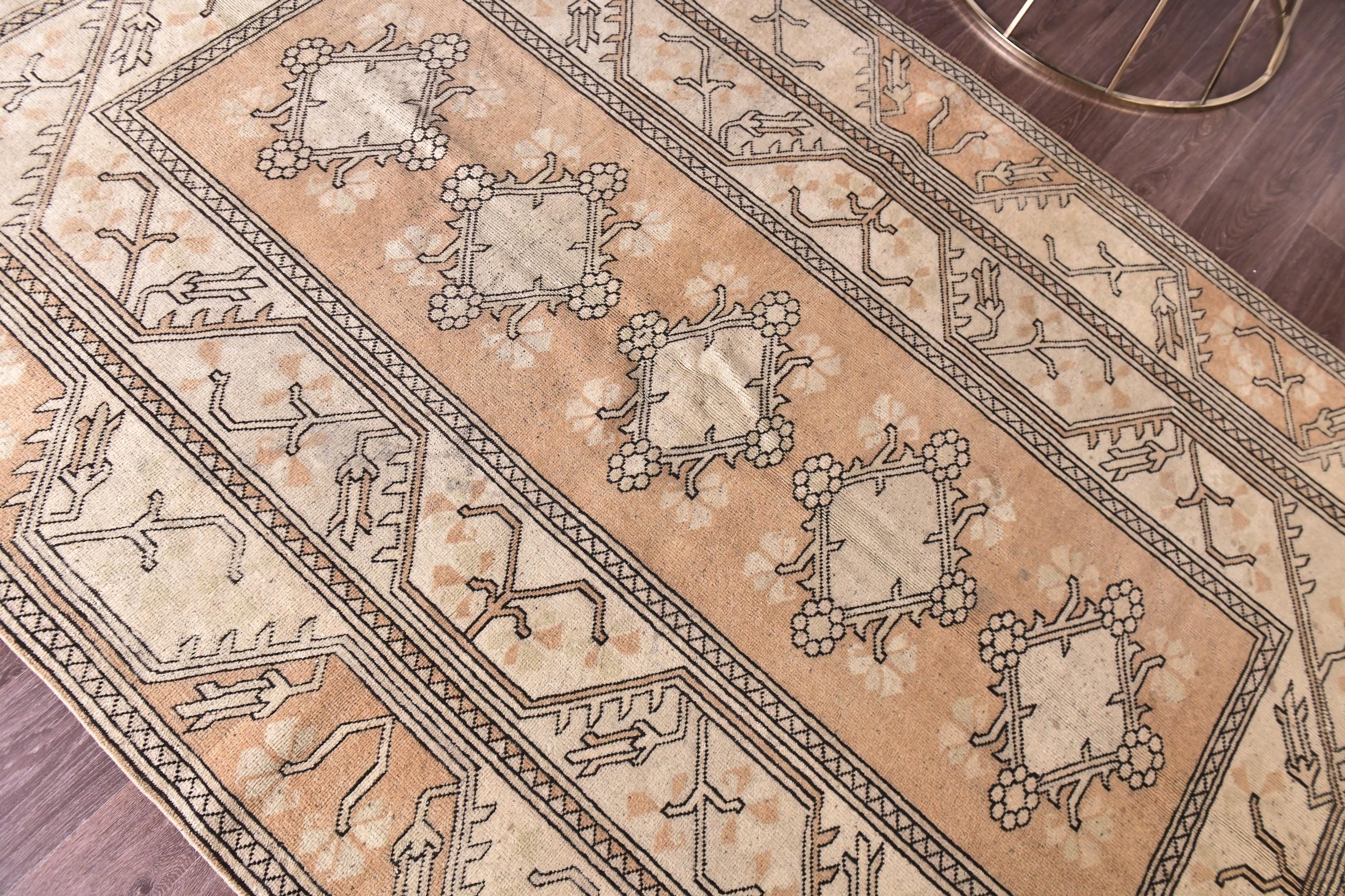📜📌 Vintage Turkish Khotan area rug featuring five repeating geometric star medallions in warm peach, apricot, and cream tones. The hand-knotted wool carpet displays traditional Anatolian tribal motifs with stylized angular designs throughout the field. Multiple decorative borders frame the composition with geometric arrow and tree-of-life patterns. The low-pile weave shows beautiful natural fading and vintage patina, perfect for bohemian and southwestern interiors.
