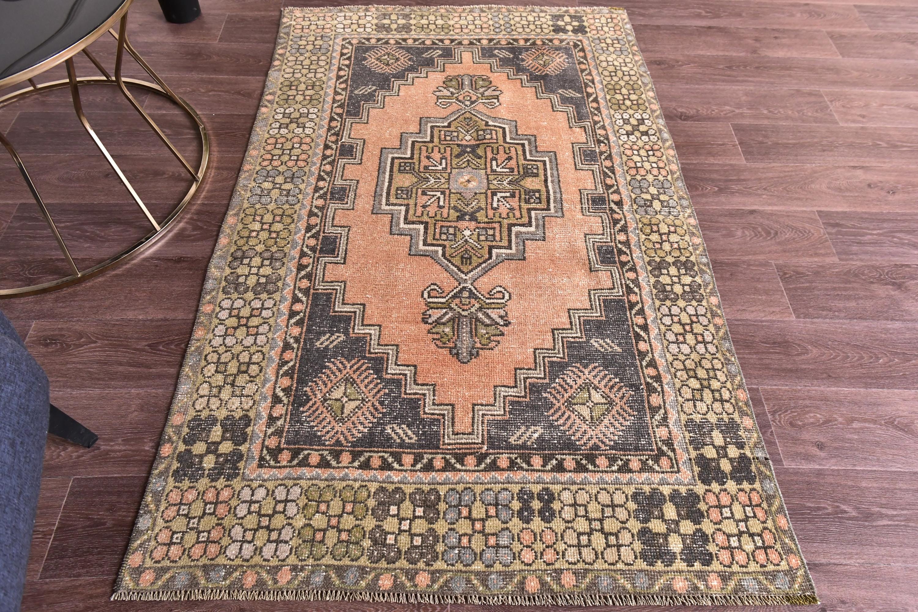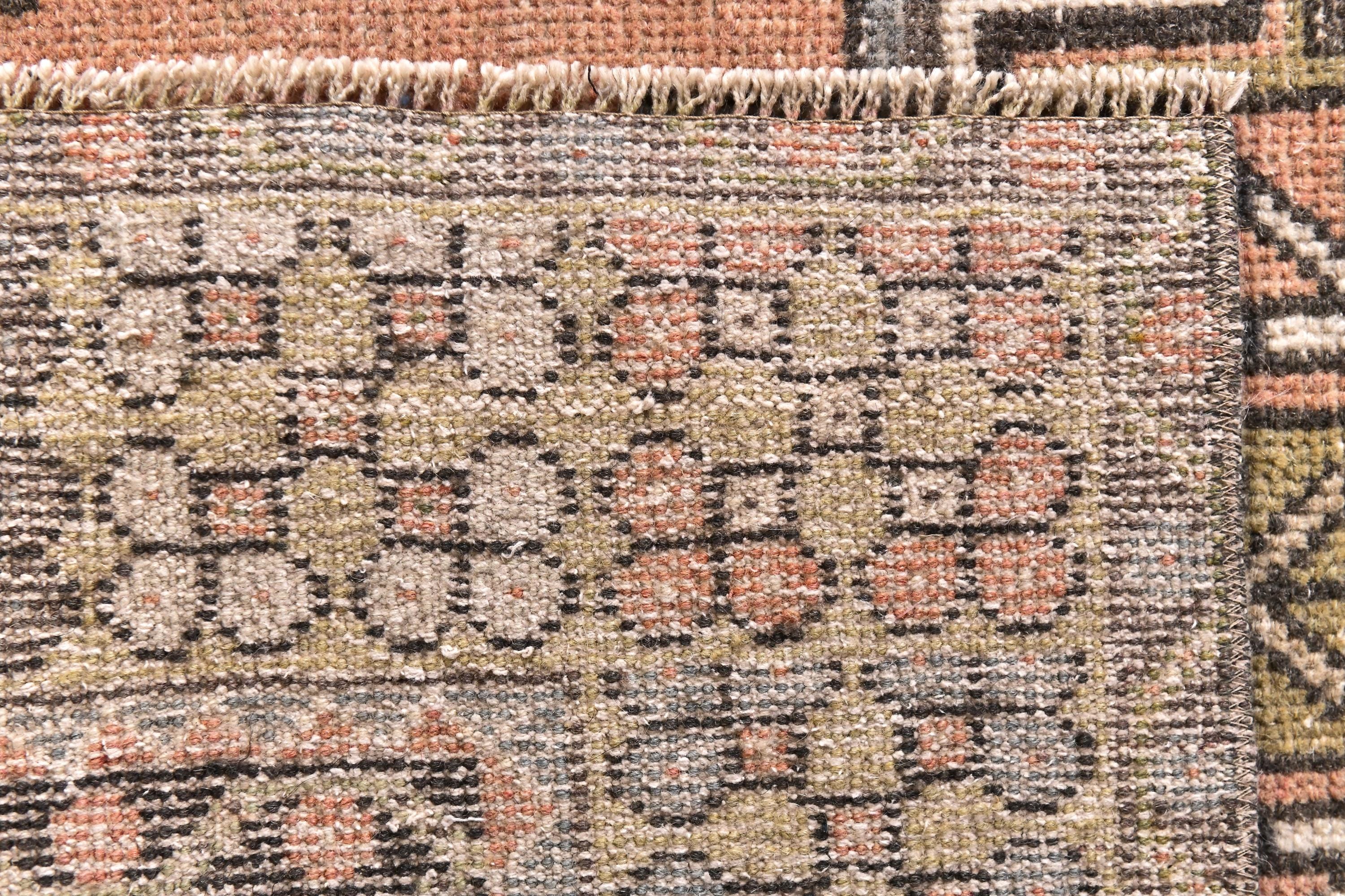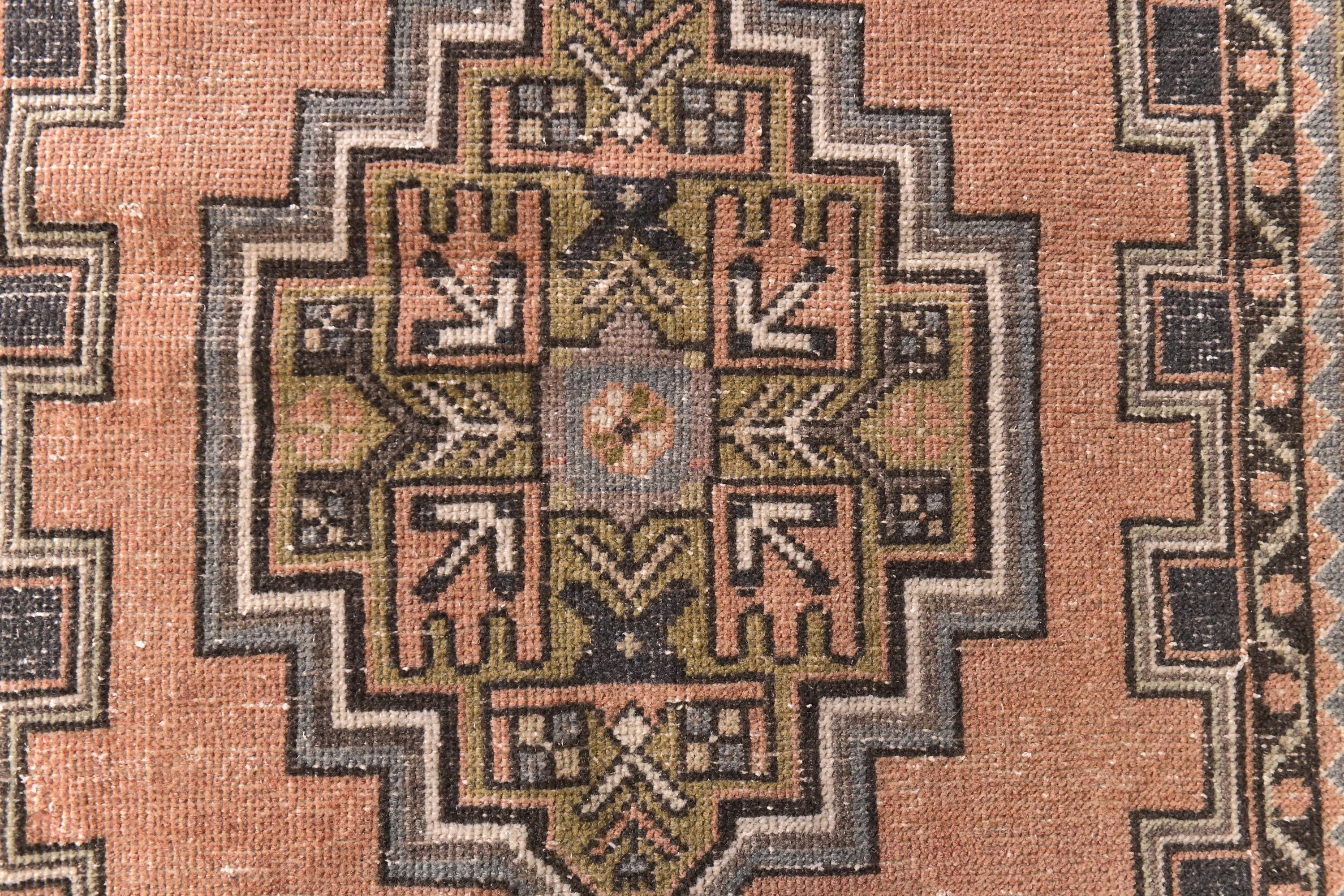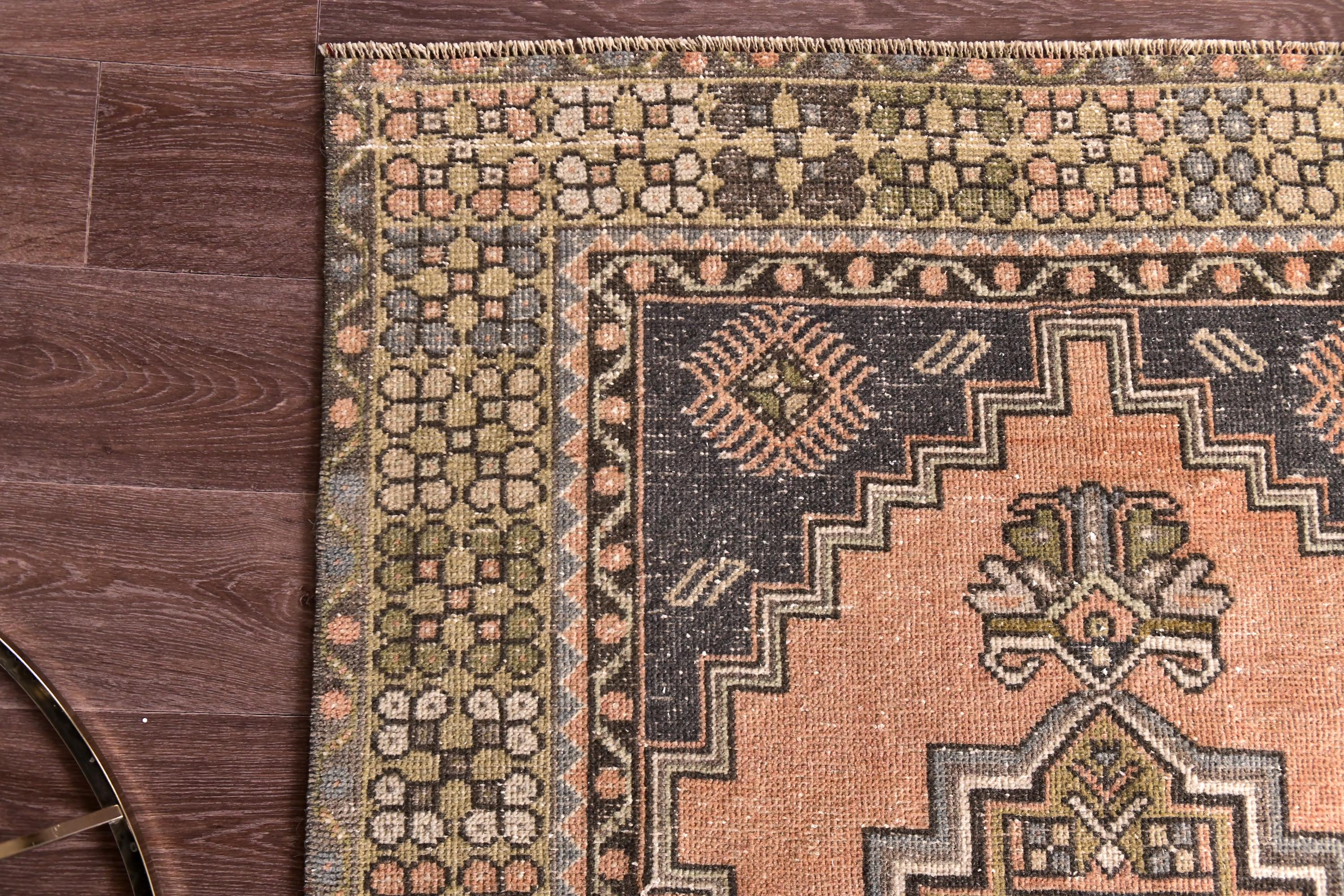 📜📌 Vintage Turkish area rug featuring a bold geometric star medallion on a vibrant coral-salmon field. The hand-knotted wool carpet displays intricate tribal motifs with charcoal gray, olive green, and peachy tones. Decorative zigzag borders frame the central design, complemented by wide floral-patterned side borders in muted olive and cream. The low-pile weave shows authentic vintage wear and natural patina, perfect for small spaces and bohemian interiors.