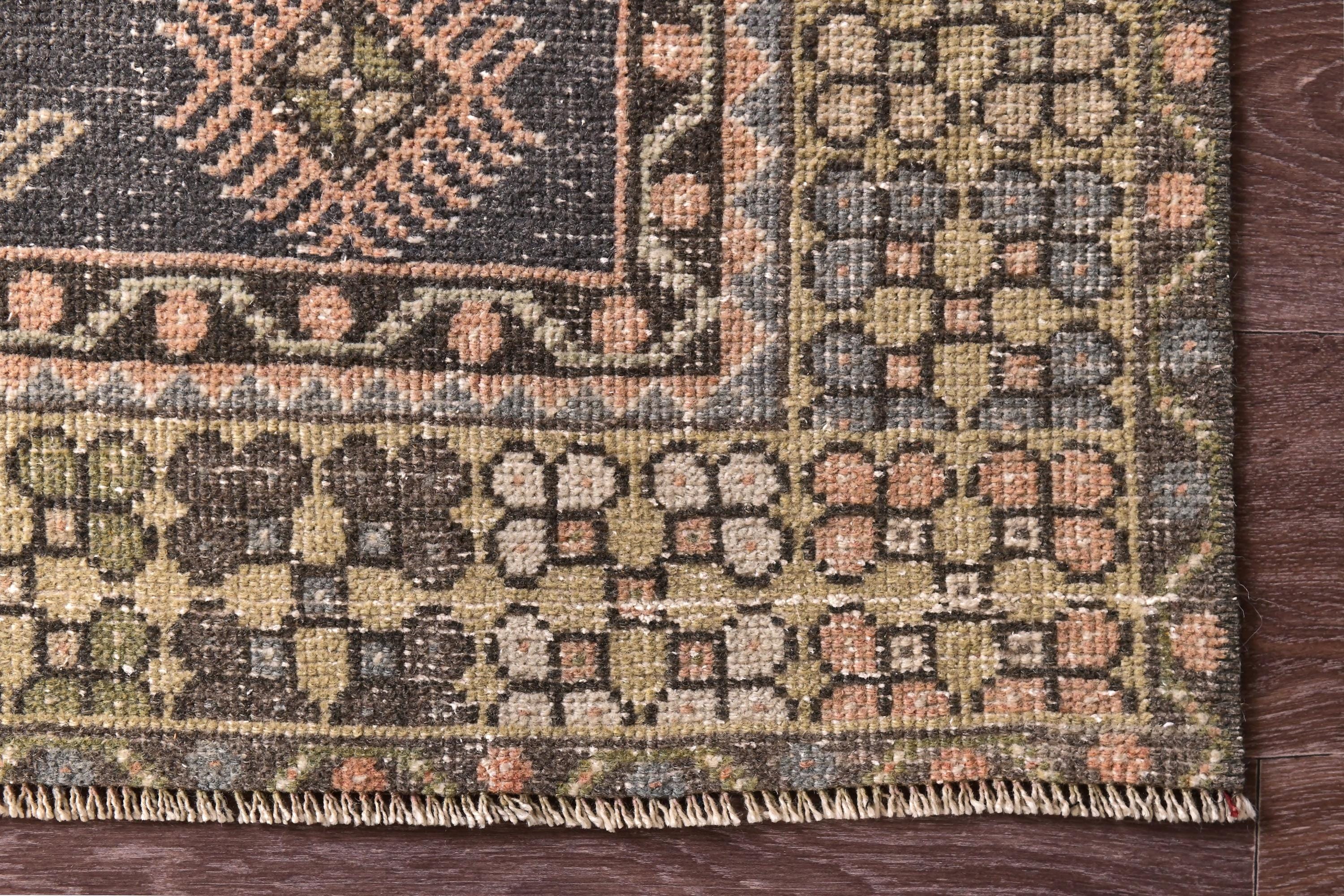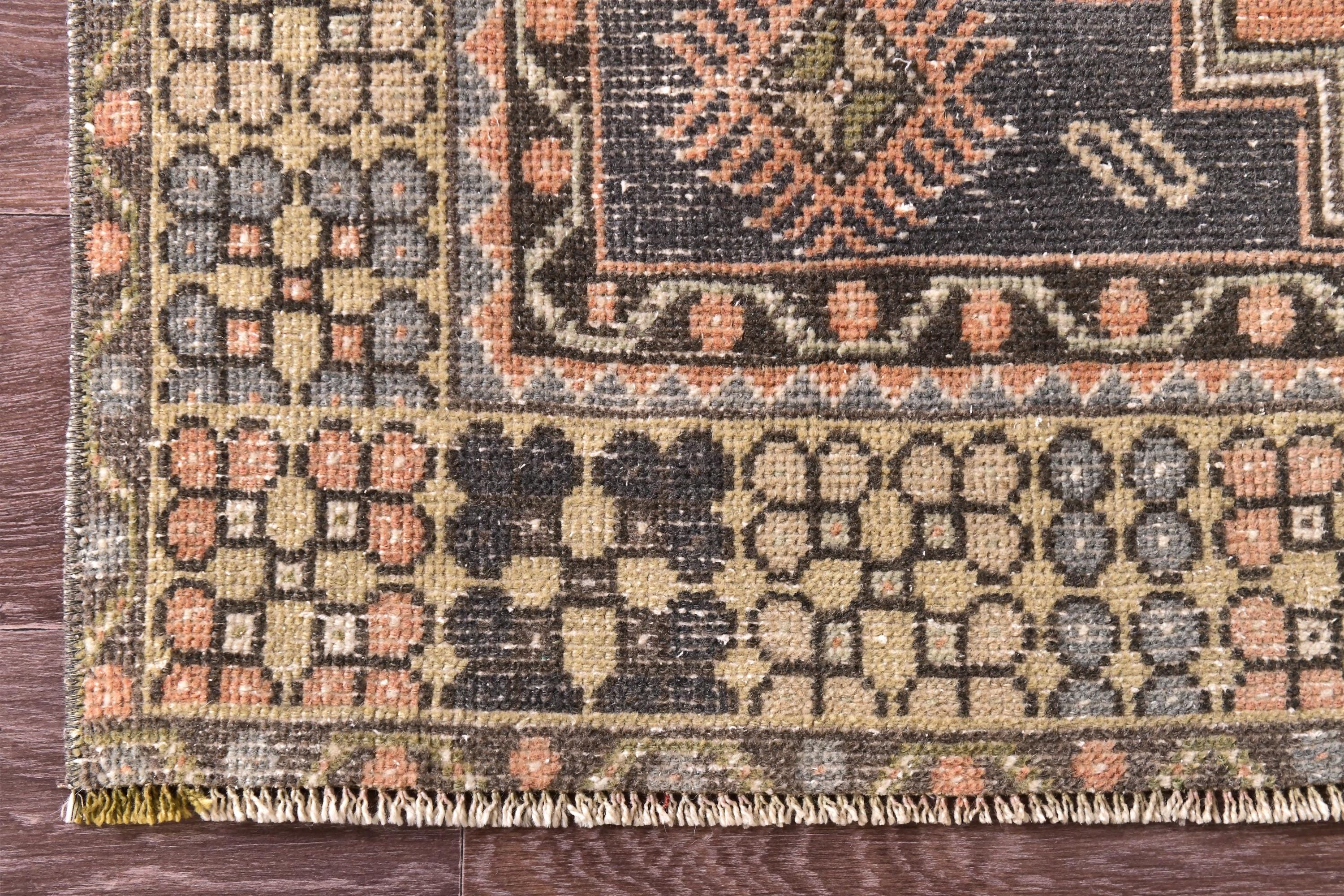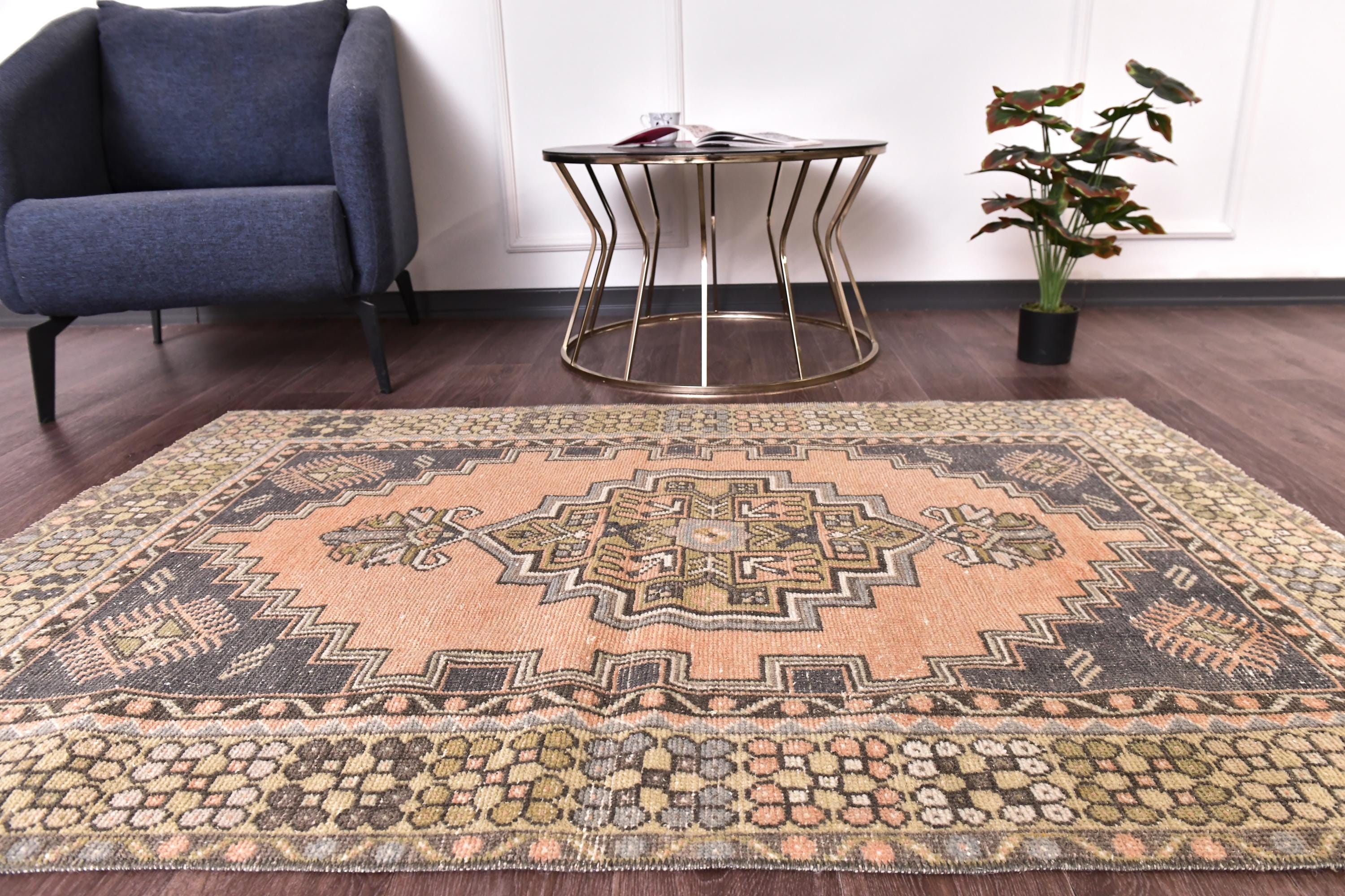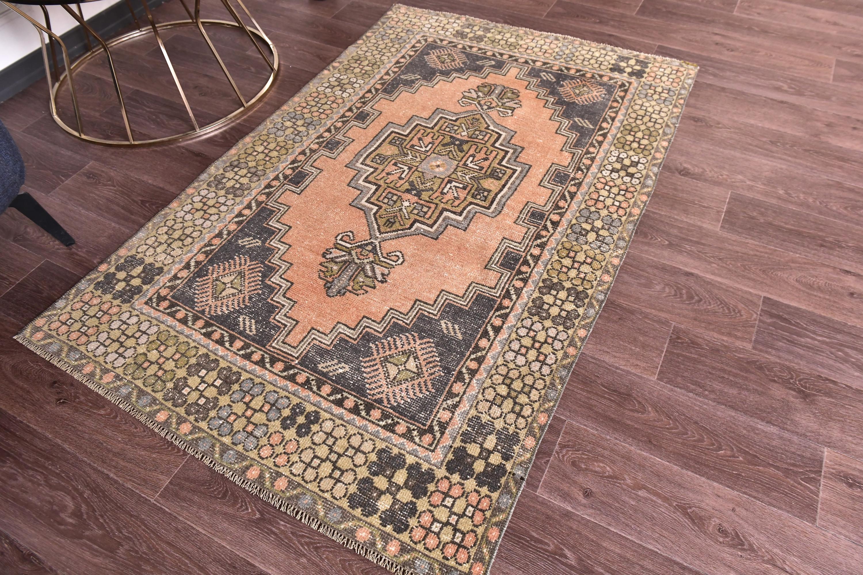 📜📌 Vintage Turkish area rug featuring a bold geometric star medallion on a vibrant coral-salmon field. The hand-knotted wool carpet displays intricate tribal motifs with charcoal gray, olive green, and peachy tones. Decorative zigzag borders frame the central design, complemented by wide floral-patterned side borders in muted olive and cream. The low-pile weave shows authentic vintage wear and natural patina, perfect for small spaces and bohemian interiors.