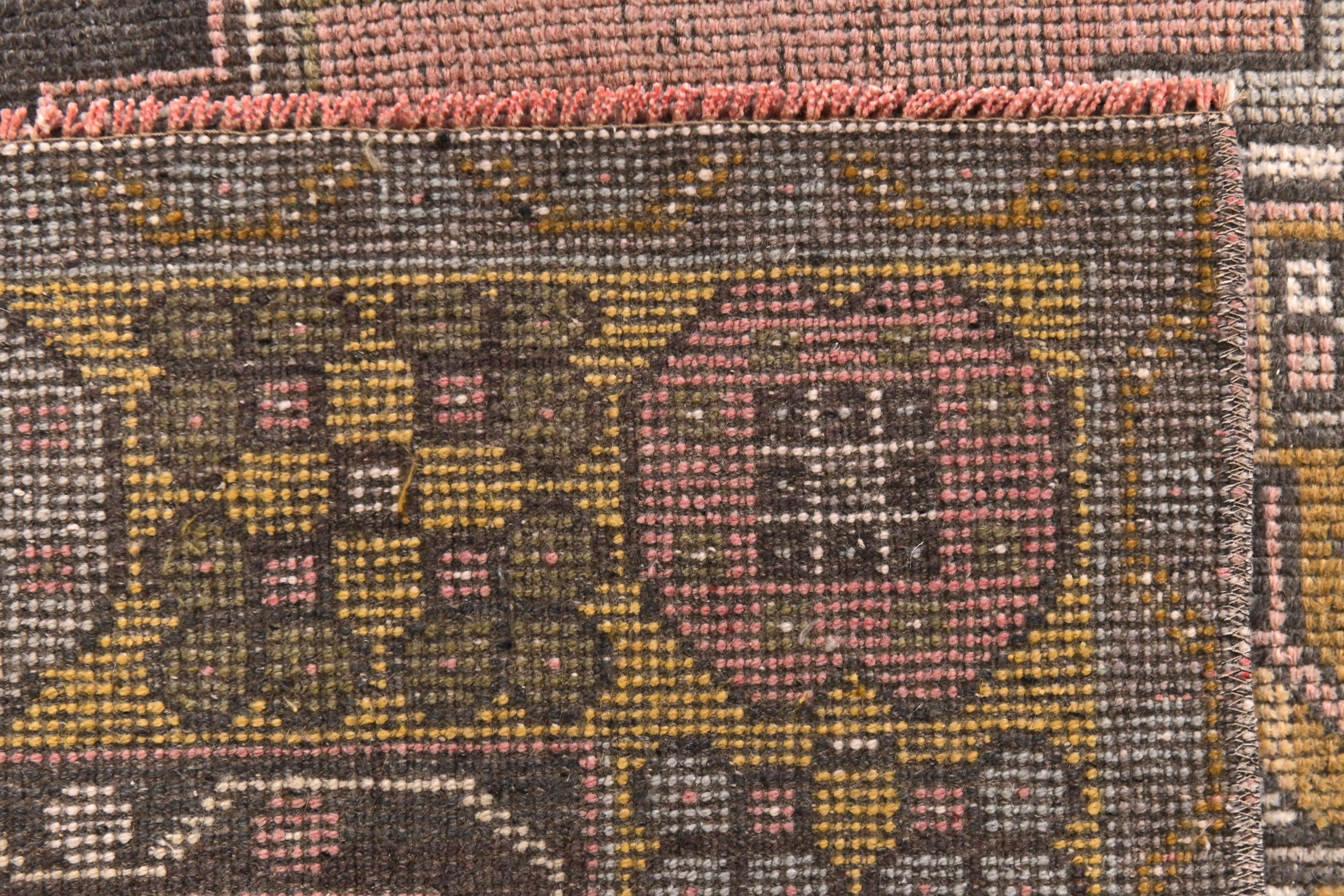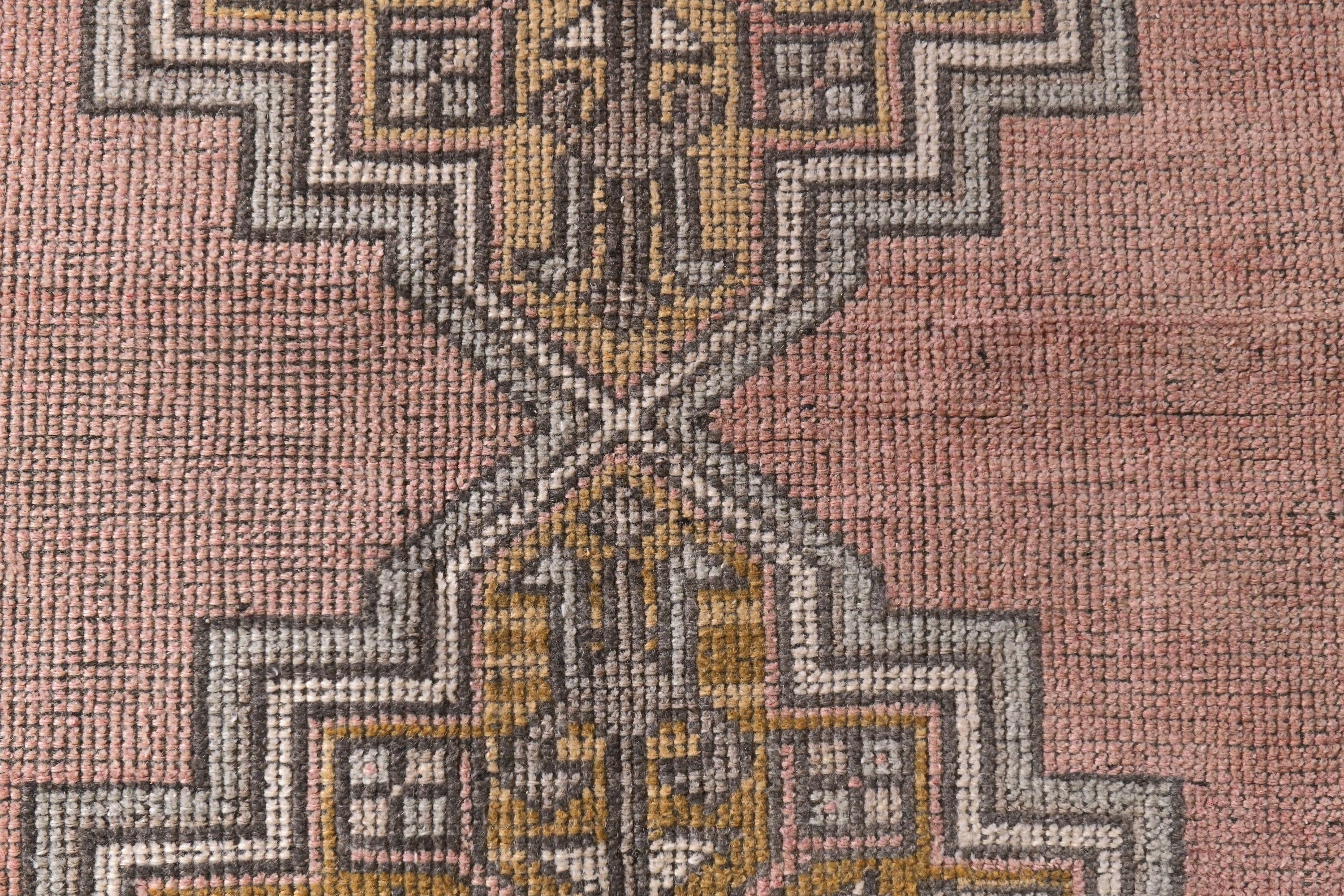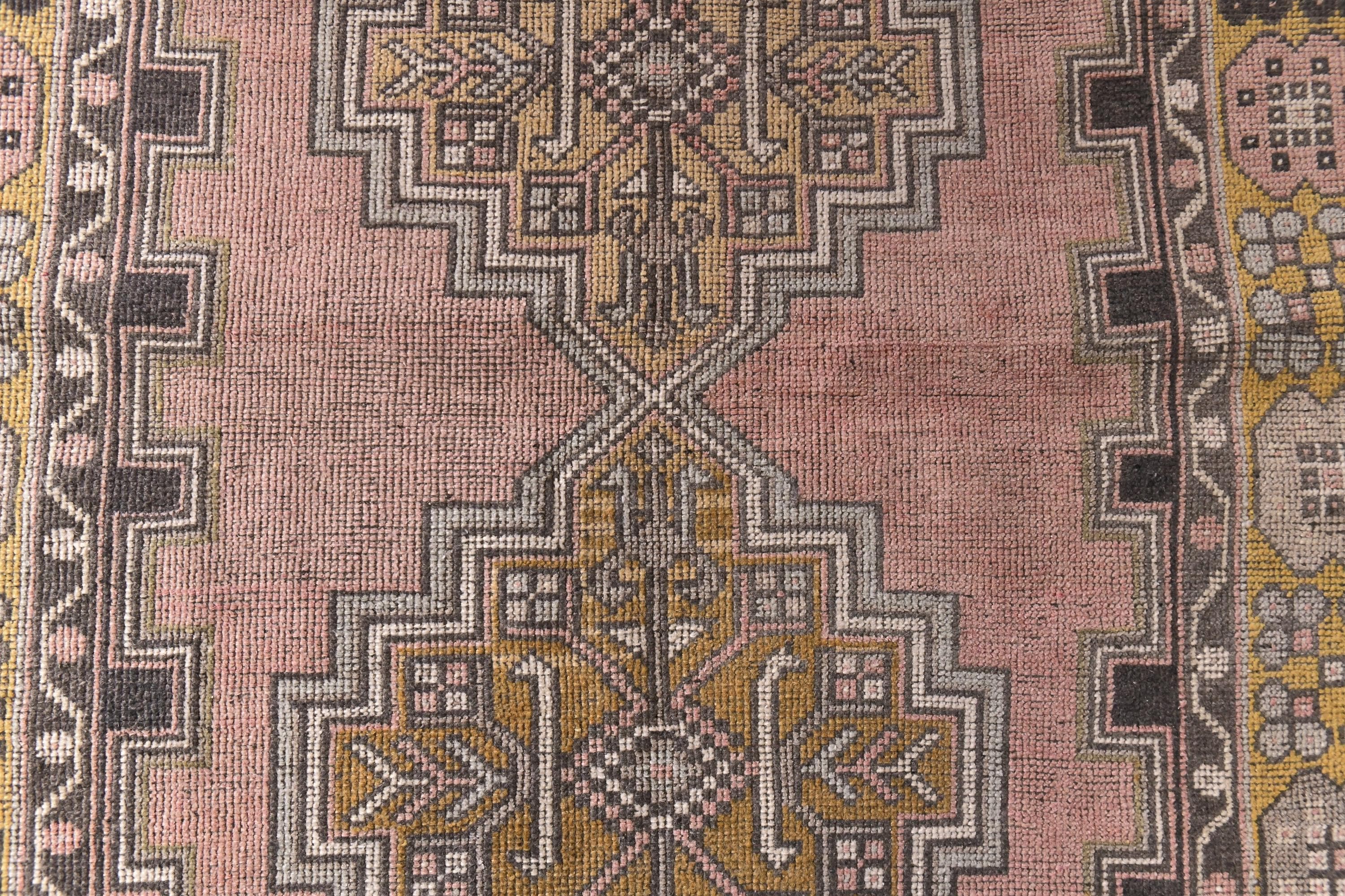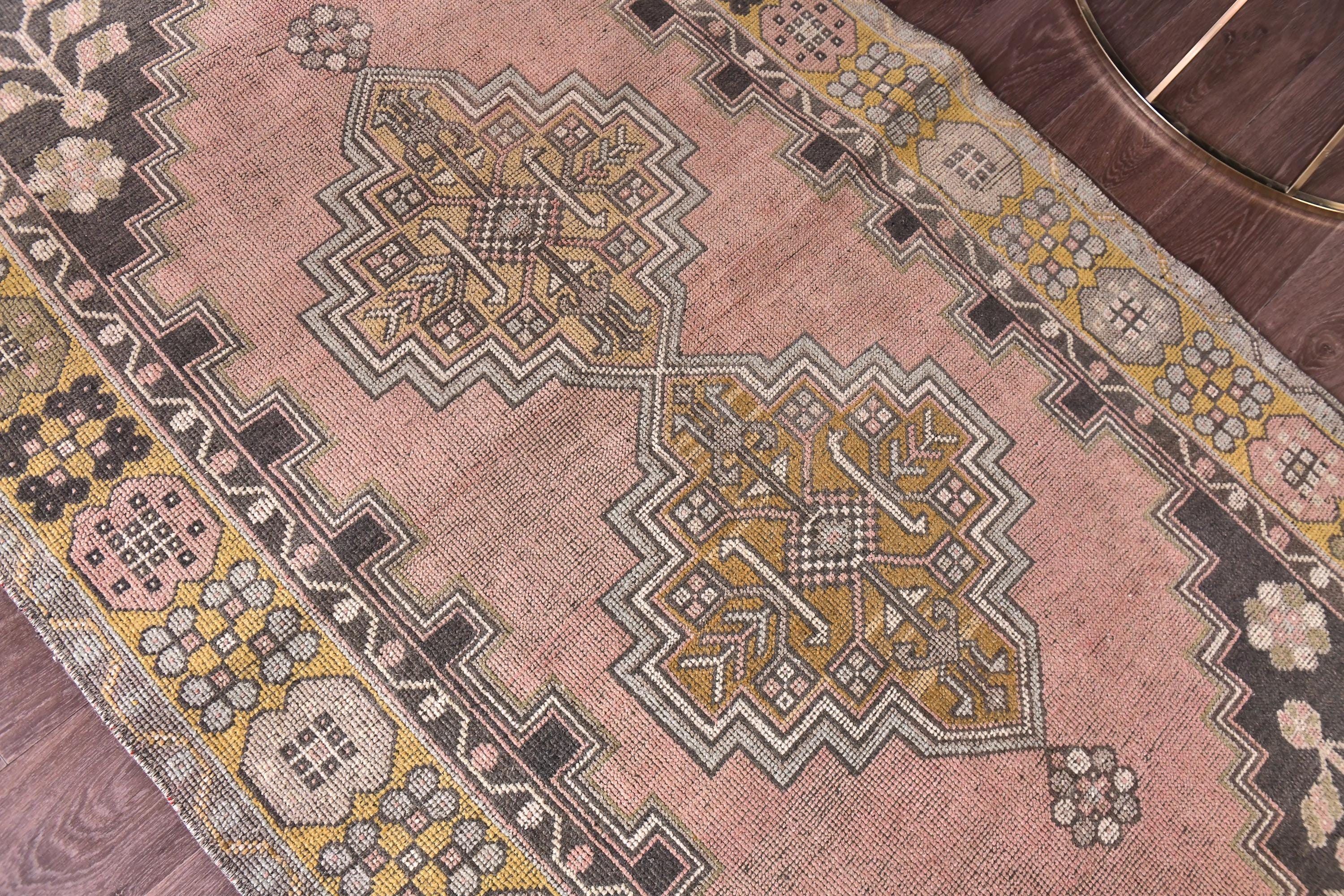 📜📌 Vintage Turkish area rug featuring a bold geometric star medallion on a vibrant coral-salmon field. The hand-knotted wool carpet displays intricate tribal motifs with charcoal gray, olive green, and peachy tones. Decorative zigzag borders frame the central design, complemented by wide floral-patterned side borders in muted olive and cream. The low-pile weave shows authentic vintage wear and natural patina, perfect for small spaces and bohemian interiors.