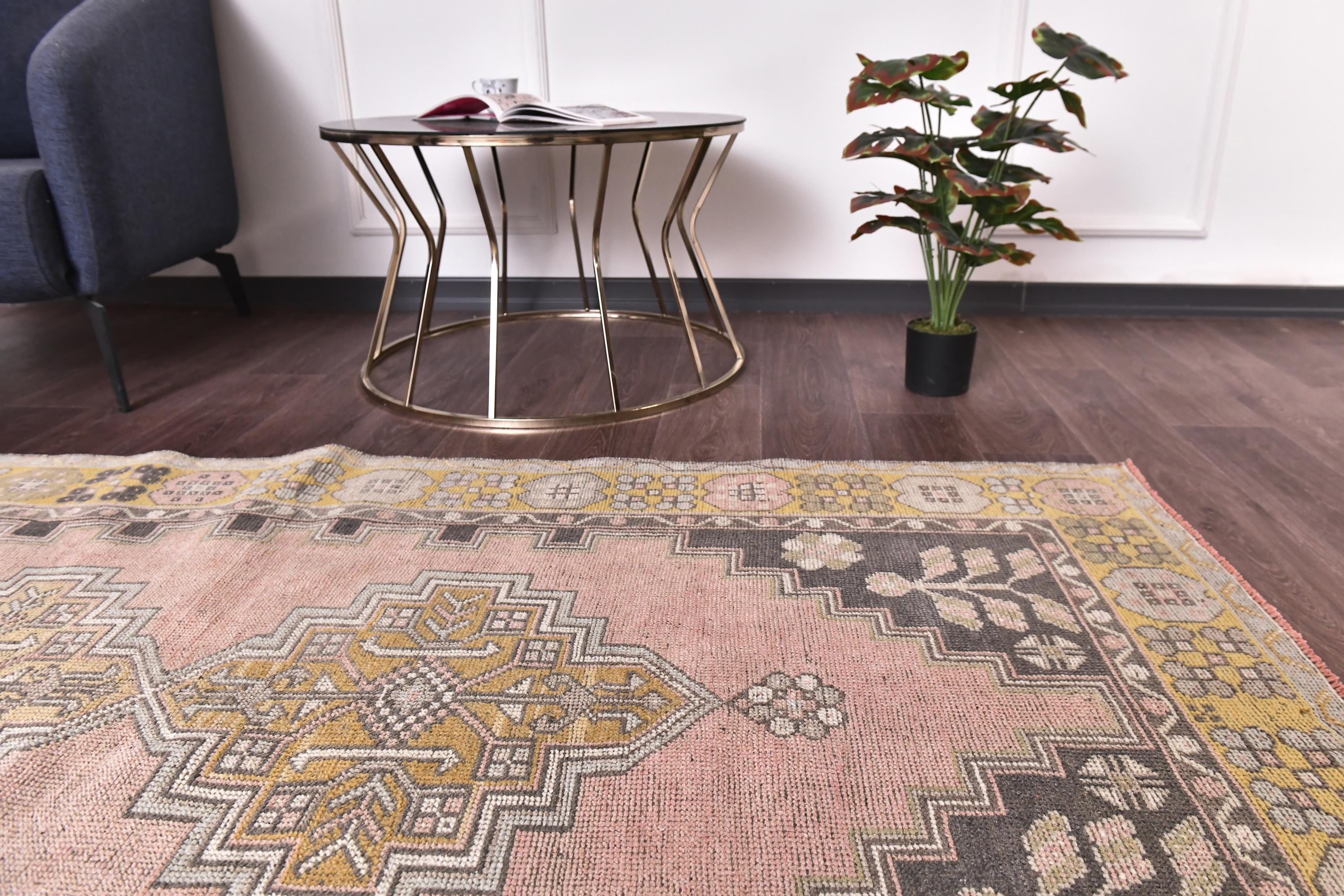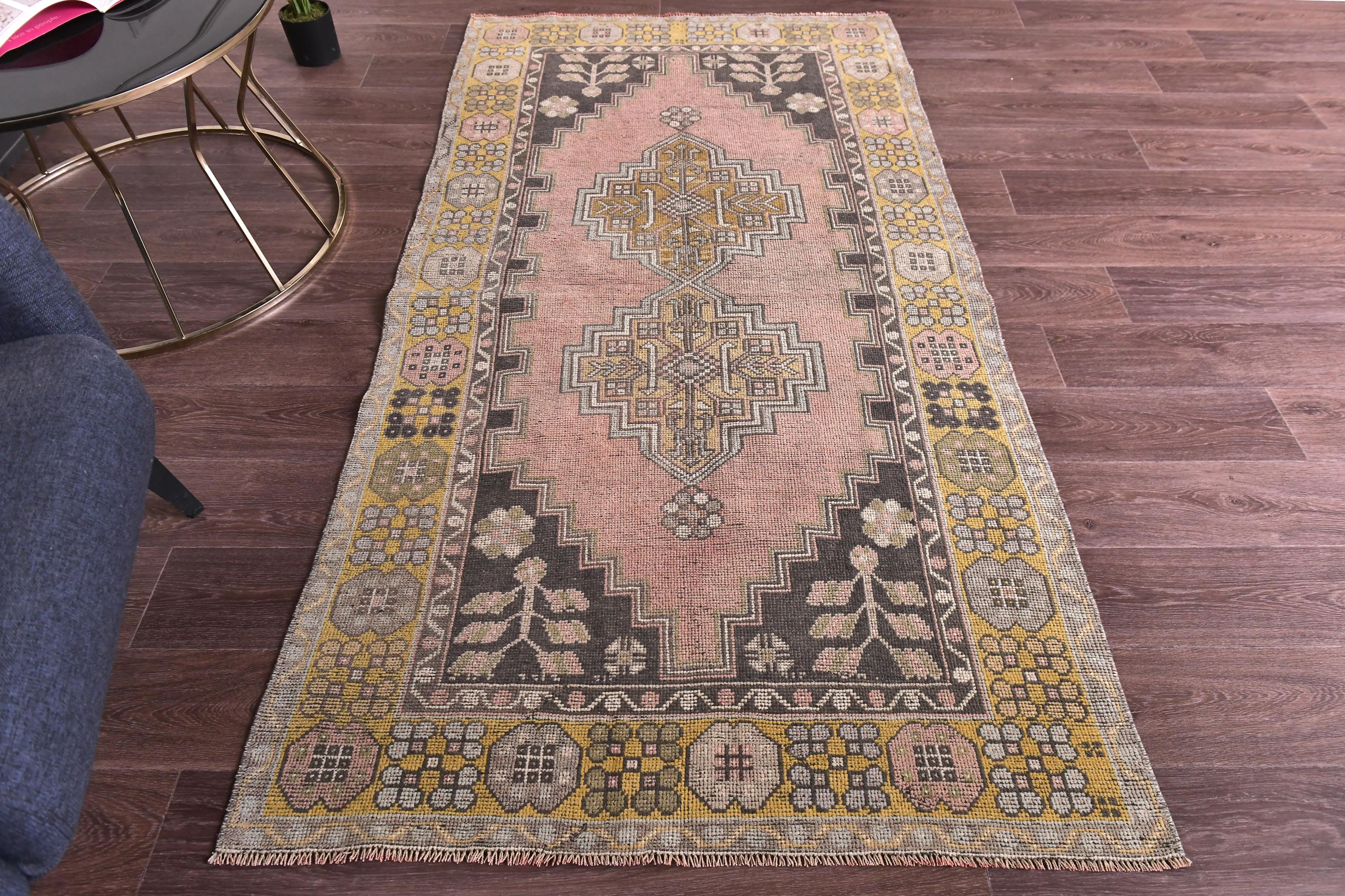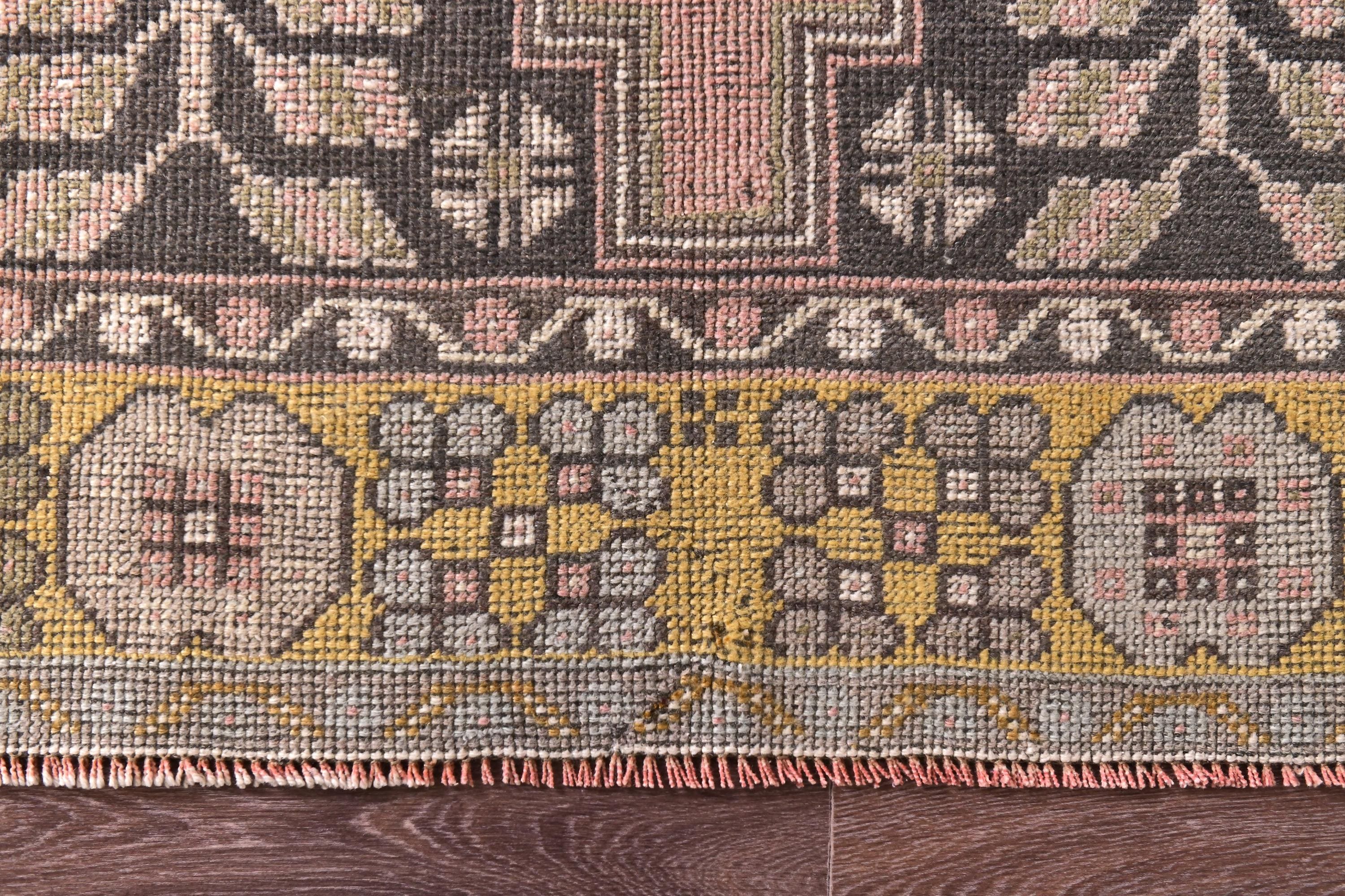 📜📌 Vintage Turkish area rug featuring a bold geometric star medallion on a vibrant coral-salmon field. The hand-knotted wool carpet displays intricate tribal motifs with charcoal gray, olive green, and peachy tones. Decorative zigzag borders frame the central design, complemented by wide floral-patterned side borders in muted olive and cream. The low-pile weave shows authentic vintage wear and natural patina, perfect for small spaces and bohemian interiors.