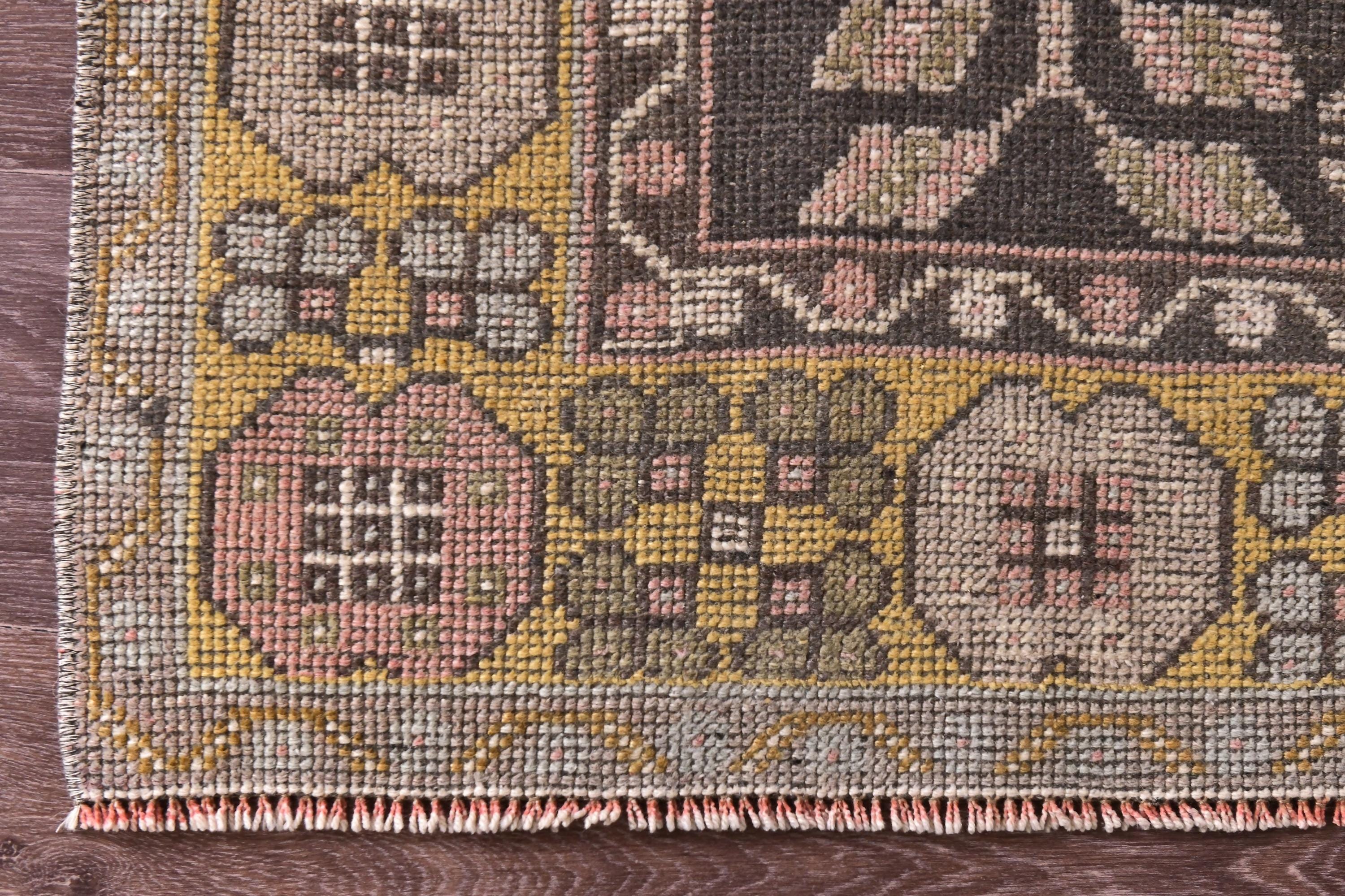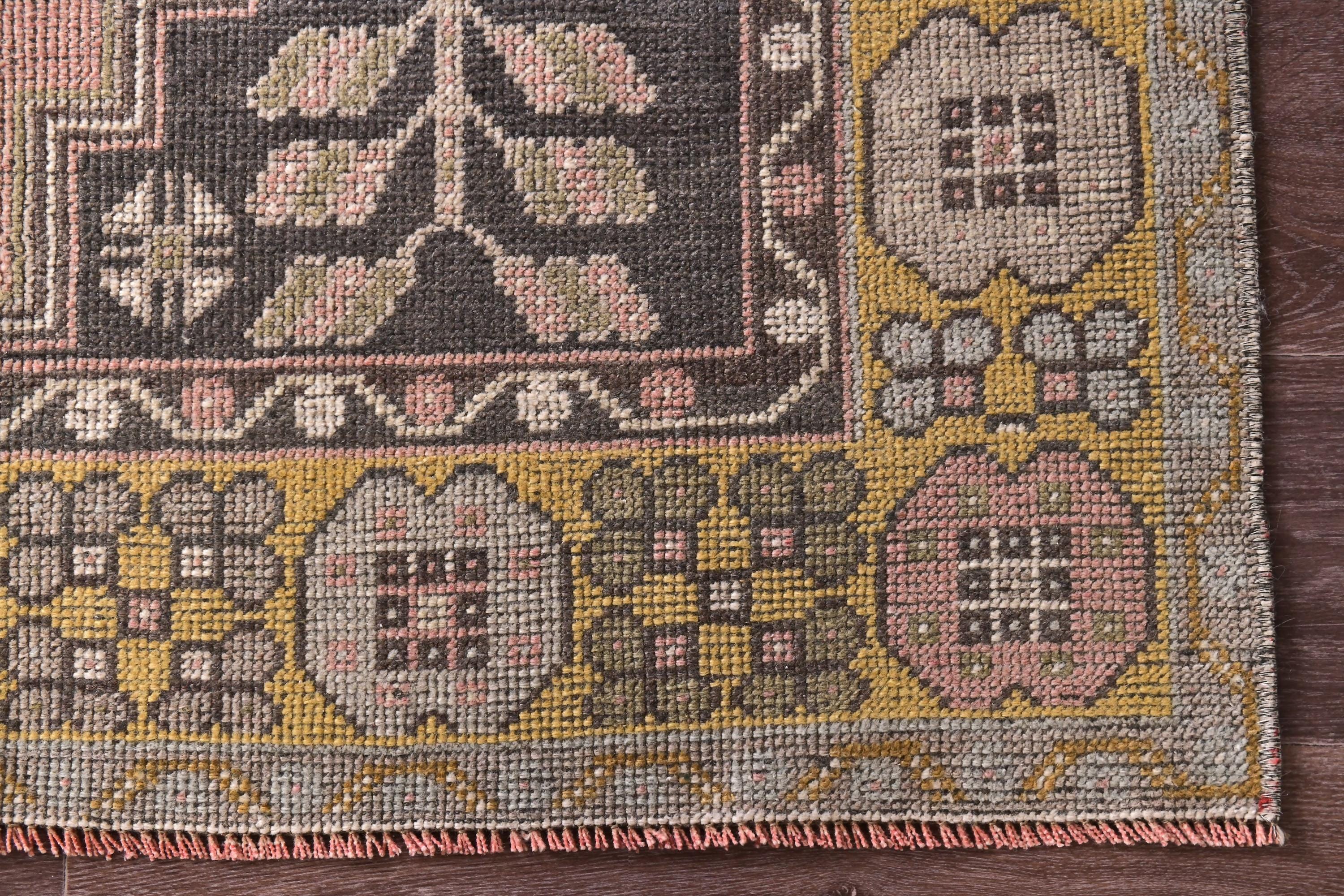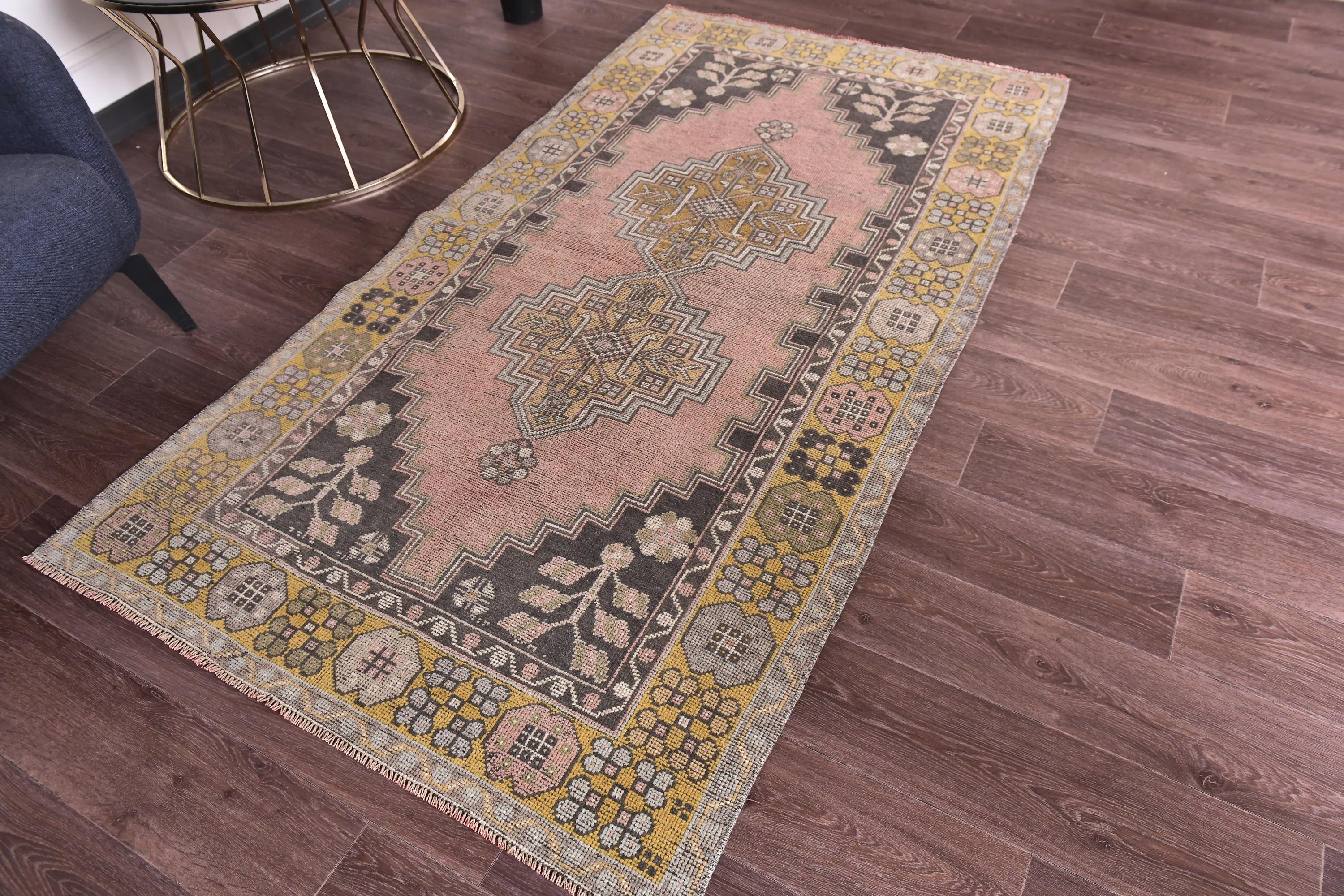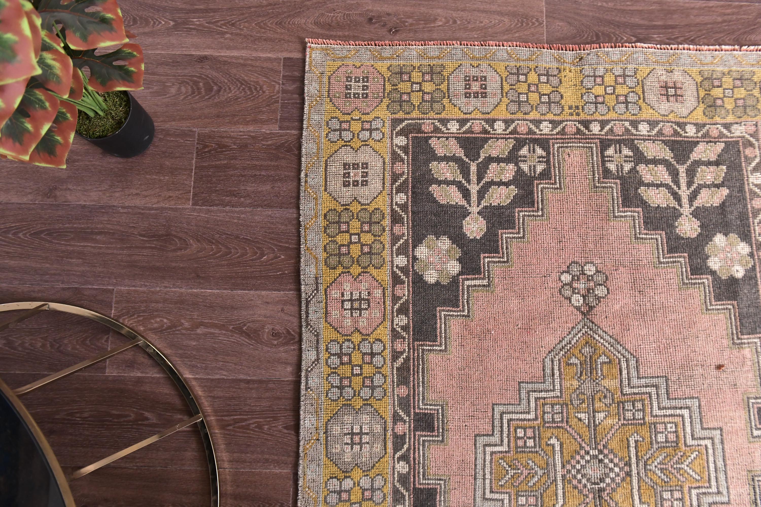 📜📌 Vintage Turkish area rug featuring a bold geometric star medallion on a vibrant coral-salmon field. The hand-knotted wool carpet displays intricate tribal motifs with charcoal gray, olive green, and peachy tones. Decorative zigzag borders frame the central design, complemented by wide floral-patterned side borders in muted olive and cream. The low-pile weave shows authentic vintage wear and natural patina, perfect for small spaces and bohemian interiors.