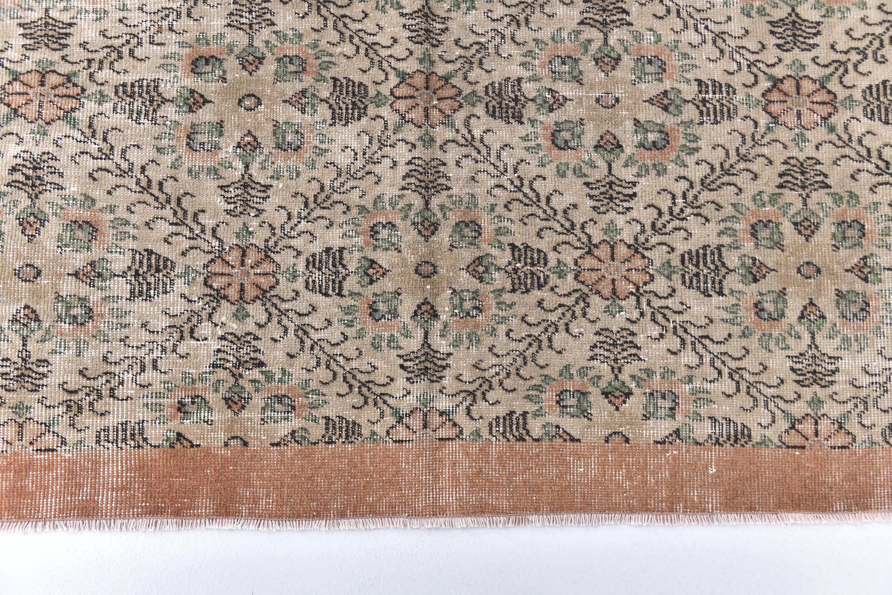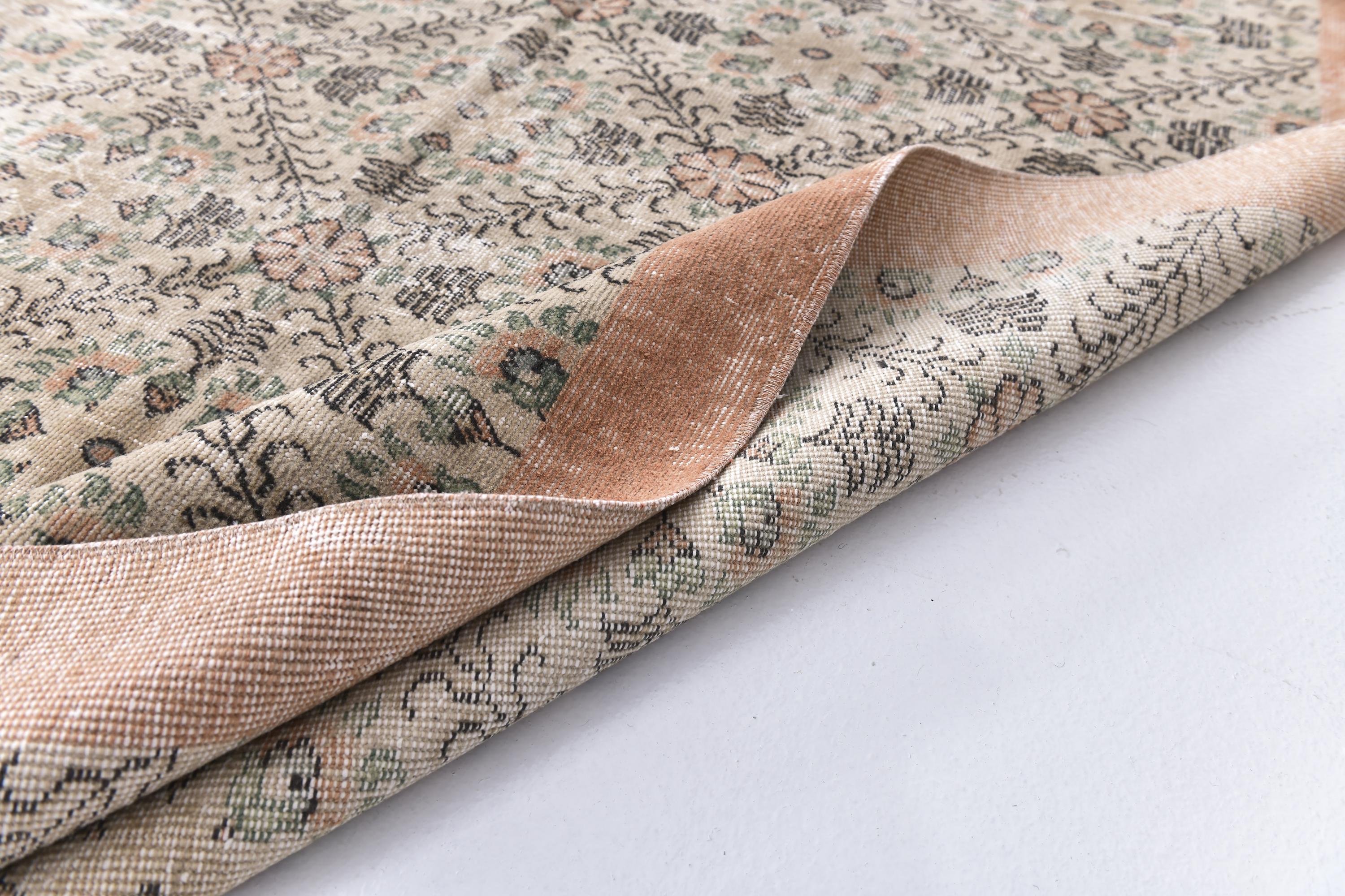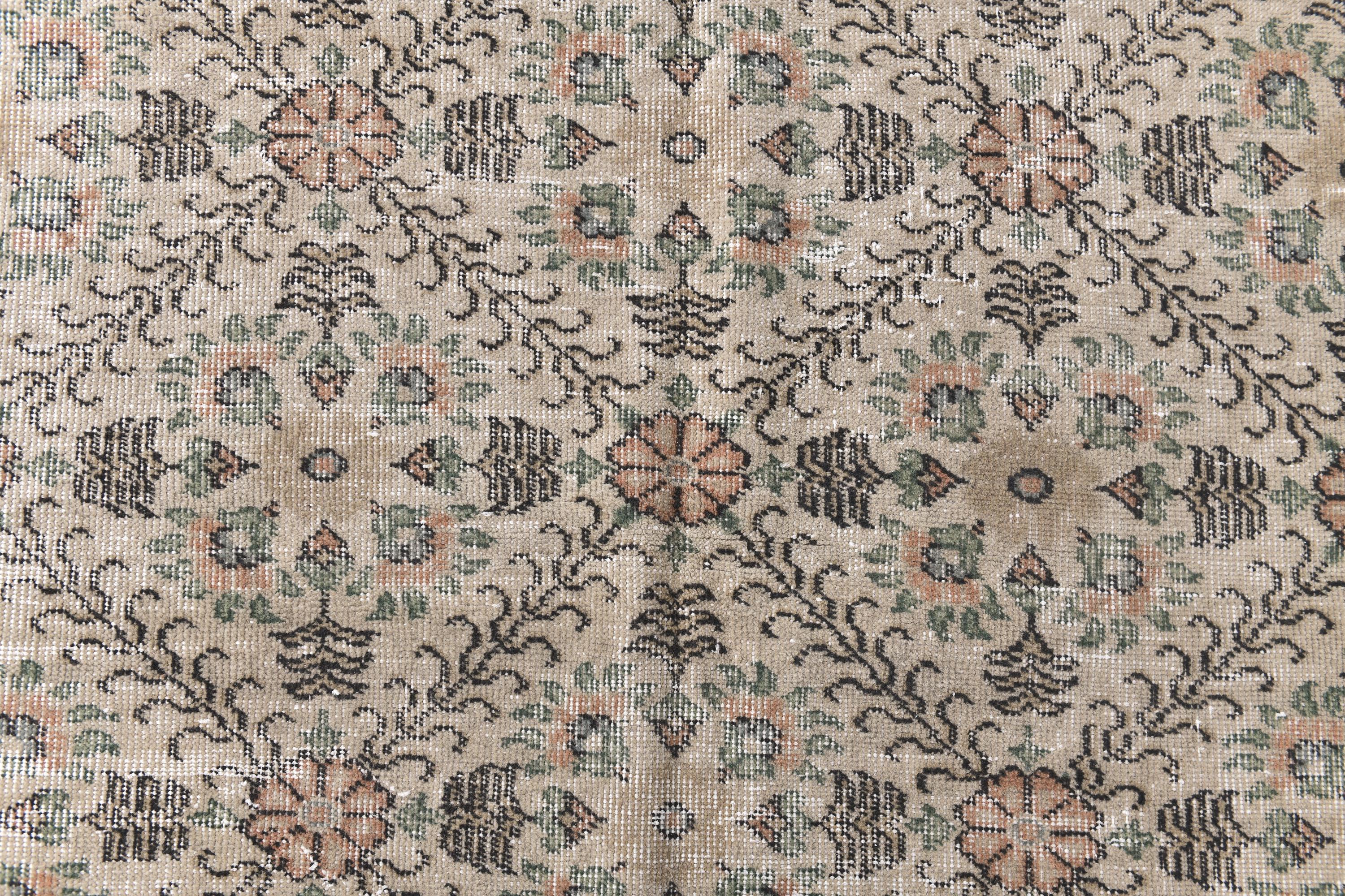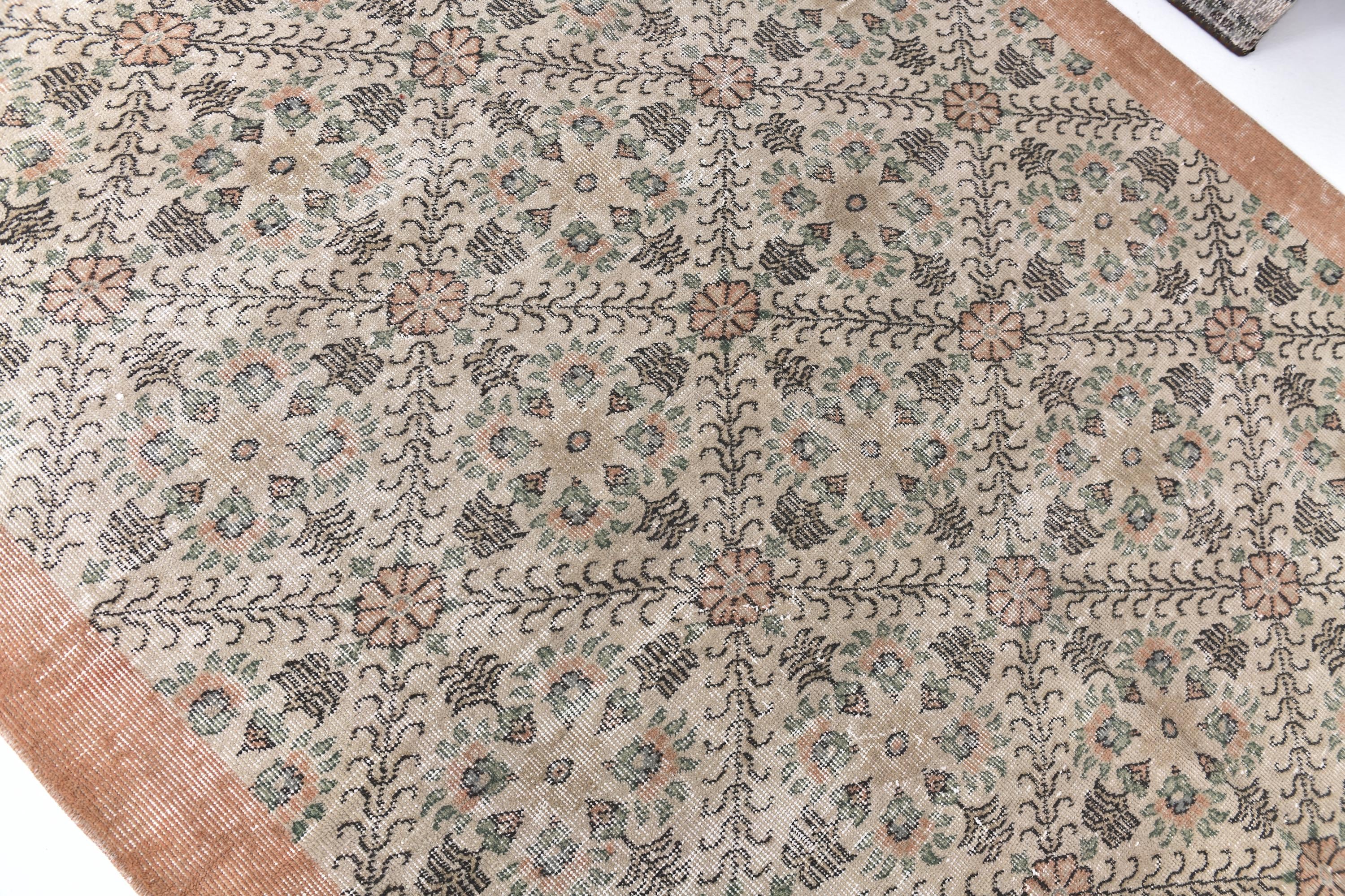 📜📌 Cream and peachy-coral vintage area rug featuring all-over repeating floral motifs with scattered botanical vines, small geometric elements, and decorative borders in warm neutral tones with subtle green accents throughout