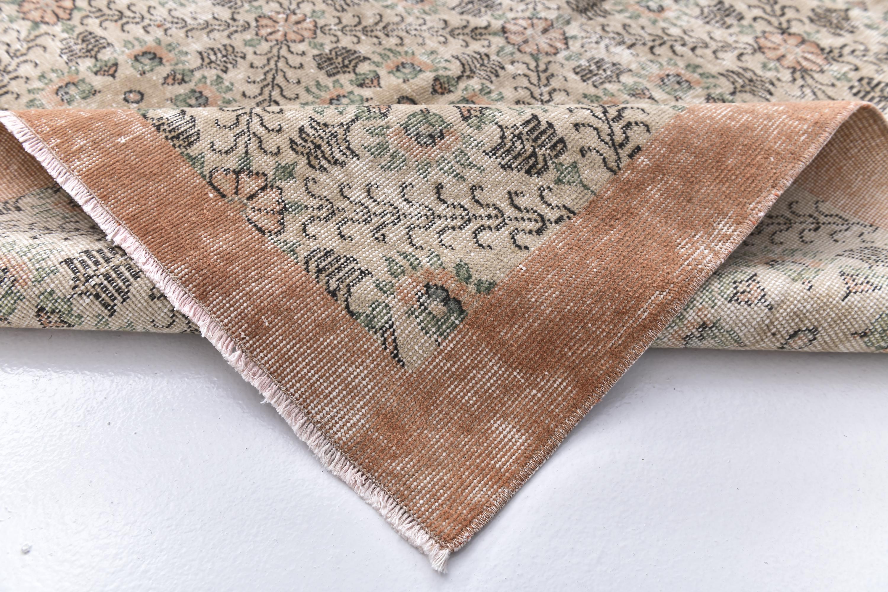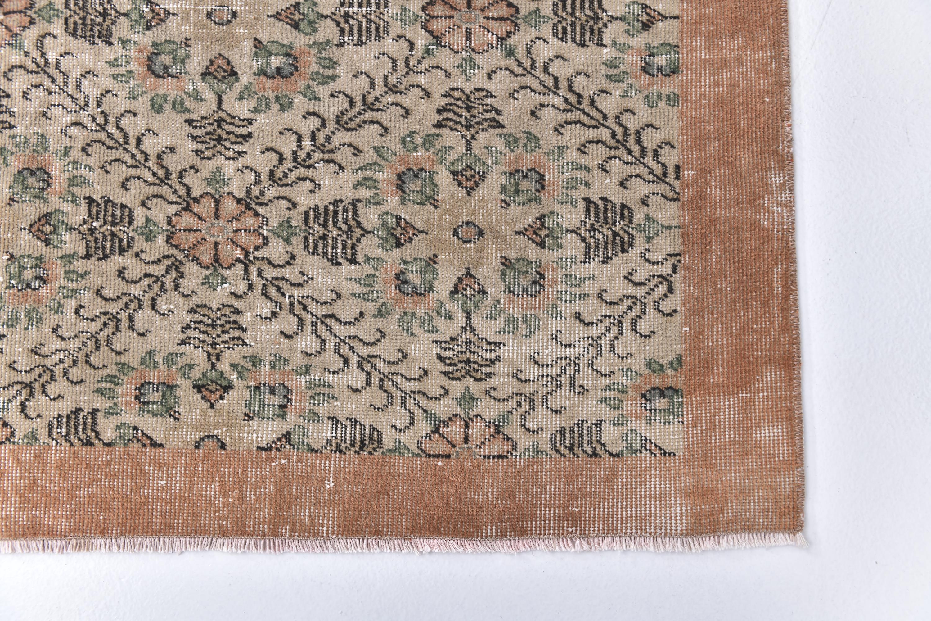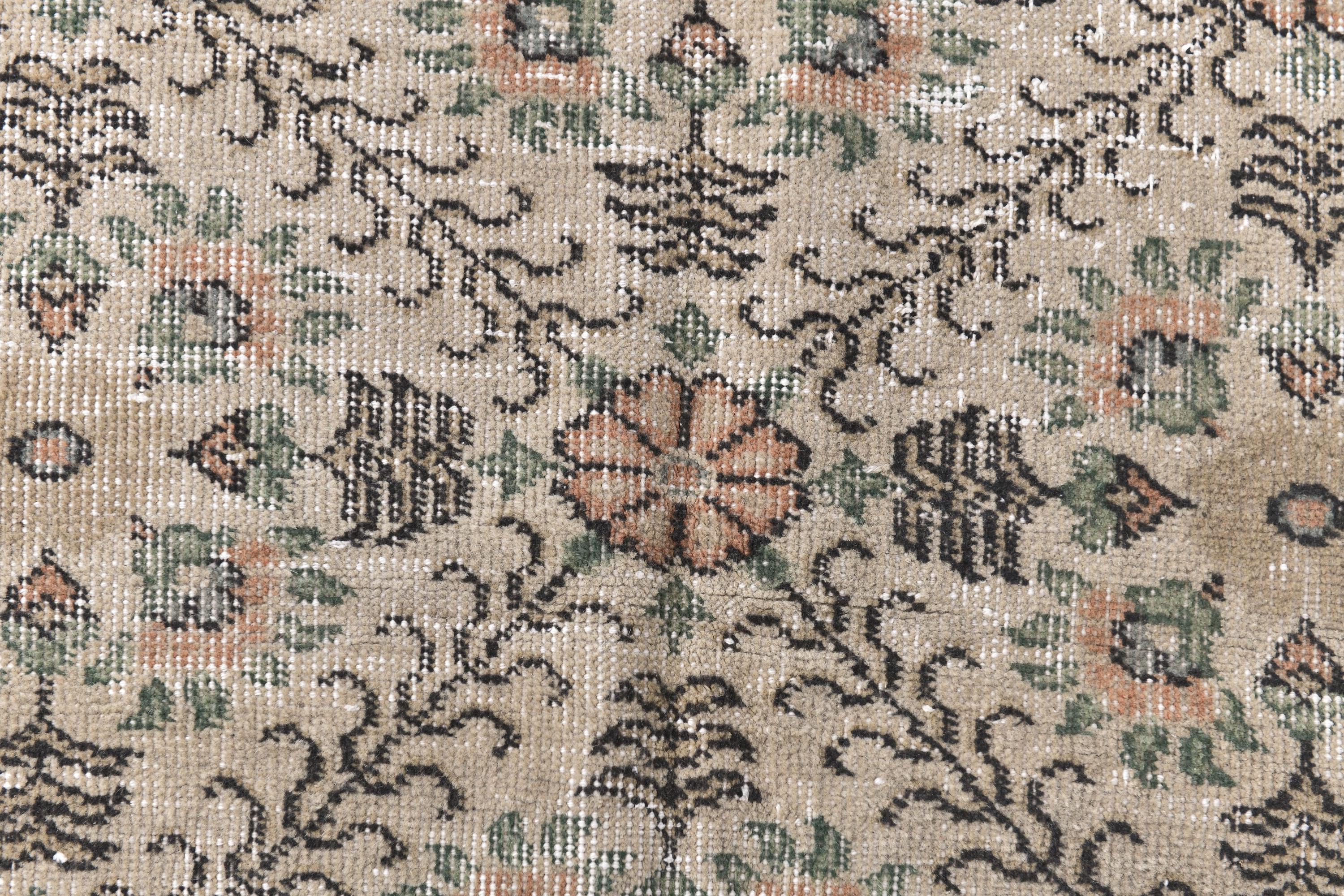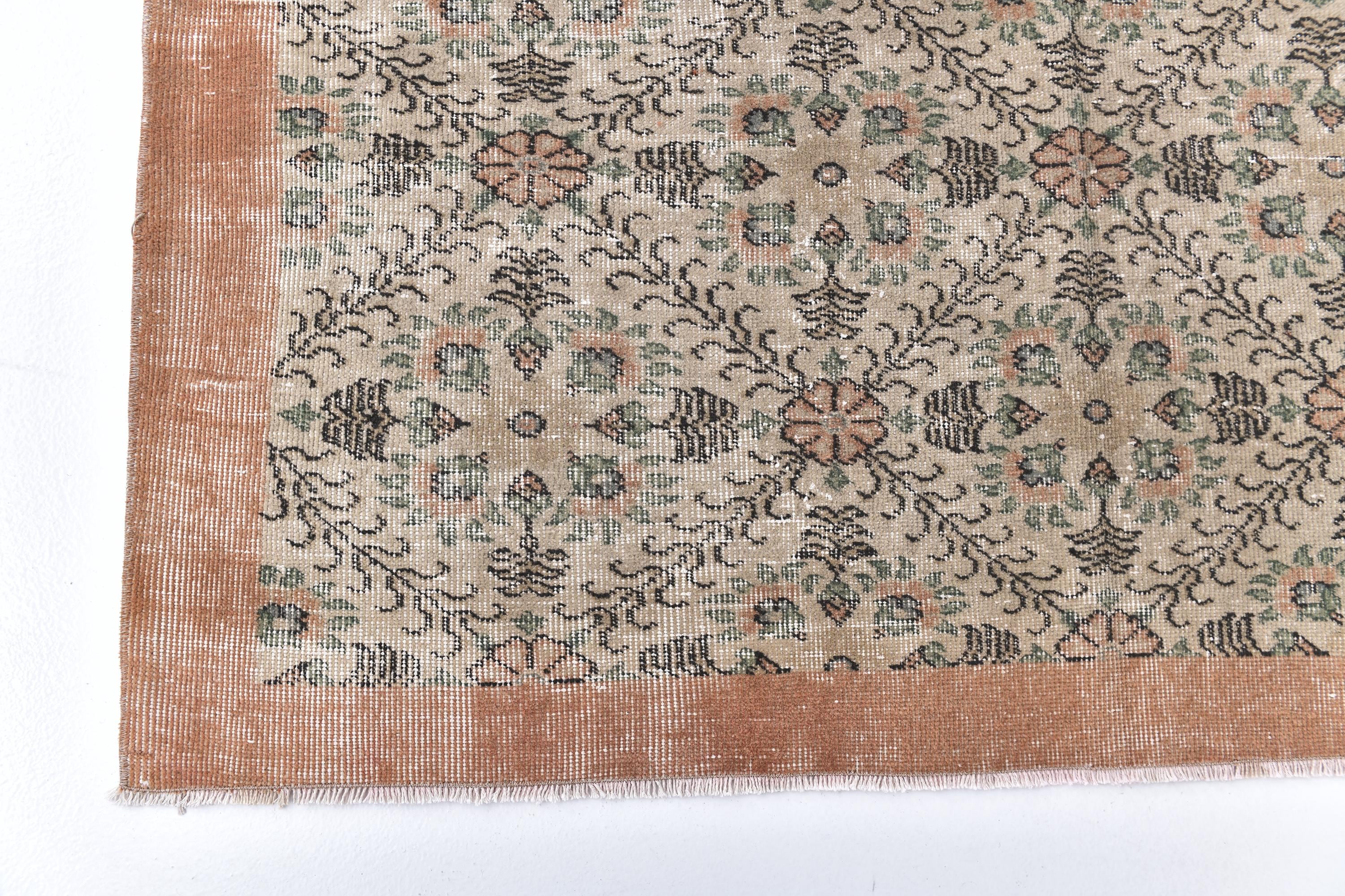 📜📌 Cream and peachy-coral vintage area rug featuring all-over repeating floral motifs with scattered botanical vines, small geometric elements, and decorative borders in warm neutral tones with subtle green accents throughout