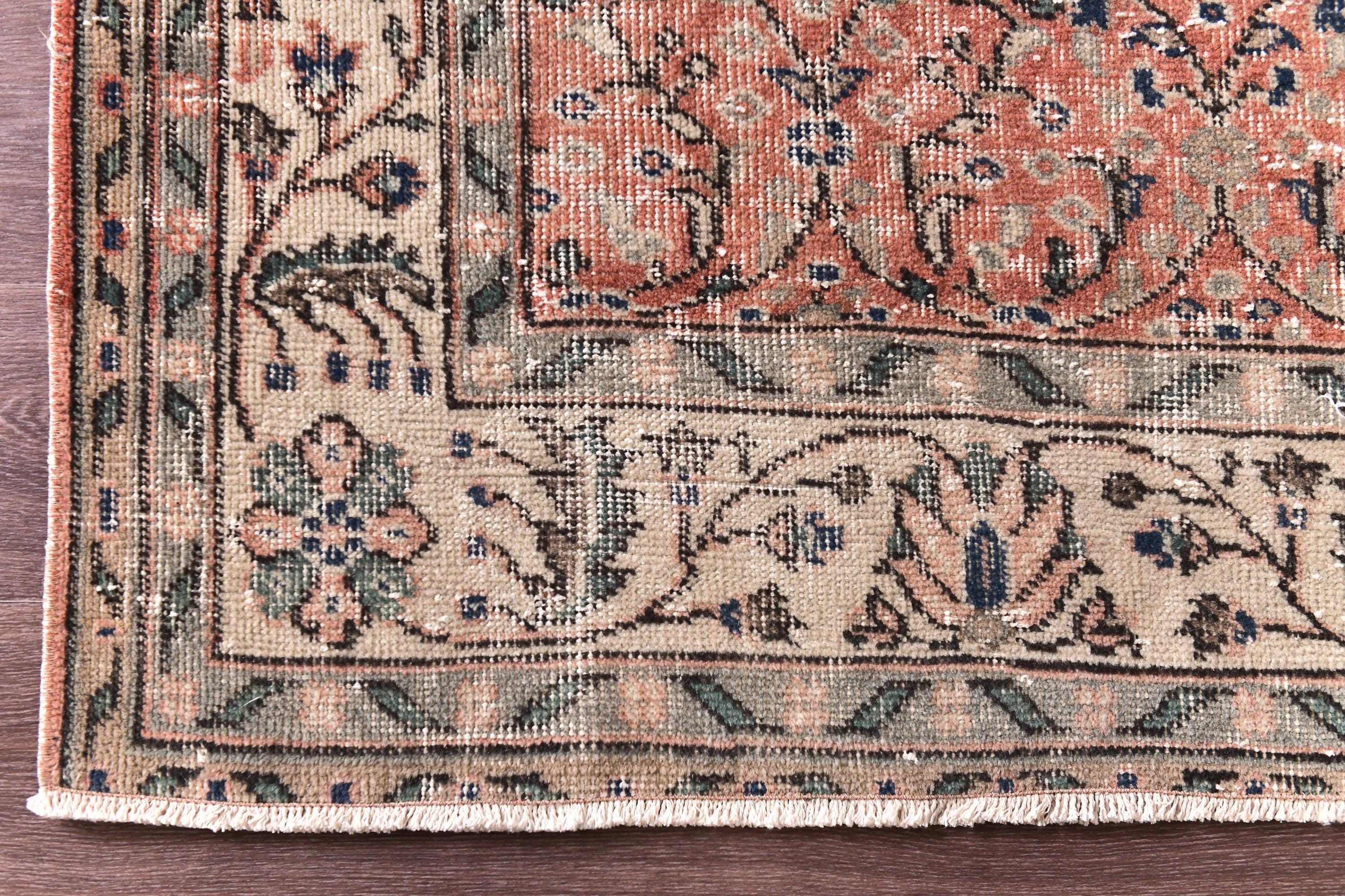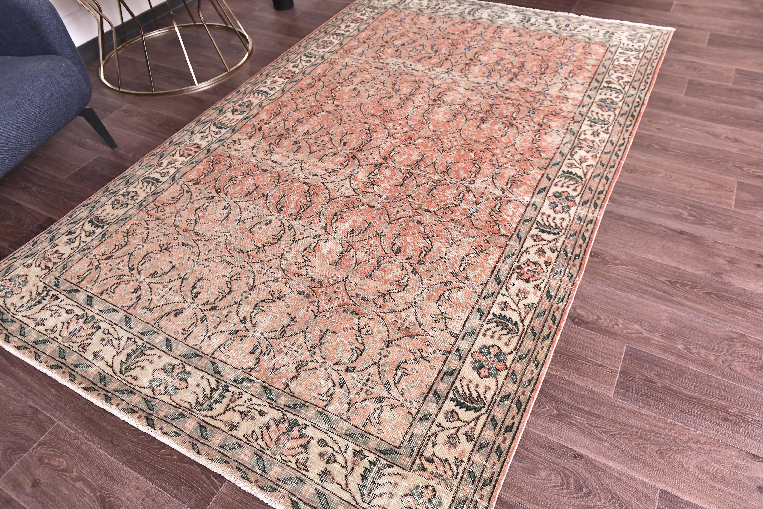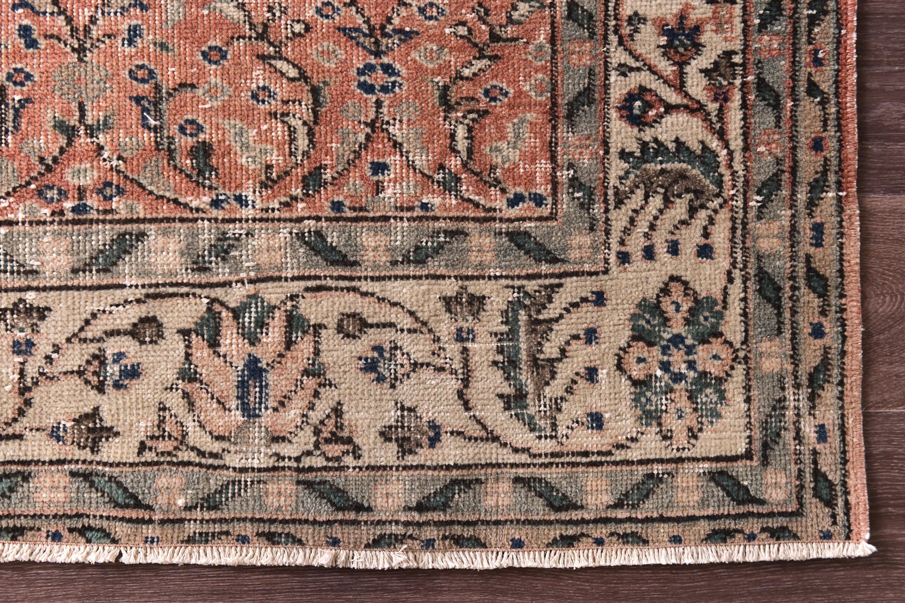 📜📌 Salmon and Green vintage area rug featuring all-over repeating floral motifs with scattered botanical vines, small geometric elements, and decorative borders in warm neutral tones with subtle green accents throughout