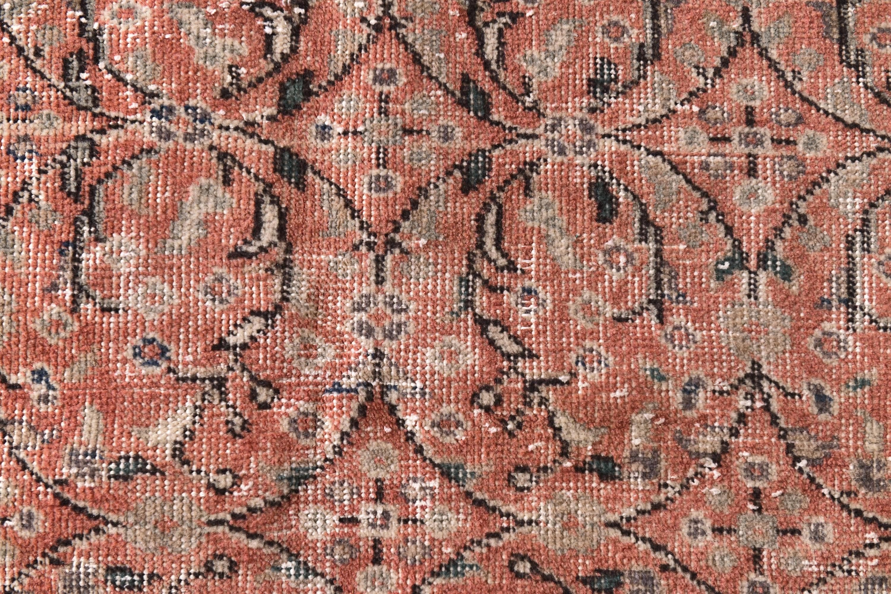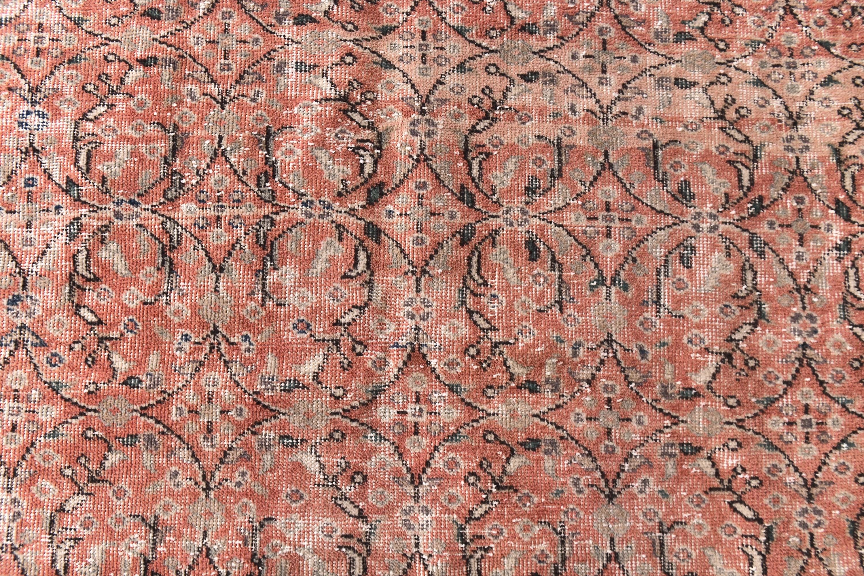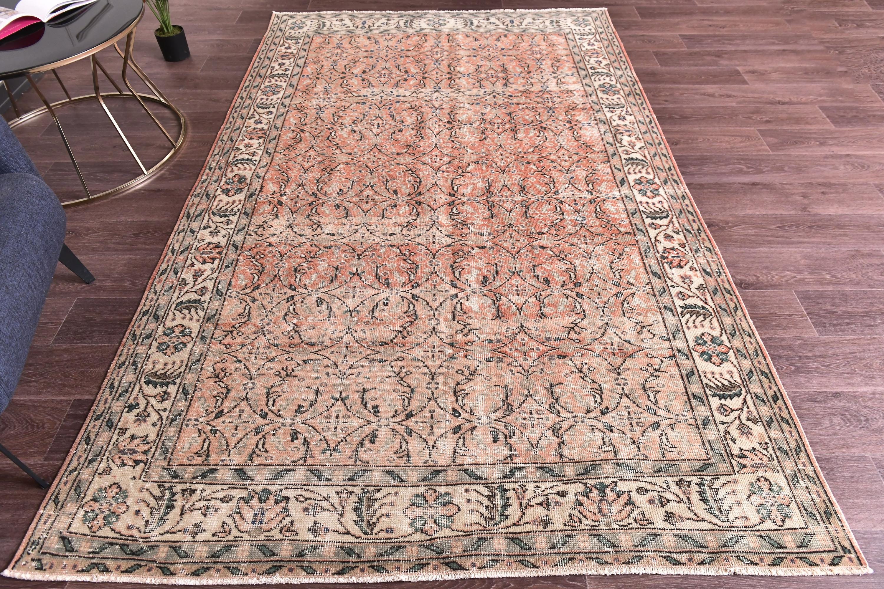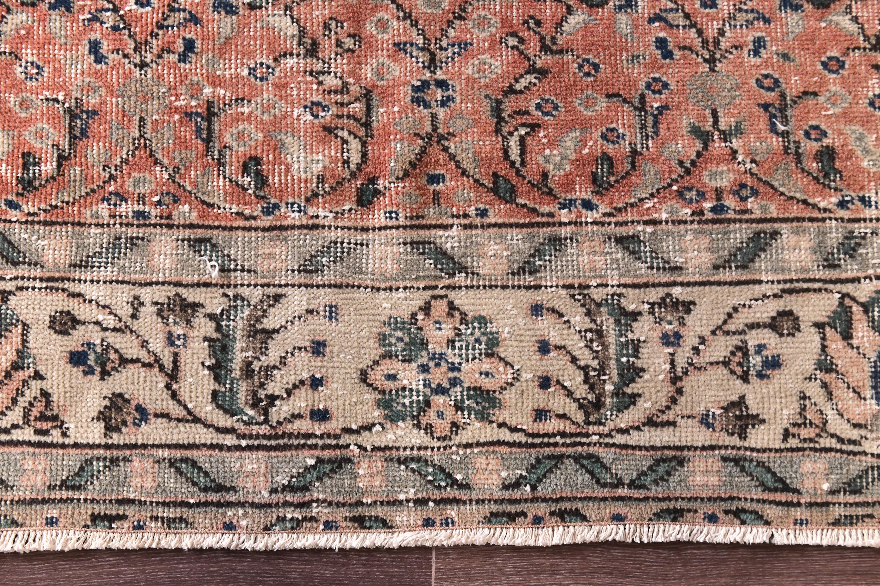 📜📌 Salmon and Green vintage area rug featuring all-over repeating floral motifs with scattered botanical vines, small geometric elements, and decorative borders in warm neutral tones with subtle green accents throughout