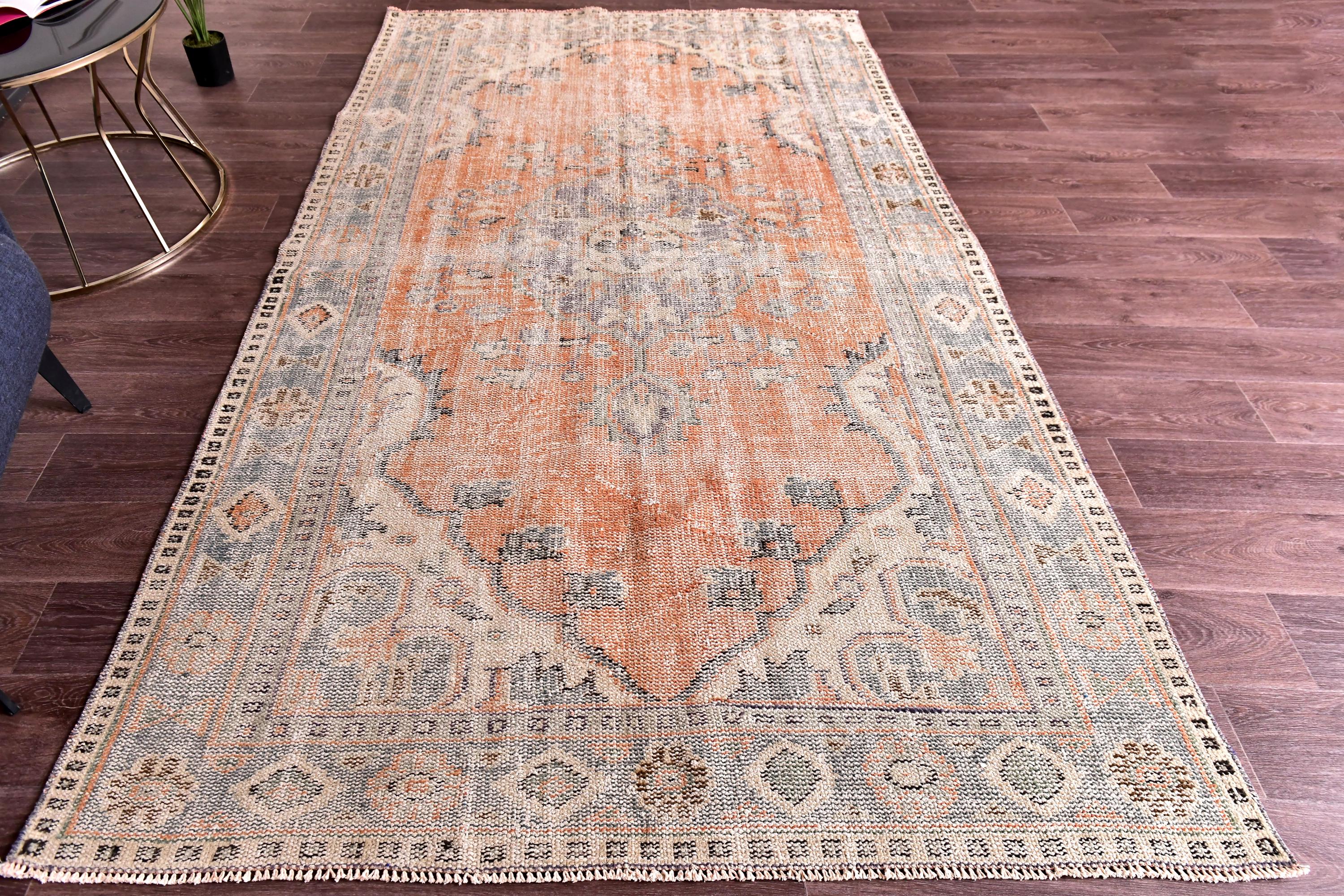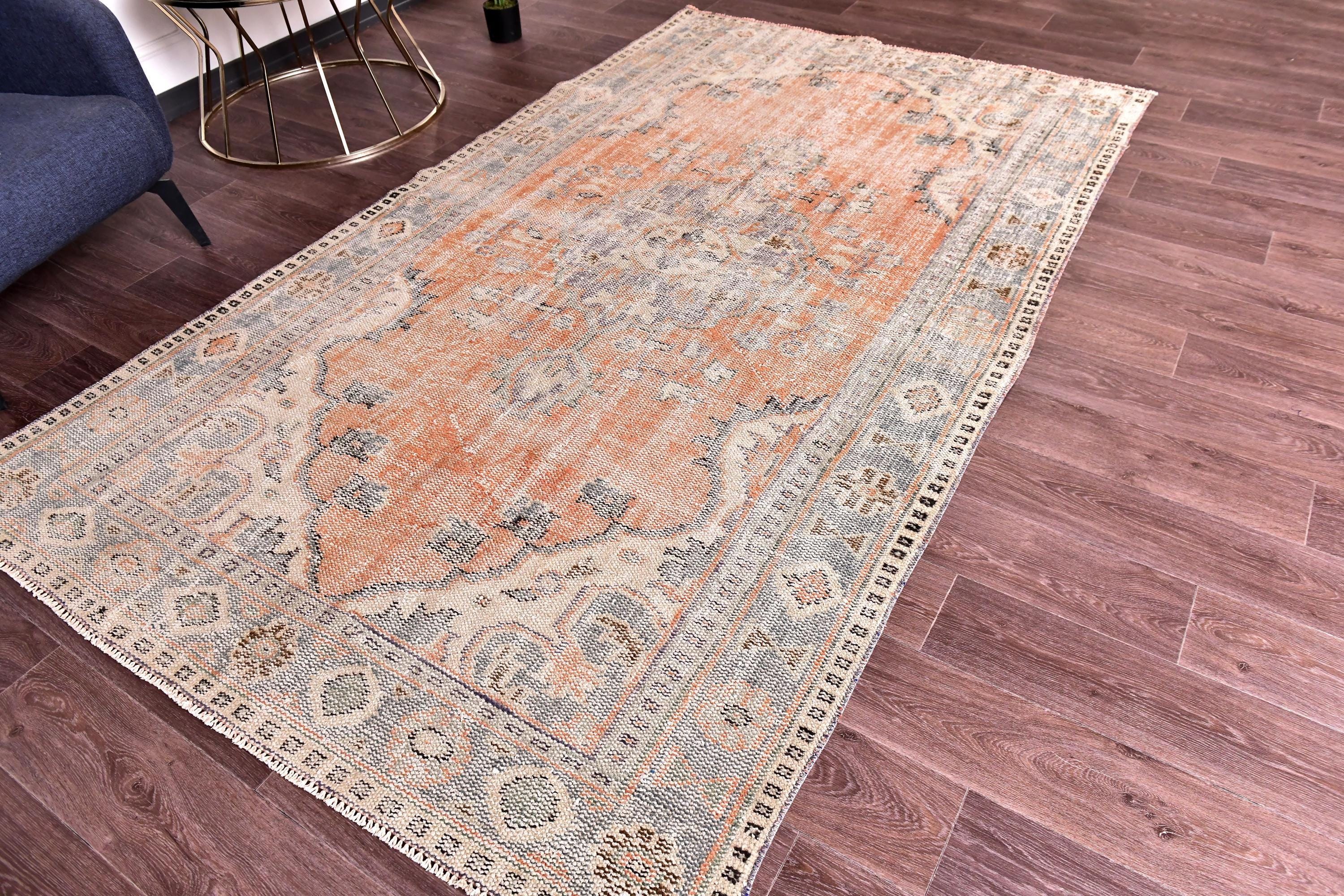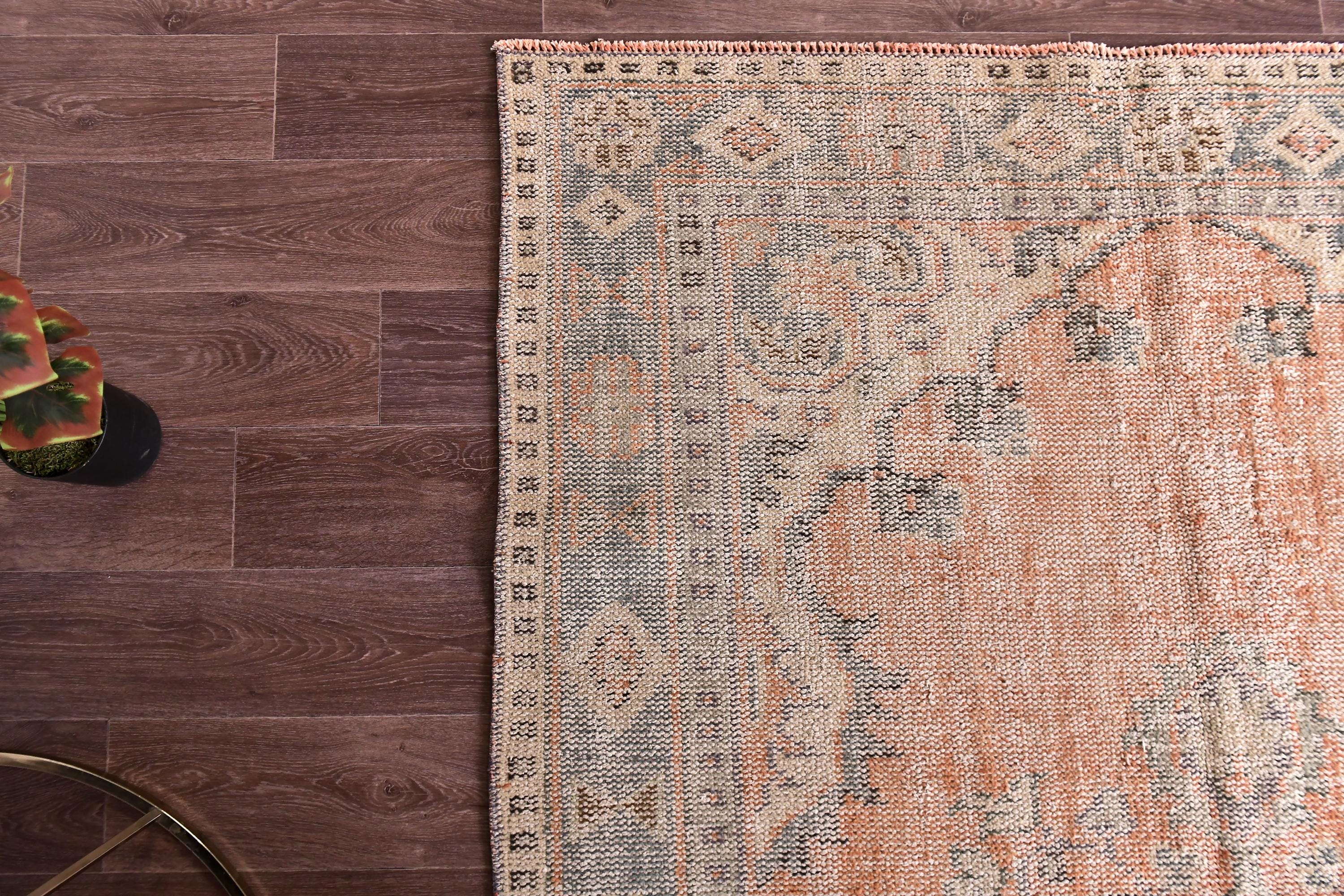 📜📌 Large vintage distressed area rug with orange and peachy tone base, gray and teal blue faded tribal patterns throughout, handwoven authentic Turkish kilim with worn vintage aesthetic, traditional geometric design with special textured weave and natural color variations
