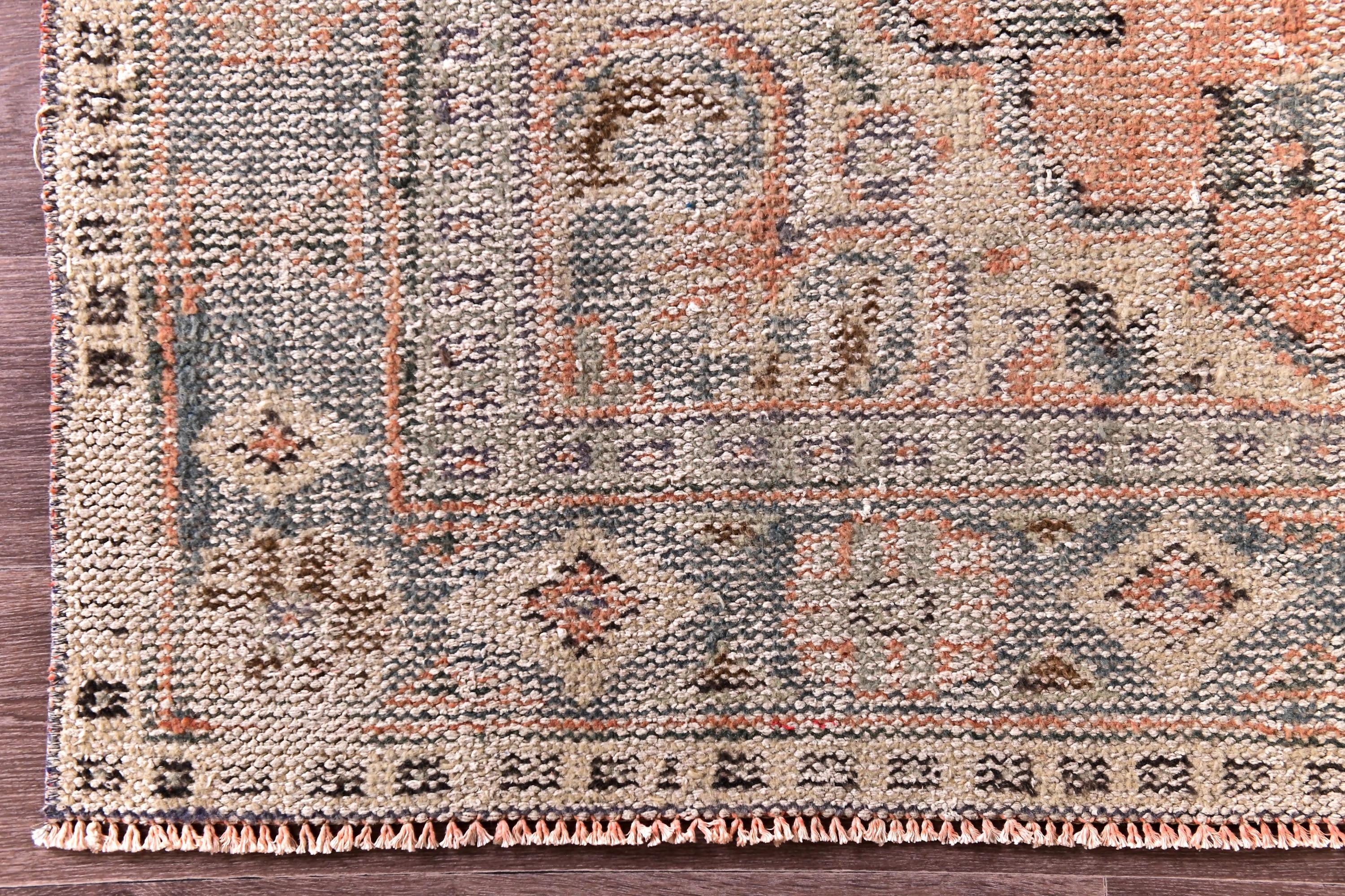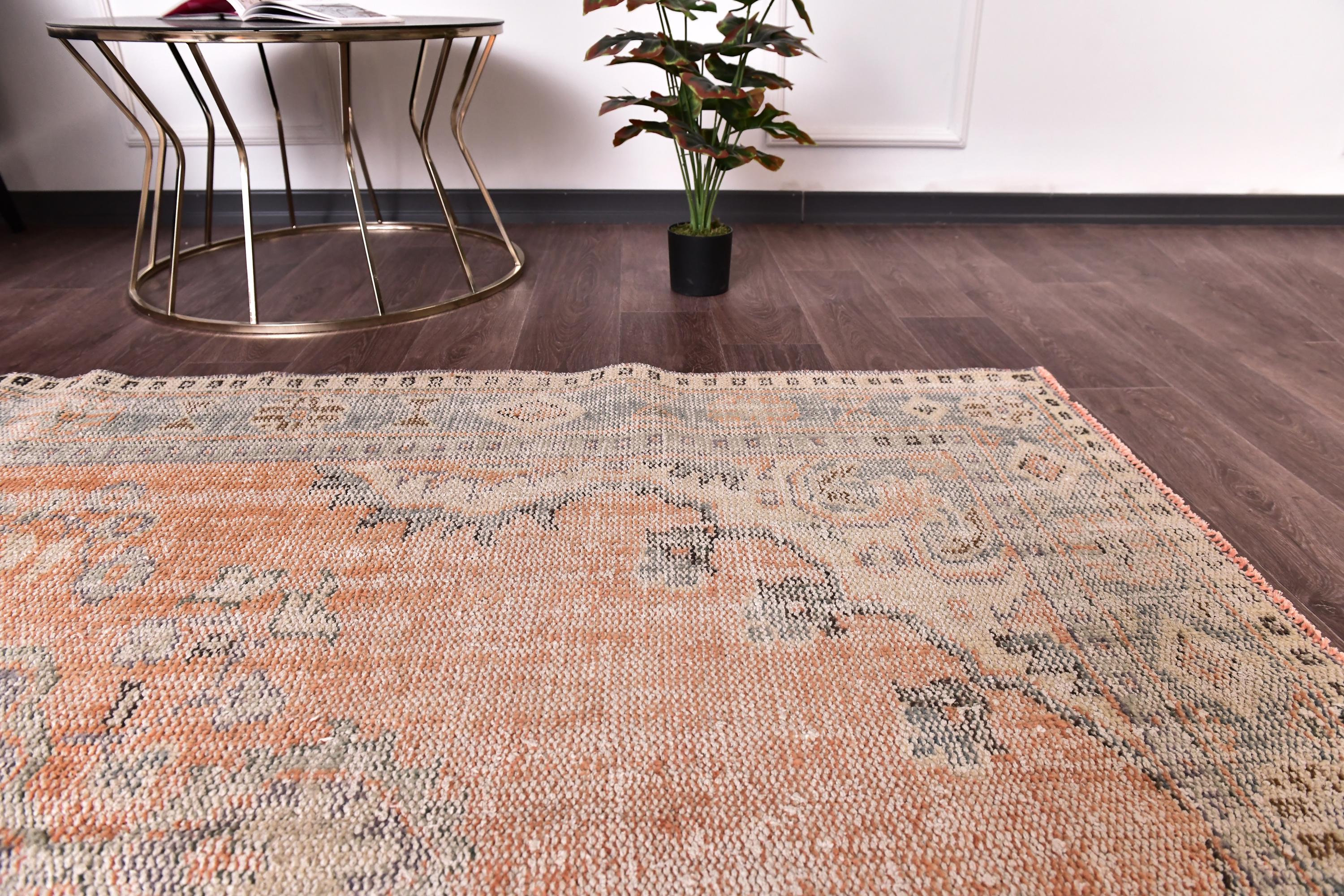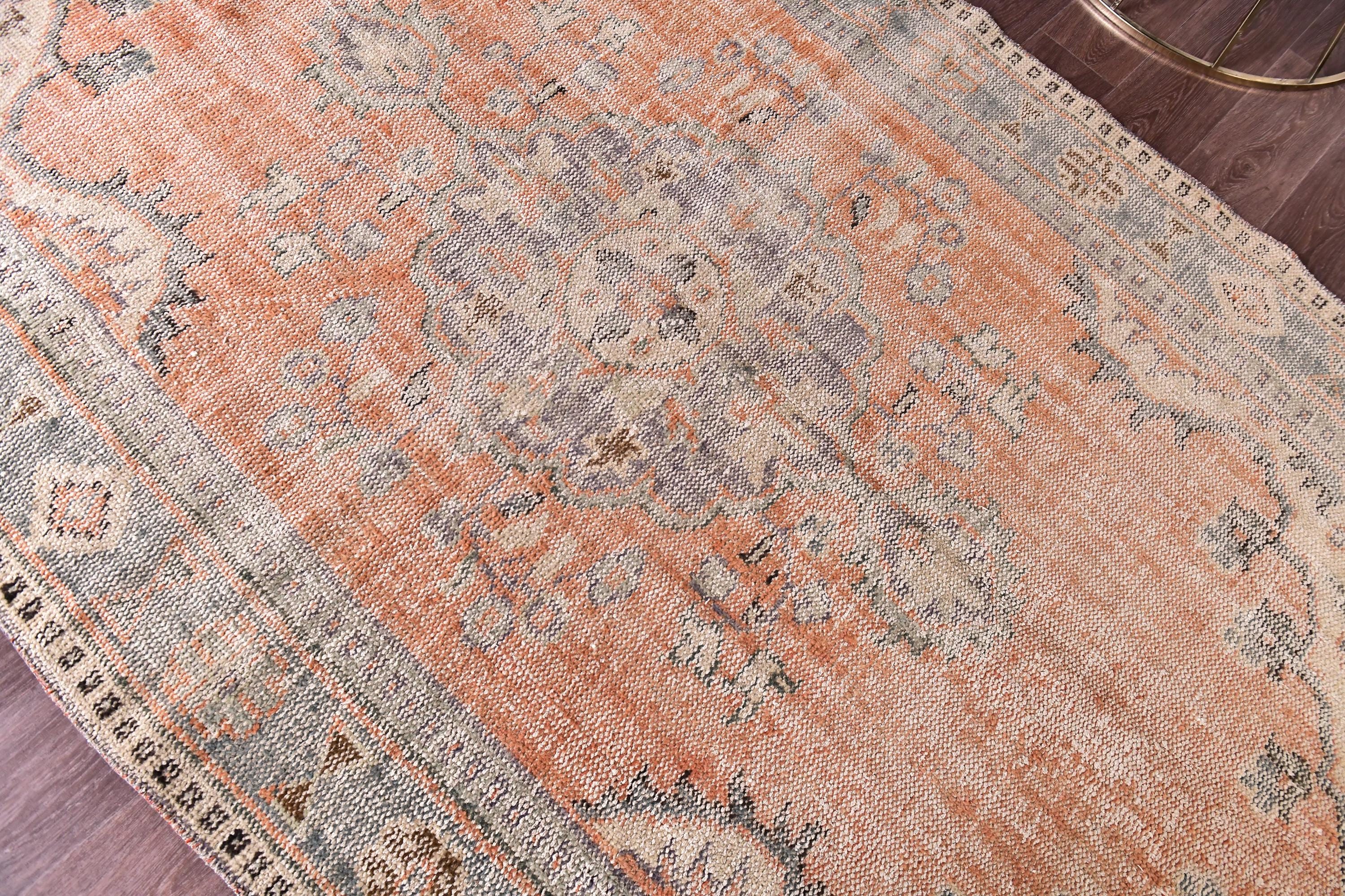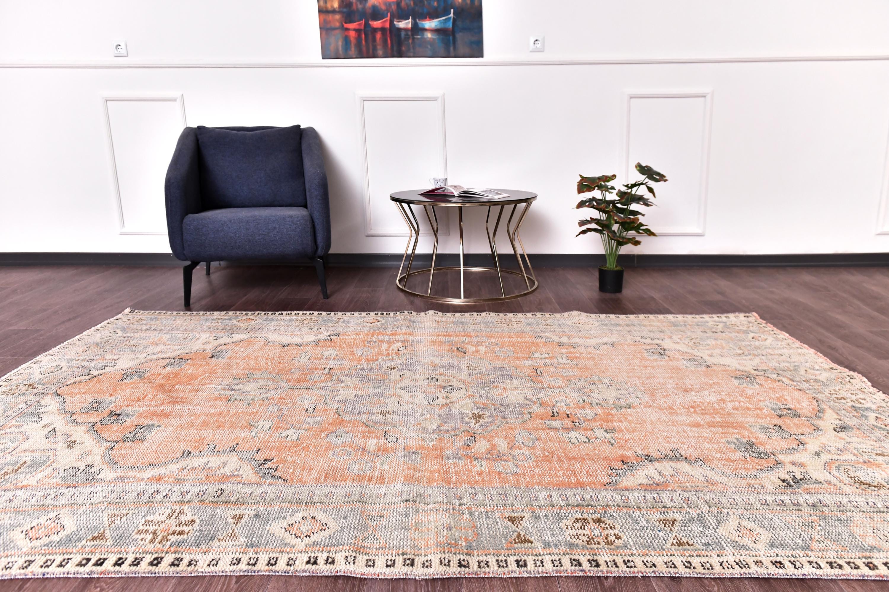 📜📌 Large vintage distressed area rug with orange and peachy tone base, gray and teal blue faded tribal patterns throughout, handwoven authentic Turkish kilim with worn vintage aesthetic, traditional geometric design with special textured weave and natural color variations