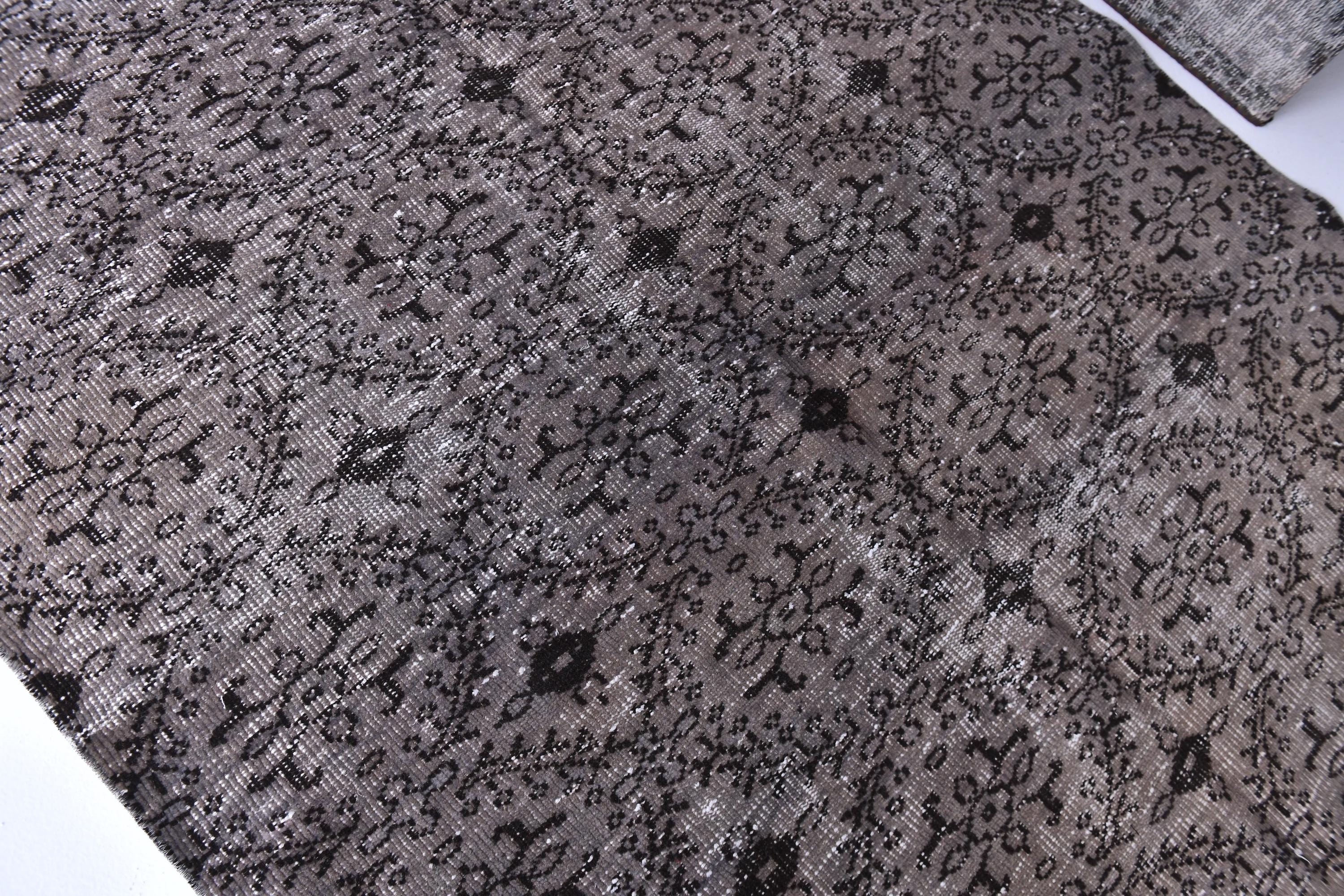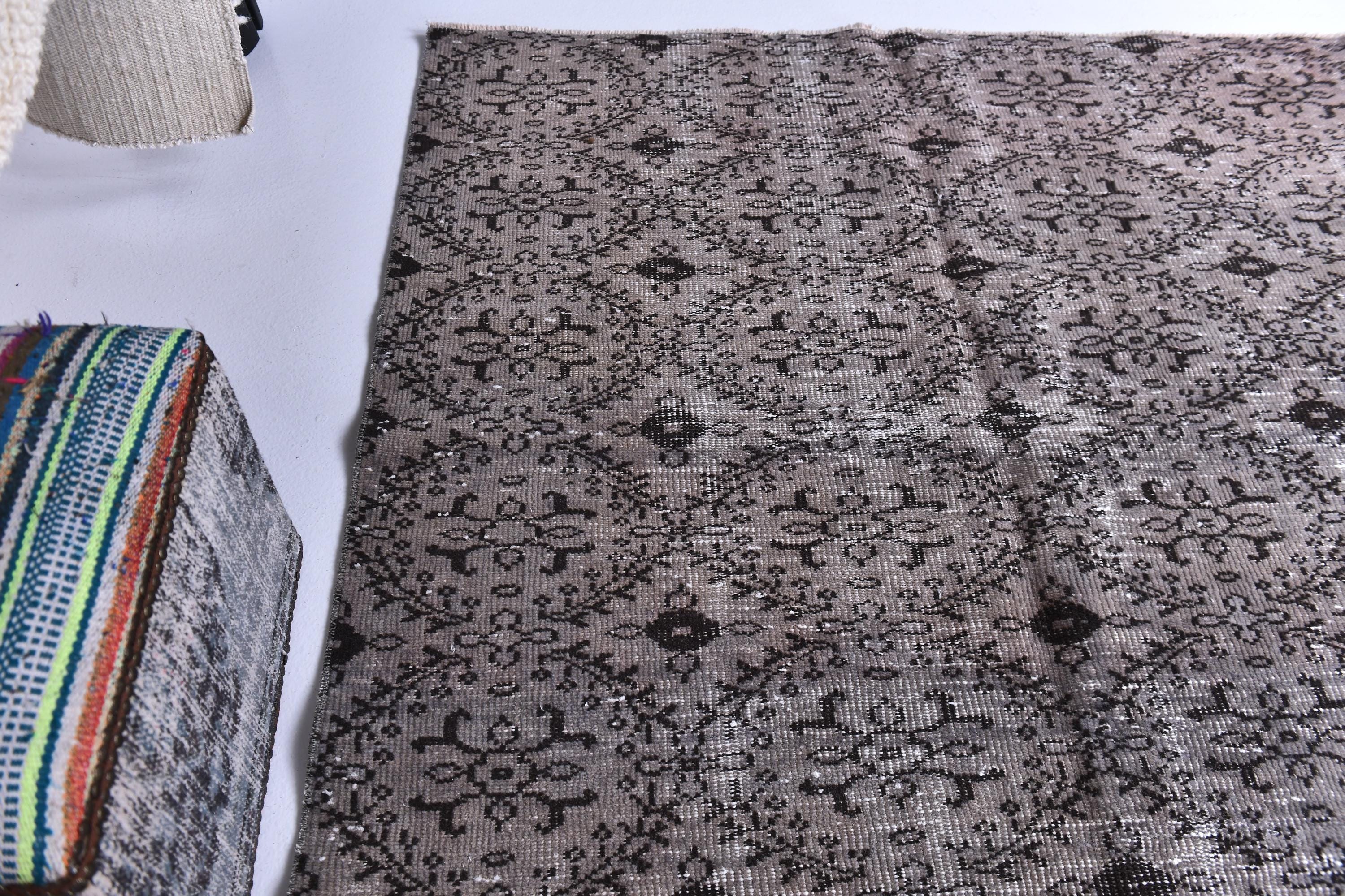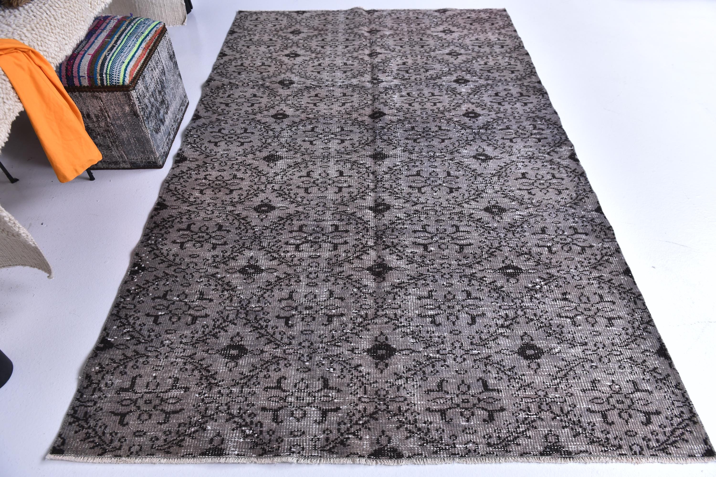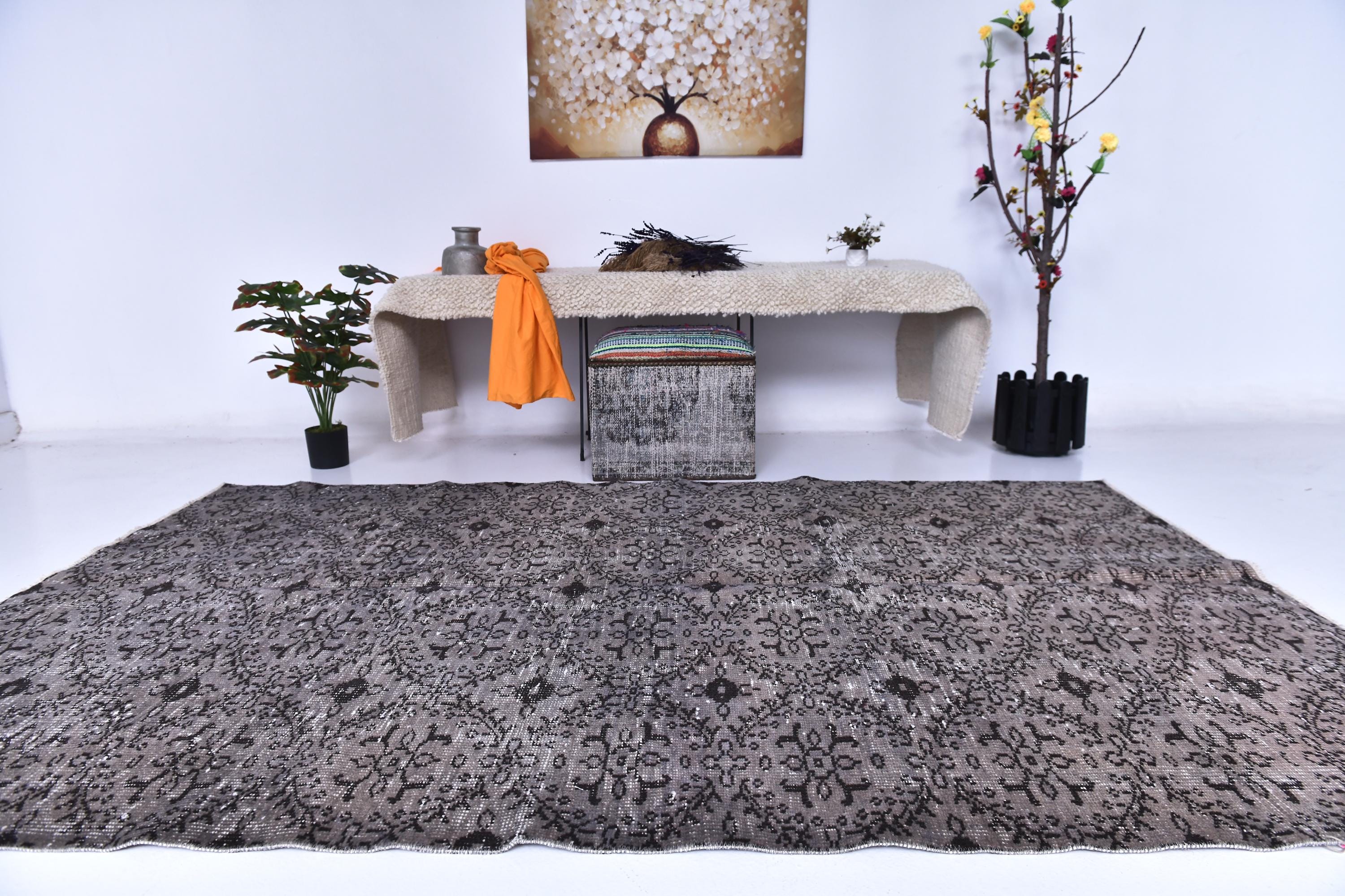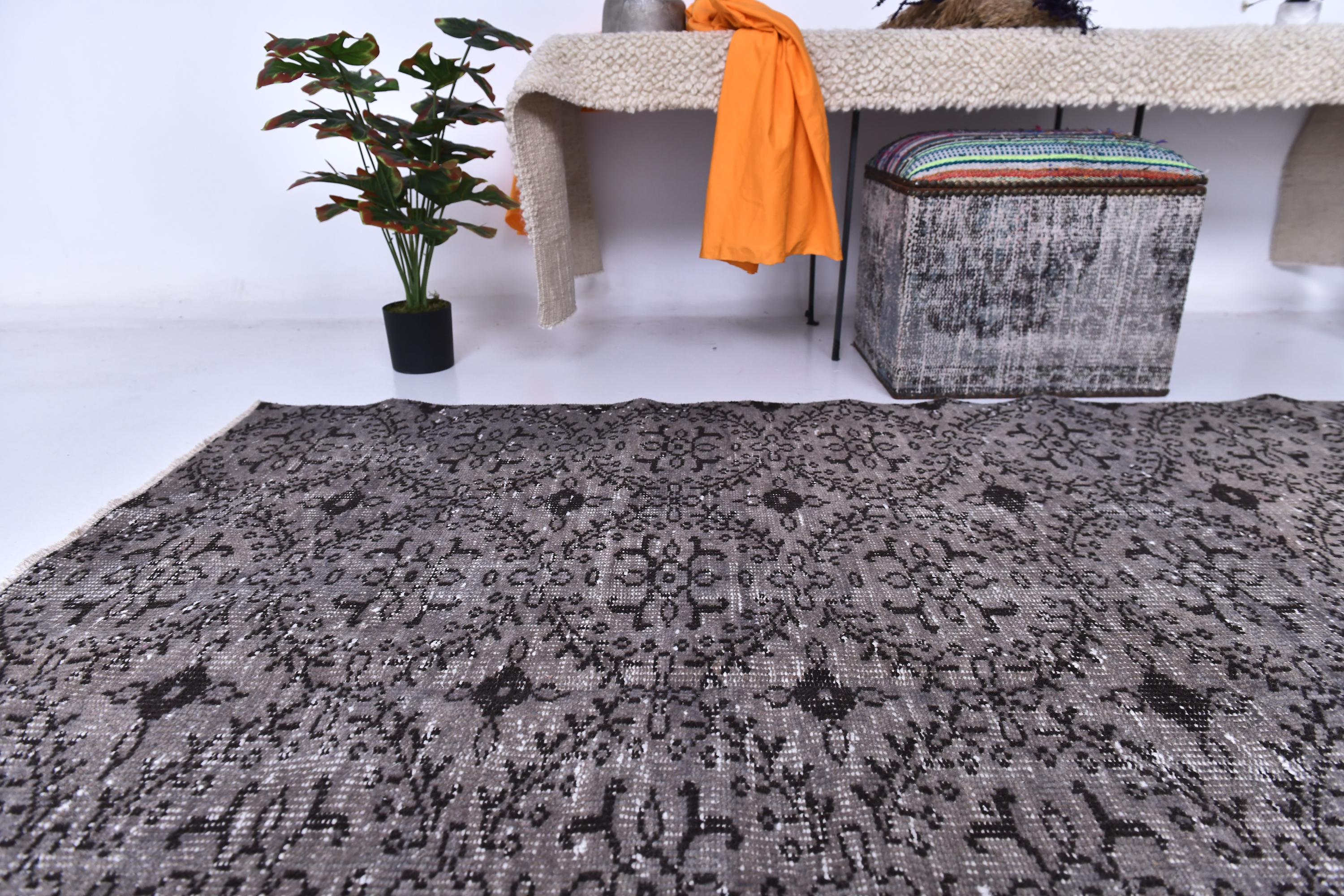 📜📌 Vintage grey area rug with charcoal black distressed floral pattern featuring traditional Turkish motifs, antique-style carpet with aged worn appearance displayed in bright room next to decorative storage bench