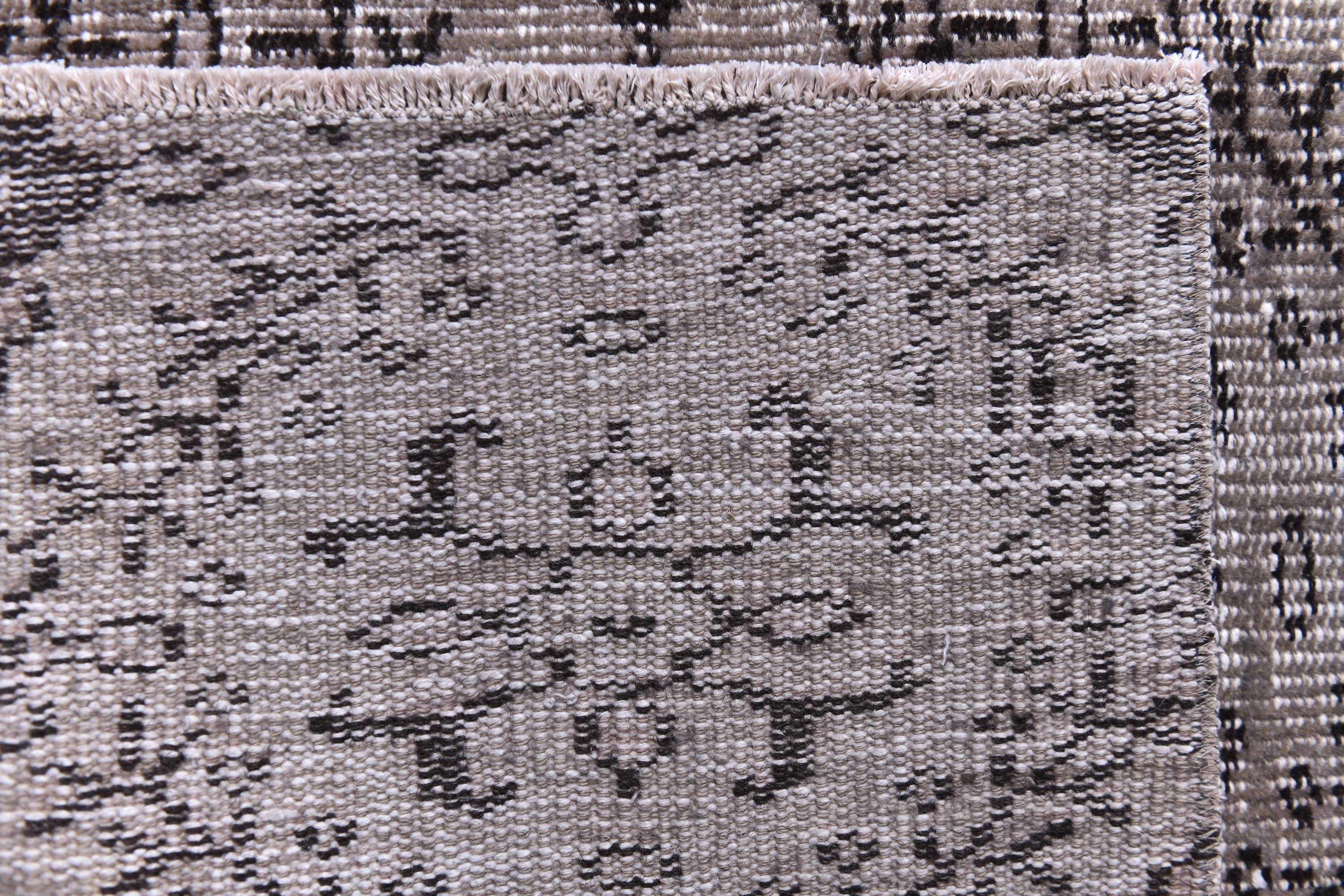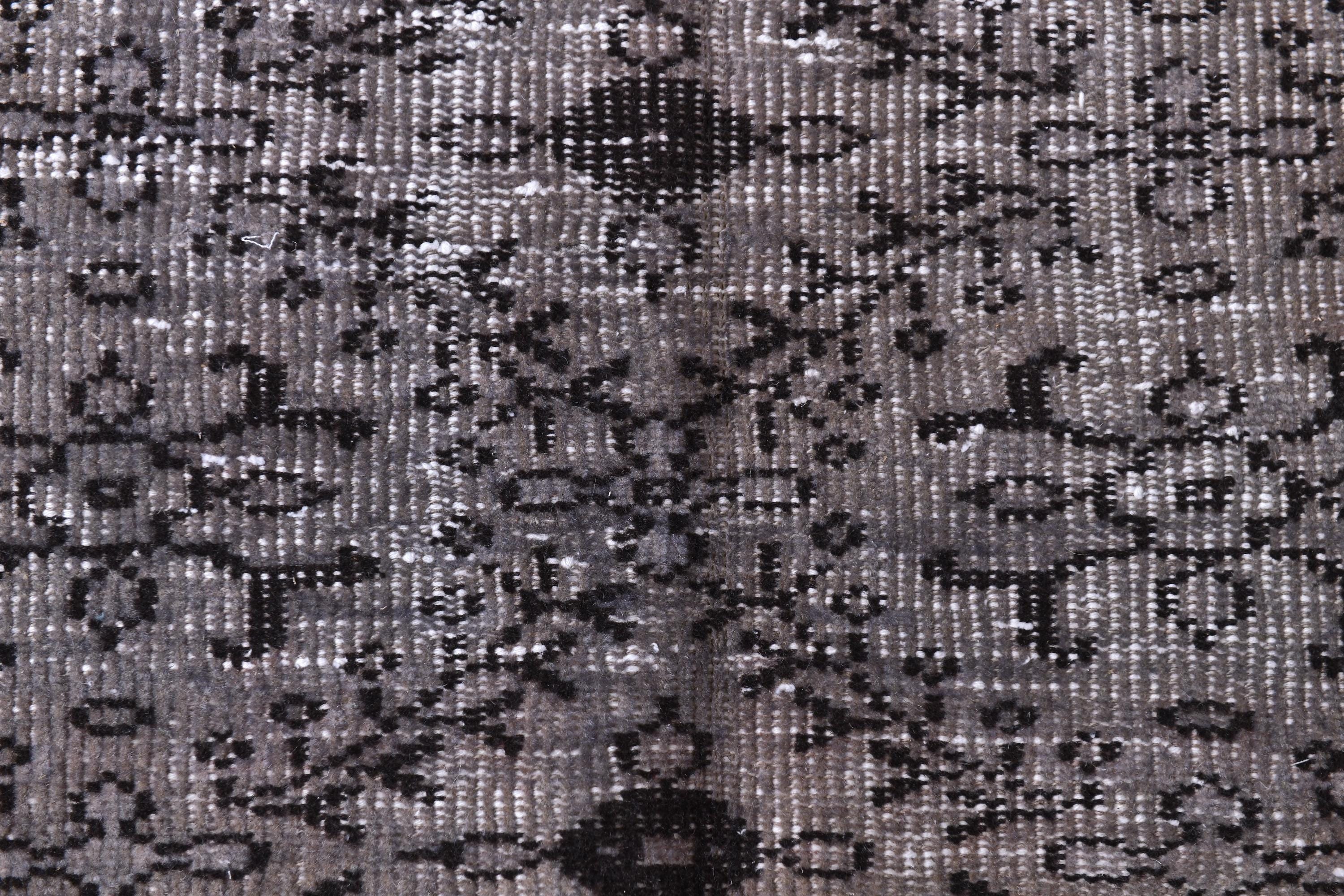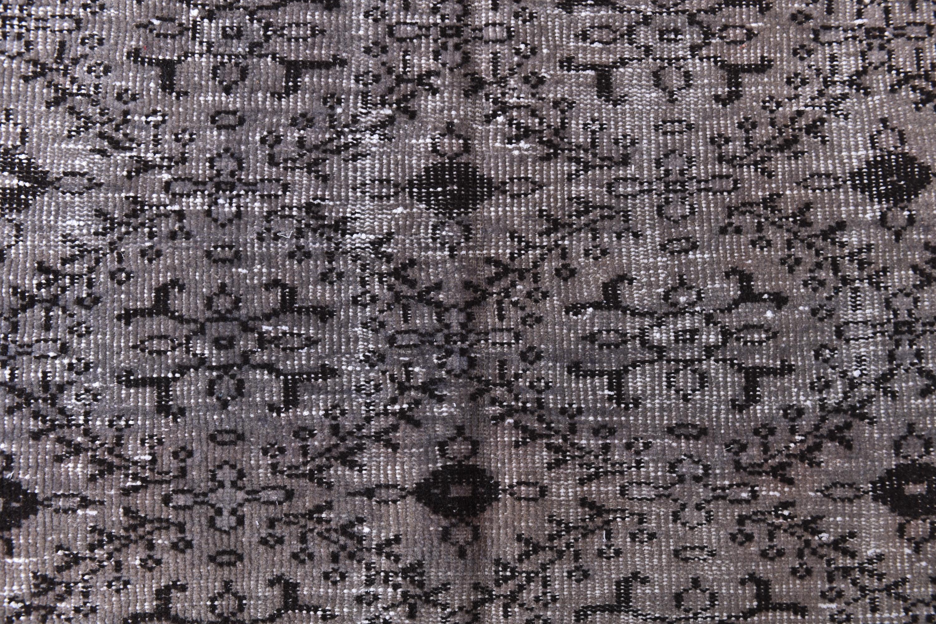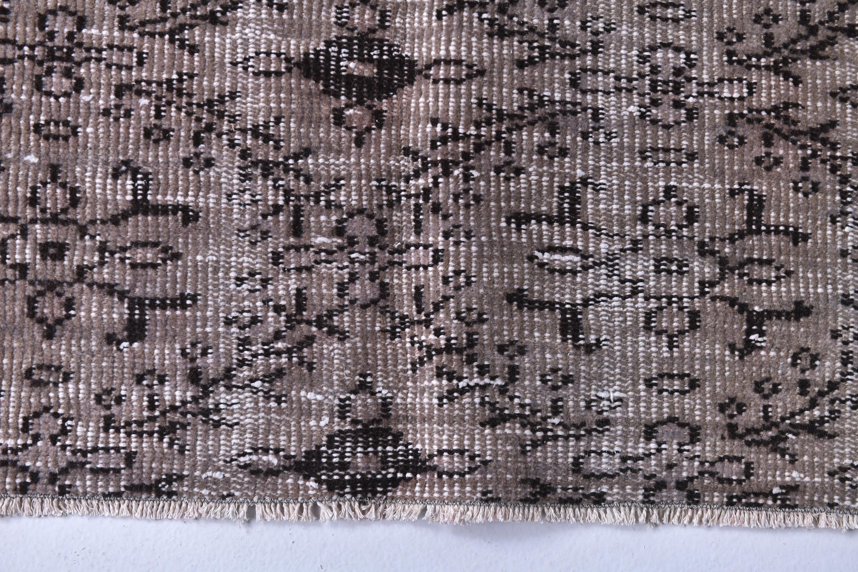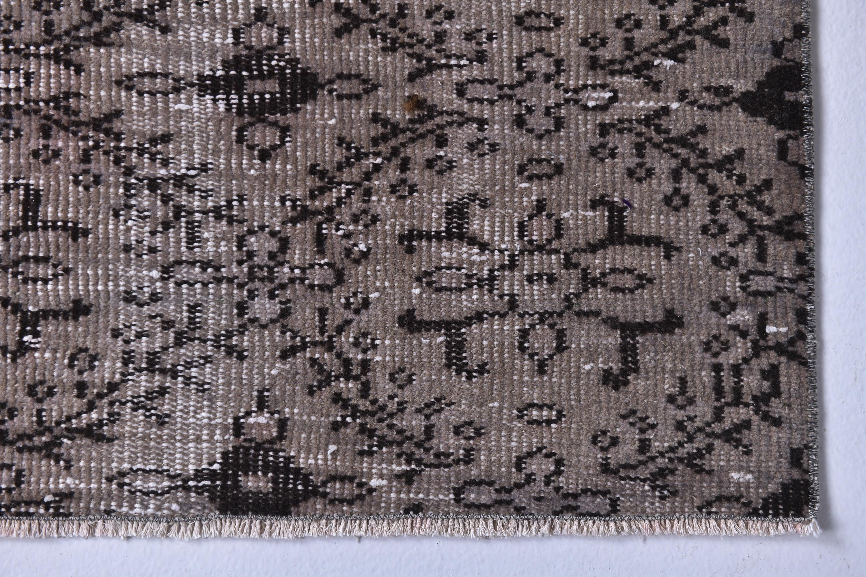 📜📌 Vintage grey area rug with charcoal black distressed floral pattern featuring traditional Turkish motifs, antique-style carpet with aged worn appearance displayed in bright room next to decorative storage bench