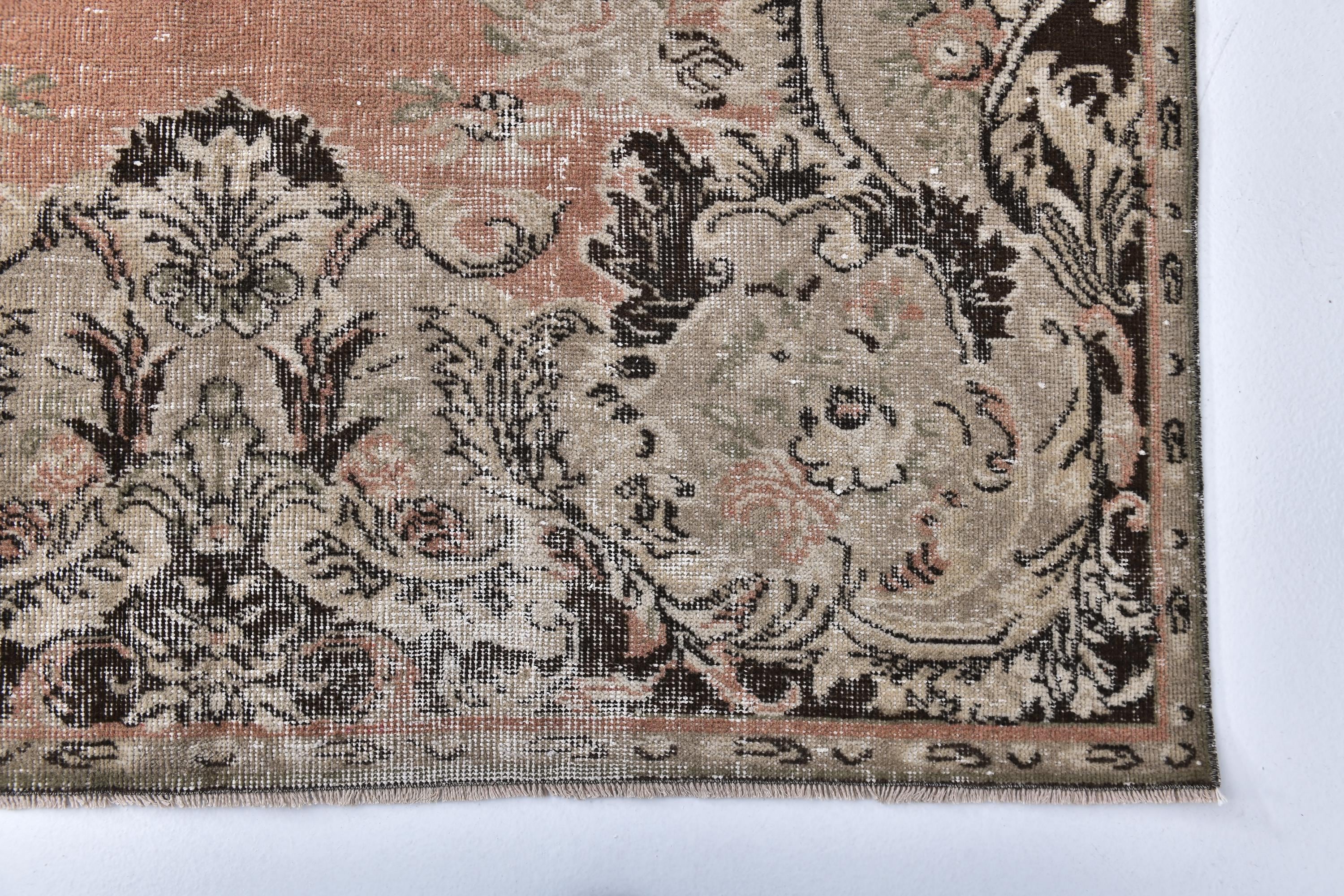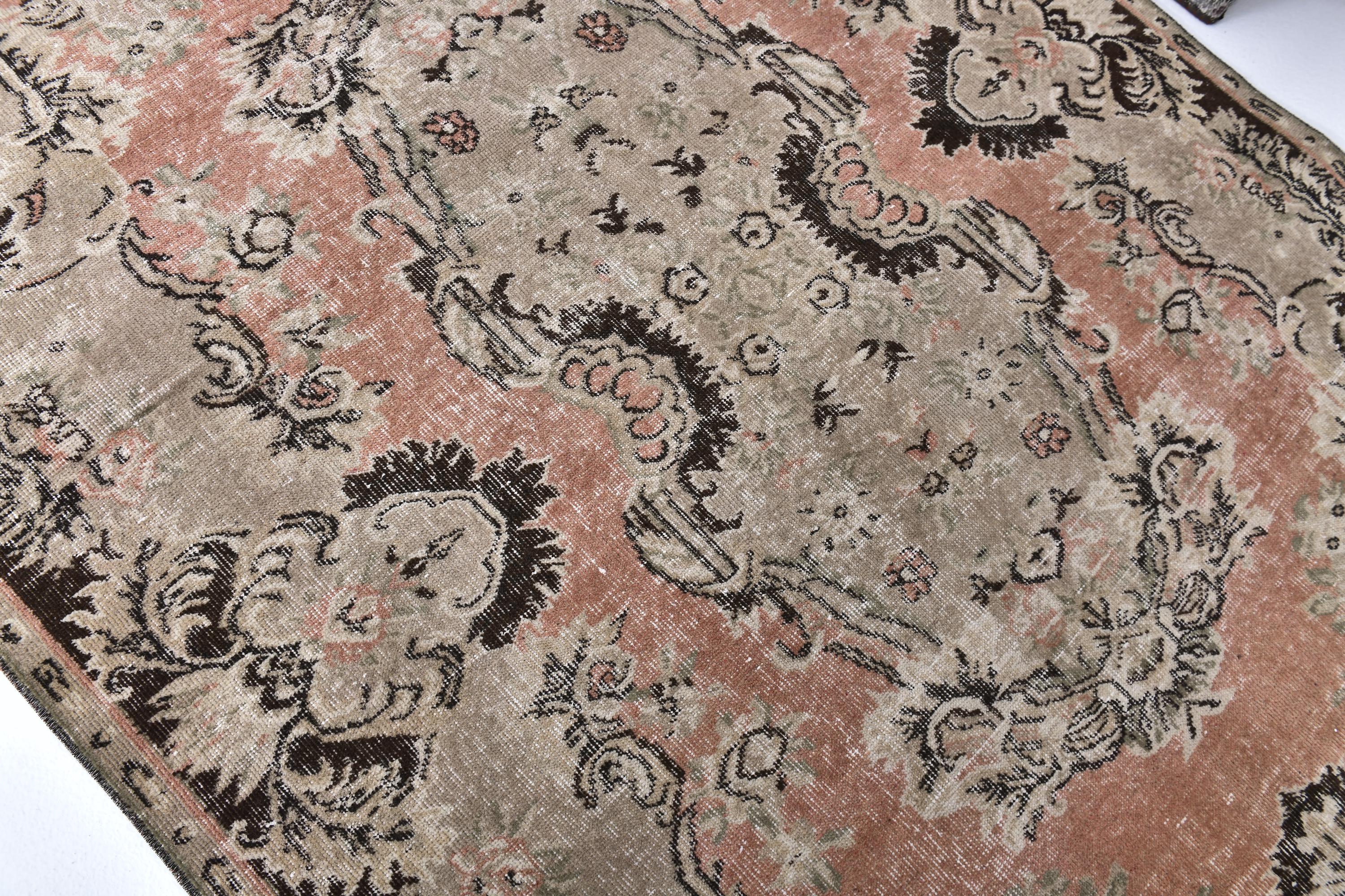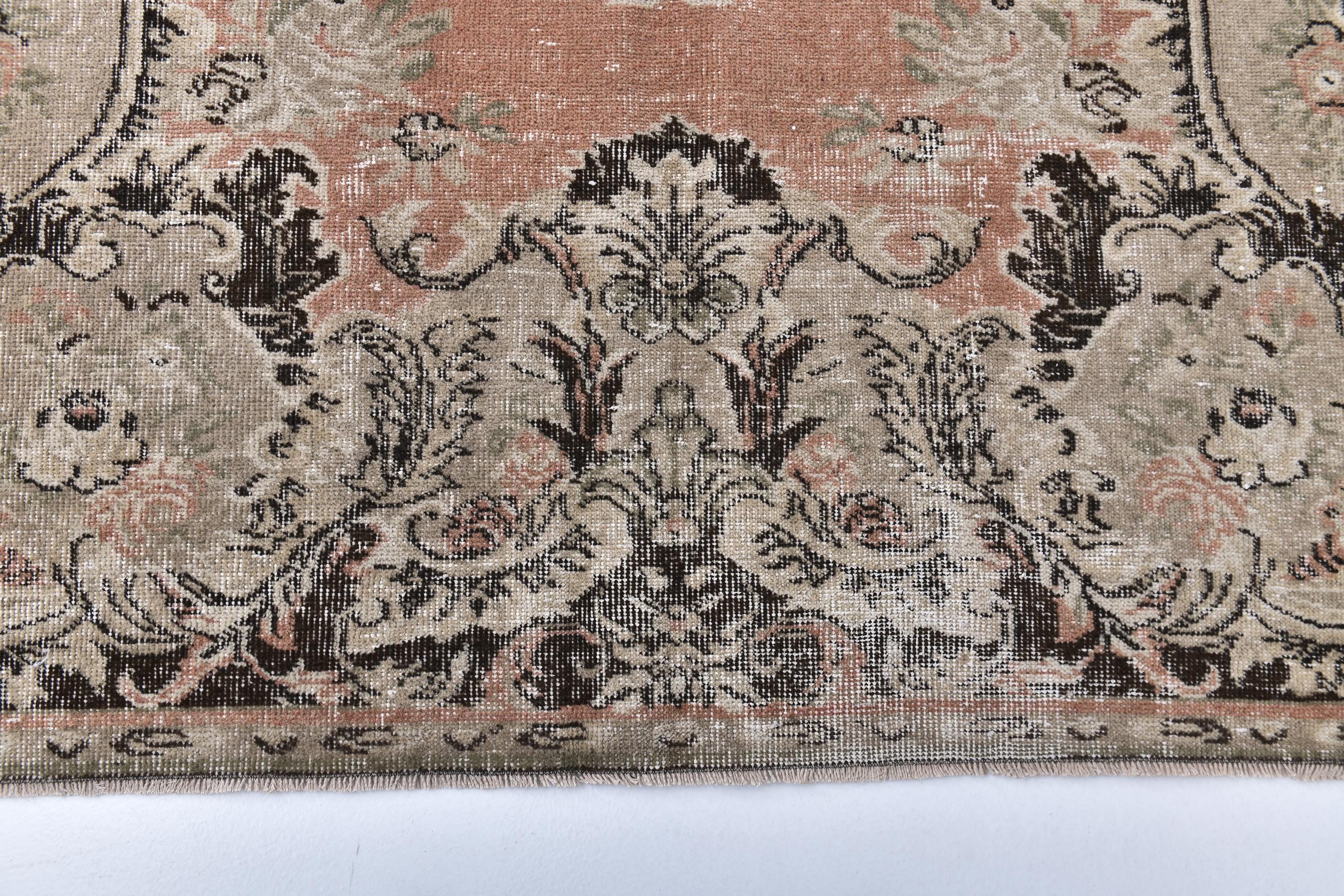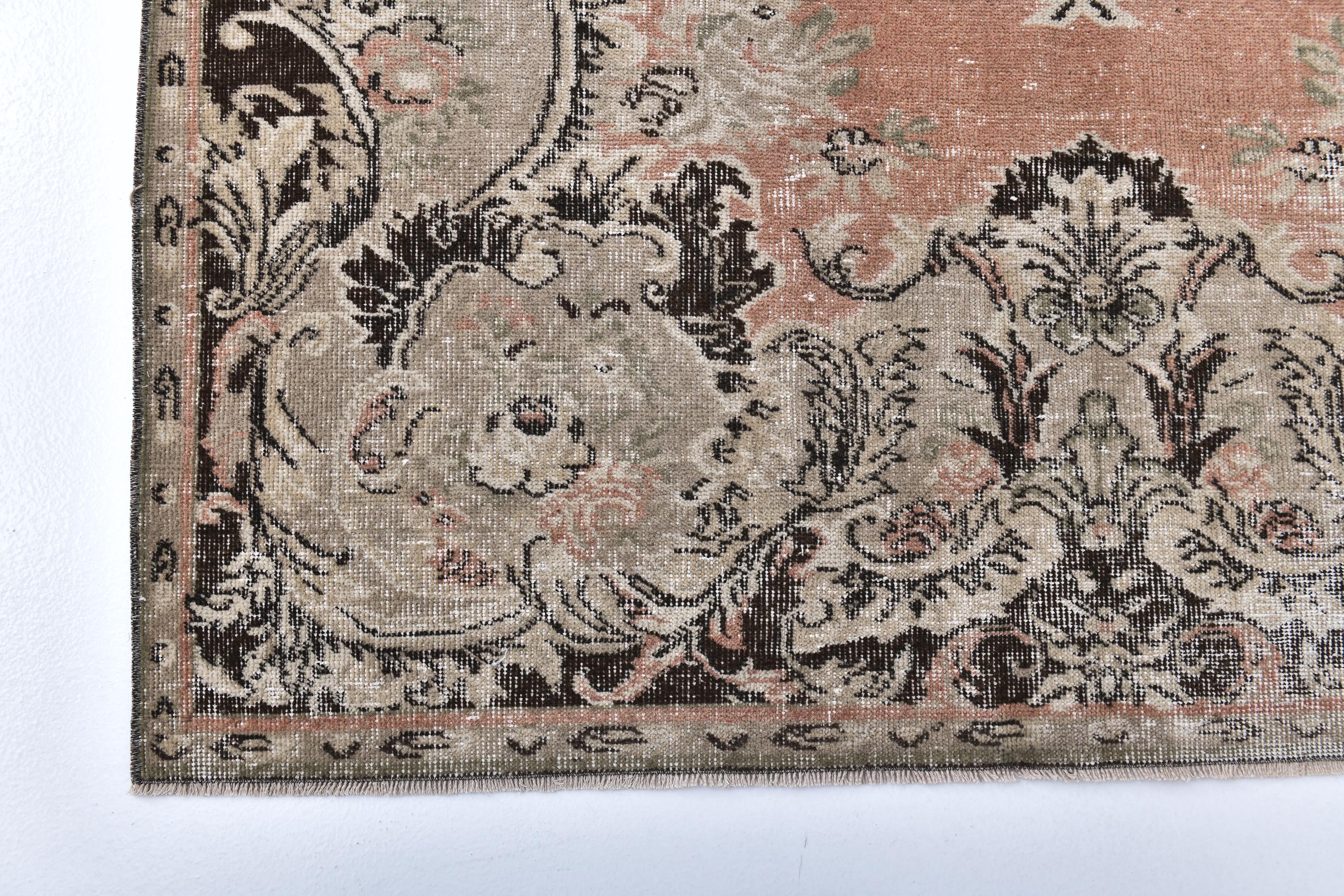 📜📌 Vintage Salmon, Green and Brown Turkish ornate area rug featuring all-over repeating floral motifs with scattered botanical vines, small leafs elements, and decorative borders in warm neutral tones with subtle green accents throughout