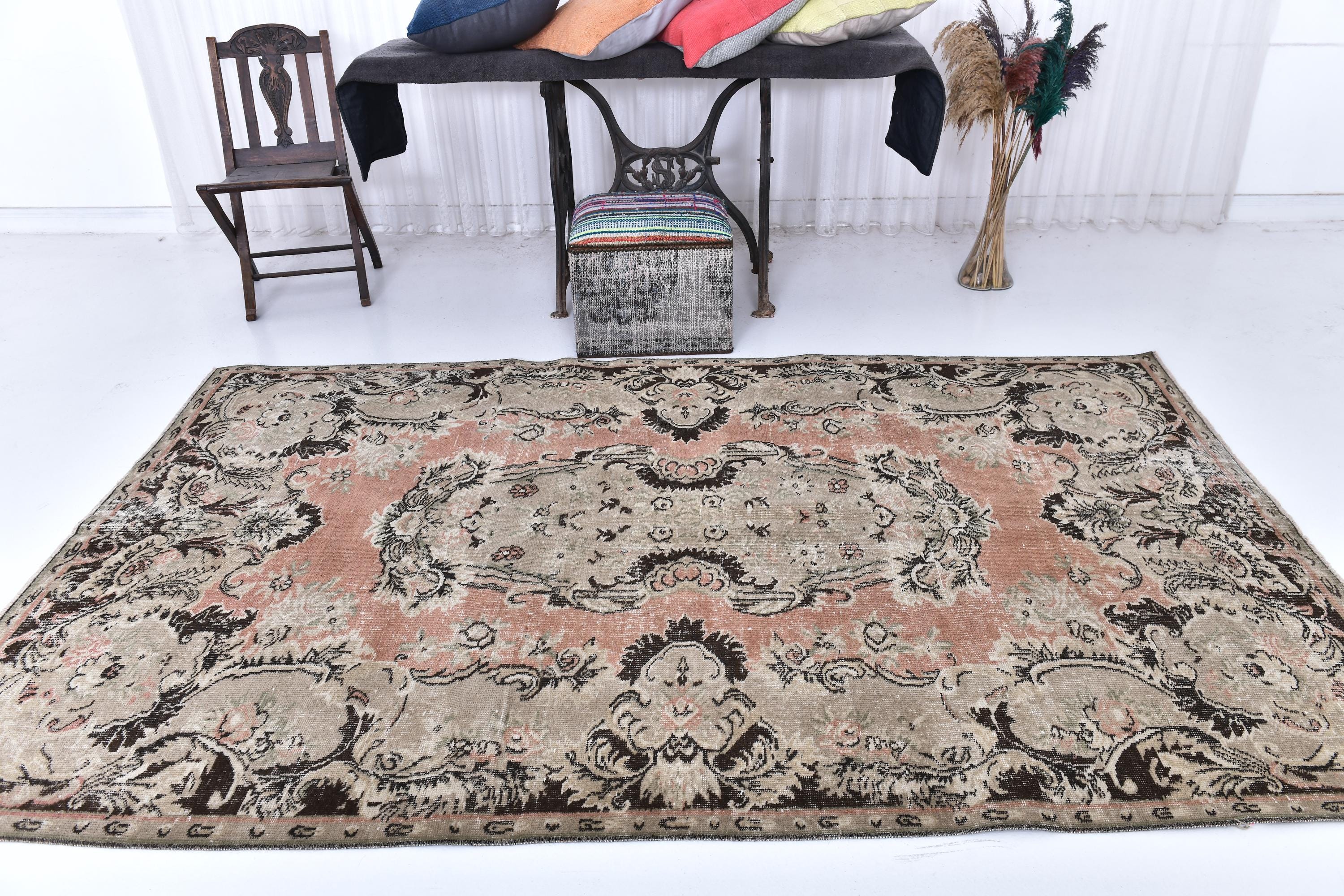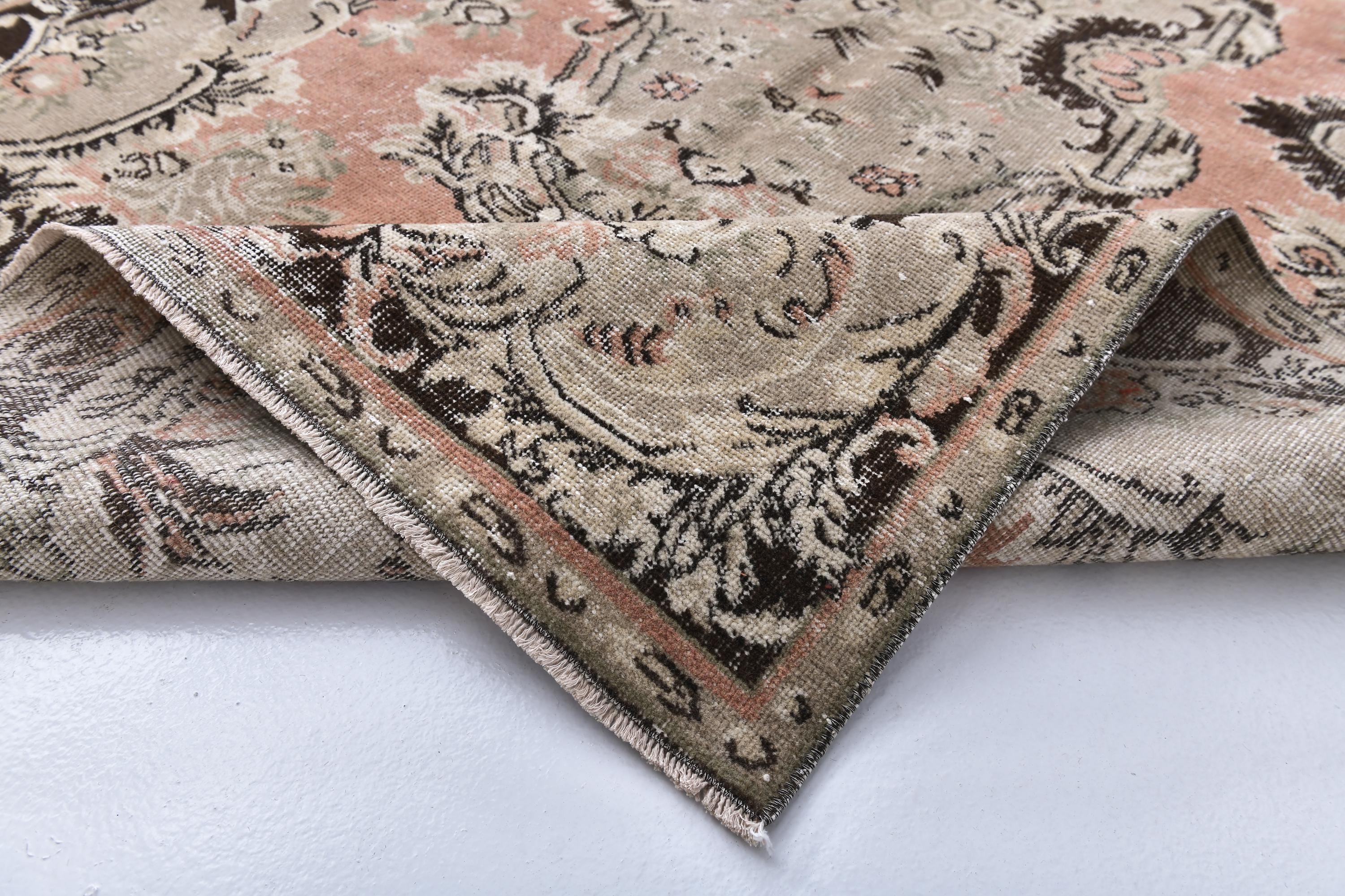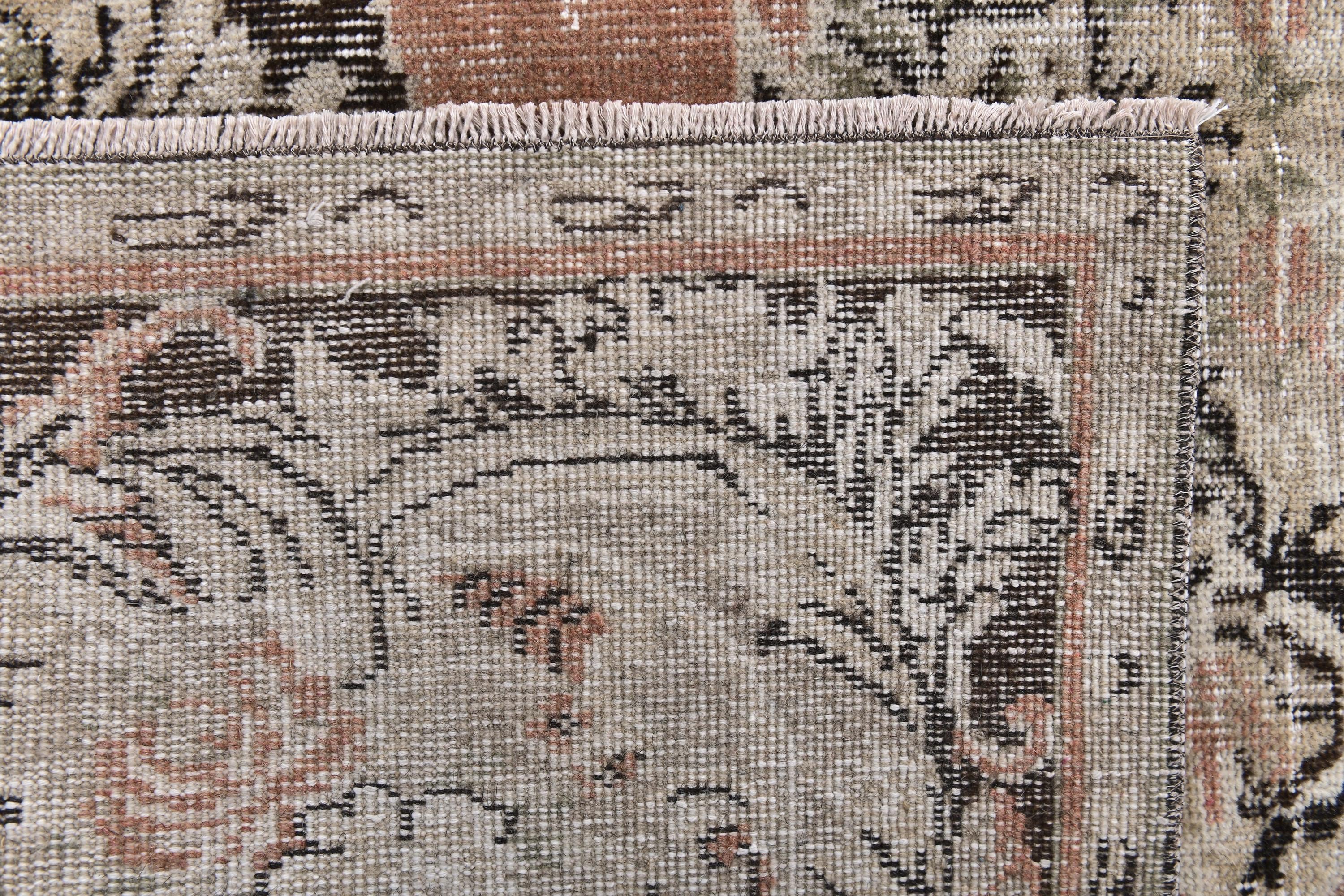 📜📌 Vintage Salmon, Green and Brown Turkish ornate area rug featuring all-over repeating floral motifs with scattered botanical vines, small leafs elements, and decorative borders in warm neutral tones with subtle green accents throughout