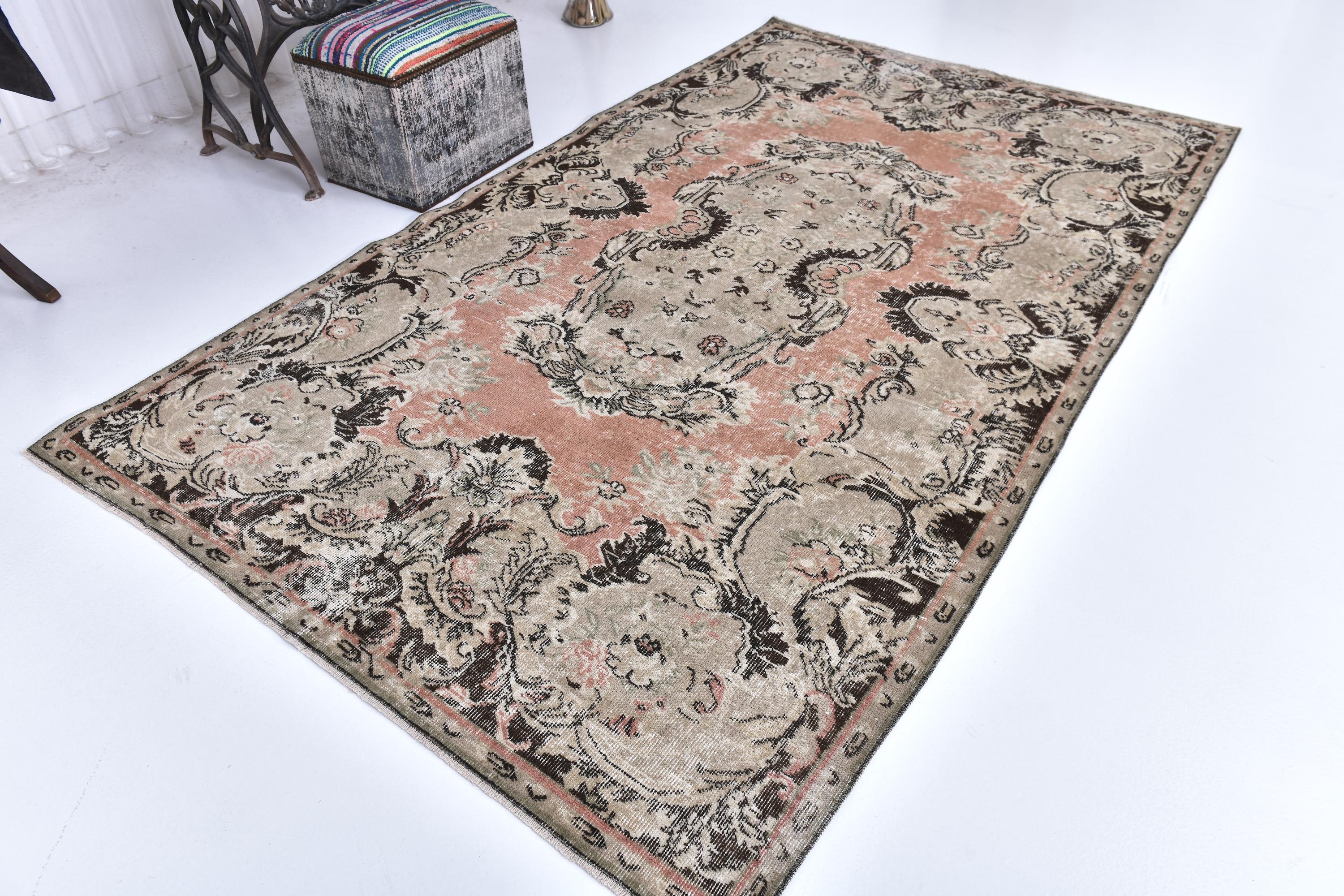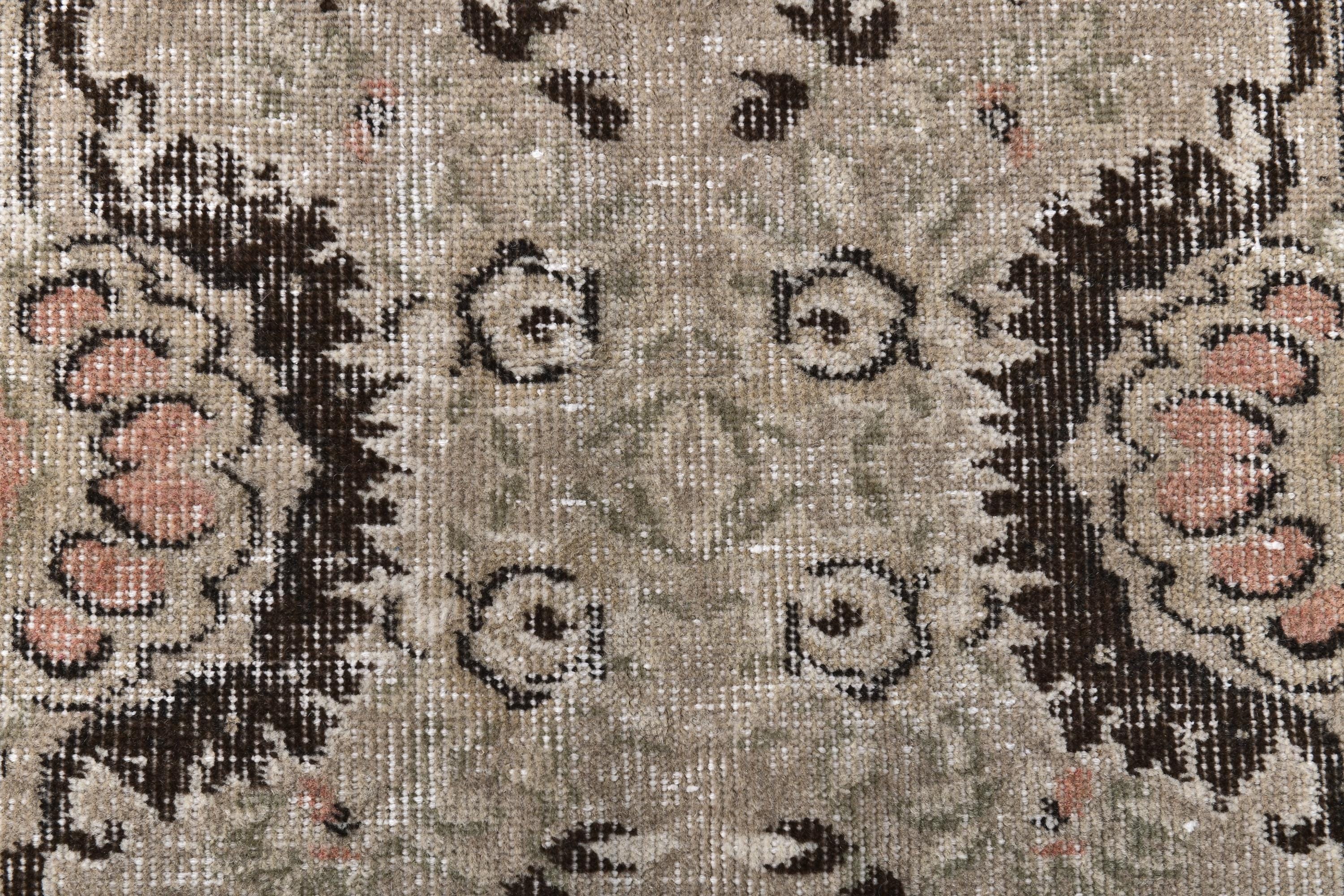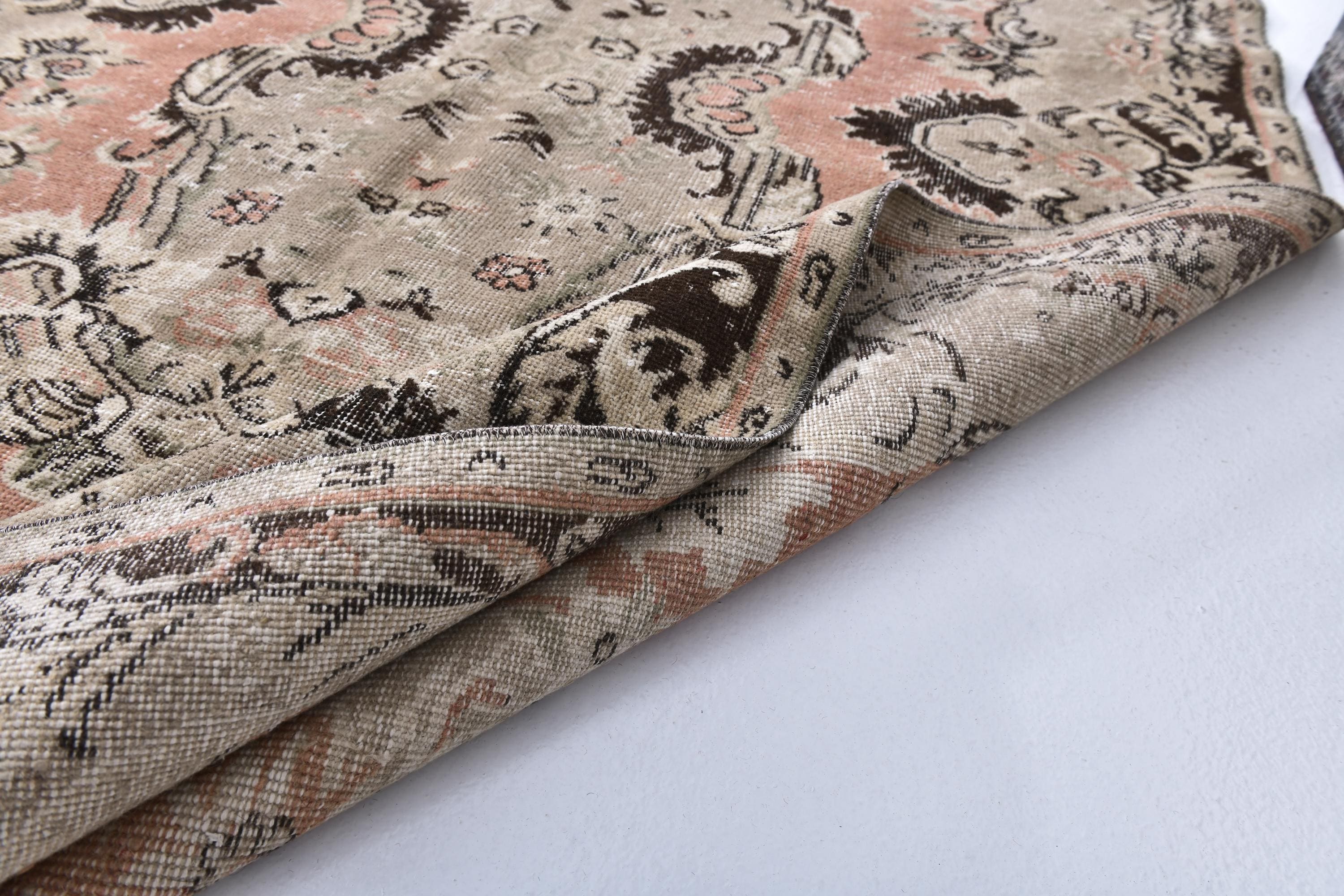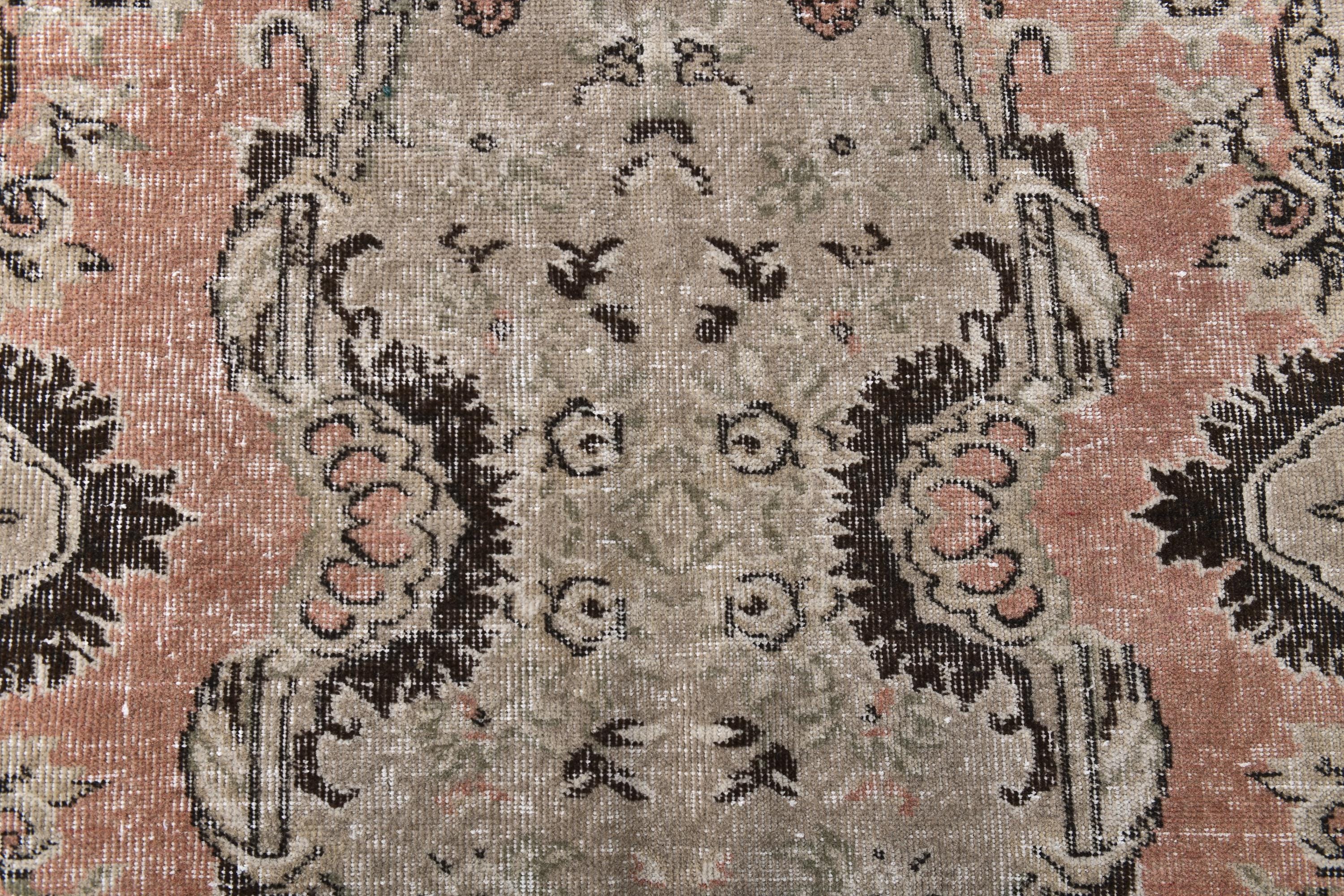 📜📌 Vintage Salmon, Green and Brown Turkish ornate area rug featuring all-over repeating floral motifs with scattered botanical vines, small leafs elements, and decorative borders in warm neutral tones with subtle green accents throughout