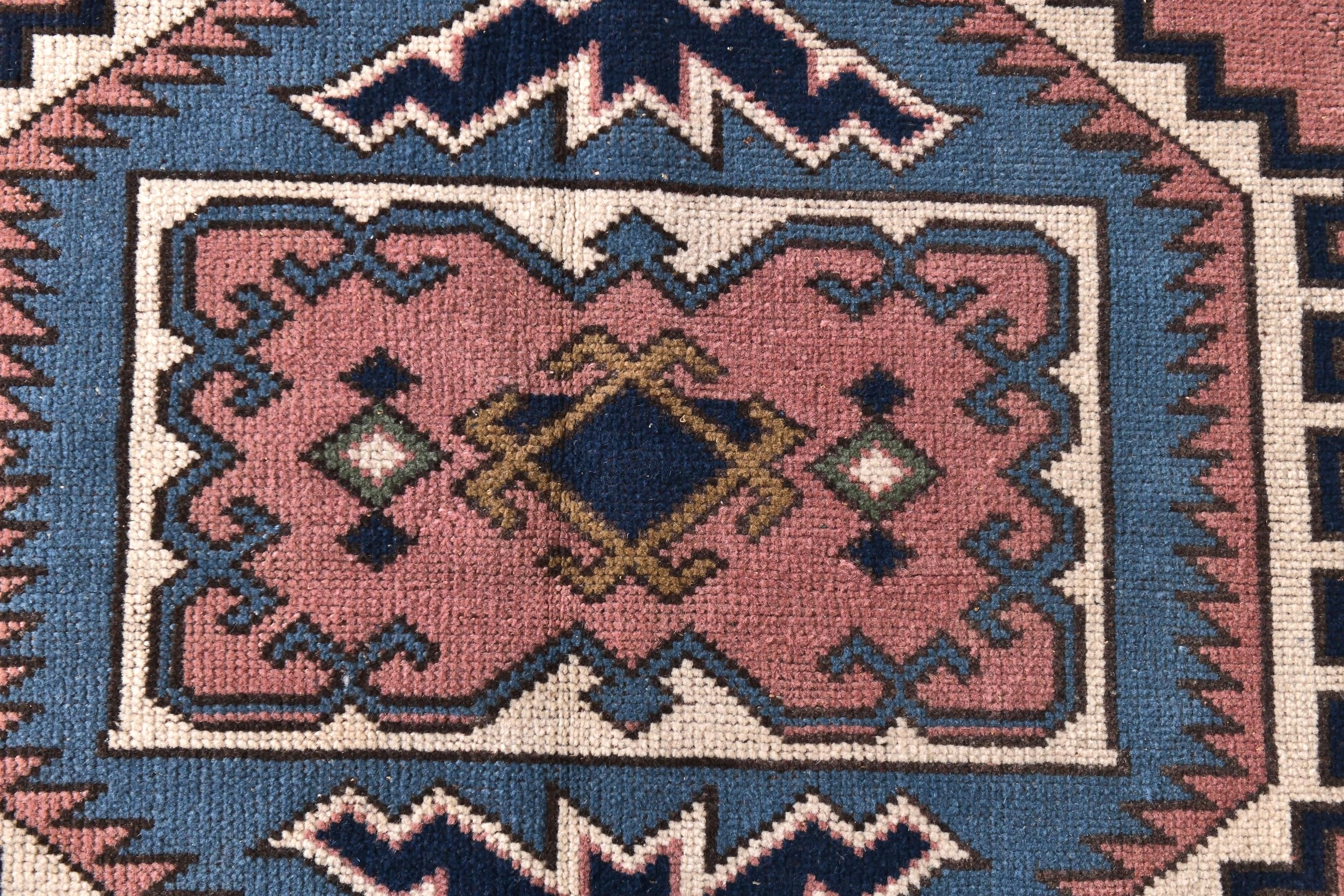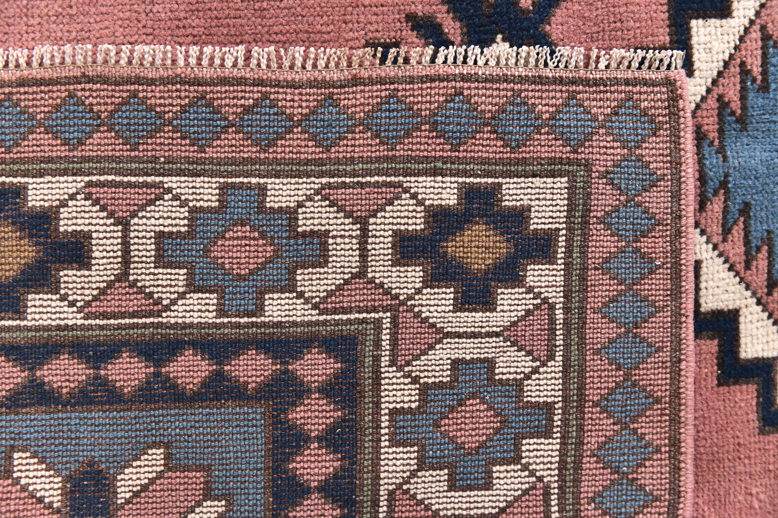 📜📌 Vintage Turkish Khotan area rug featuring five repeating geometric medallions in warm Purple, Blue, and White tones. The hand-knotted wool carpet displays traditional Anatolian tribal motifs with stylized angular designs throughout the field. Multiple decorative borders frame the composition with geometric arrow and tree-of-life patterns. The low-pile weave shows beautiful natural fading and vintage patina, perfect for bohemian and southwestern interiors.