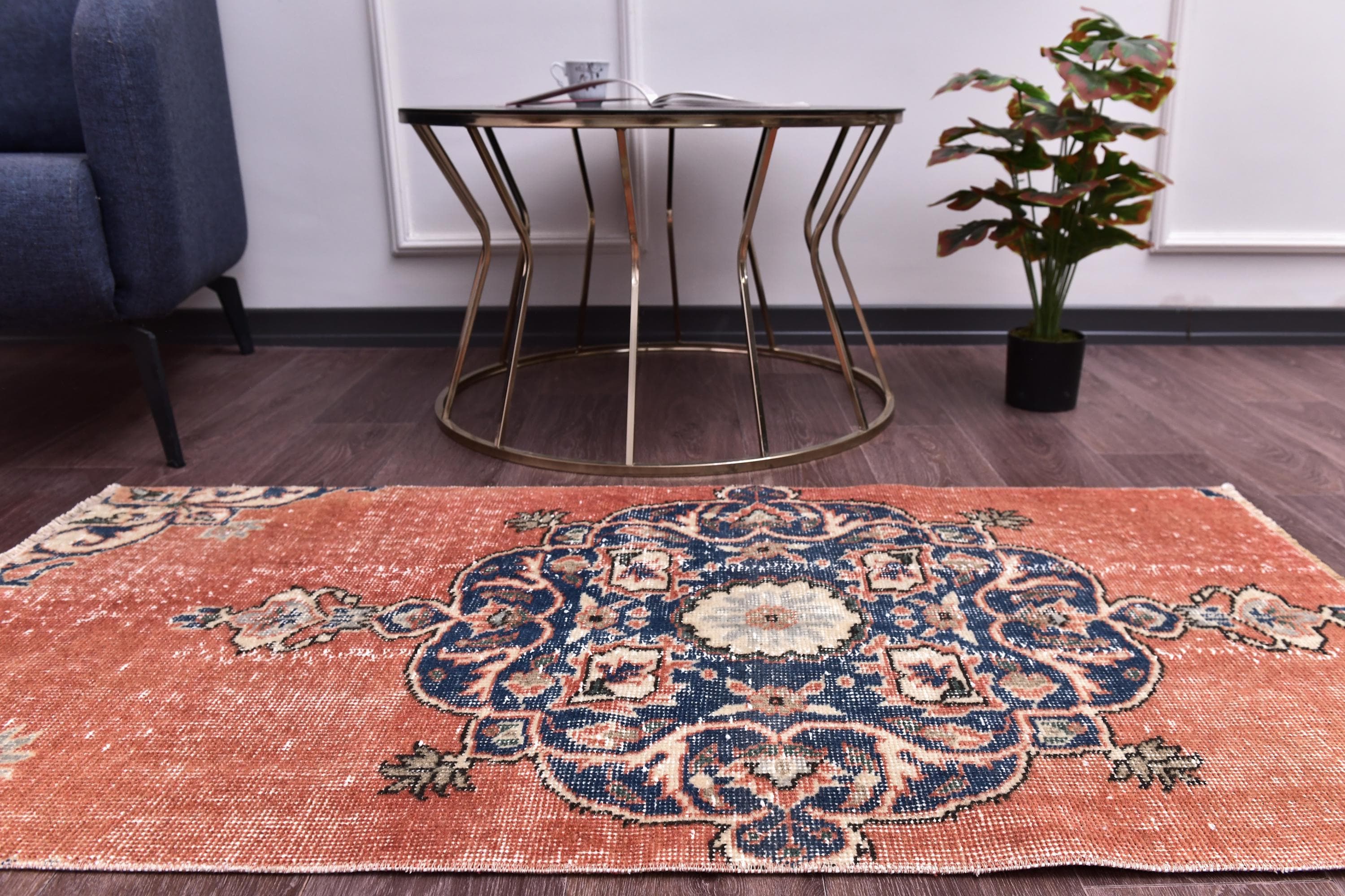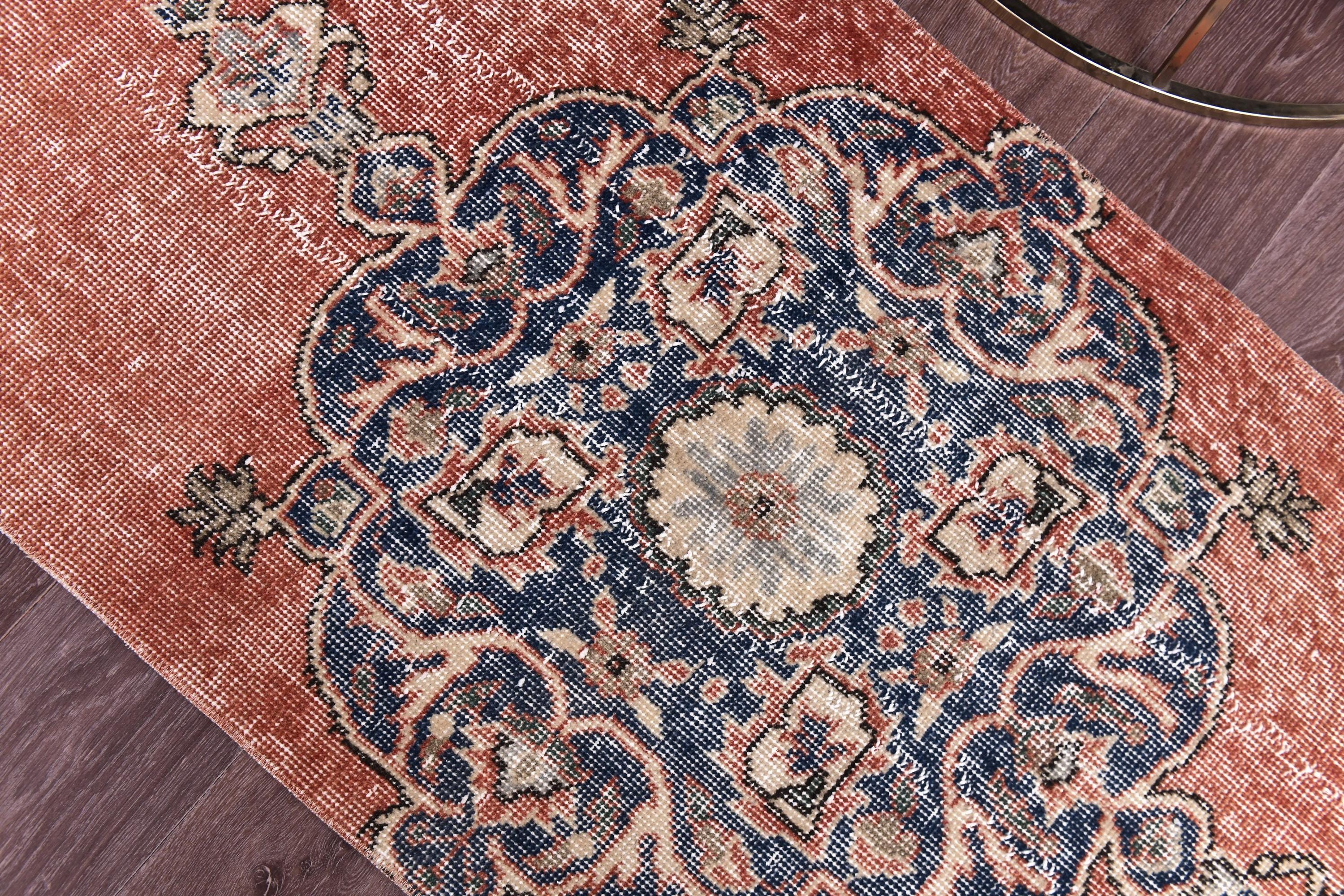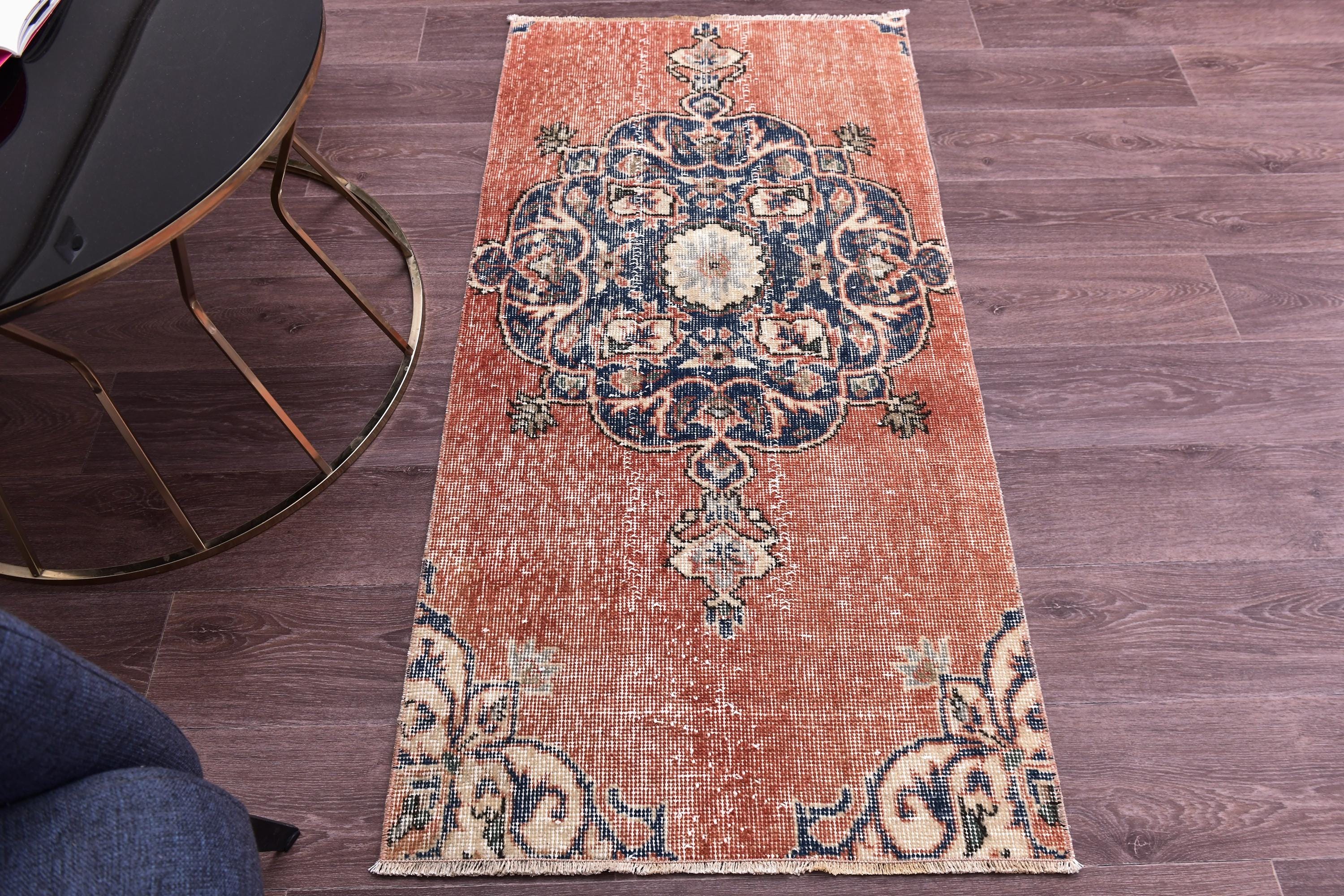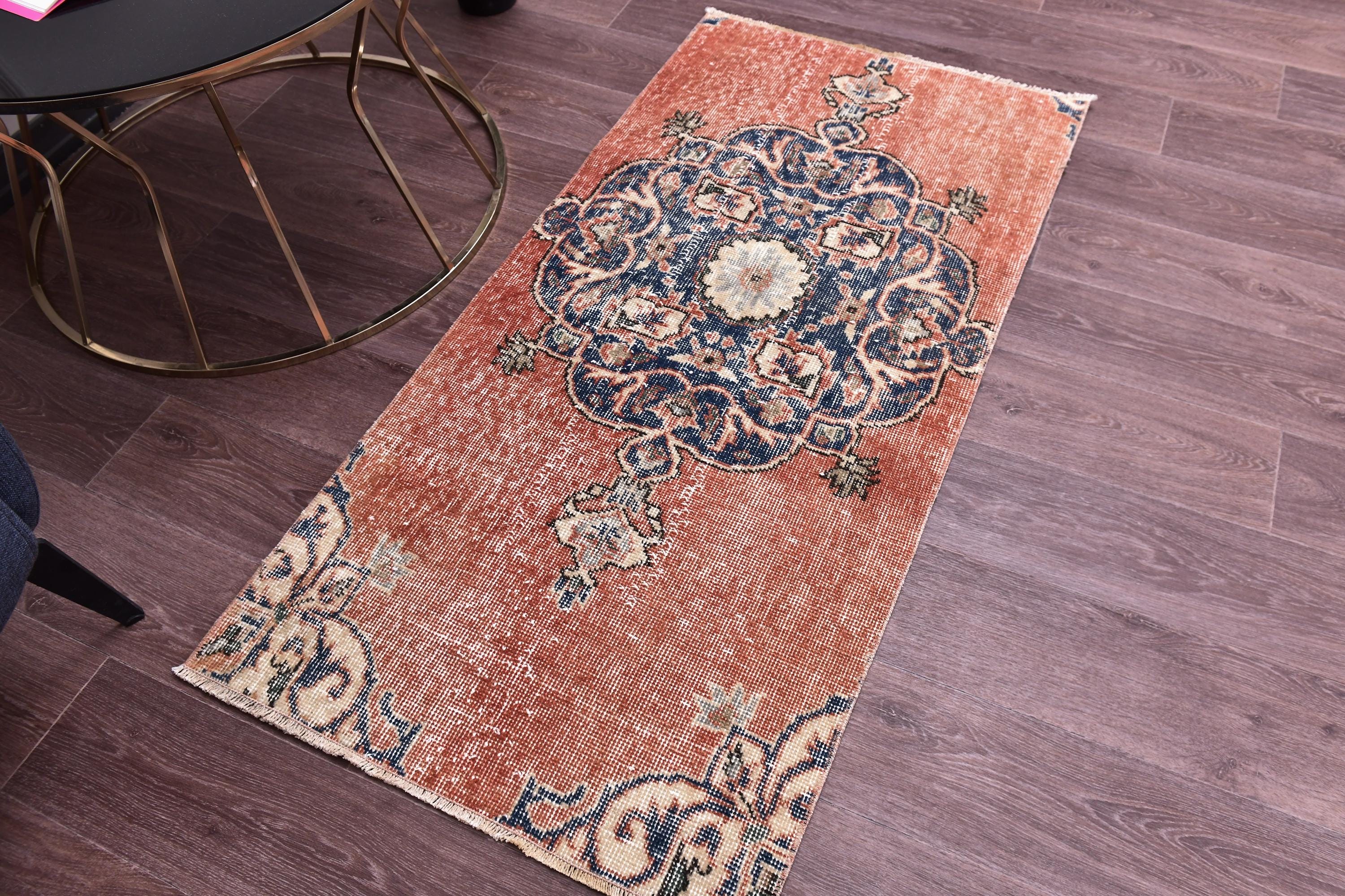 📜📌 Vintage Turkish accent rug displaying intricate navy blue floral medallion on rust orange field with weathered distressed texture. Hand-knotted wool narrow carpet with traditional corner motifs and decorative scrollwork borders in cream, beige and blue tones on dark hardwood flooring.