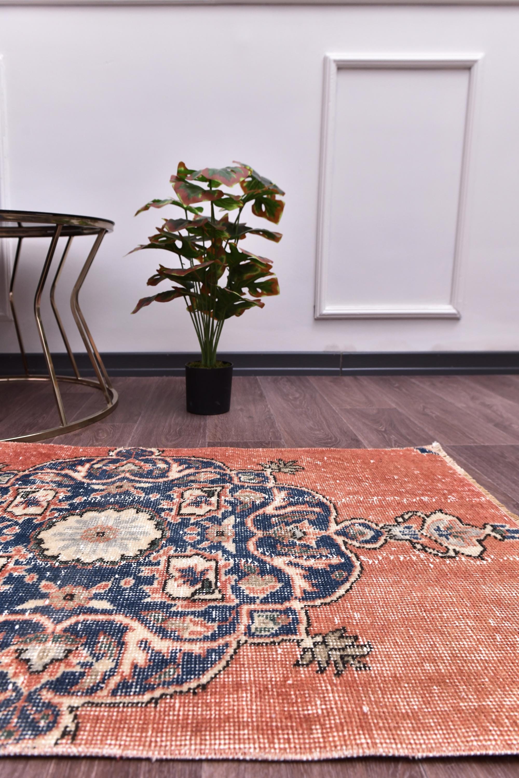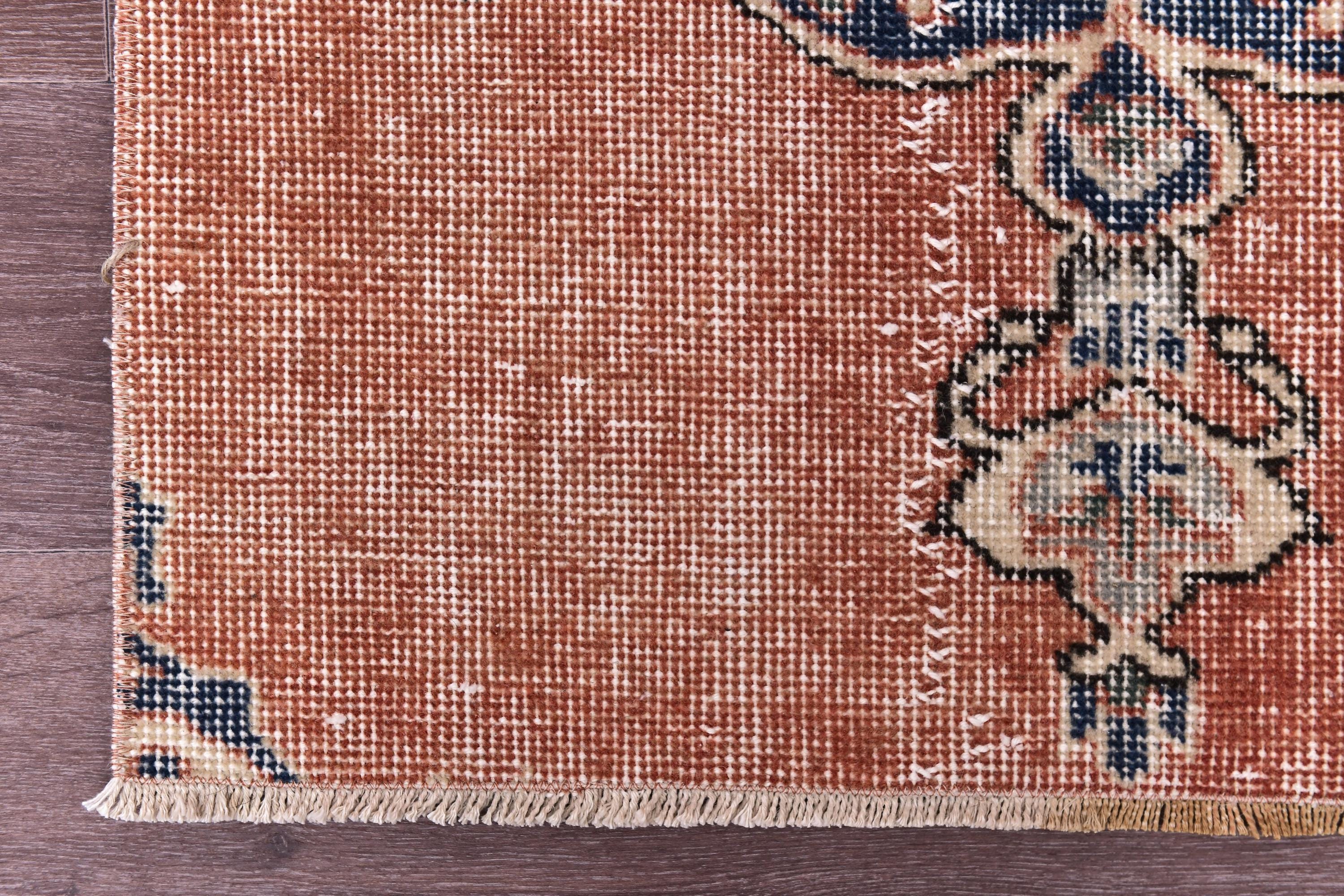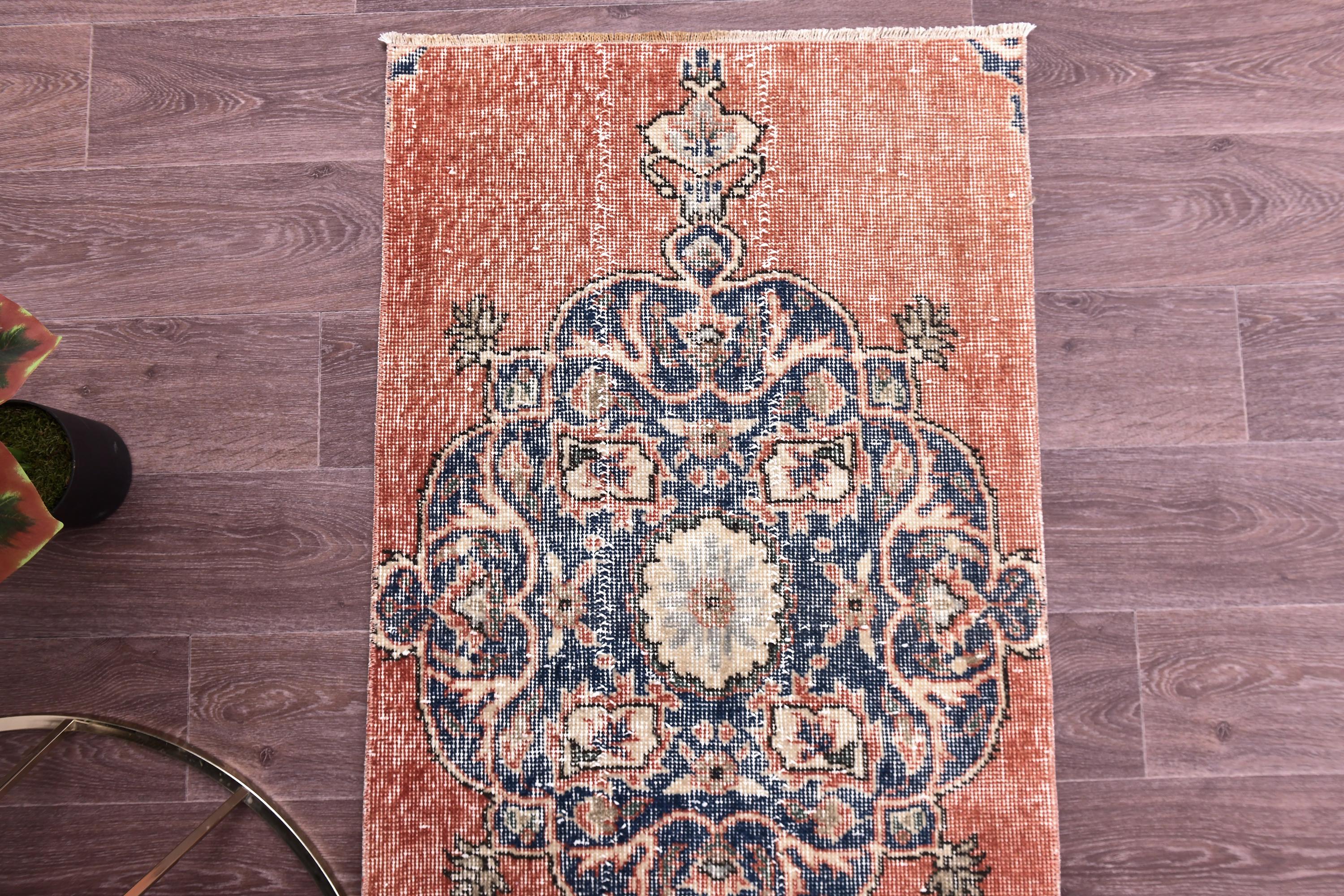 📜📌 Vintage Turkish accent rug displaying intricate navy blue floral medallion on rust orange field with weathered distressed texture. Hand-knotted wool narrow carpet with traditional corner motifs and decorative scrollwork borders in cream, beige and blue tones on dark hardwood flooring.