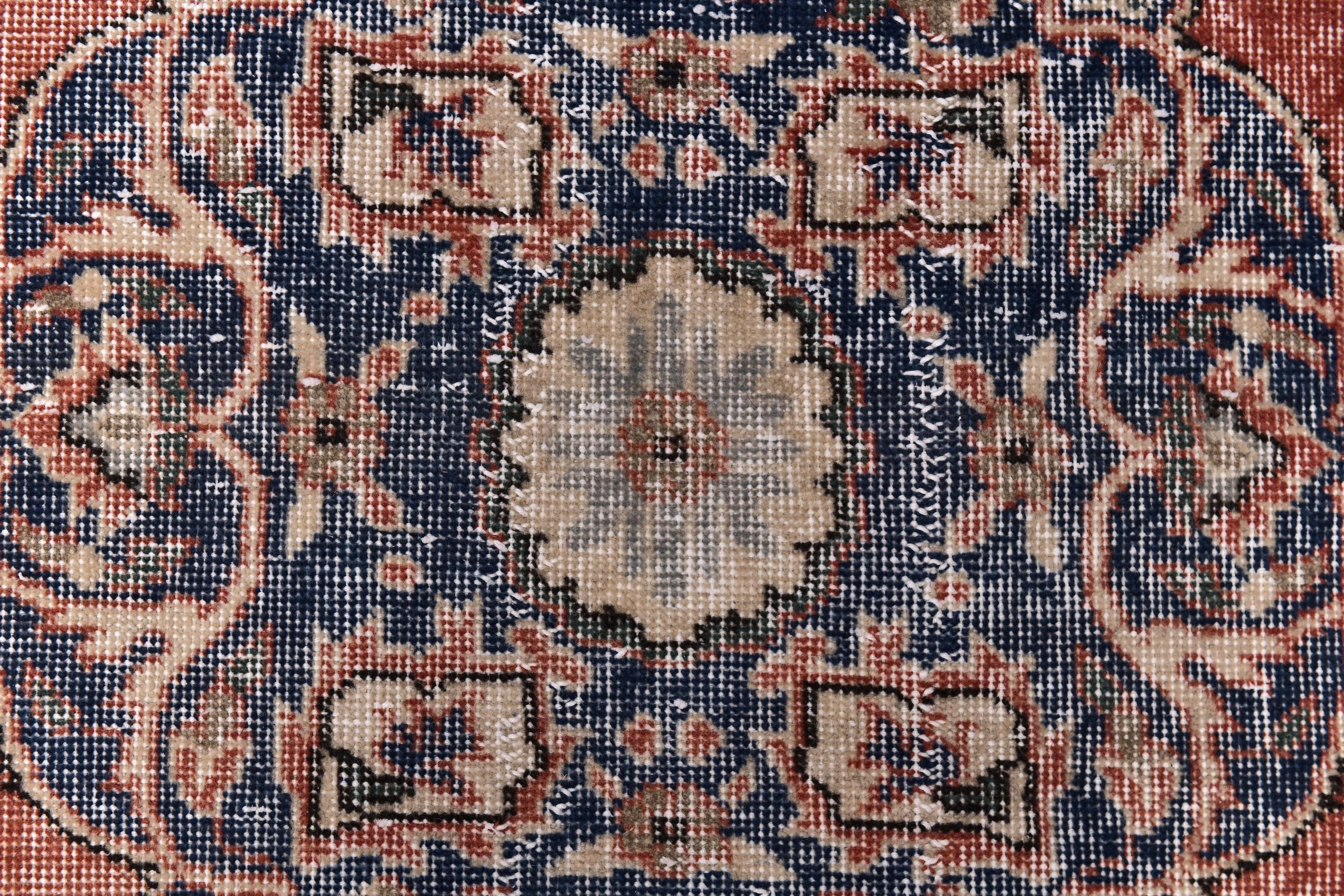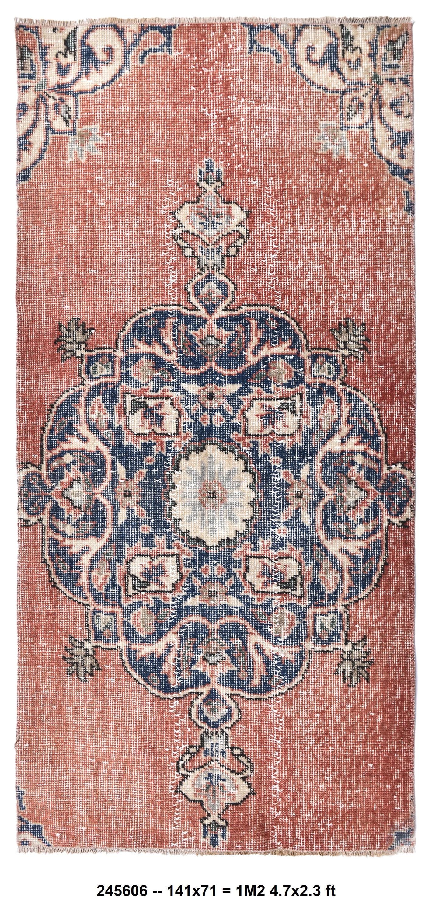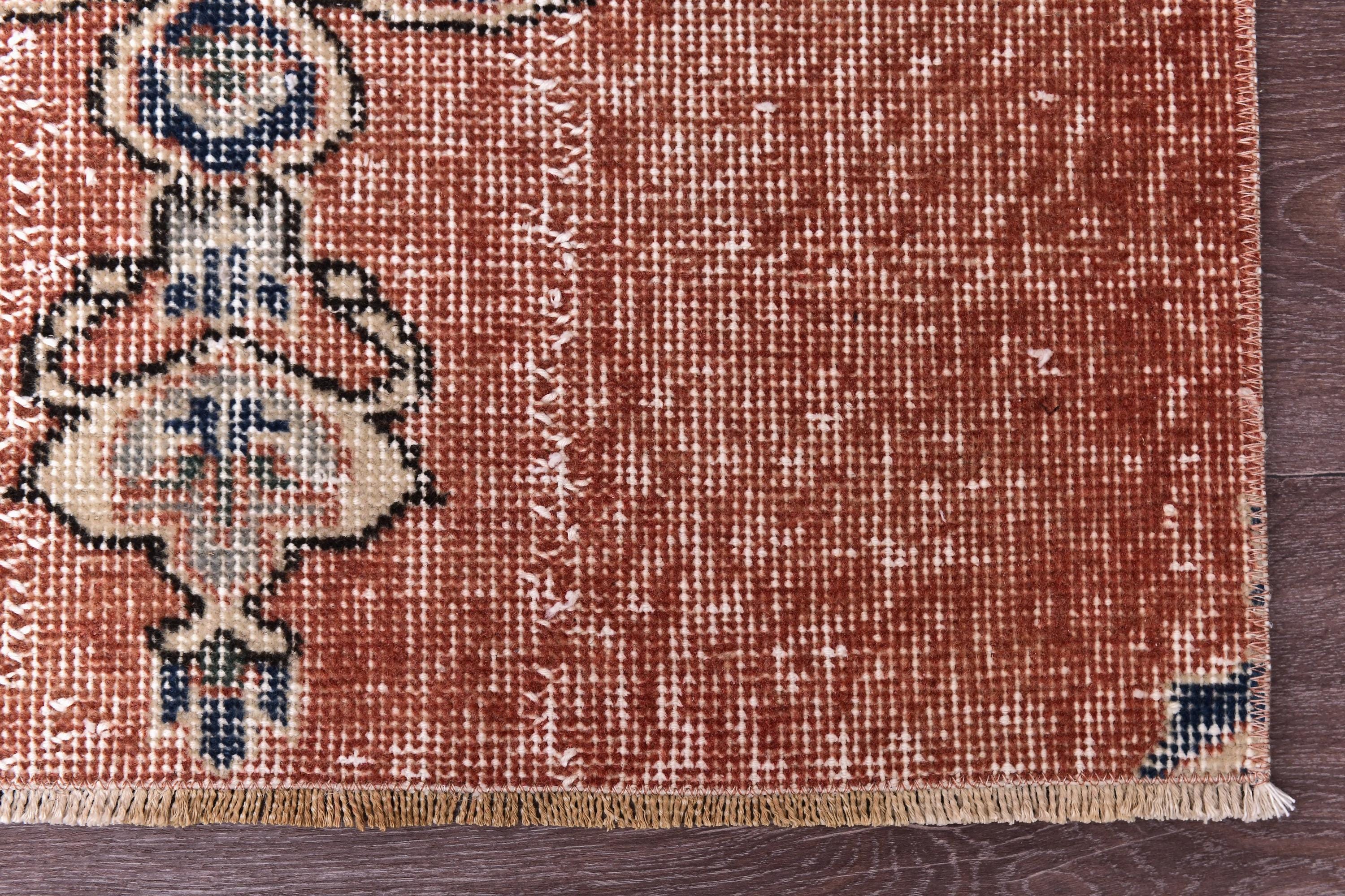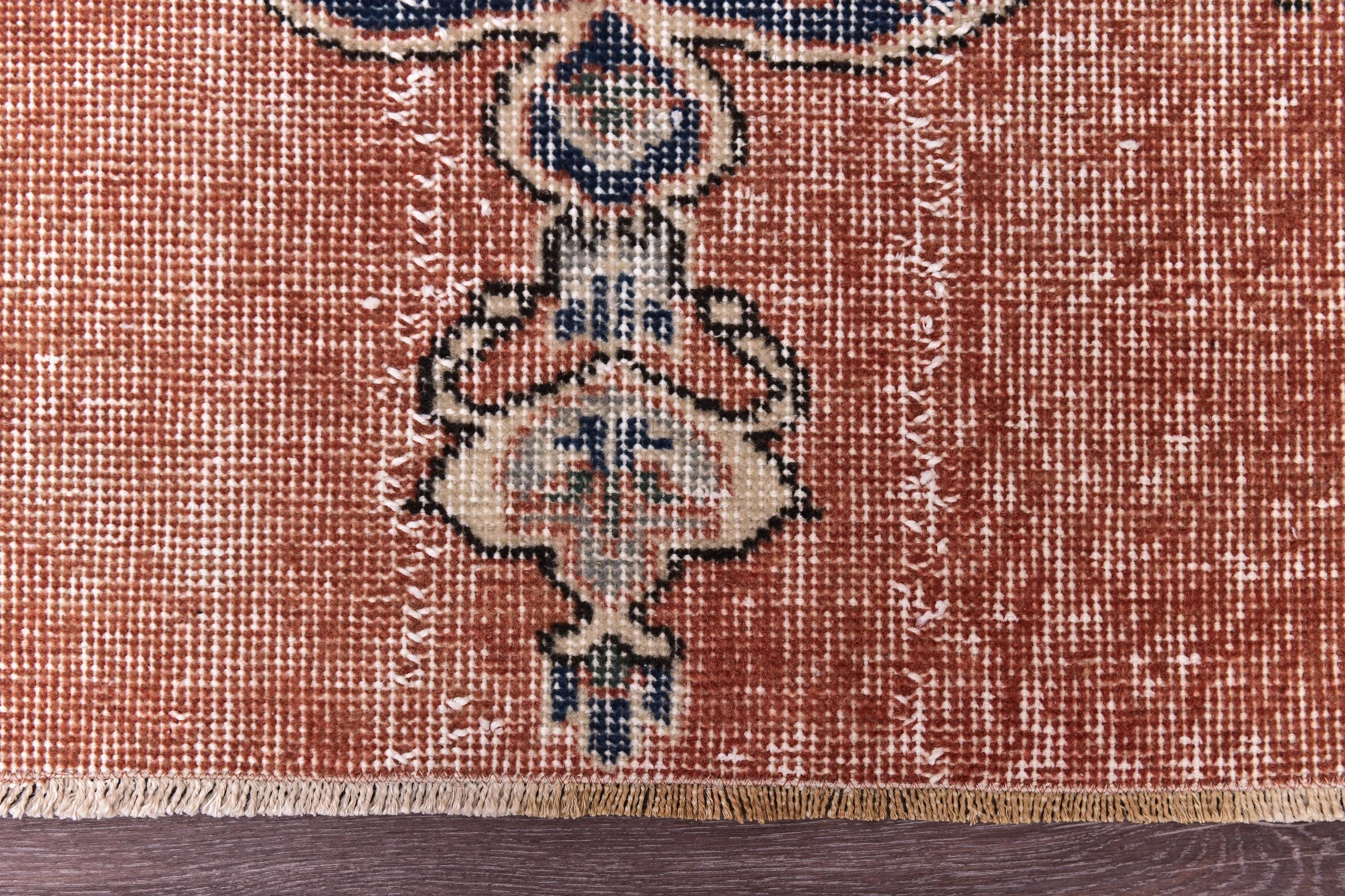 📜📌 Vintage Turkish accent rug displaying intricate navy blue floral medallion on rust orange field with weathered distressed texture. Hand-knotted wool narrow carpet with traditional corner motifs and decorative scrollwork borders in cream, beige and blue tones on dark hardwood flooring.