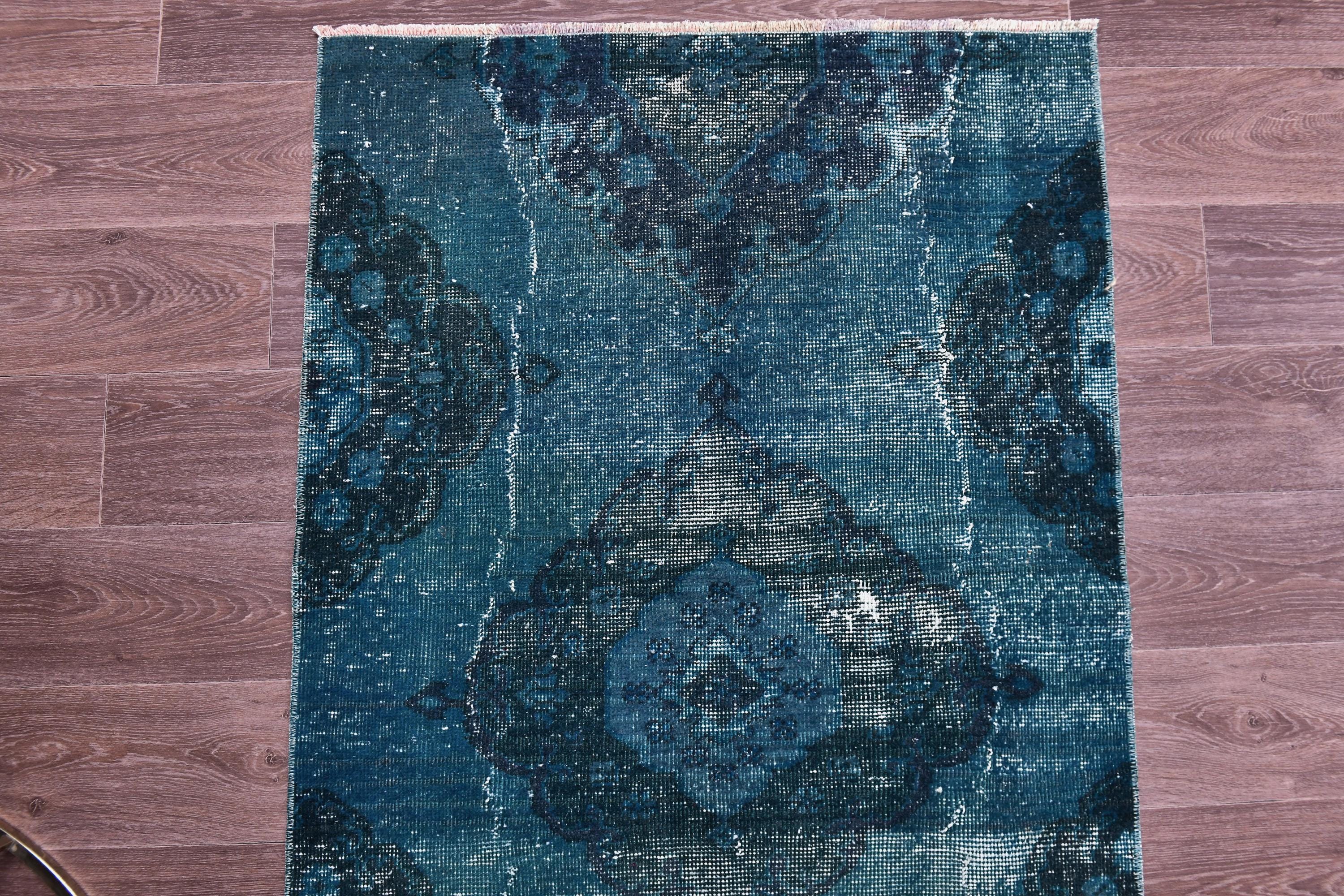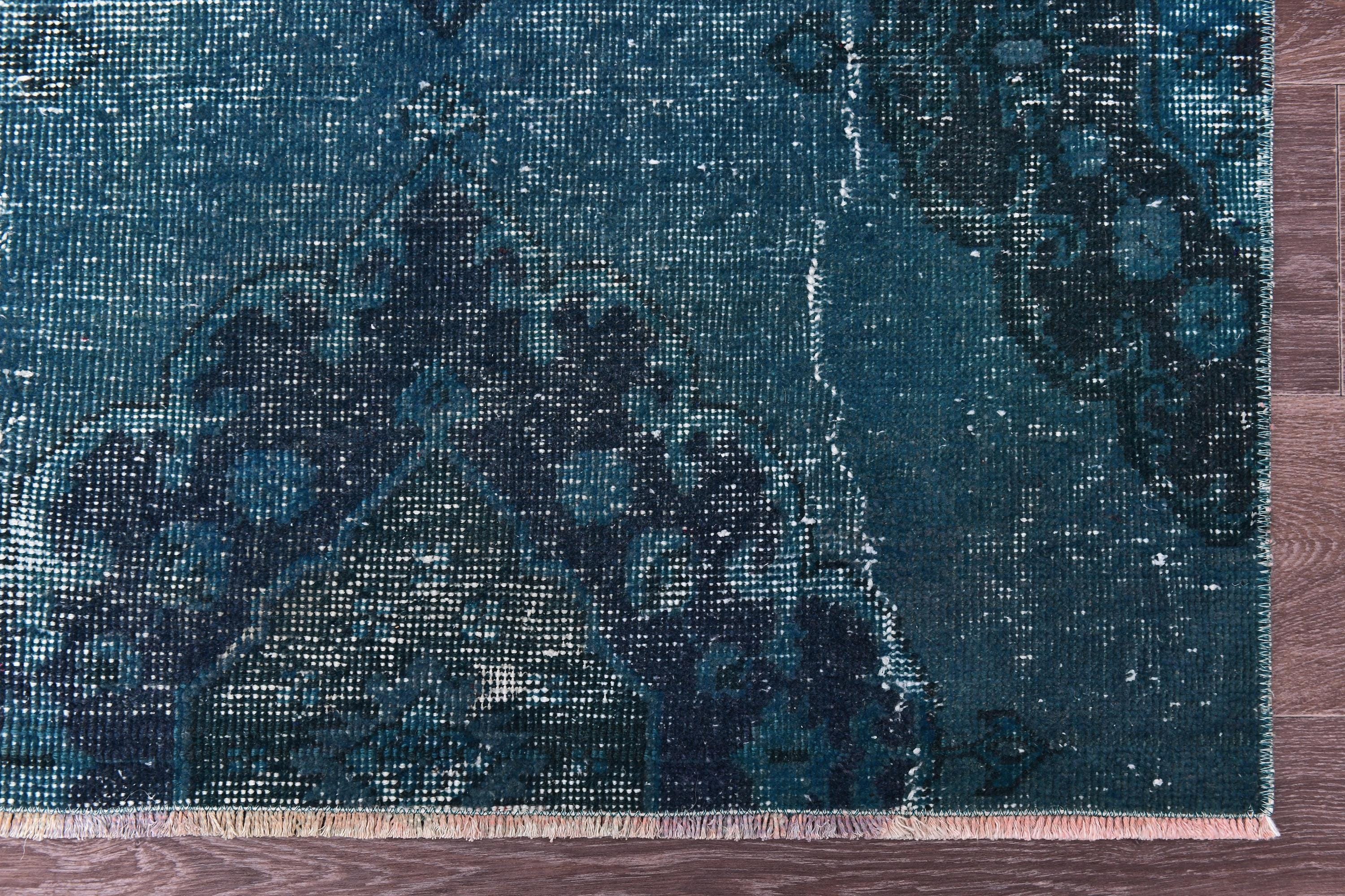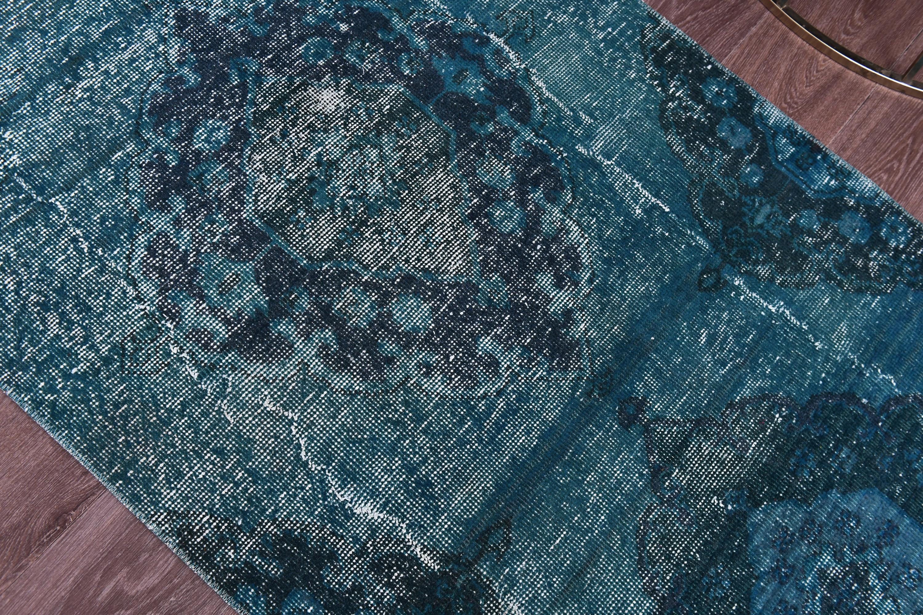 📜📌 Long vintage Turkish runner rug overdyed in rich teal turquoise blue with distressed weathered texture and faded underlying patterns. Hand-knotted narrow hallway carpet with ocean-inspired jewel tone color and minimalist aesthetic, perfect for modern bohemian kitchen, entryway or corridor spaces.