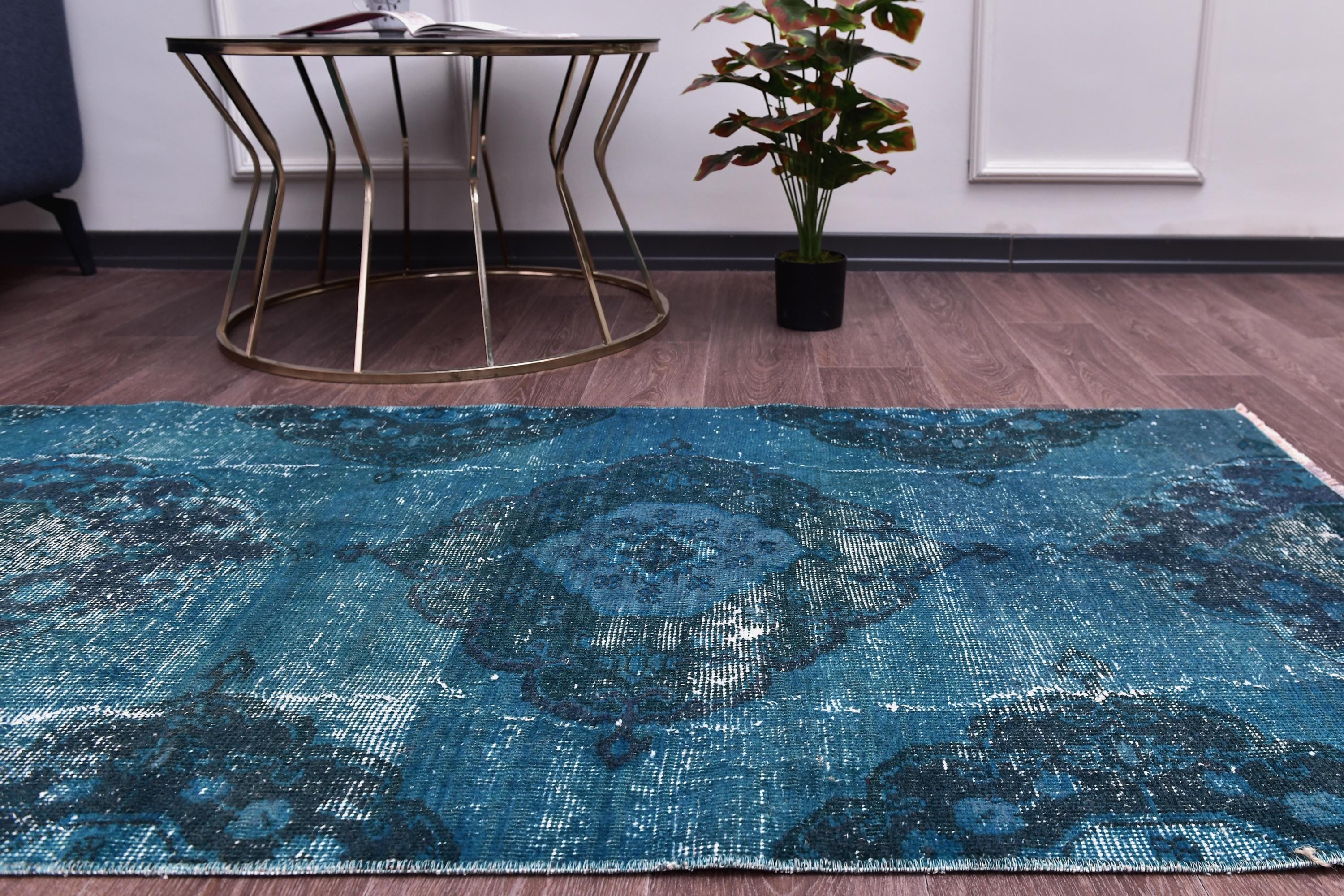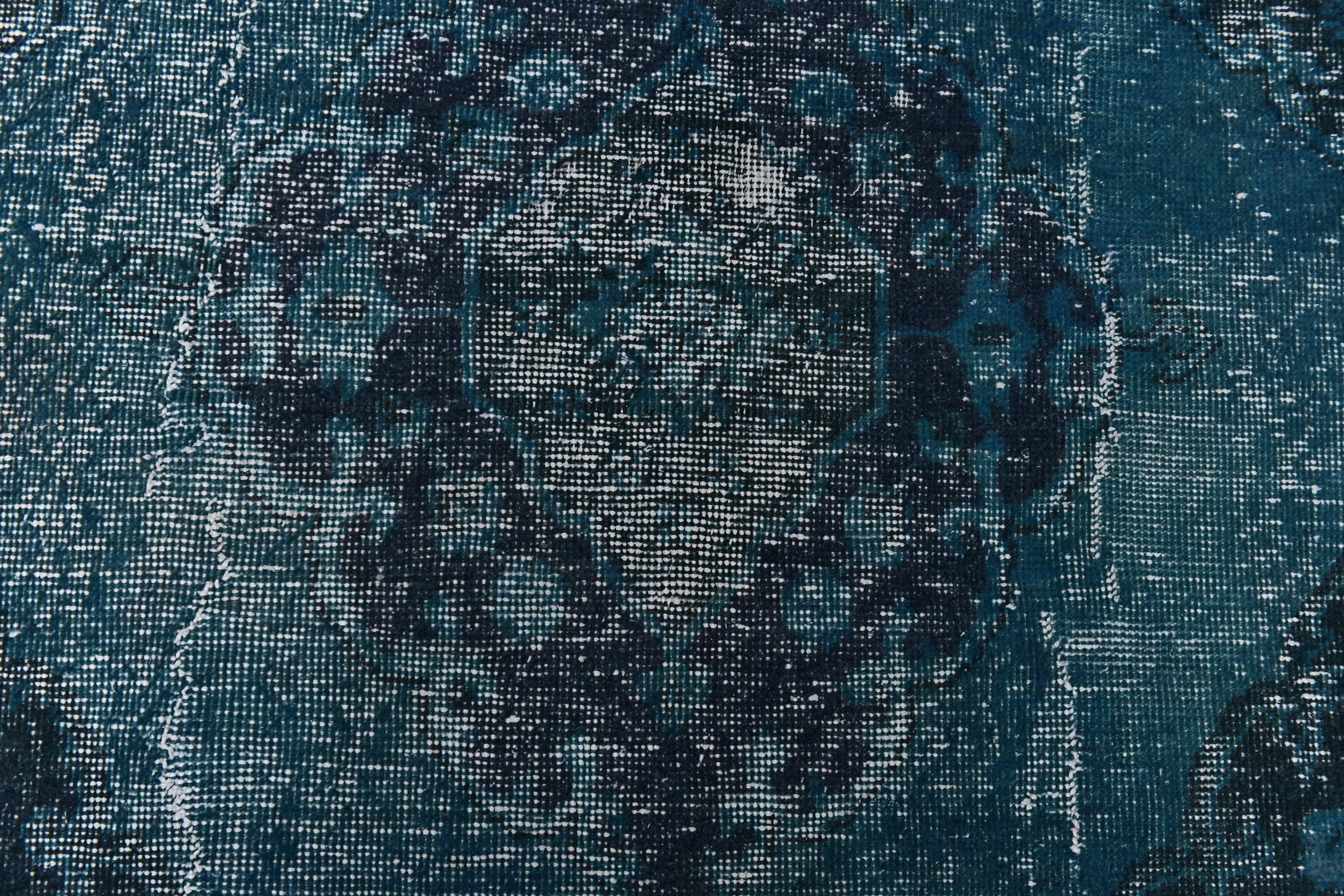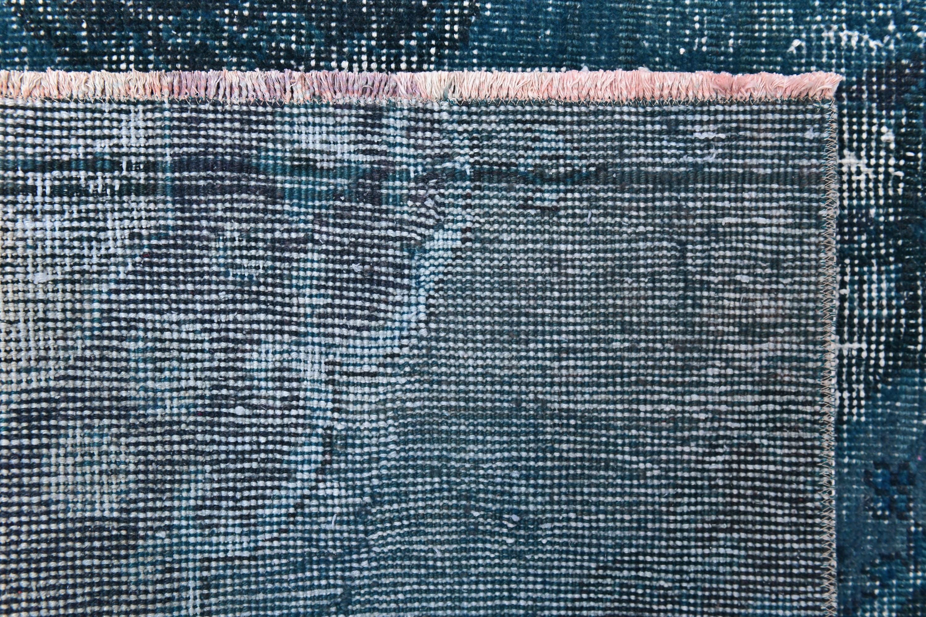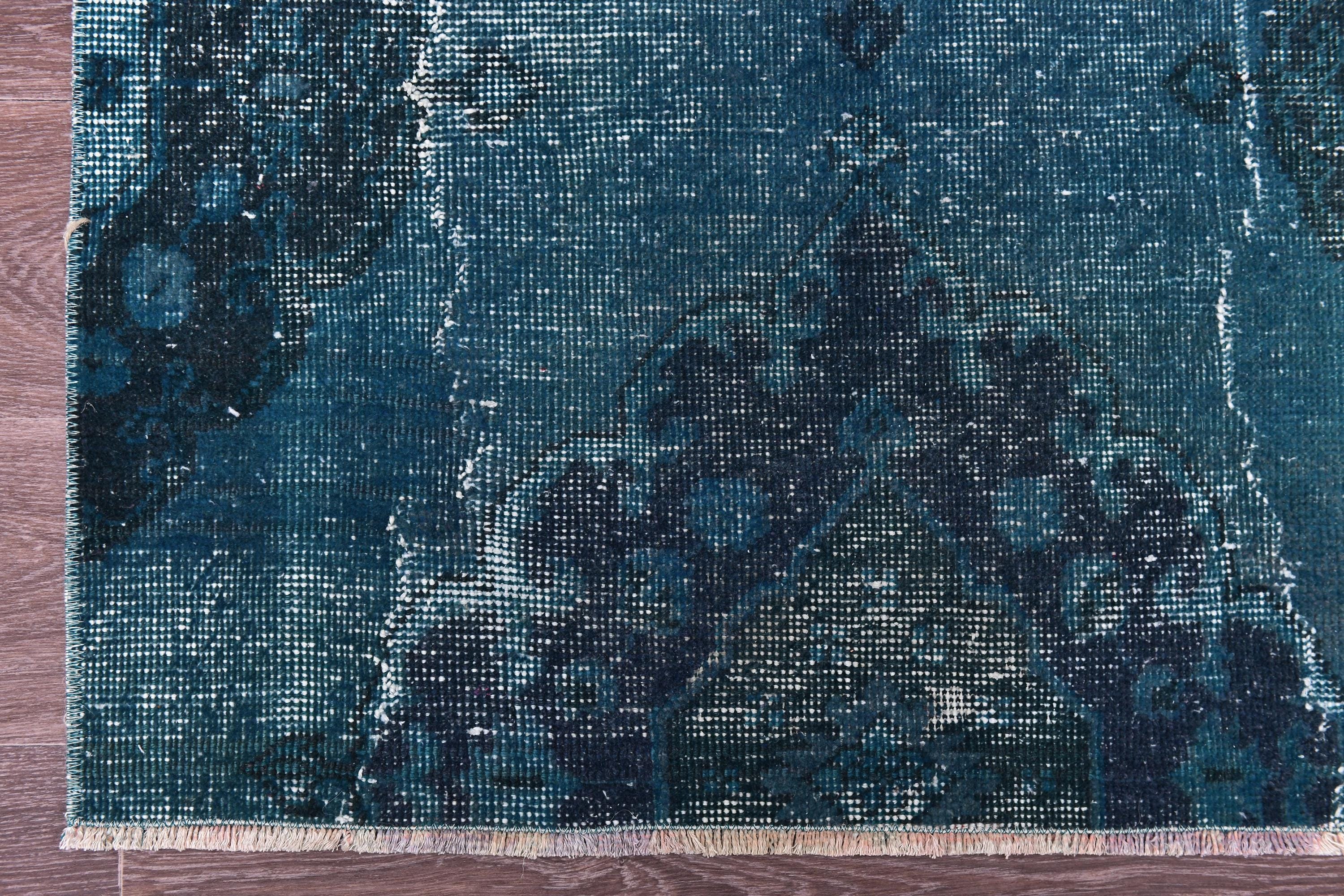📜📌 Long vintage Turkish runner rug overdyed in rich teal turquoise blue with distressed weathered texture and faded underlying patterns. Hand-knotted narrow hallway carpet with ocean-inspired jewel tone color and minimalist aesthetic, perfect for modern bohemian kitchen, entryway or corridor spaces.
