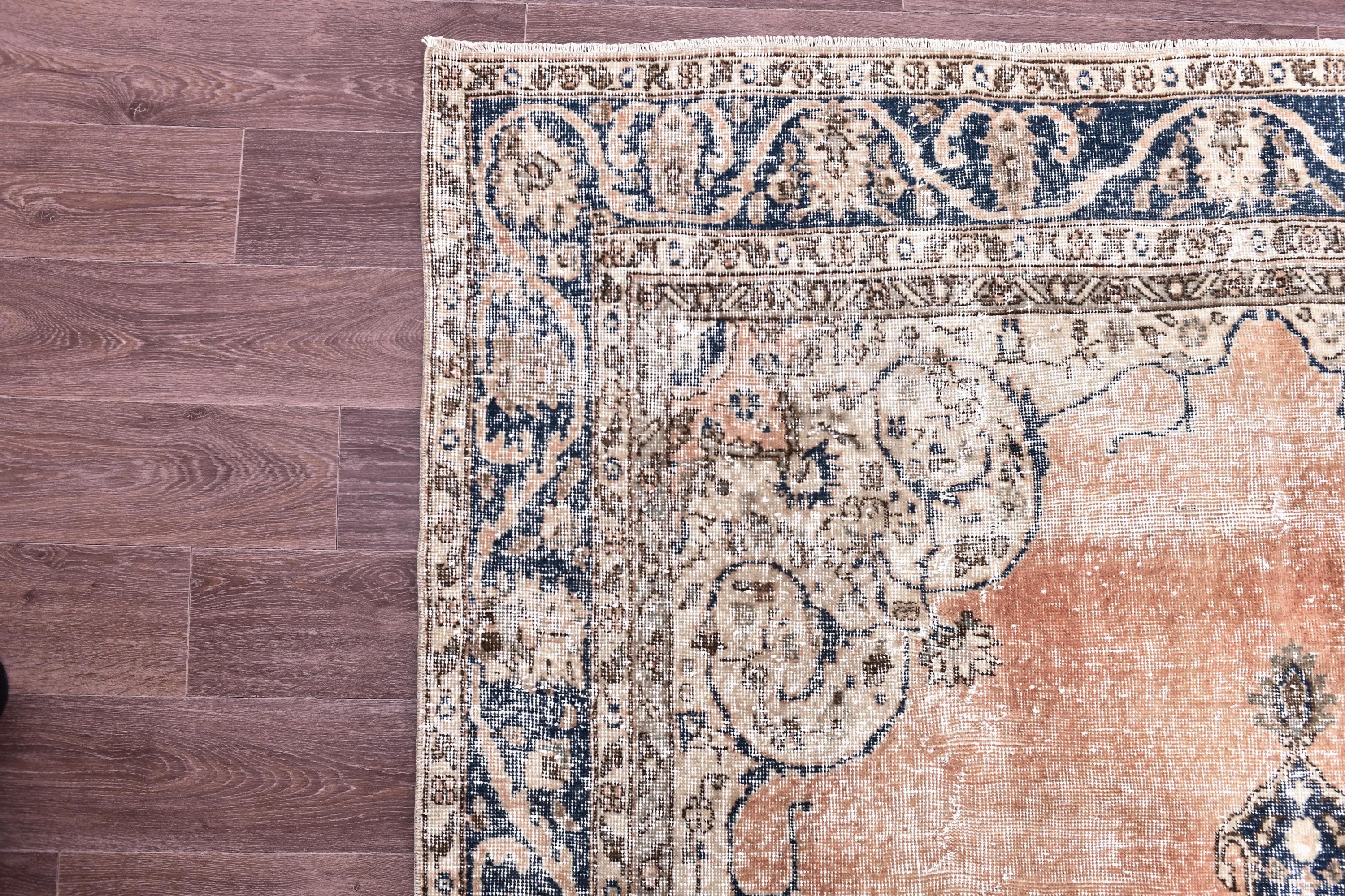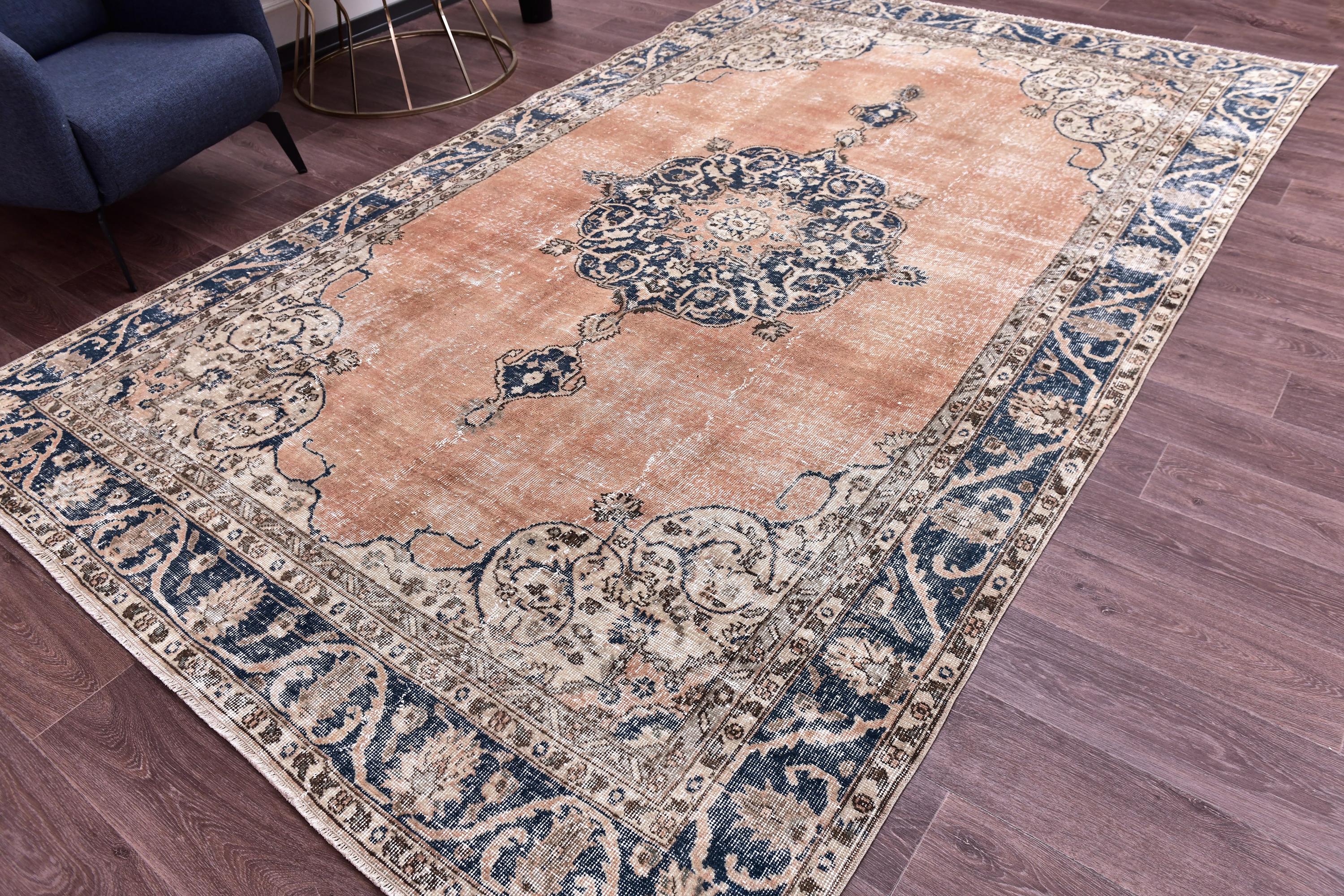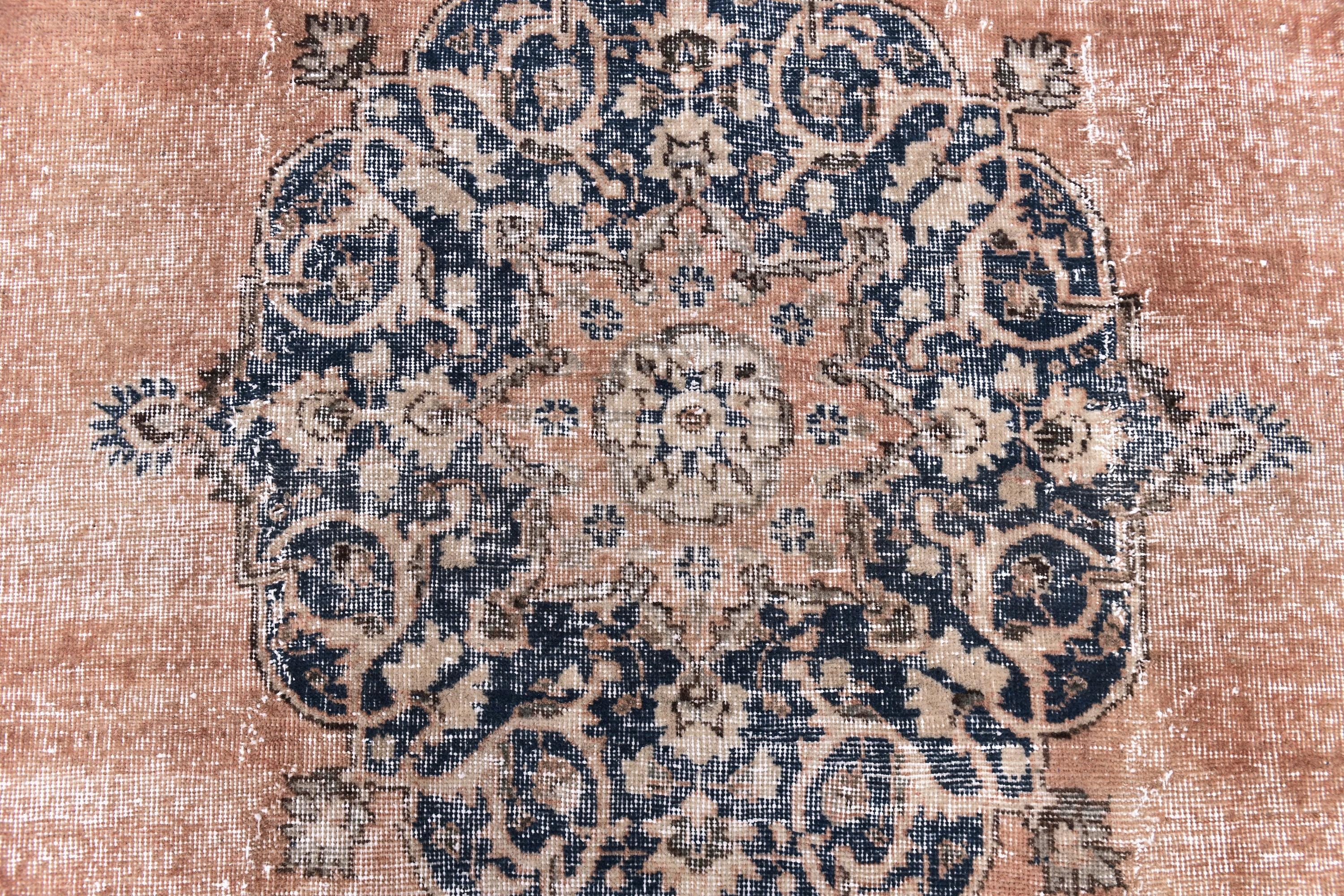 📜📌 Vintage distressed Turkish area rug featuring faded coral terracotta field with navy blue traditional medallion center motif and ornate corner spandrels, bordered with intricate floral patterns, handwoven wool construction with visible wear creating authentic aged patina