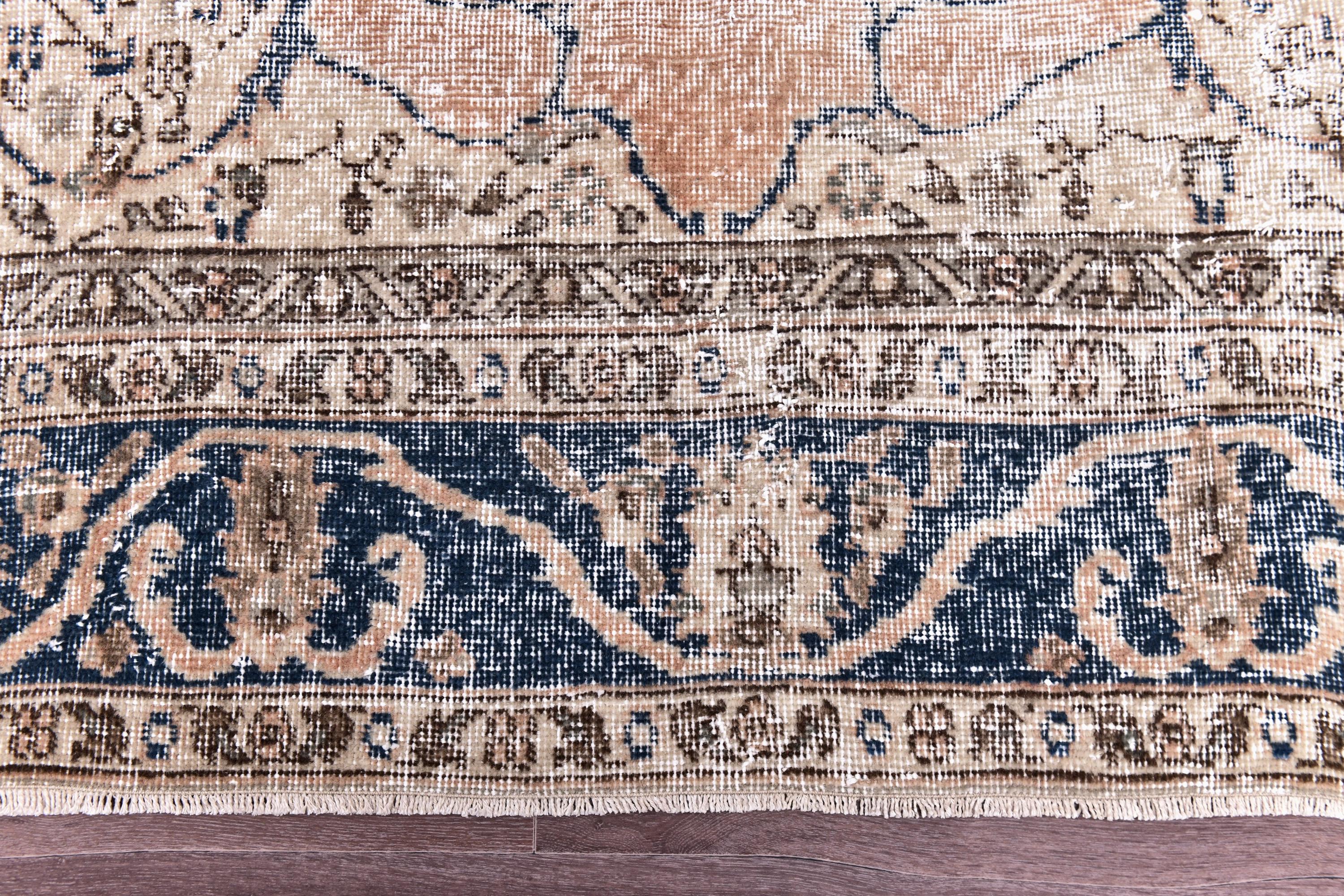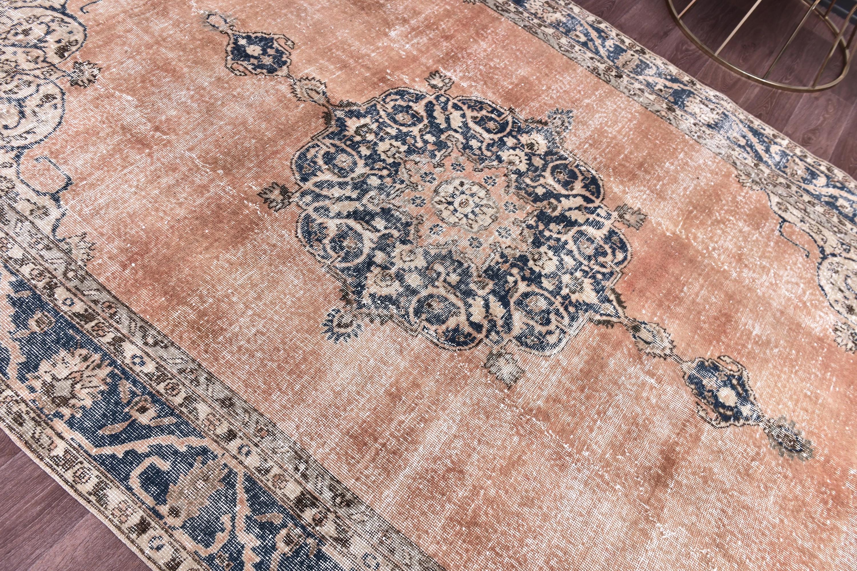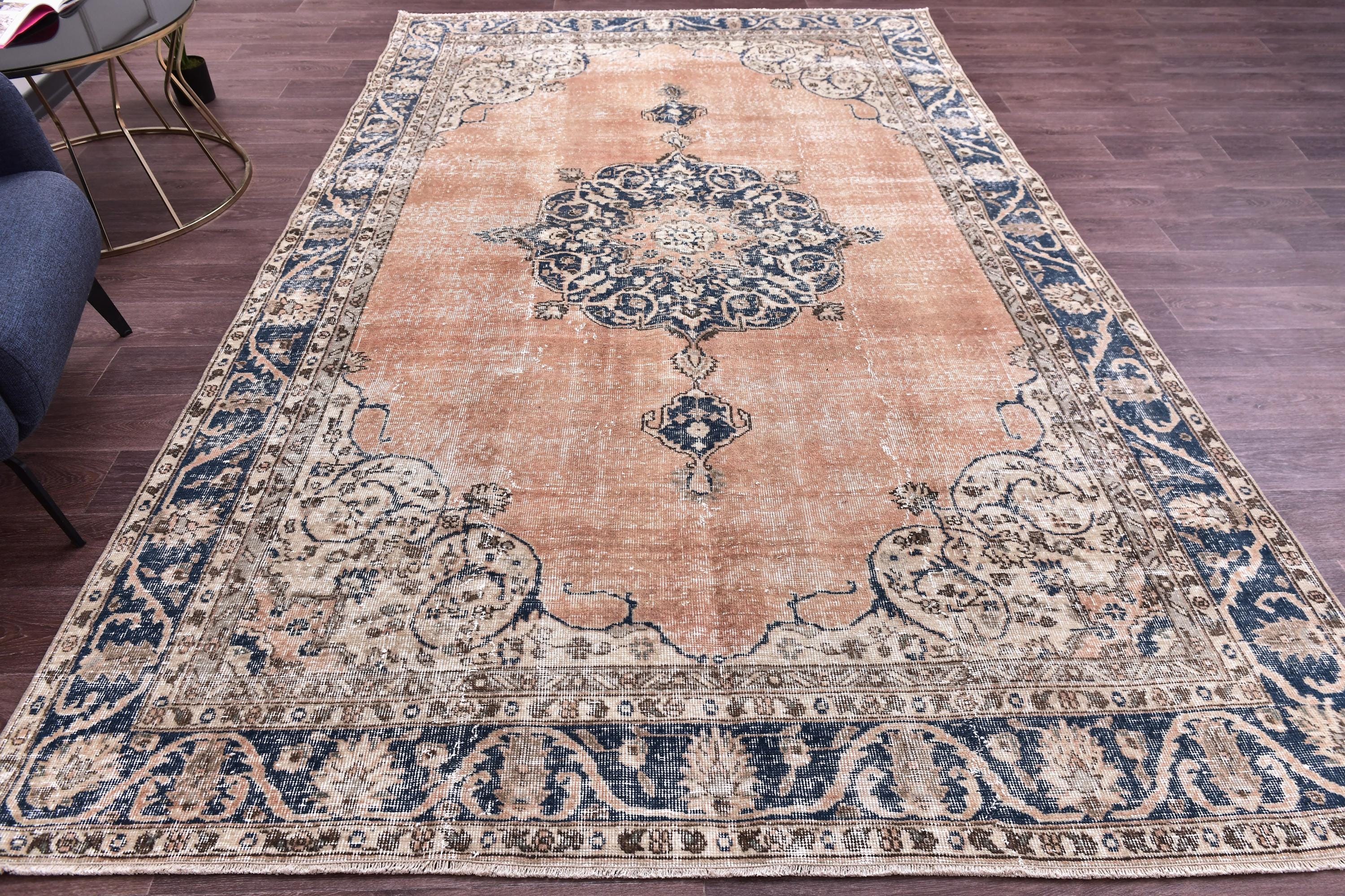 📜📌 Vintage distressed Turkish area rug featuring faded coral terracotta field with navy blue traditional medallion center motif and ornate corner spandrels, bordered with intricate floral patterns, handwoven wool construction with visible wear creating authentic aged patina