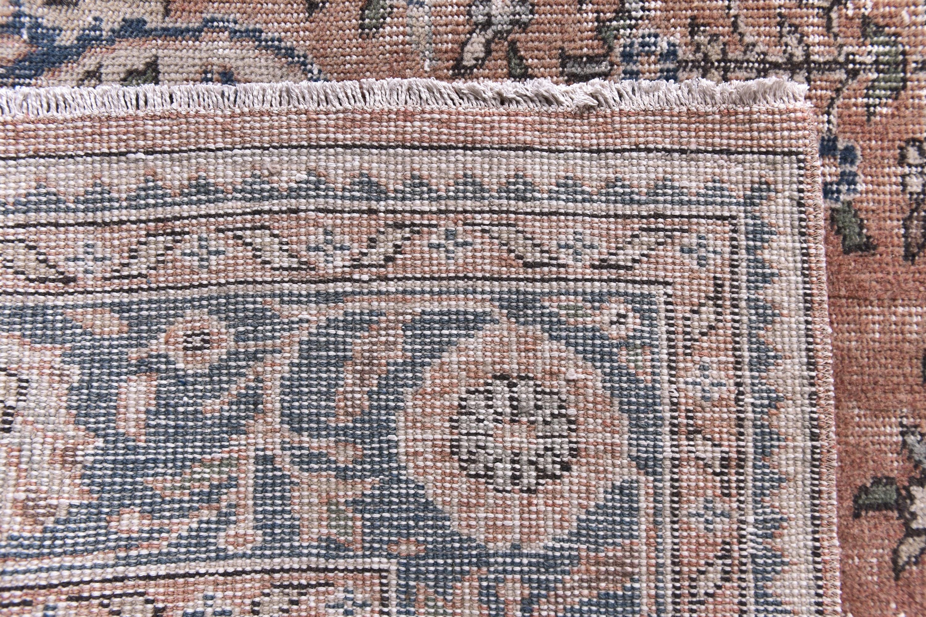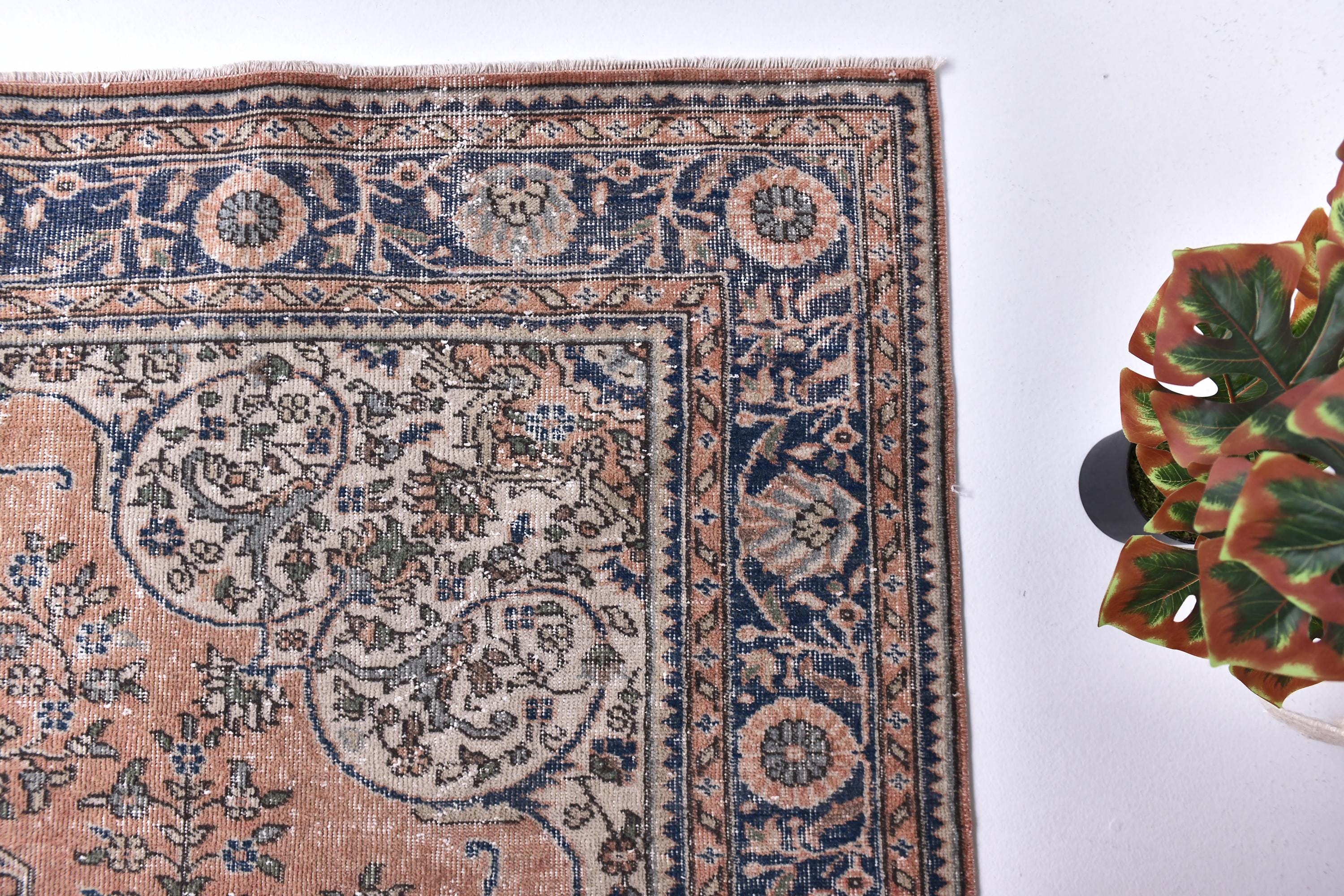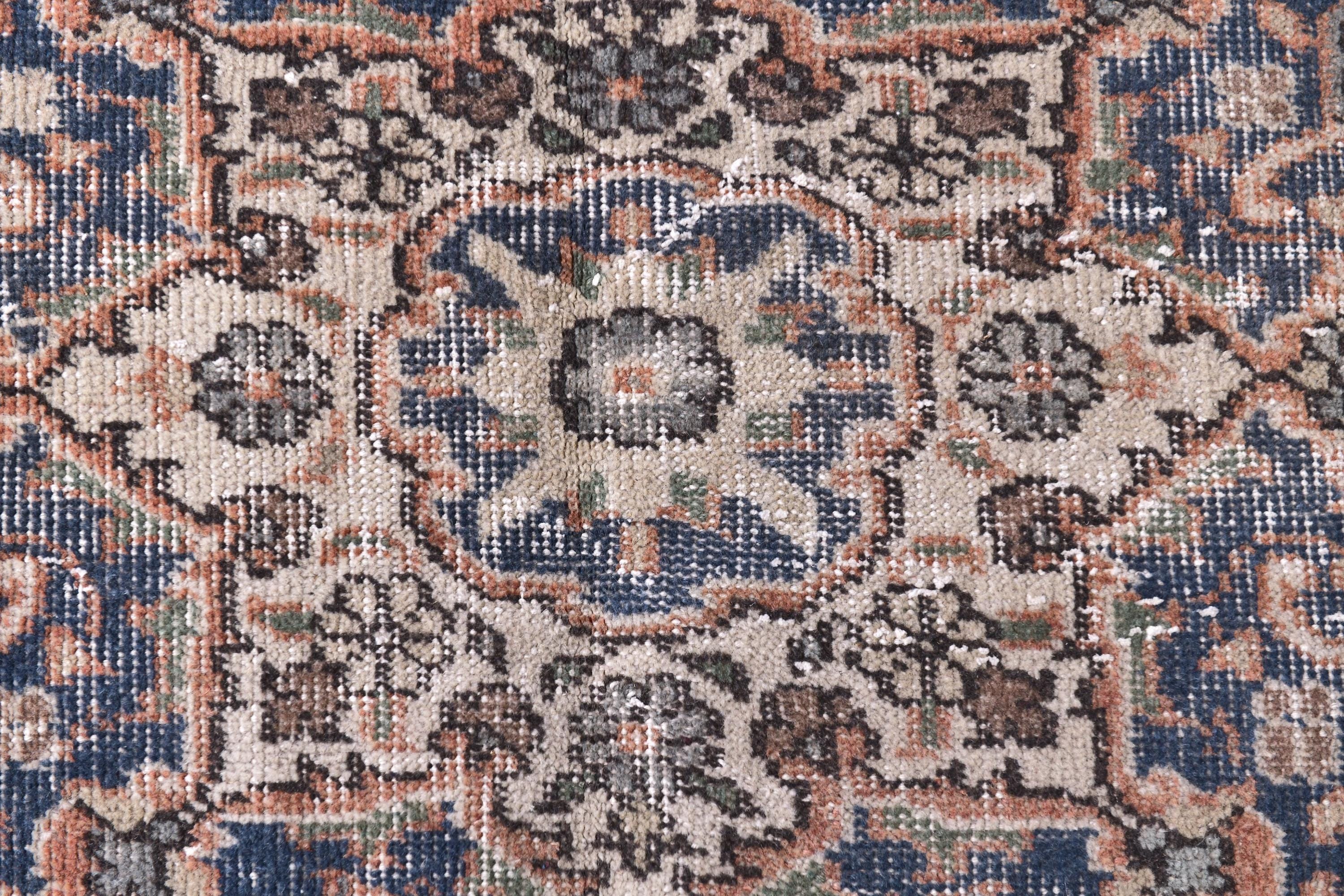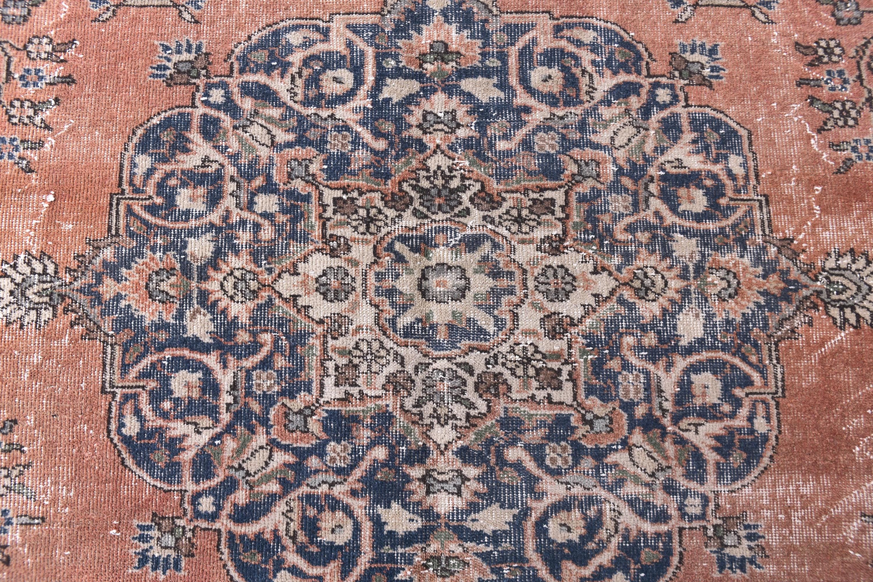 📜📌 Distressed oriental carpet displaying warm salmon coral background adorned with prominent dark blue ornamental medallion design, symmetrical floral vine scrollwork, beige cream accents throughout field, wide navy blue border featuring repeating rosette and palmette motifs, handknotted wool textile with weathered aged appearance