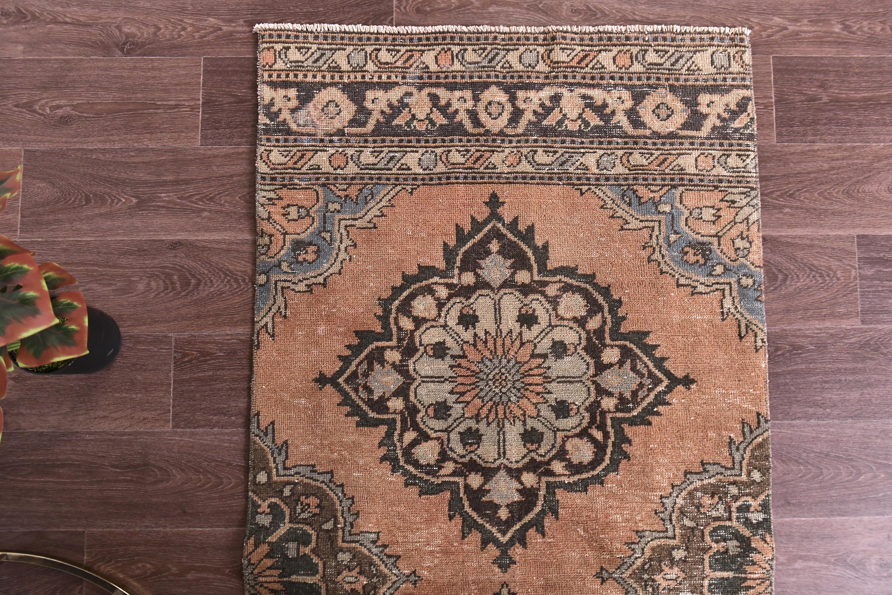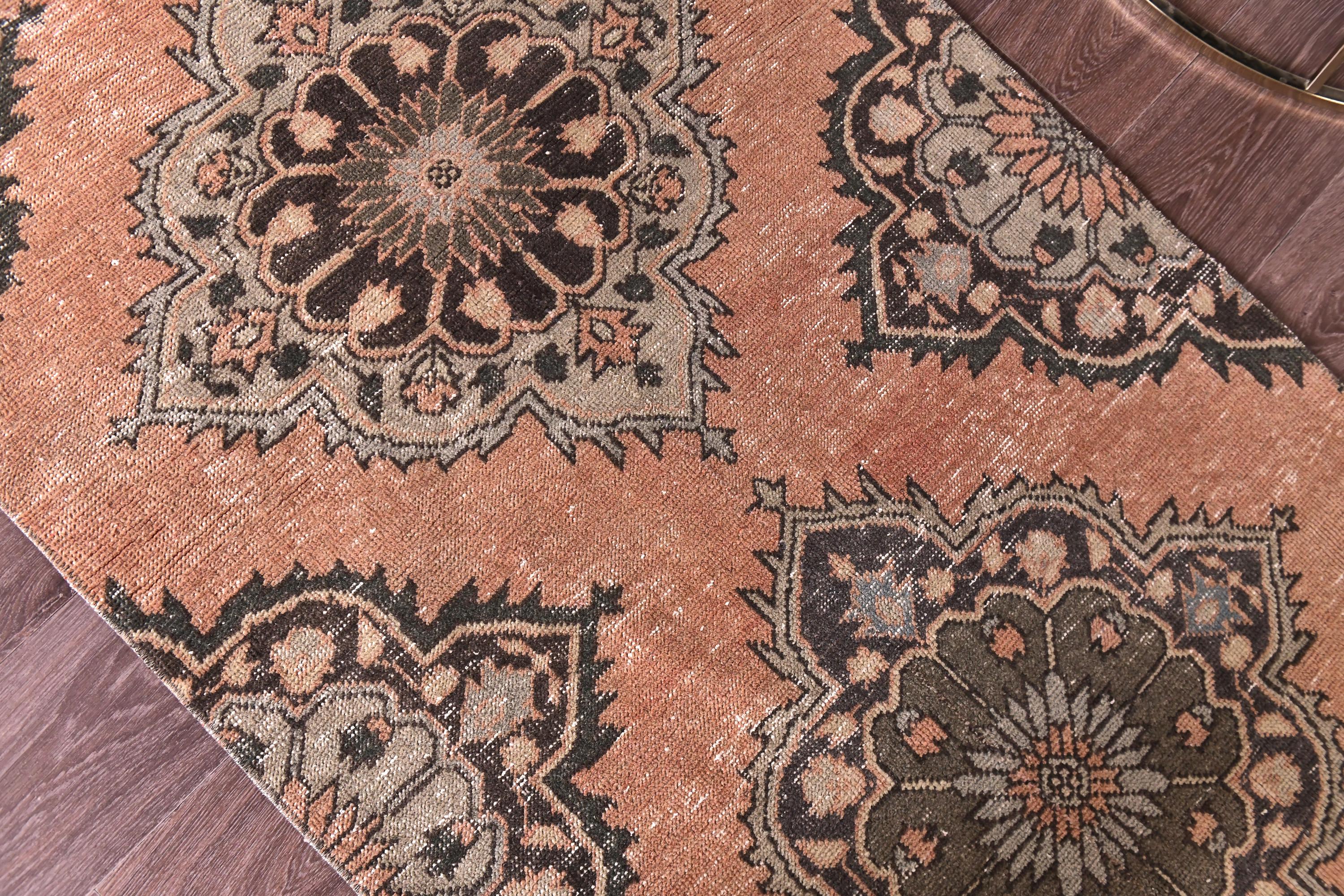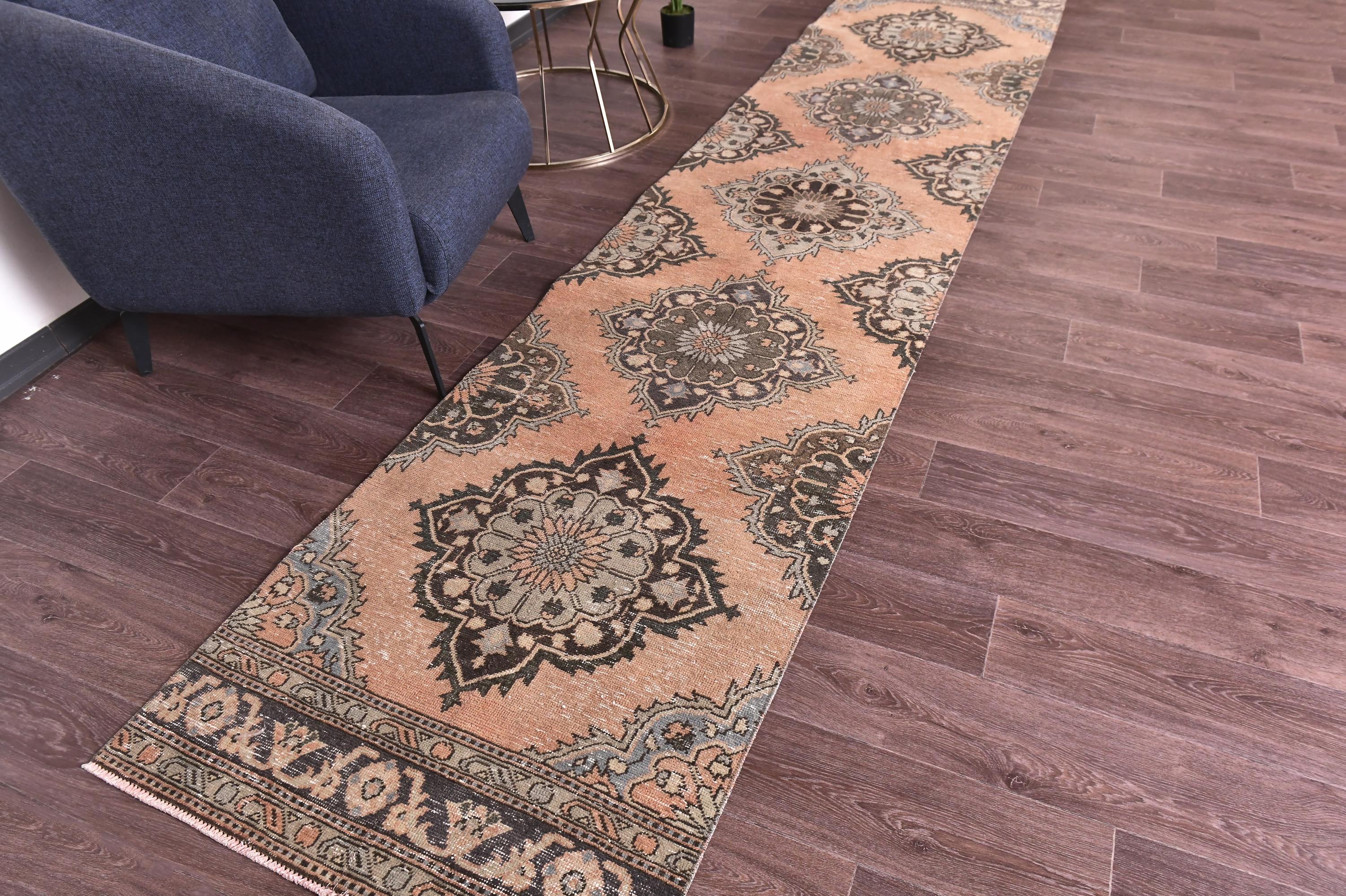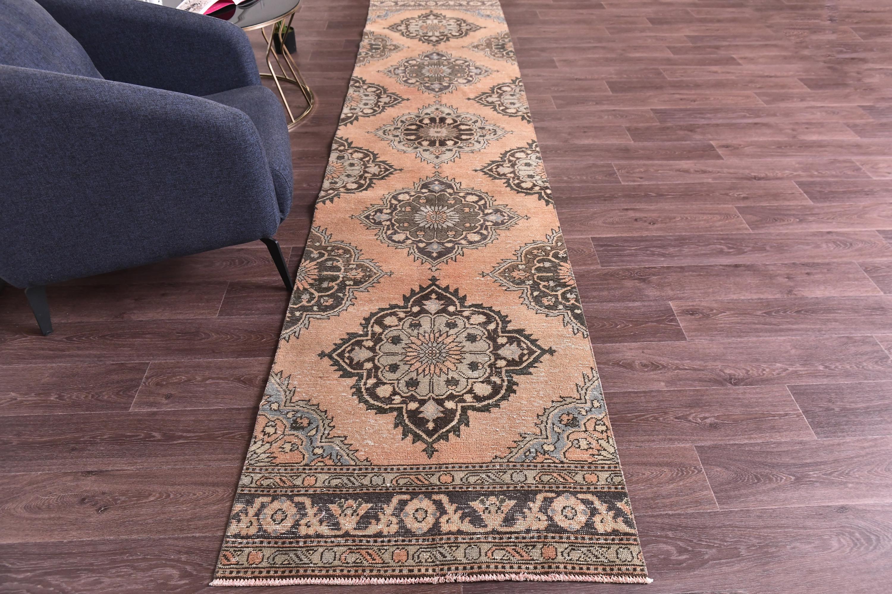 📜📌 Vintage Turkish runner rug featuring repeating floral medallion pattern in peach coral and charcoal black colors with blue accents, hand-knotted narrow hallway carpet with traditional border design and distressed patina, perfect for entryway kitchen or corridor decor