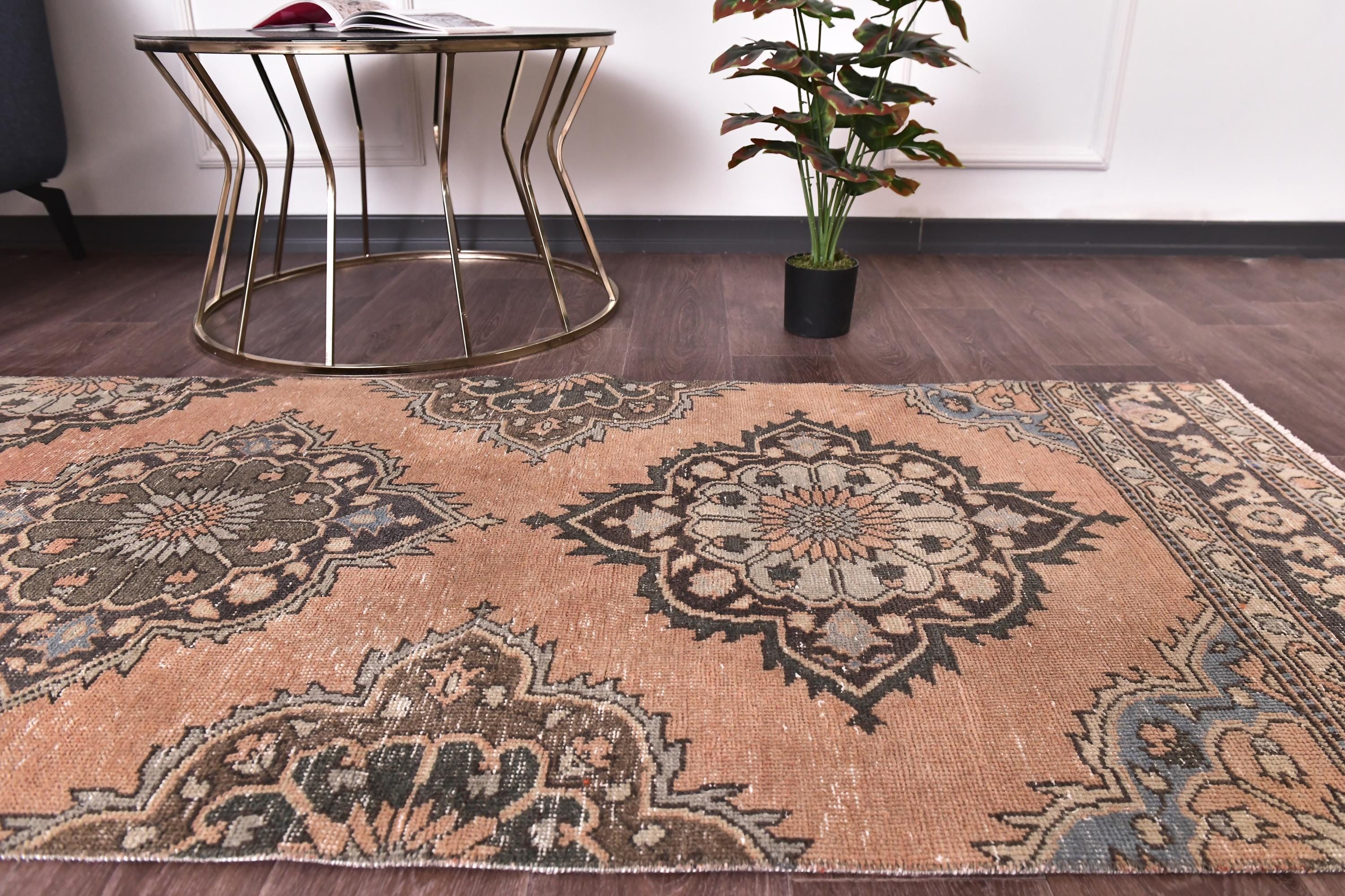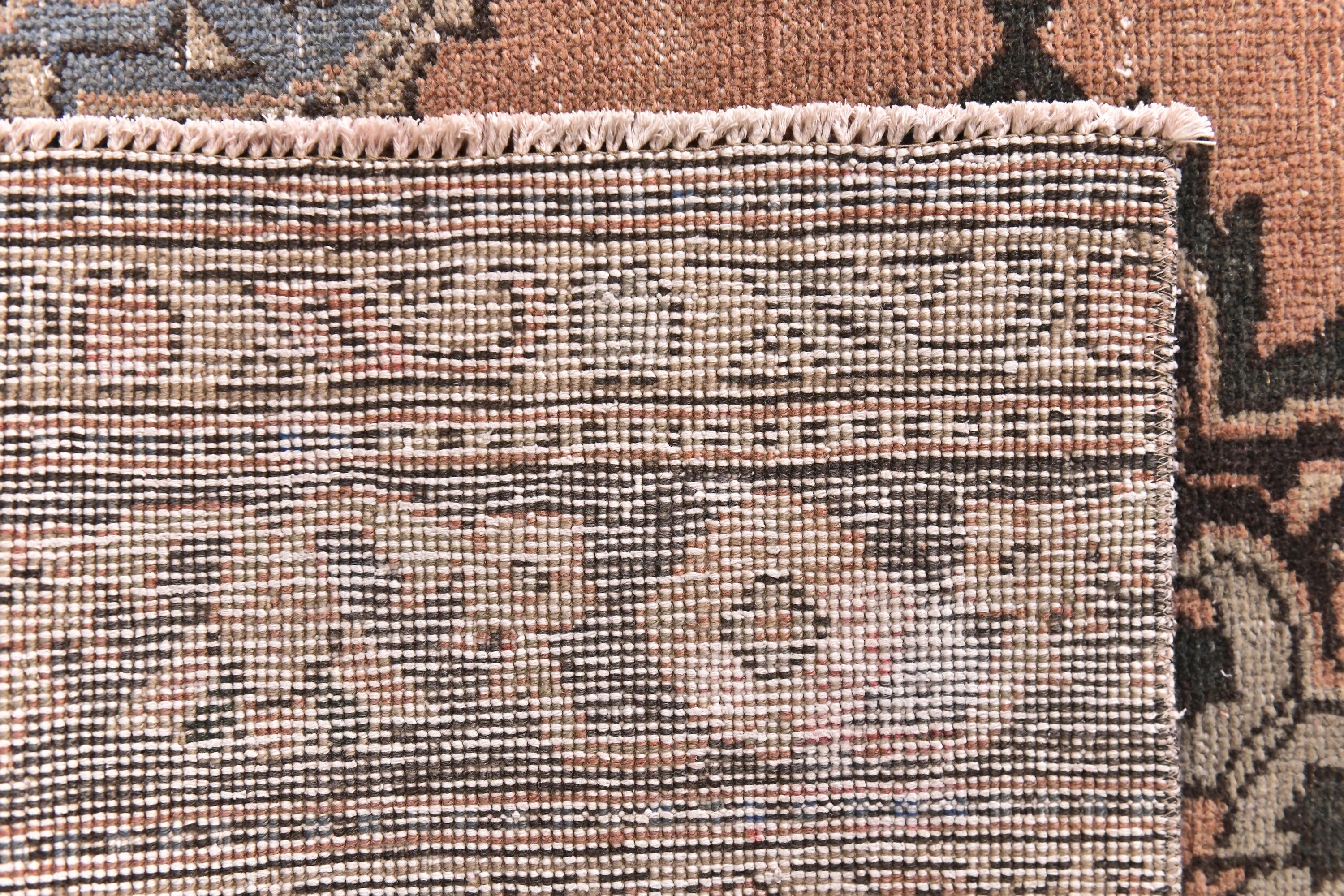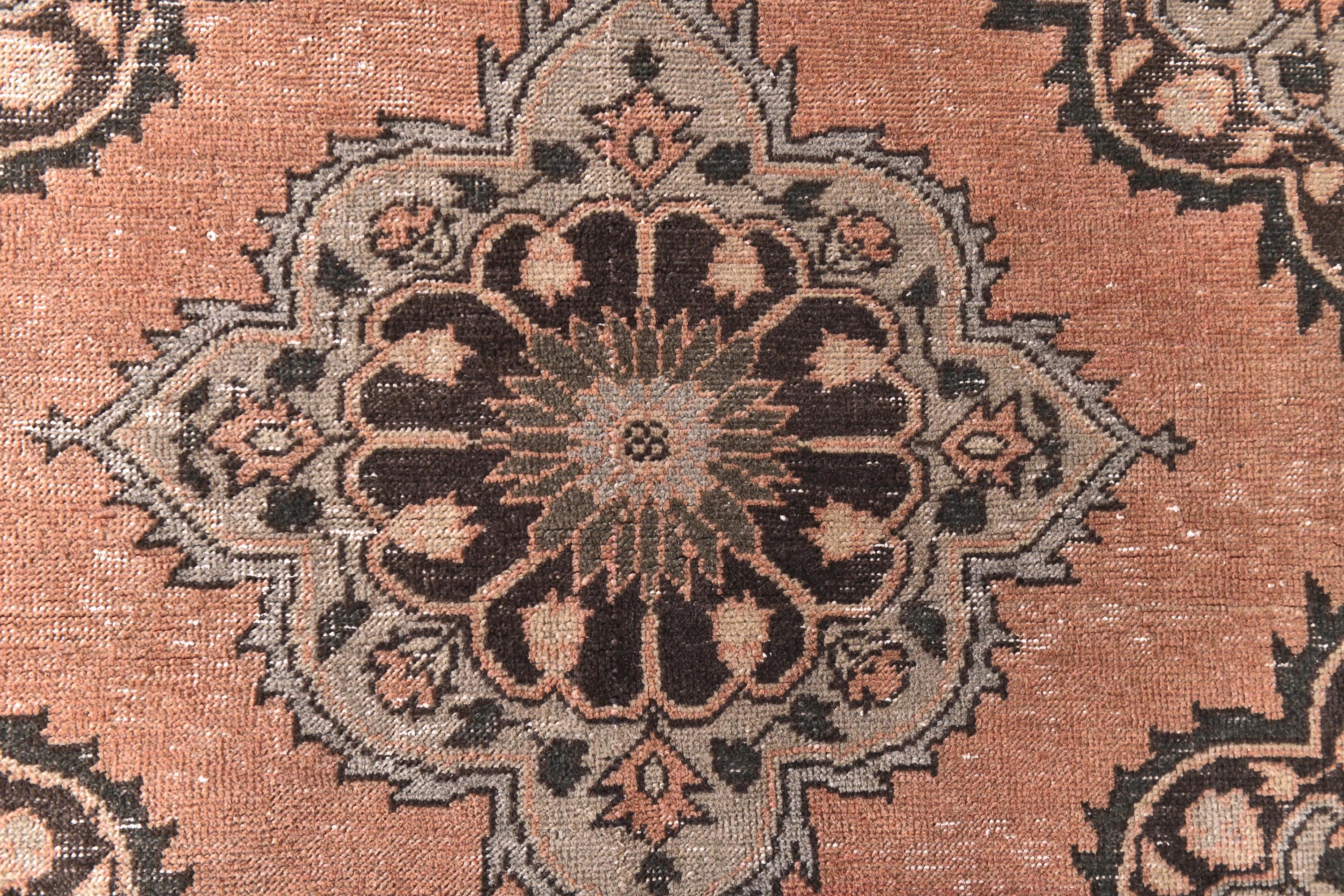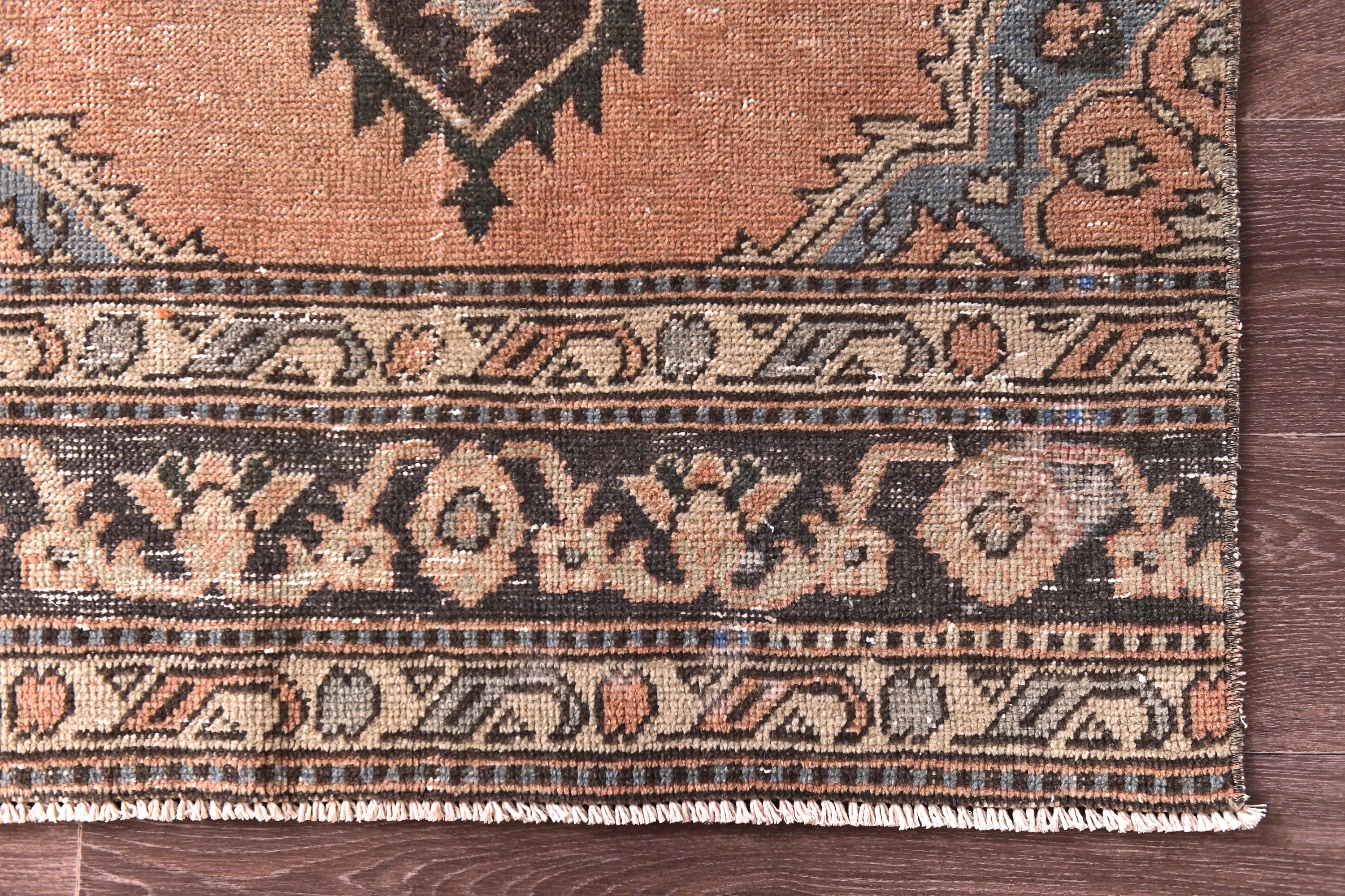📜📌 Vintage Turkish runner rug featuring repeating floral medallion pattern in peach coral and charcoal black colors with blue accents, hand-knotted narrow hallway carpet with traditional border design and distressed patina, perfect for entryway kitchen or corridor decor