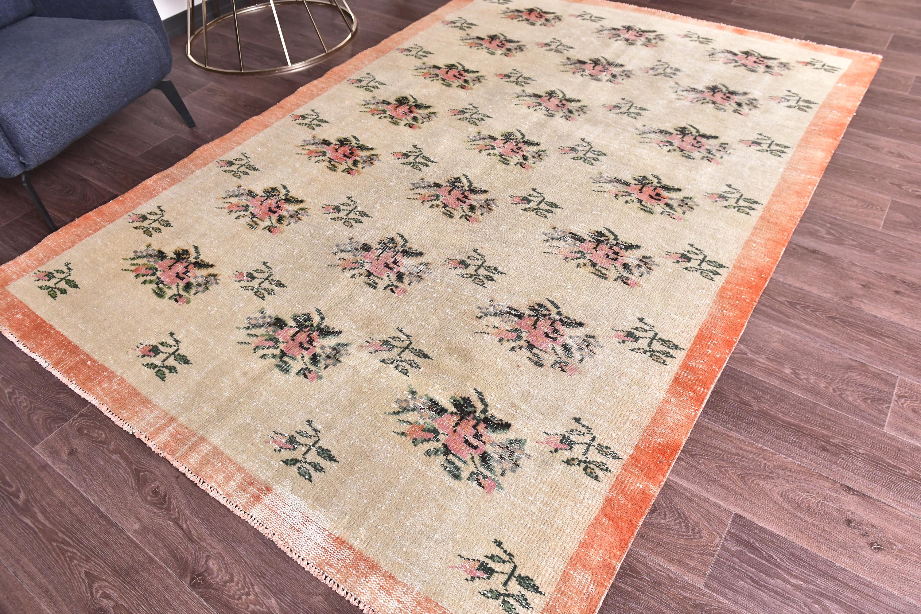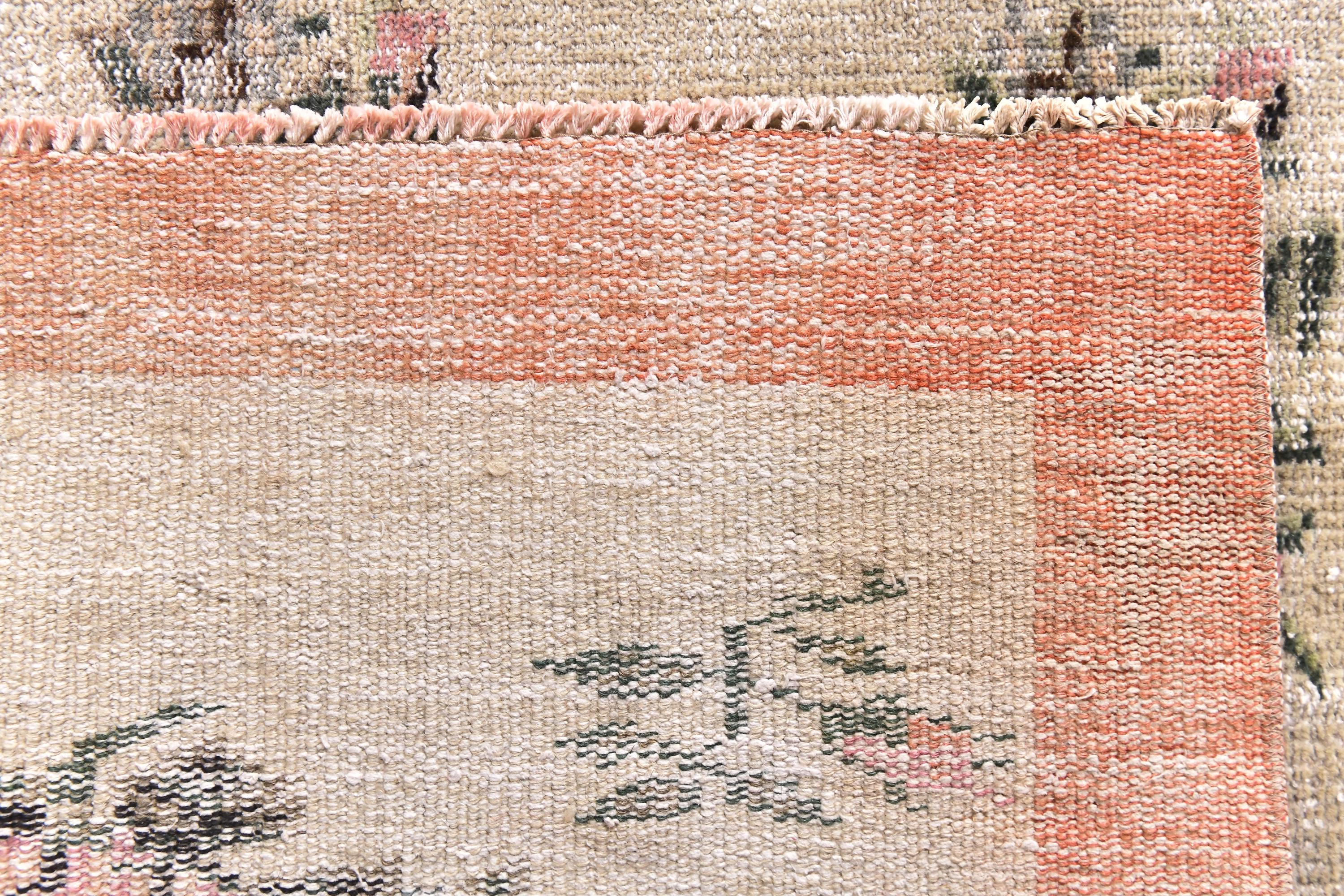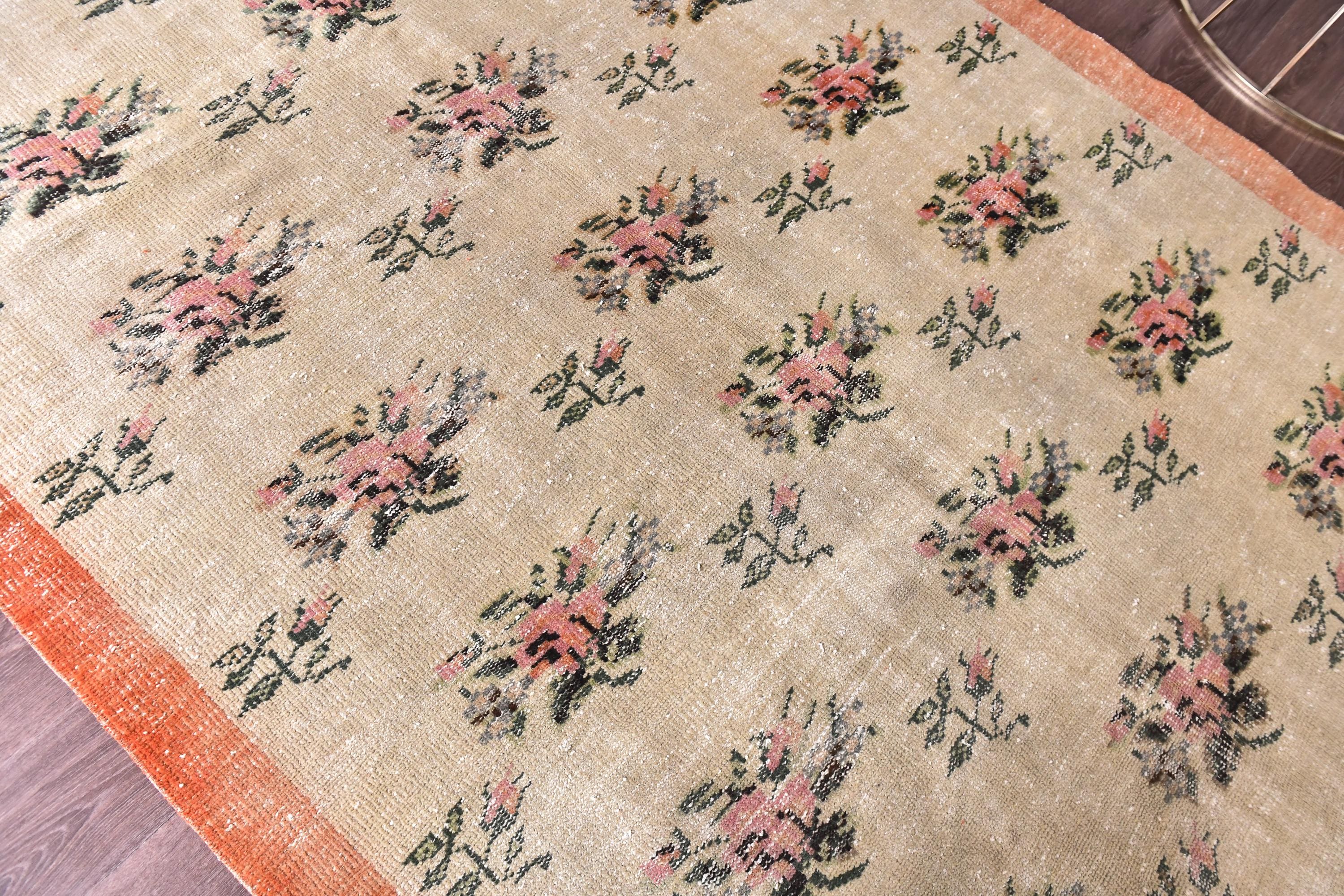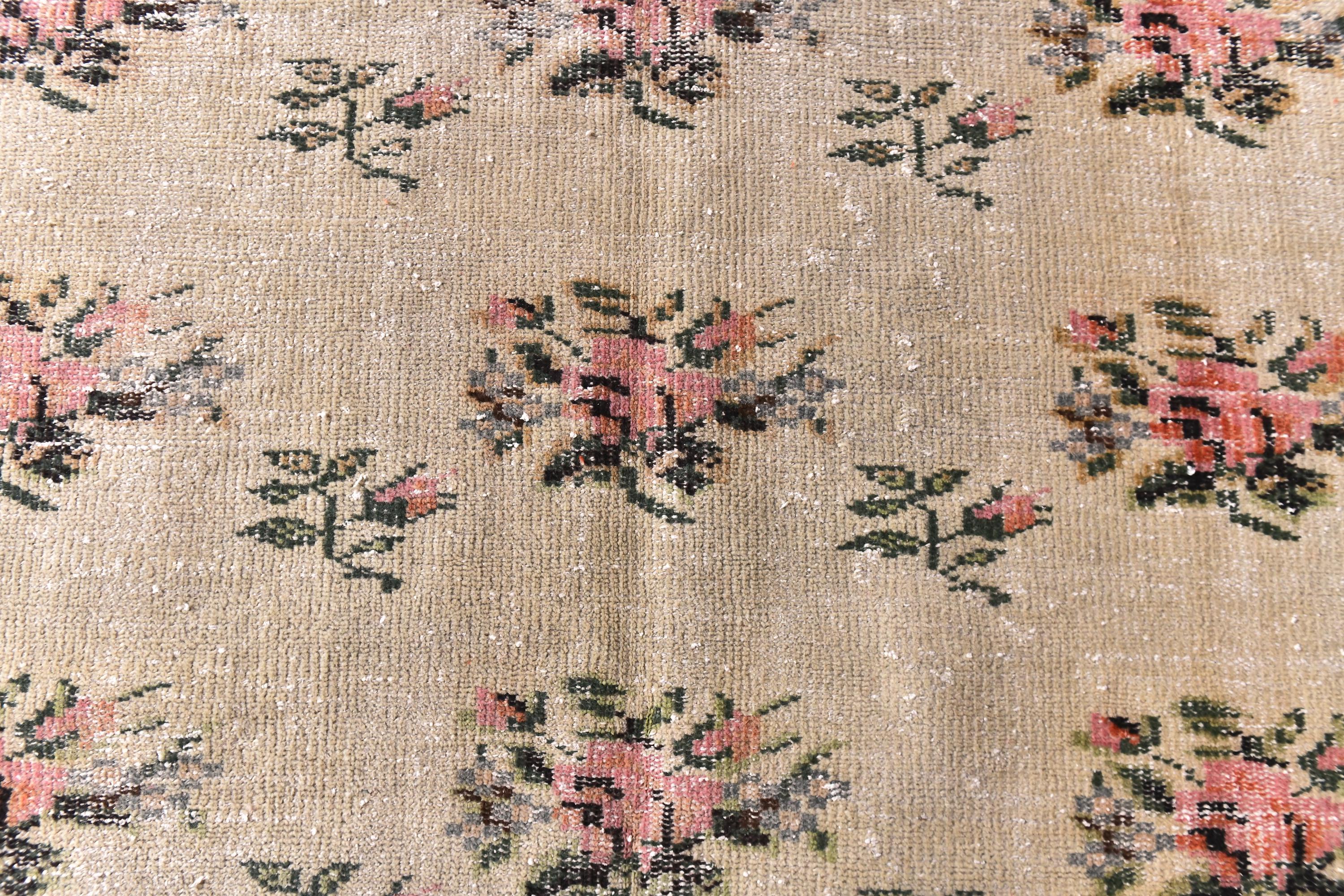 📜📌 Vintage Turkish area rug featuring scattered pink coral floral bouquet pattern on cream beige background with peachy orange border, hand-knotted distressed carpet with romantic cottage style design perfect for shabby chic farmhouse bedroom or living room decor