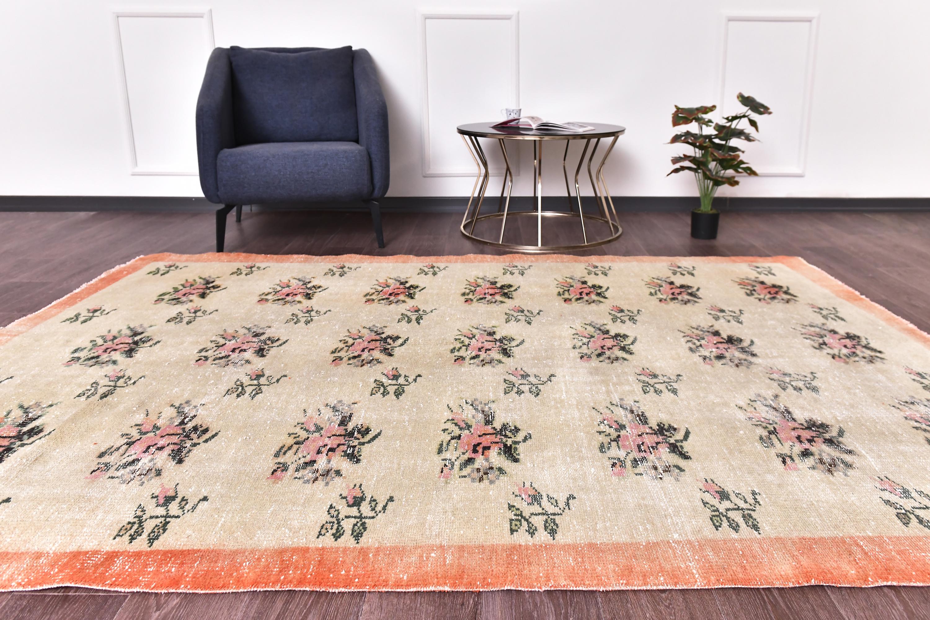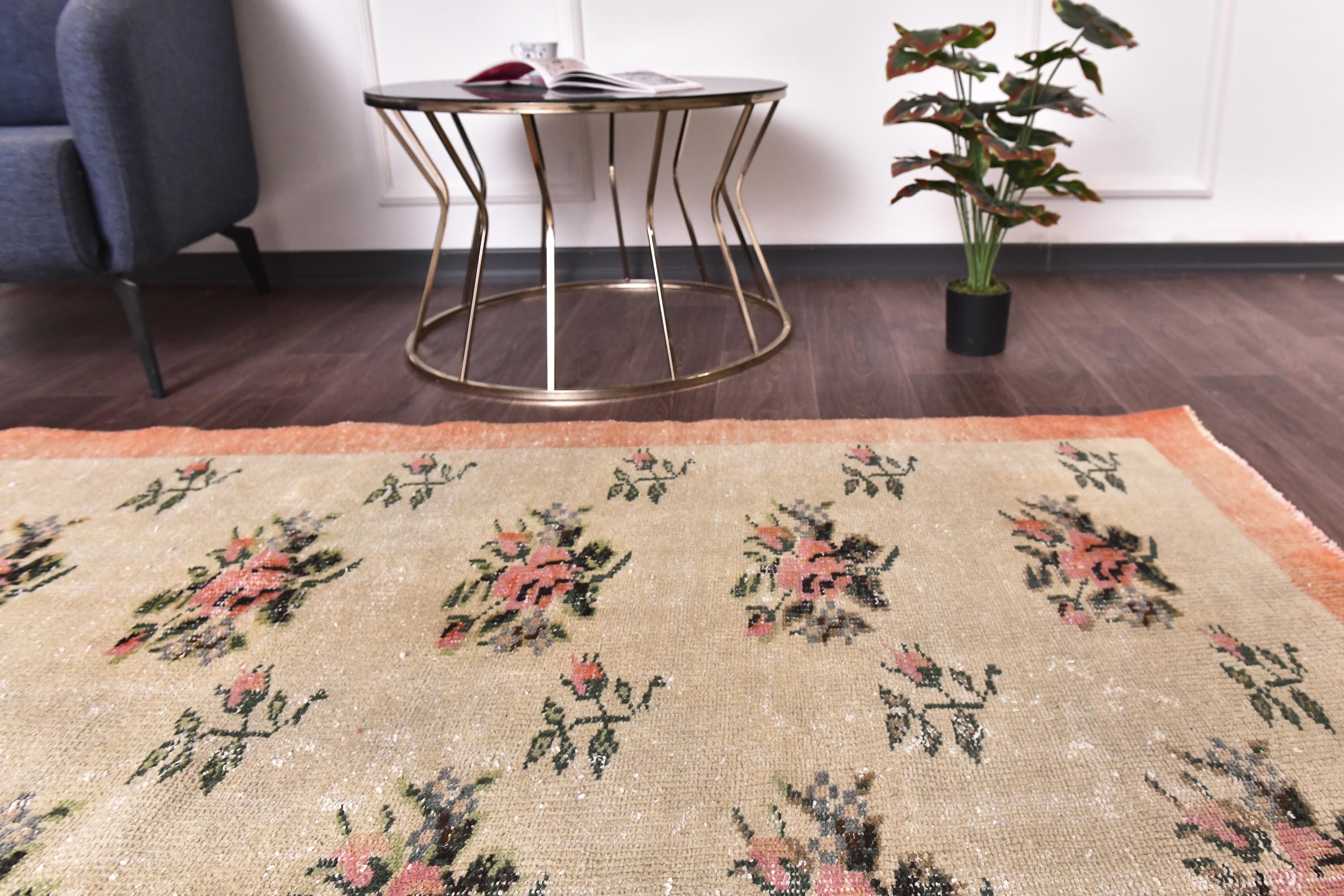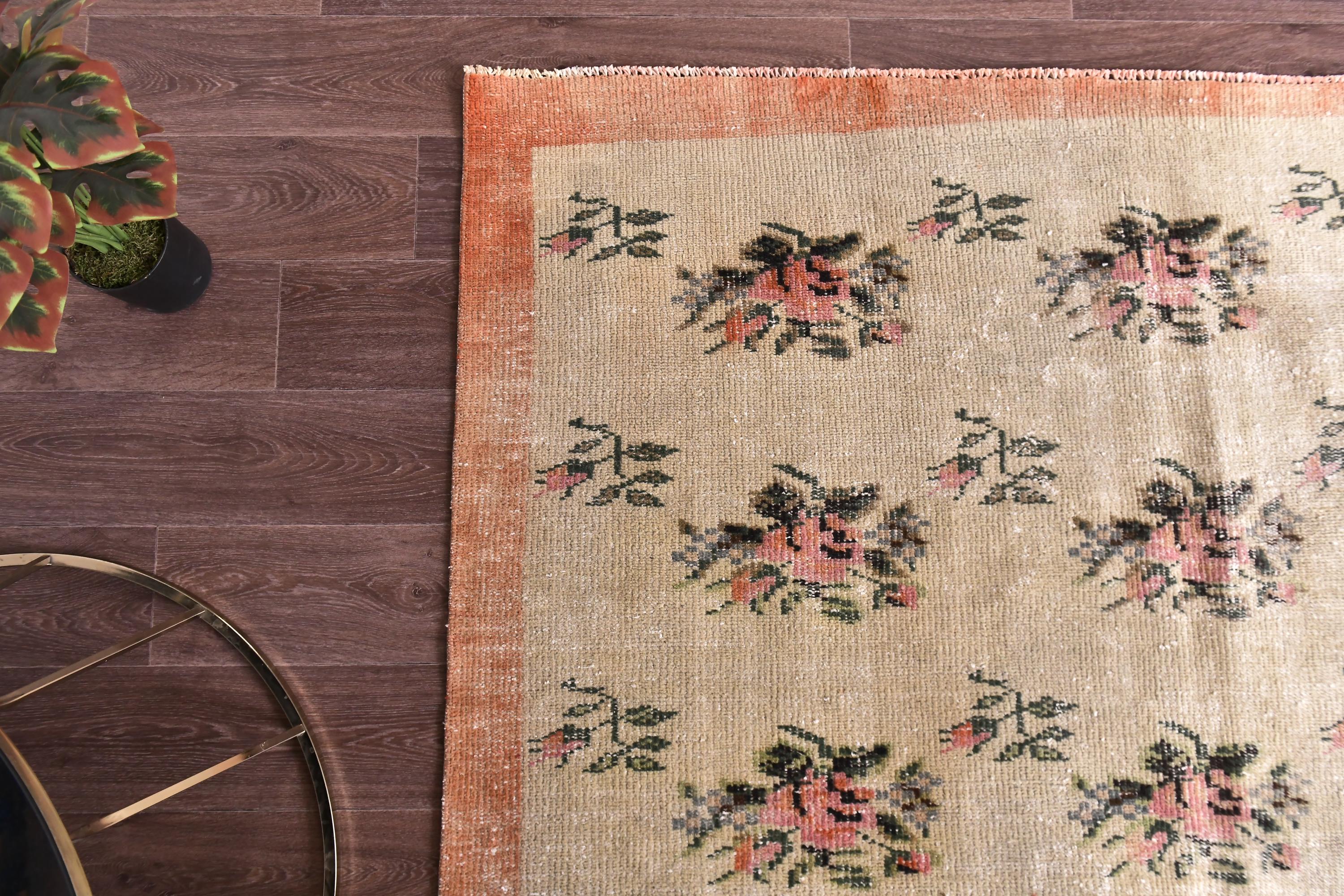 📜📌 Vintage Turkish area rug featuring scattered pink coral floral bouquet pattern on cream beige background with peachy orange border, hand-knotted distressed carpet with romantic cottage style design perfect for shabby chic farmhouse bedroom or living room decor