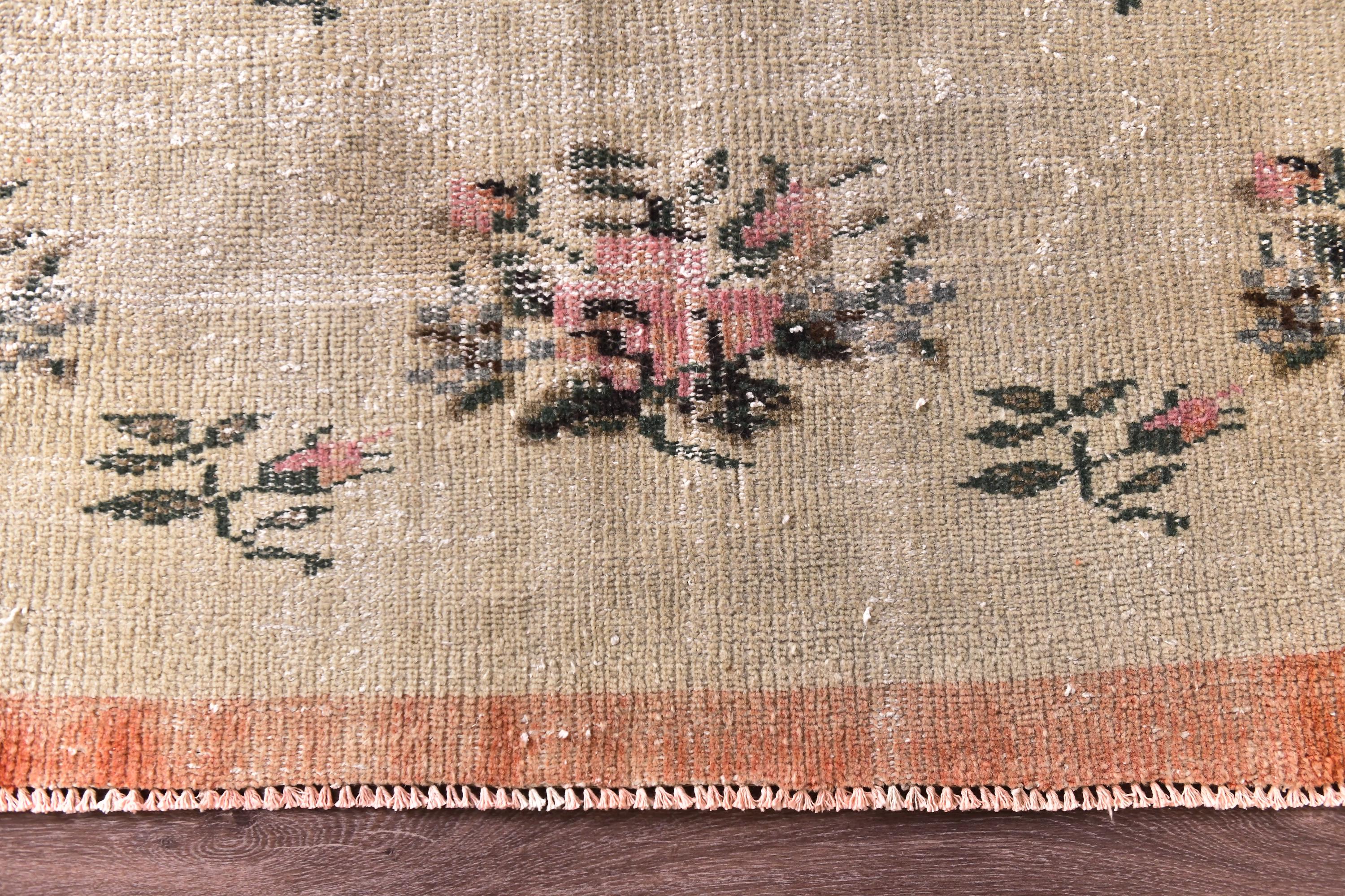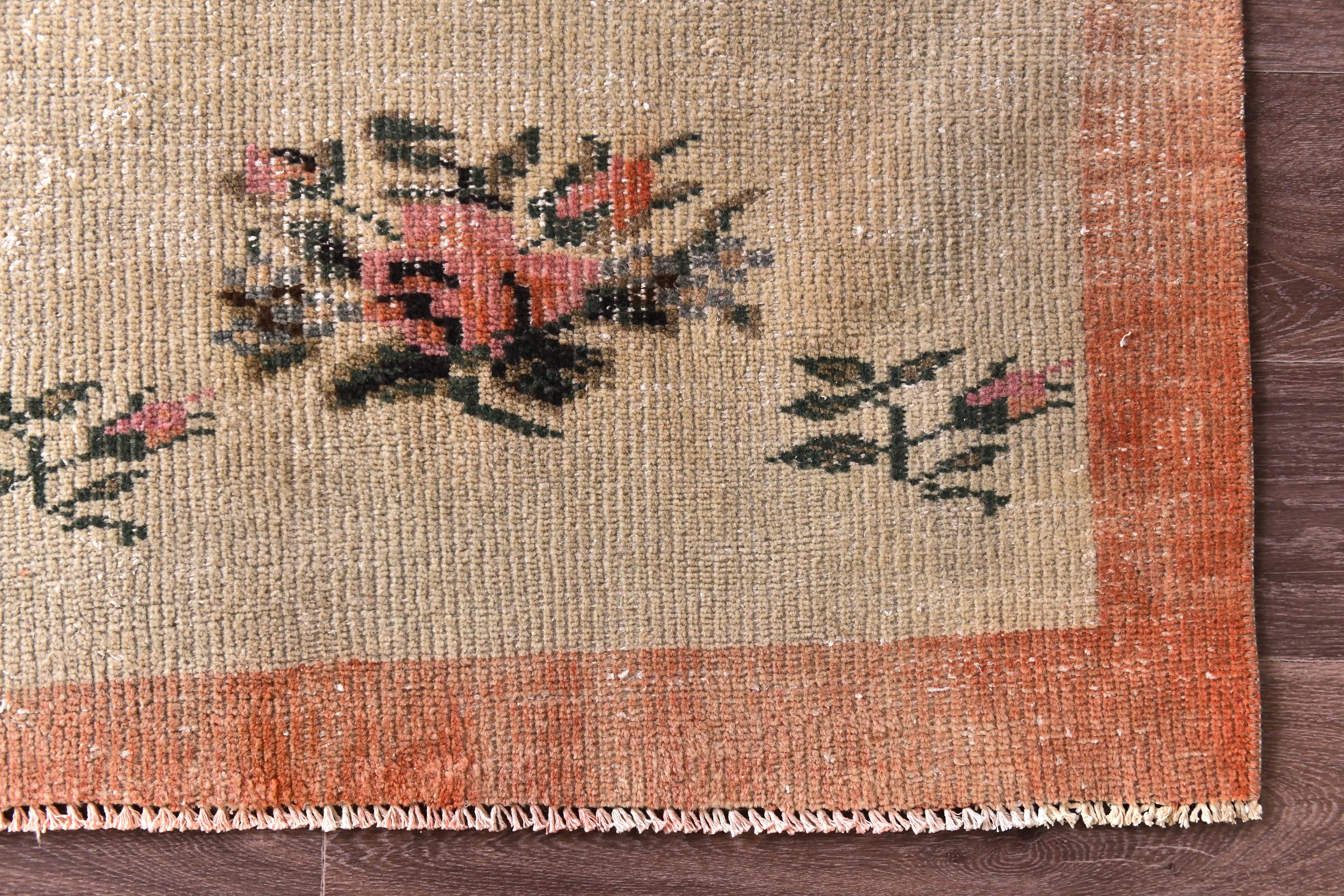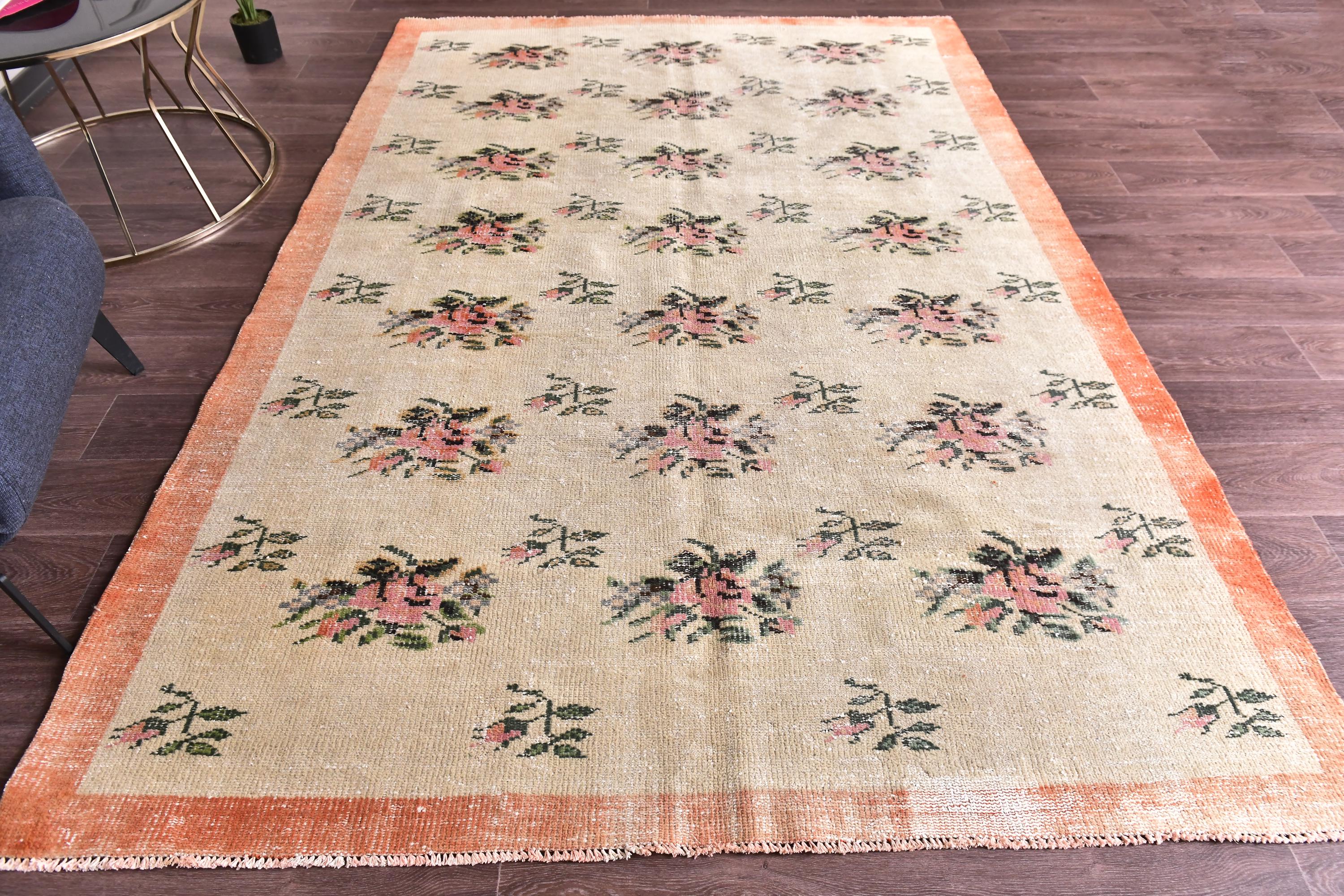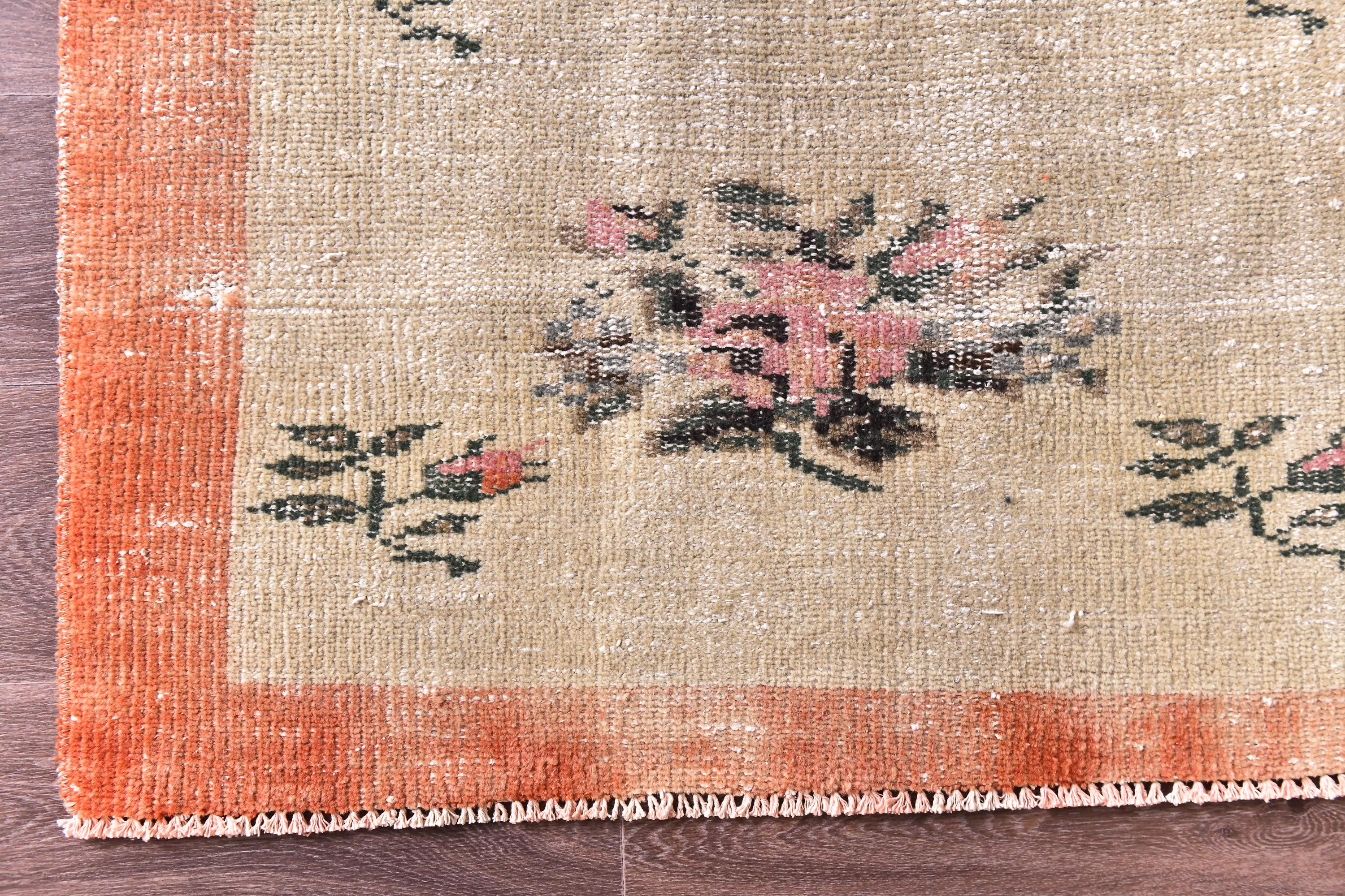 📜📌 Vintage Turkish area rug featuring scattered pink coral floral bouquet pattern on cream beige background with peachy orange border, hand-knotted distressed carpet with romantic cottage style design perfect for shabby chic farmhouse bedroom or living room decor