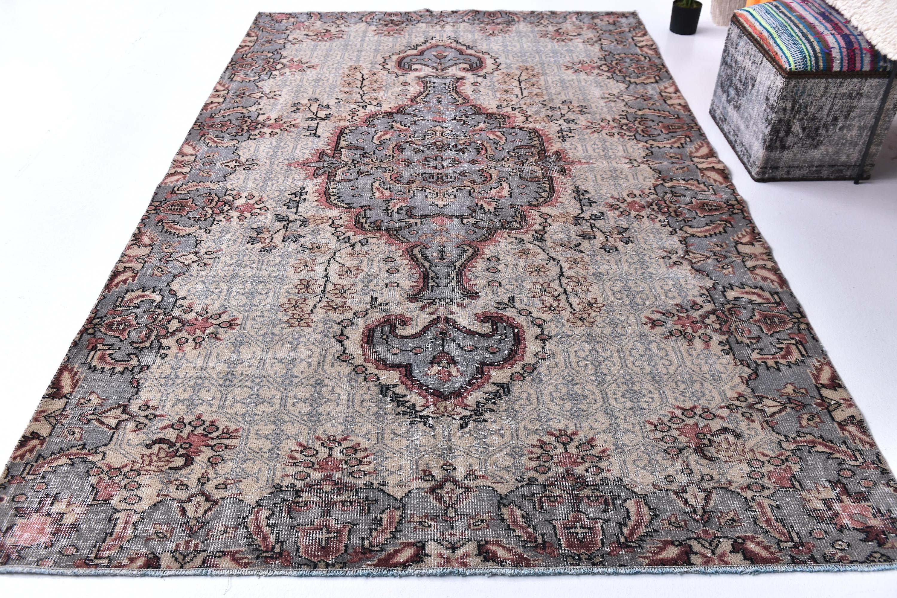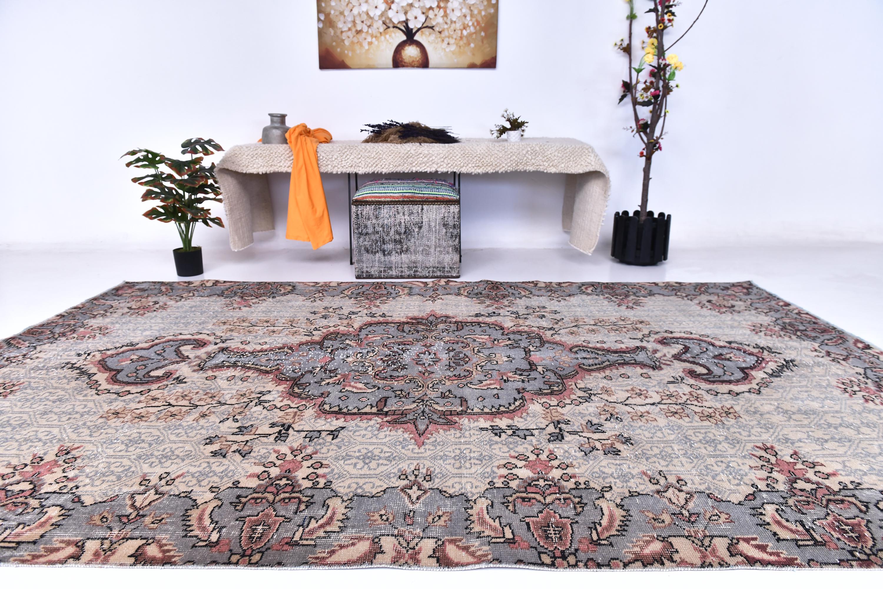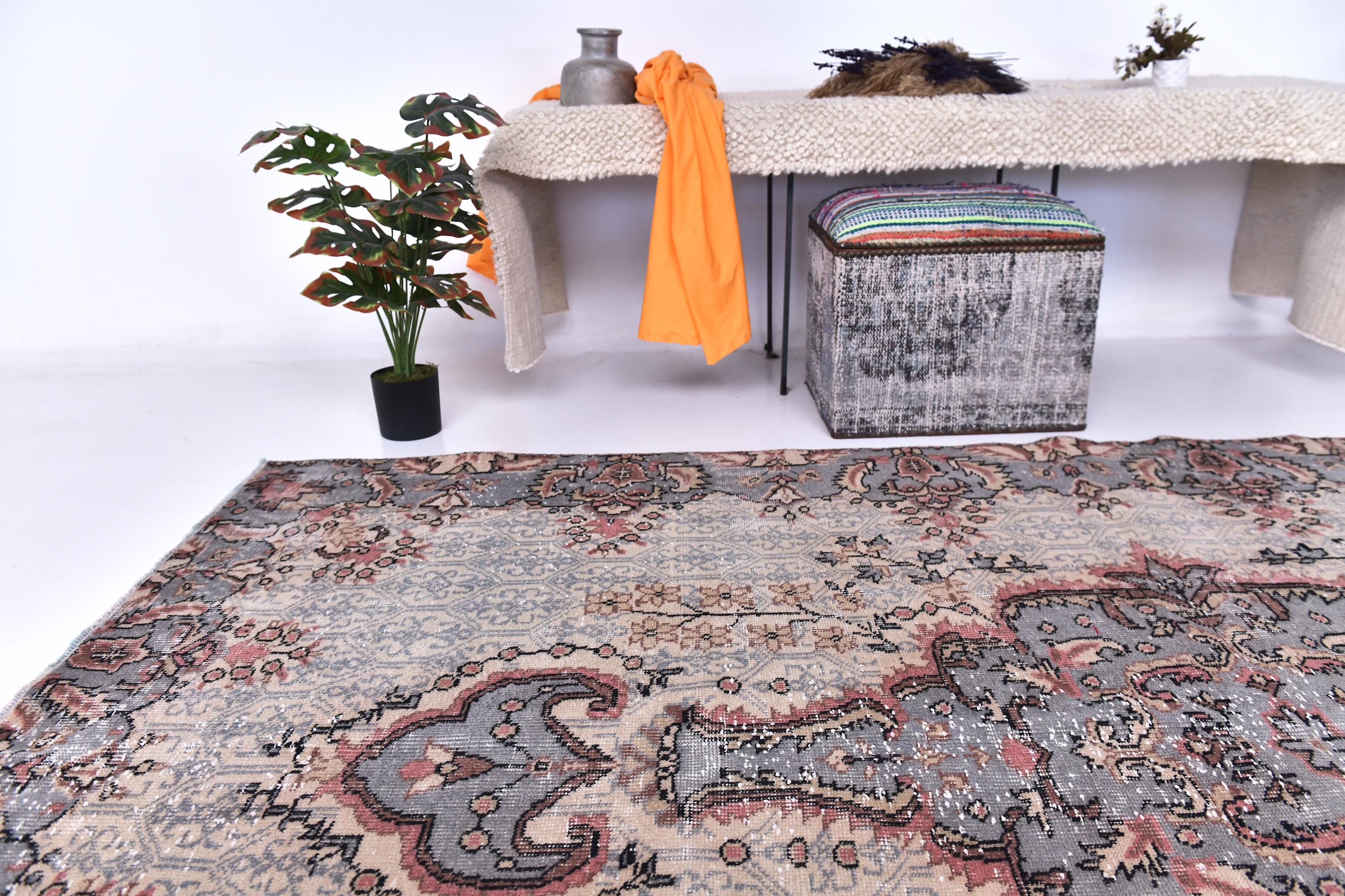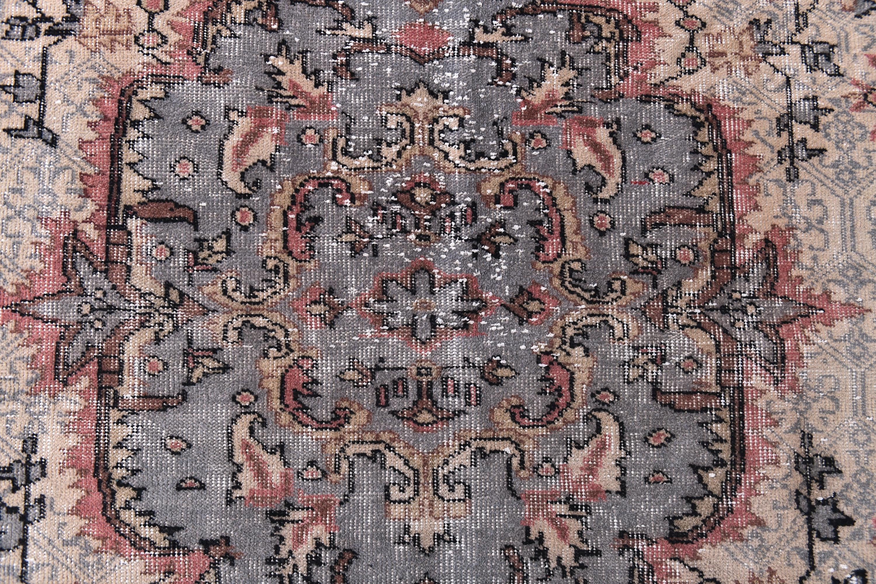 📜📌Distressed Vintage rug in charcoal gray tones with dusty rose pink central medallion design and traditional Persian motifs, vintage hand-knotted Turkish carpet with authentic weathered appearance and multi-tonal gray coloring, elegant area rug for contemporary bohemian home styling