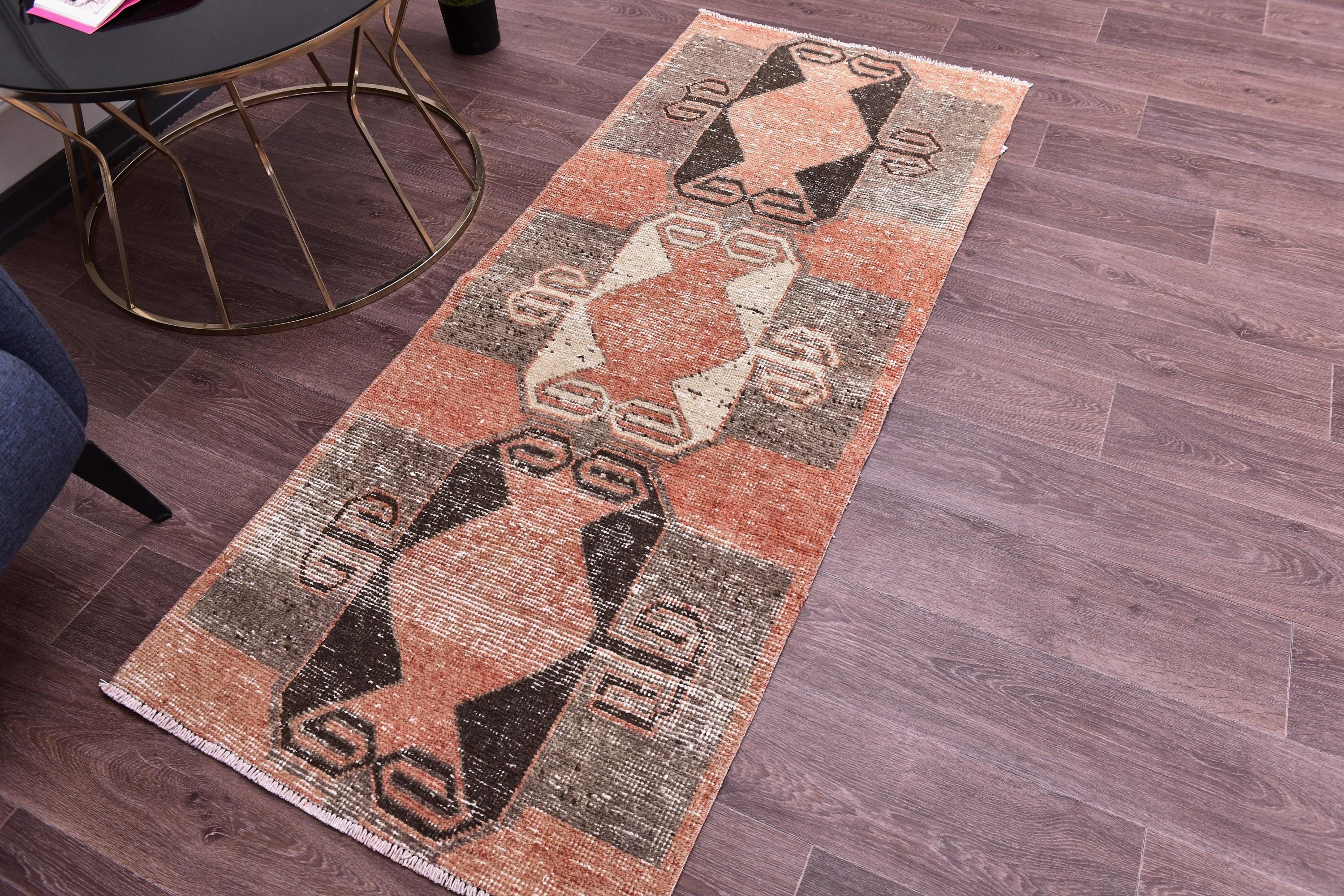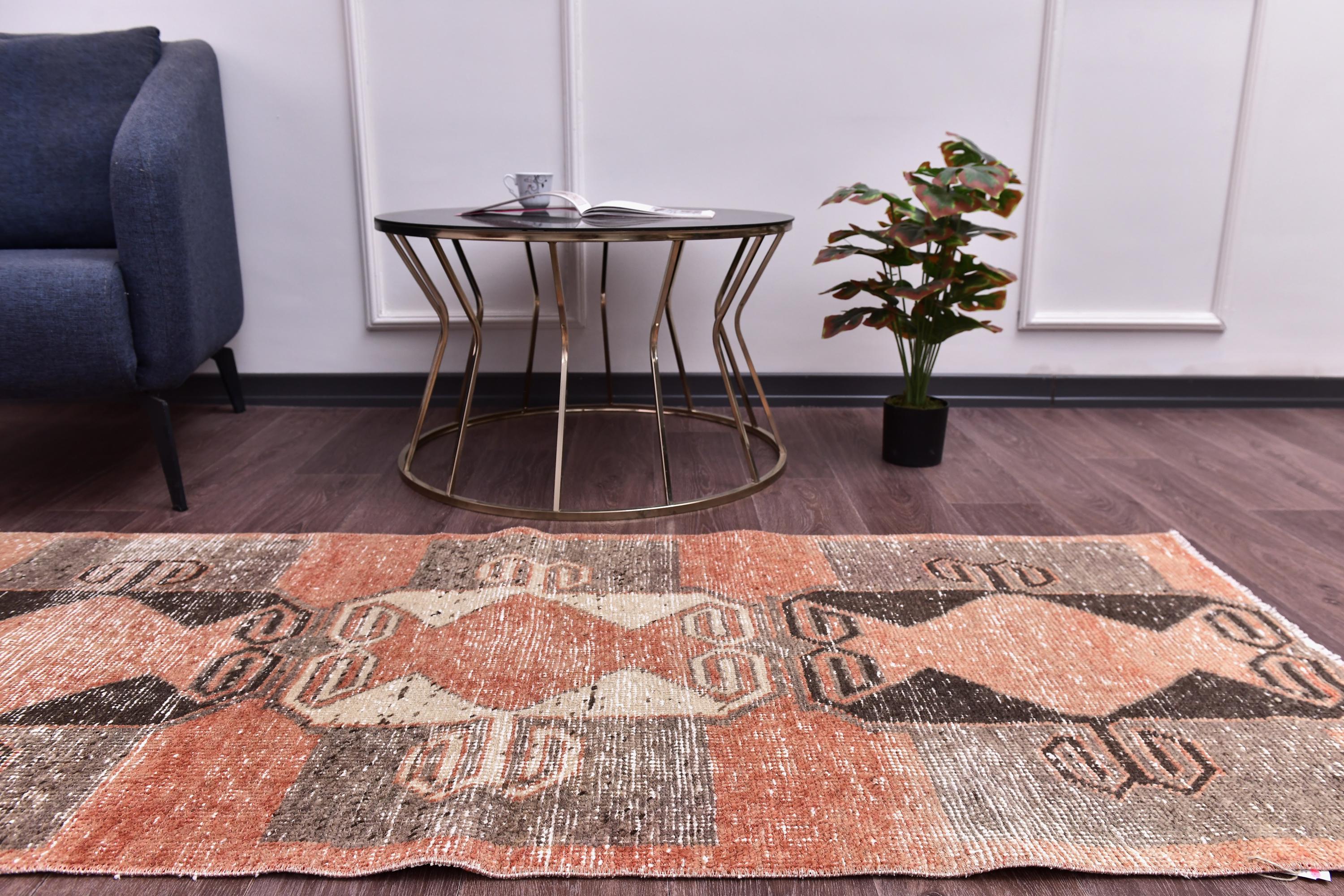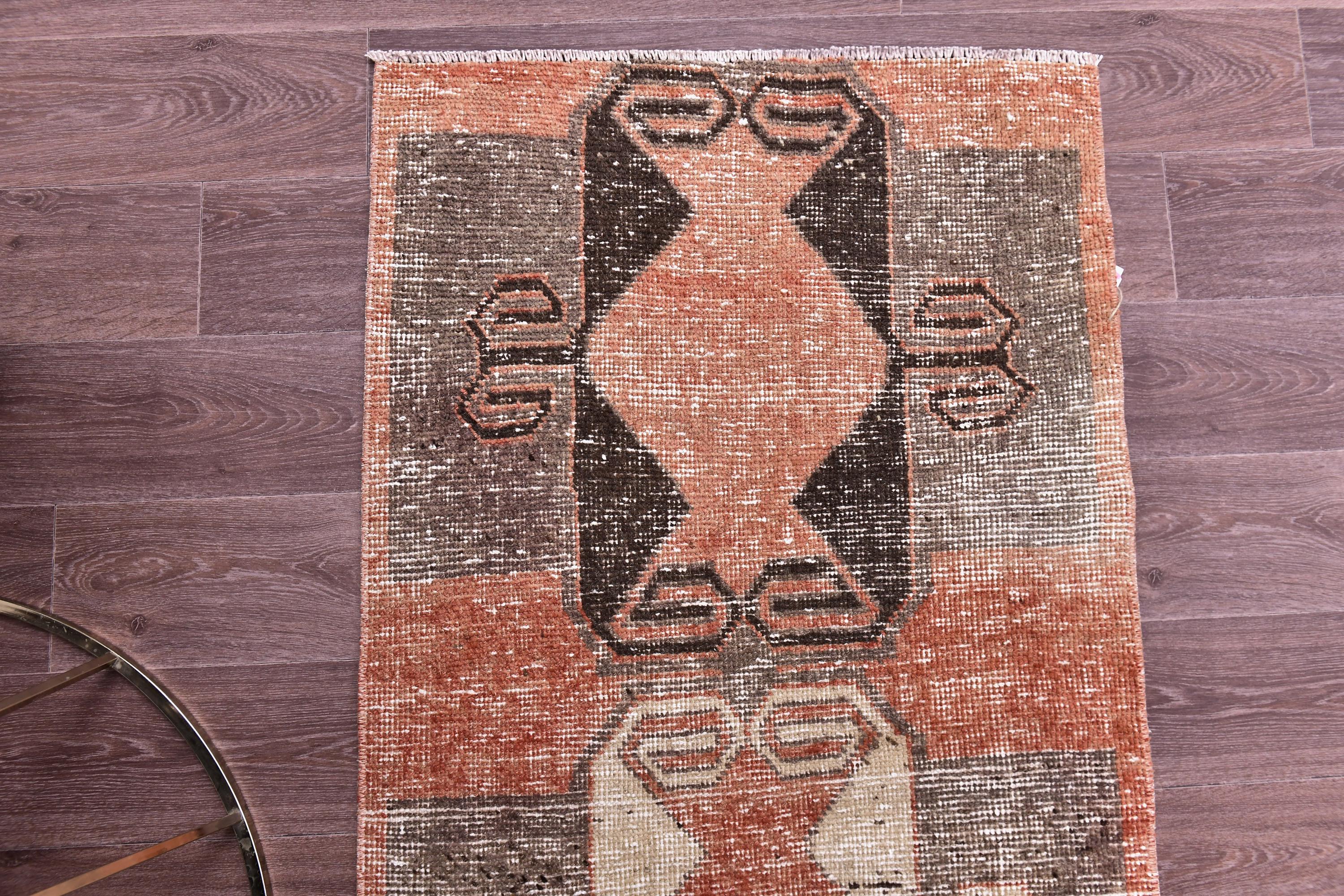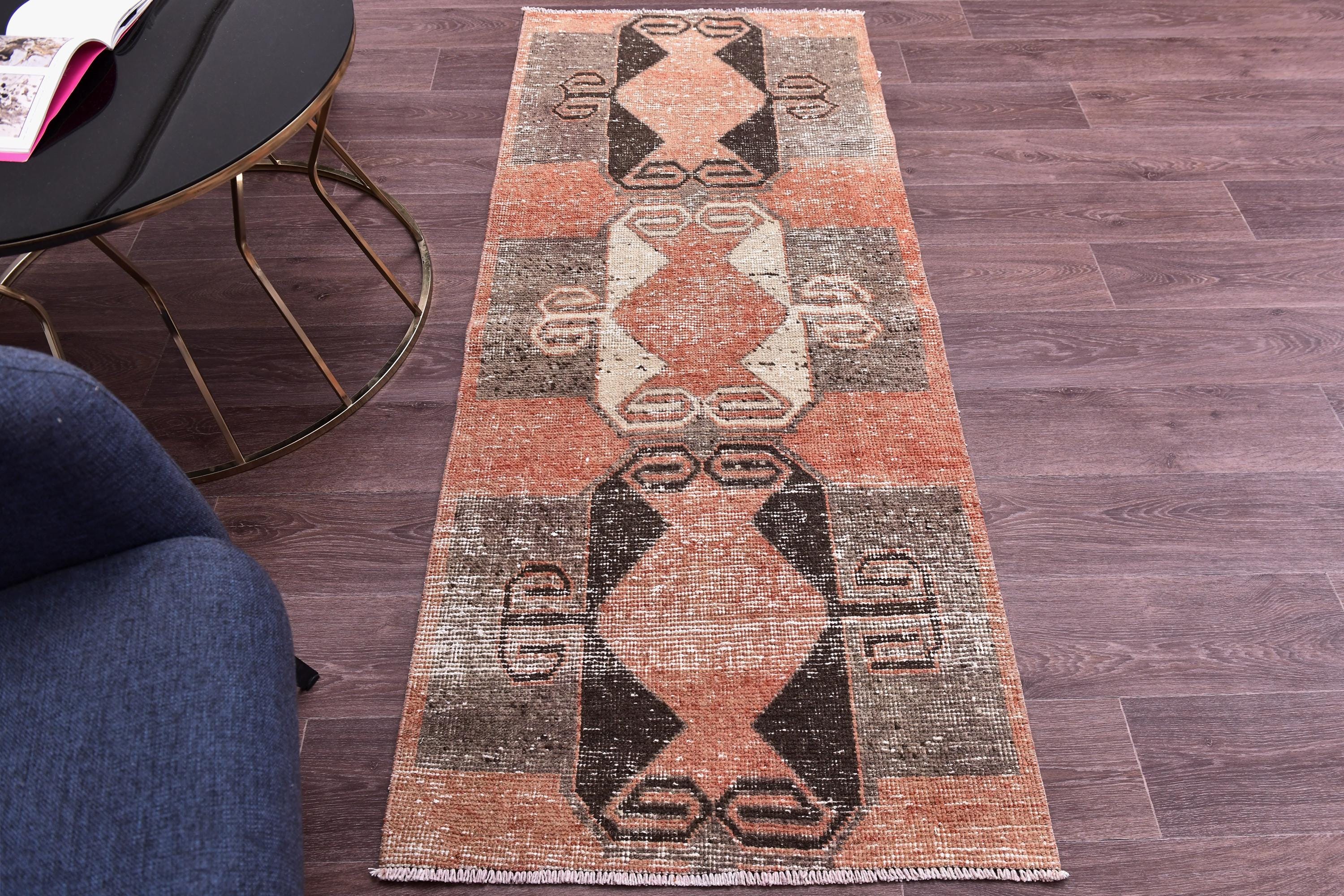 📜📌 Antique hand-knotted Turkish runner rug displaying three repeating diamond medallions in muted coral, cream, and charcoal gray. Distressed vintage Anatolian wool runner with low pile, weathered appearance, and traditional geometric patterns. Ideal for hallways, kitchens, or entryways in modern farmhouse or boho interiors.