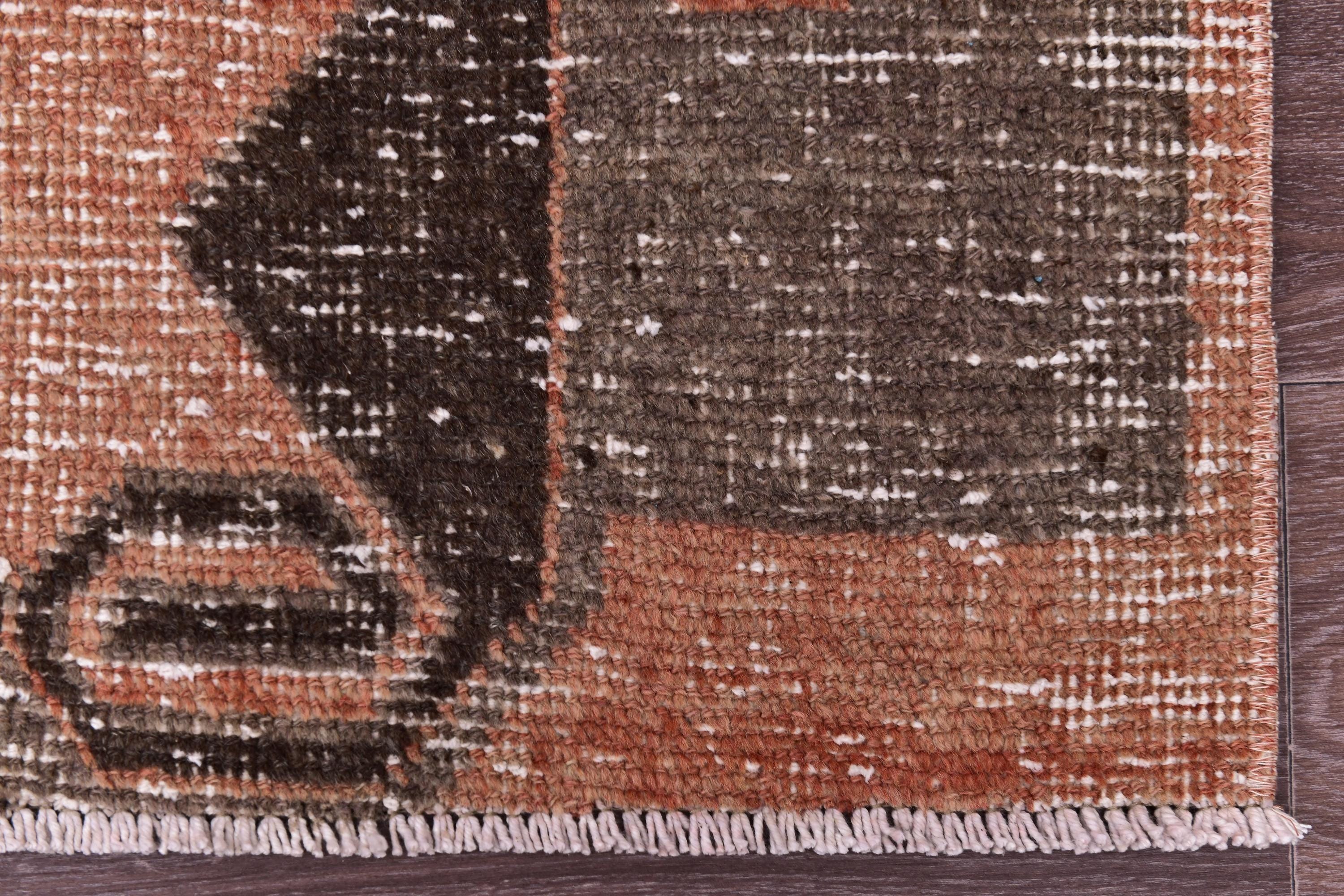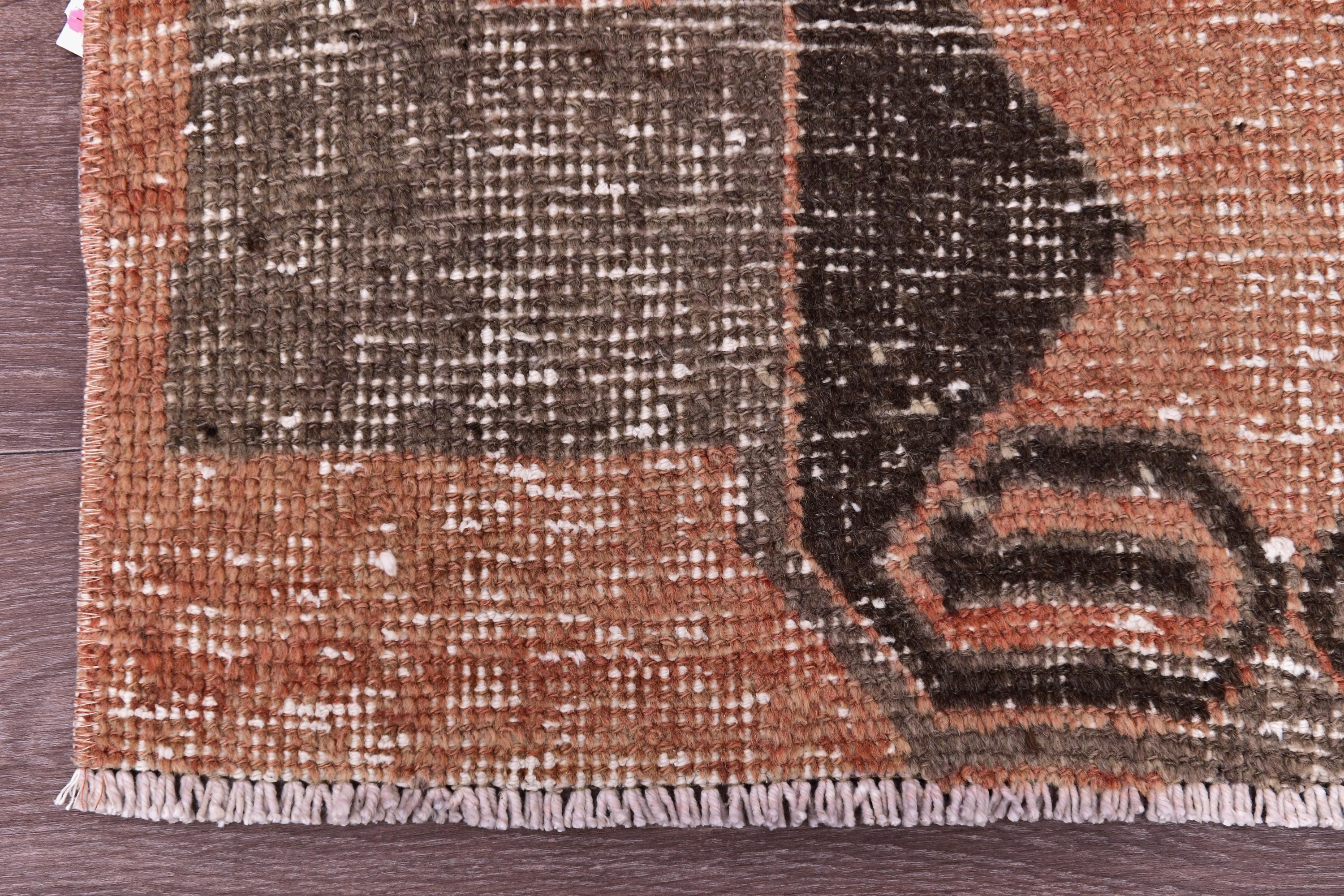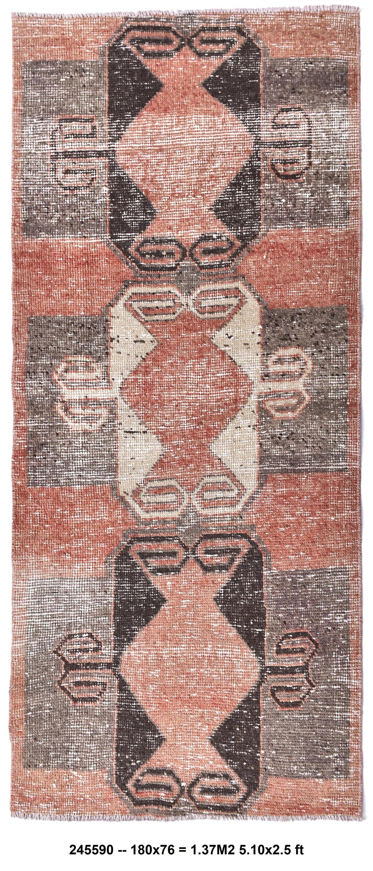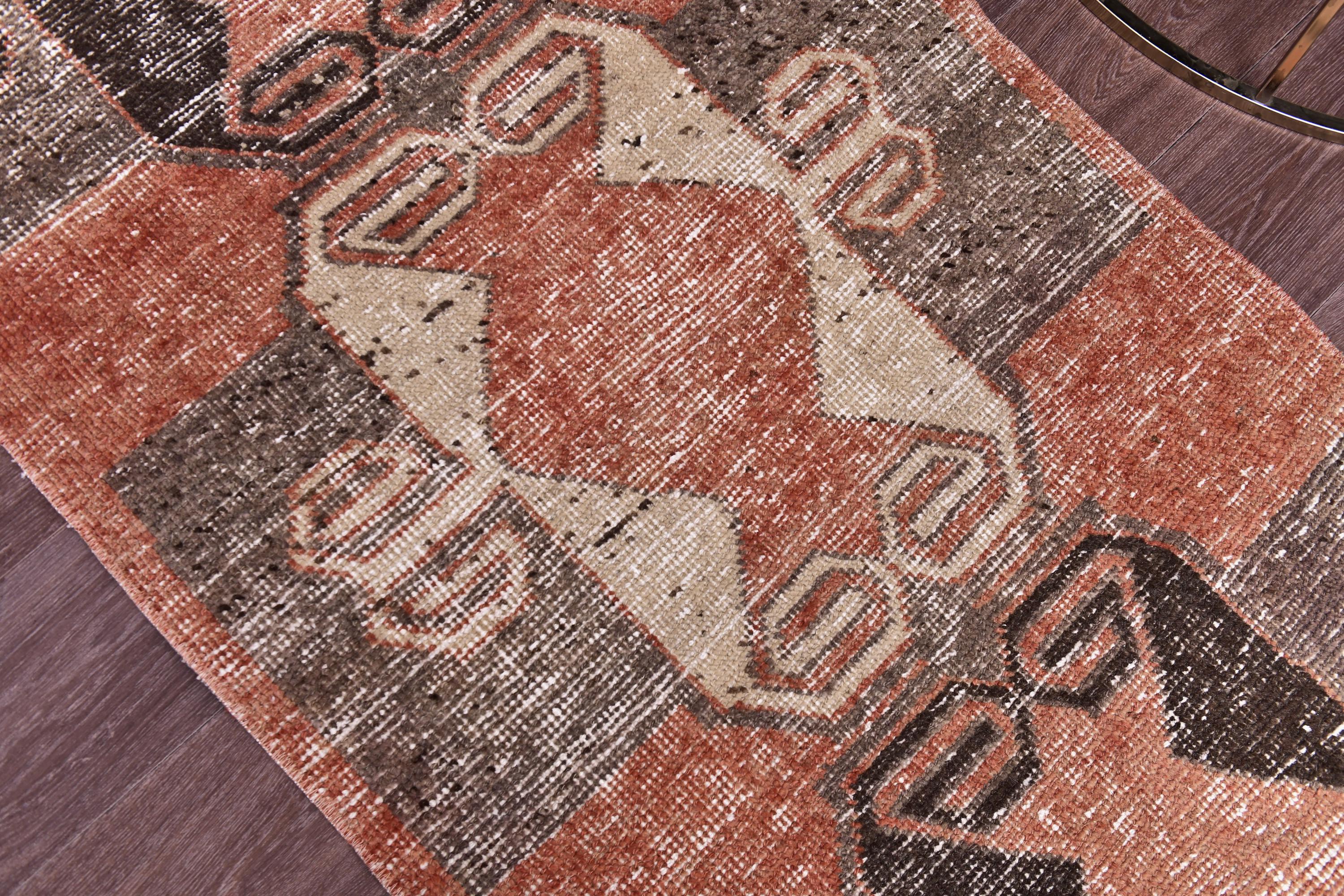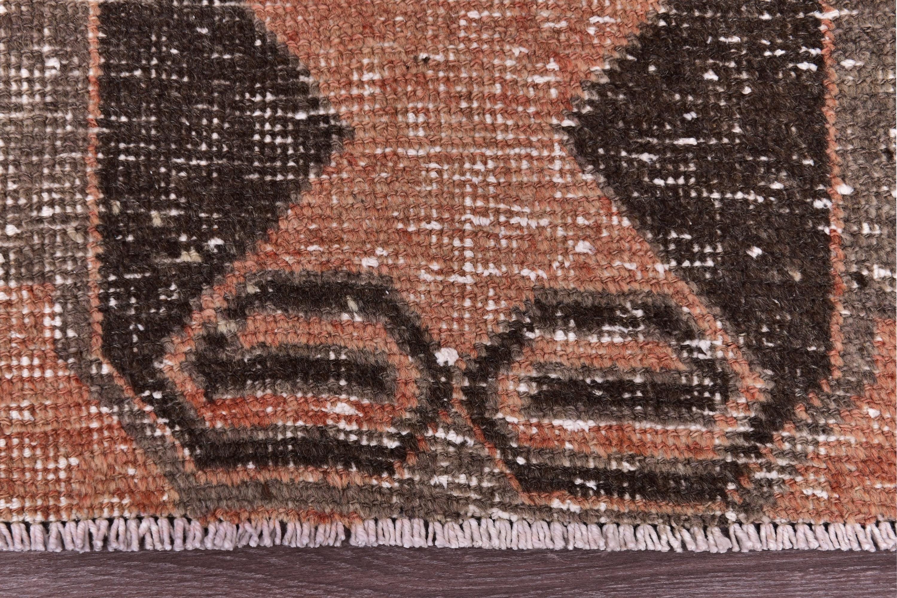 📜📌 Antique hand-knotted Turkish runner rug displaying three repeating diamond medallions in muted coral, cream, and charcoal gray. Distressed vintage Anatolian wool runner with low pile, weathered appearance, and traditional geometric patterns. Ideal for hallways, kitchens, or entryways in modern farmhouse or boho interiors.