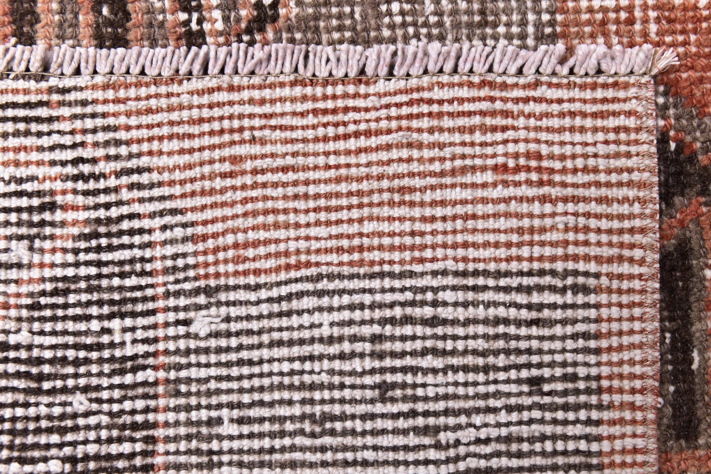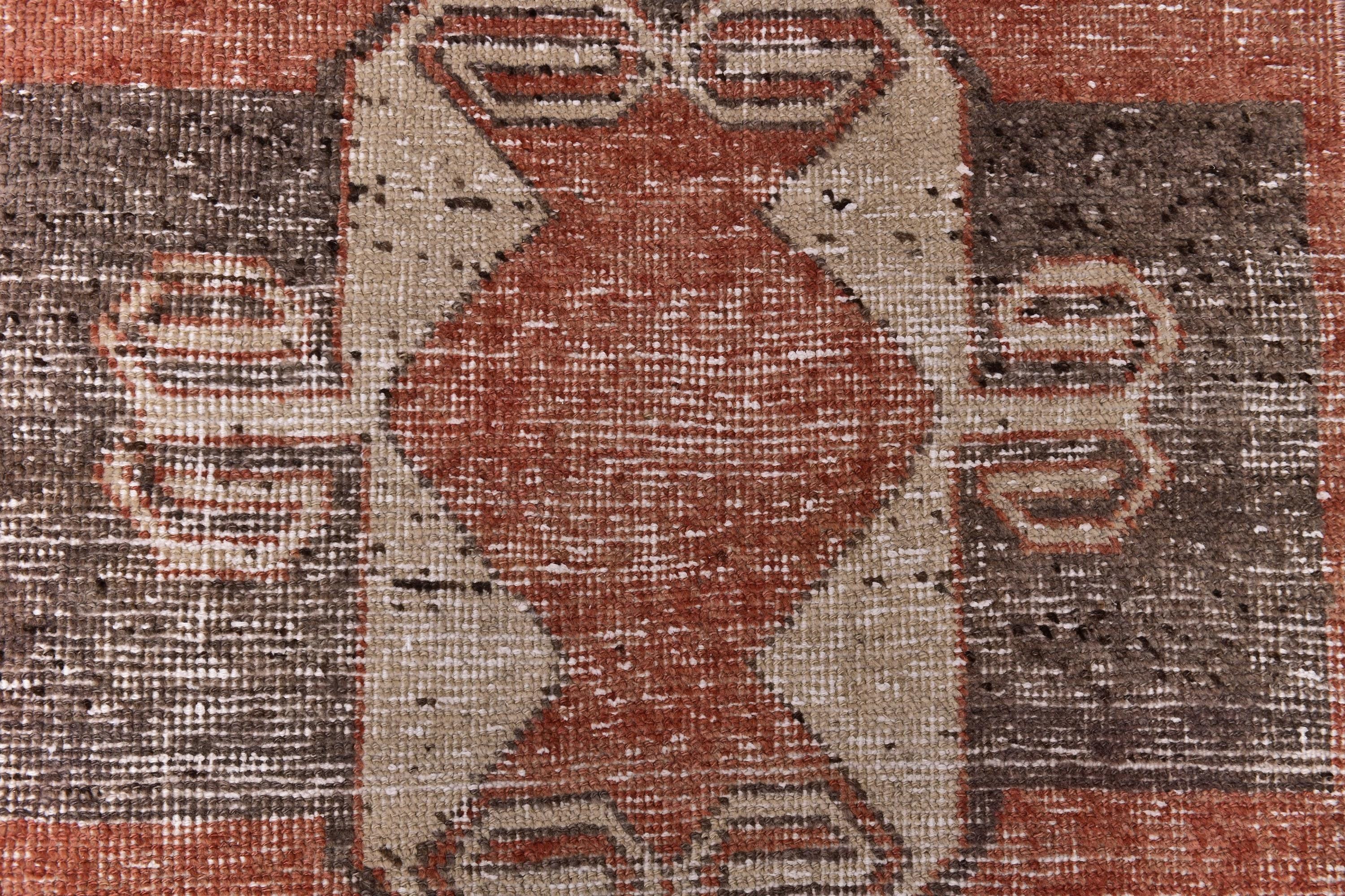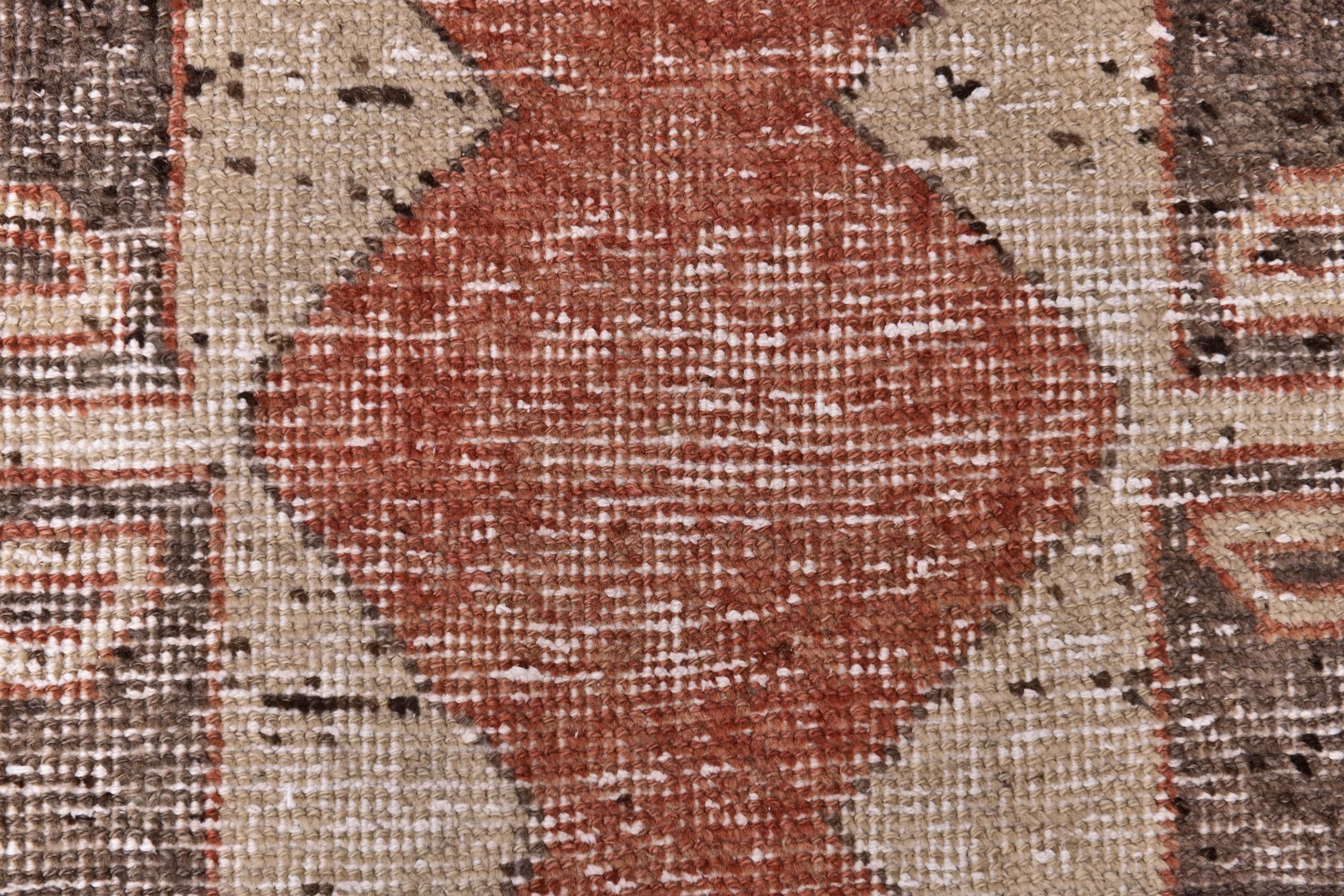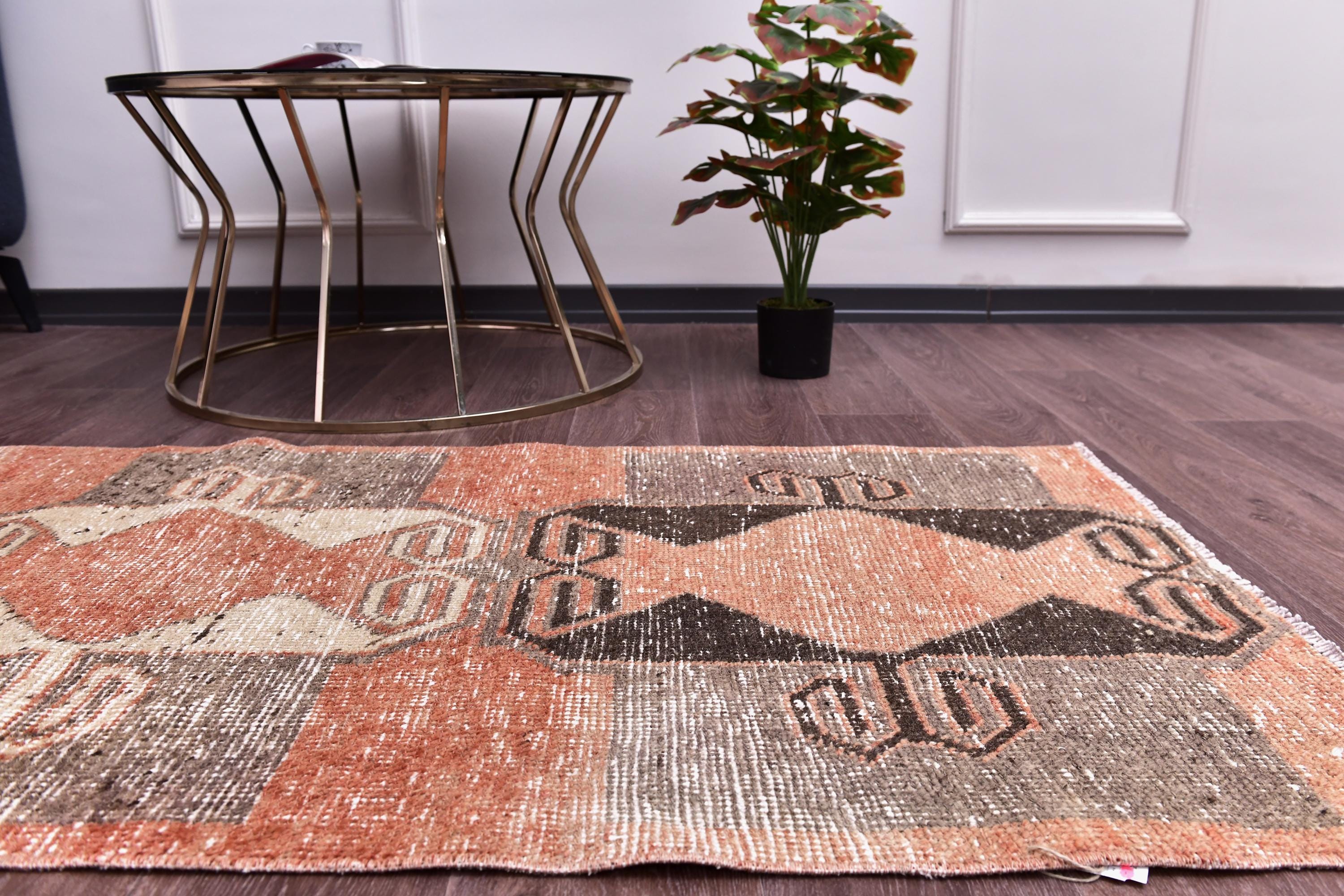 📜📌 Antique hand-knotted Turkish runner rug displaying three repeating diamond medallions in muted coral, cream, and charcoal gray. Distressed vintage Anatolian wool runner with low pile, weathered appearance, and traditional geometric patterns. Ideal for hallways, kitchens, or entryways in modern farmhouse or boho interiors.