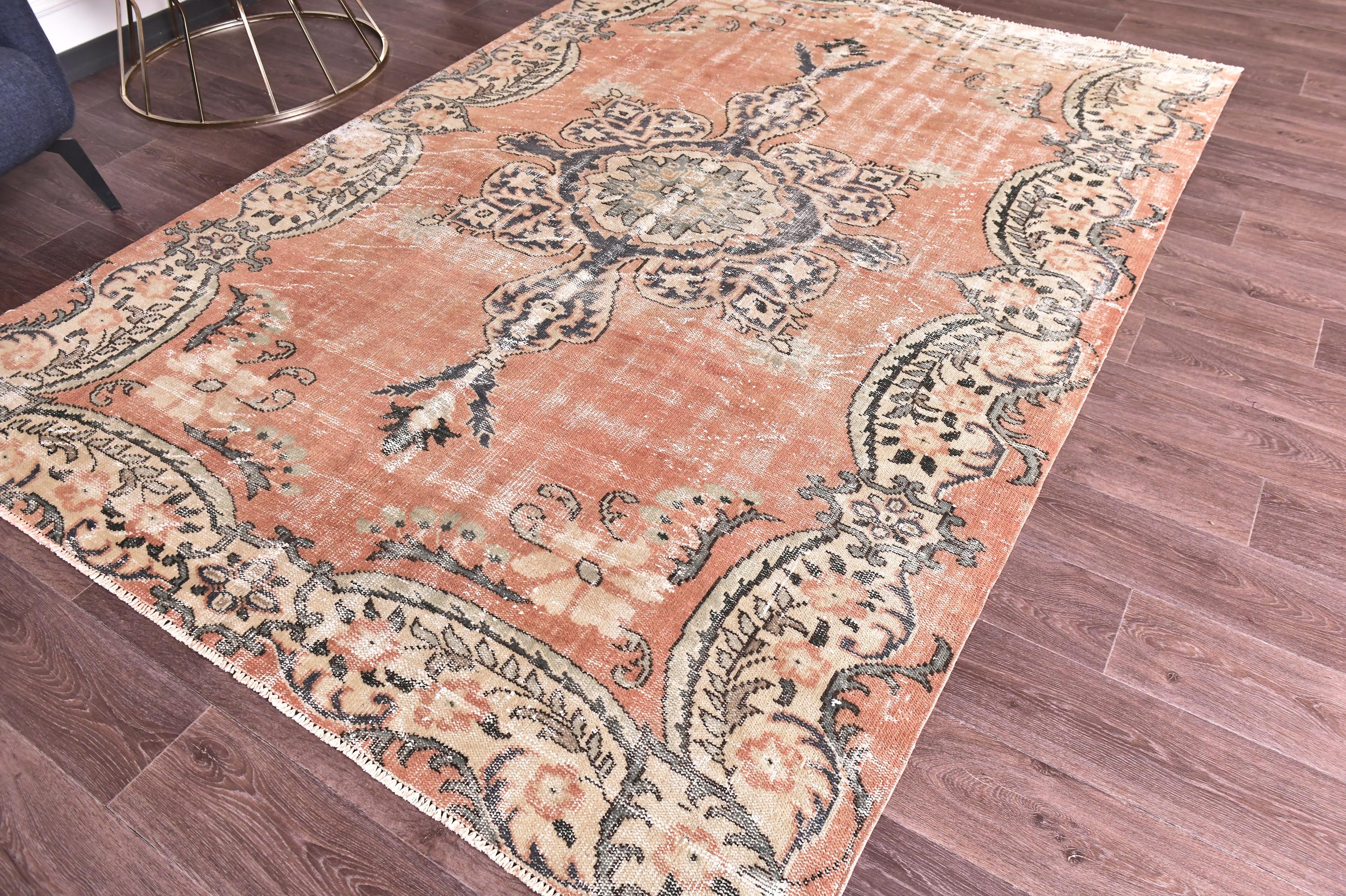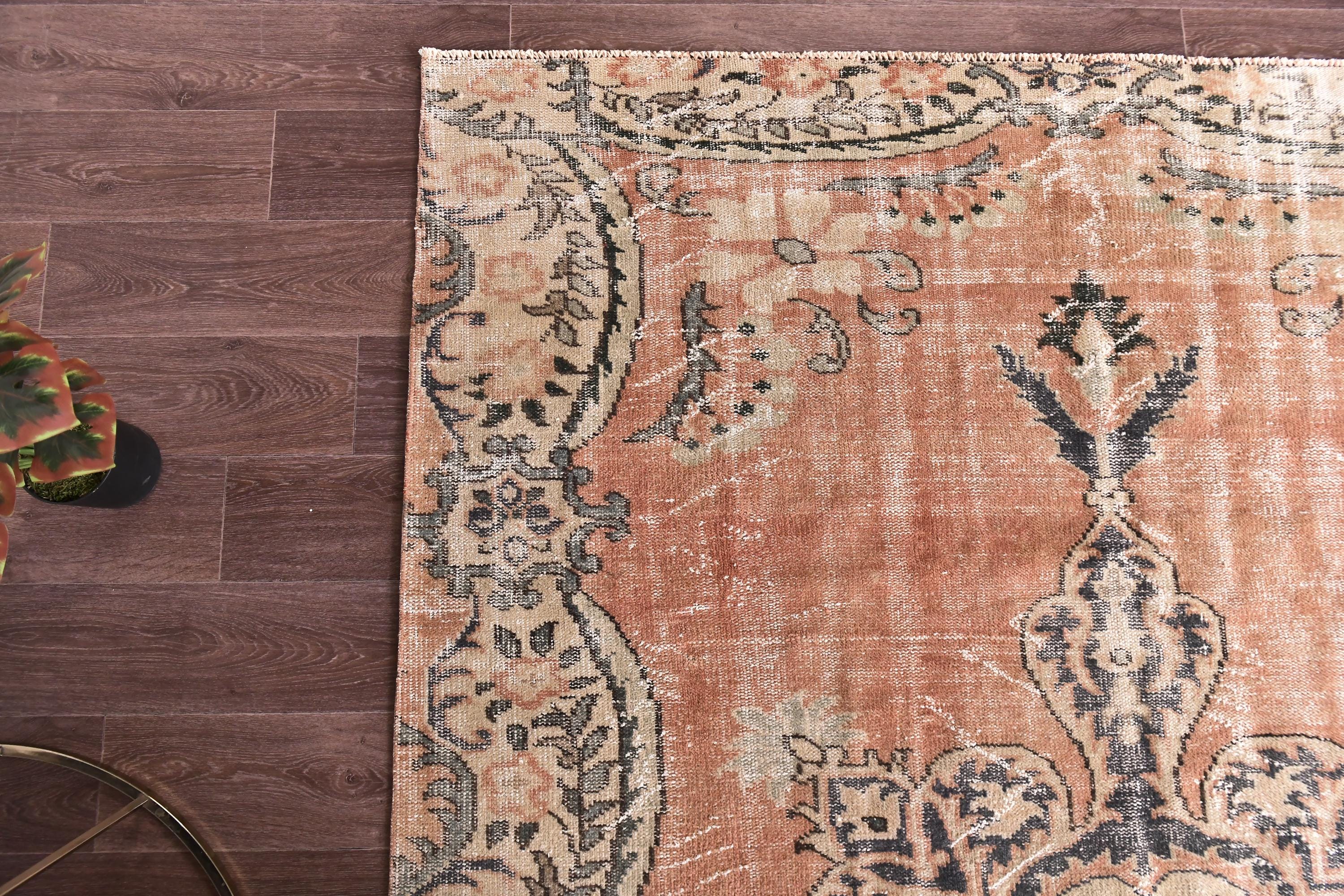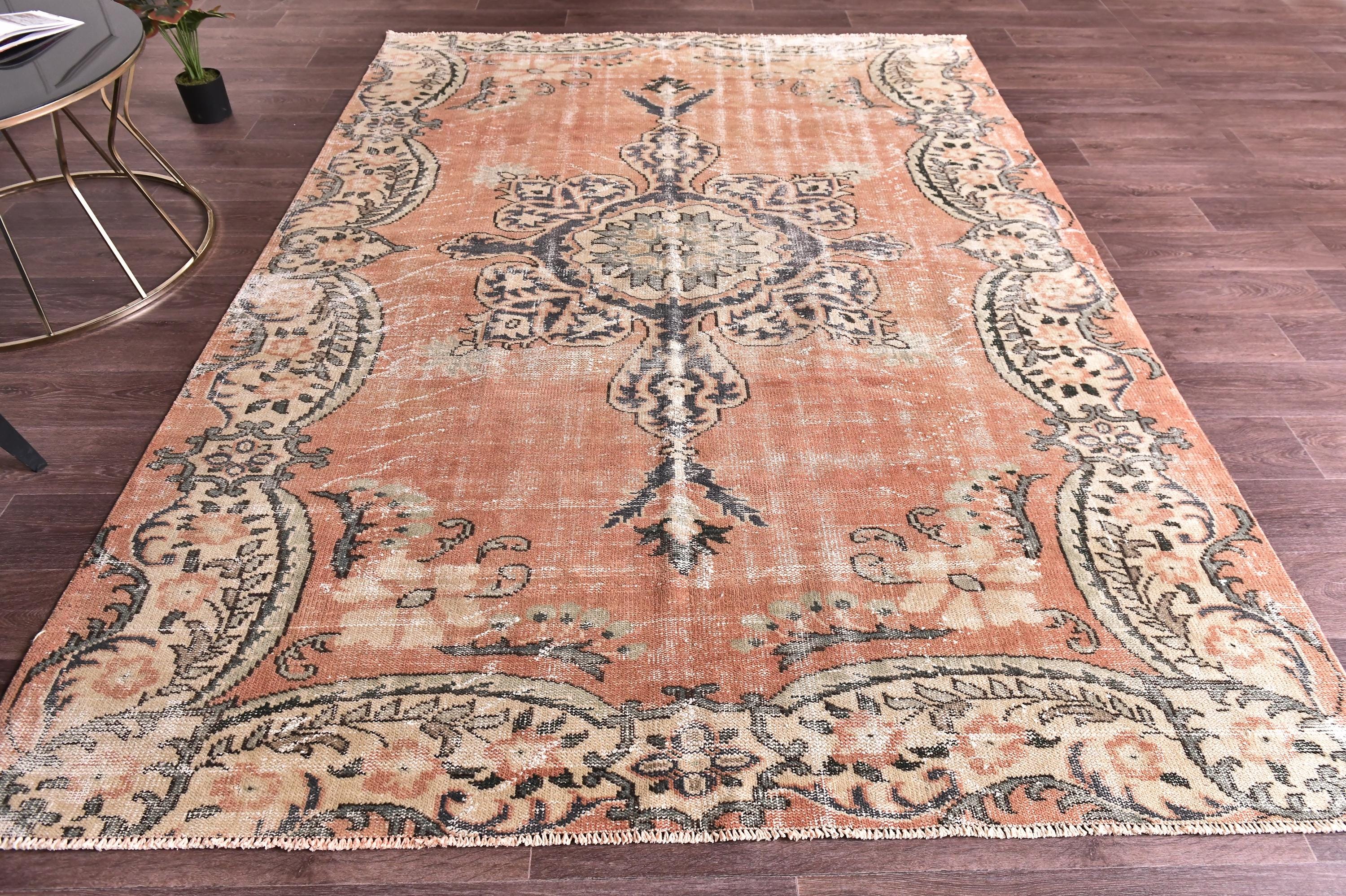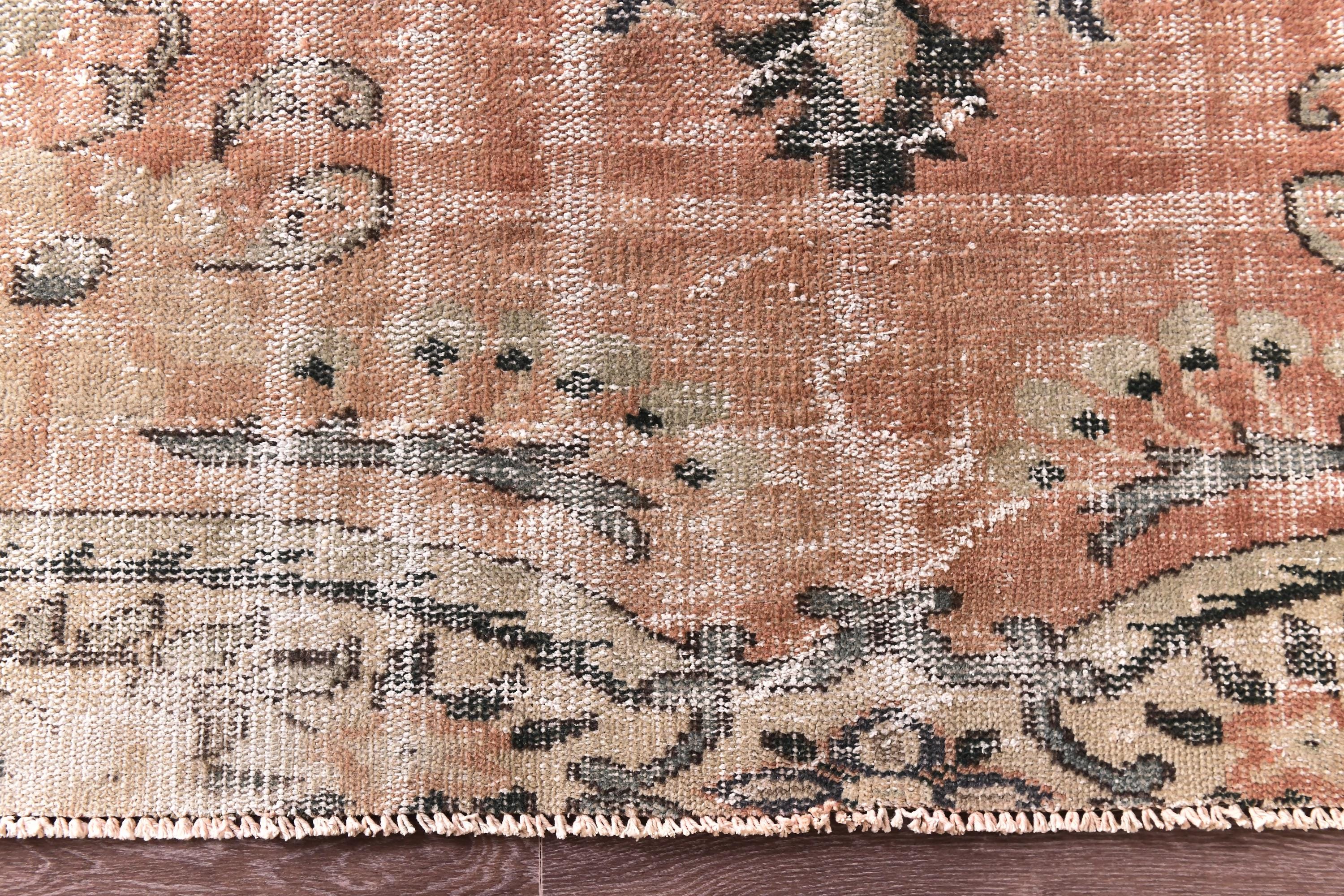 📜📌 Antique Turkish area rug displaying bold rust-orange background with elaborate ivory medallion design and charcoal gray accents. Handwoven wool Oushak-style carpet with traditional floral and vine motifs, worn texture, and naturally faded colors. Classic Oriental rug with corner decorations and intricate borders ideal for vintage, boho, or modern farmhouse decor.