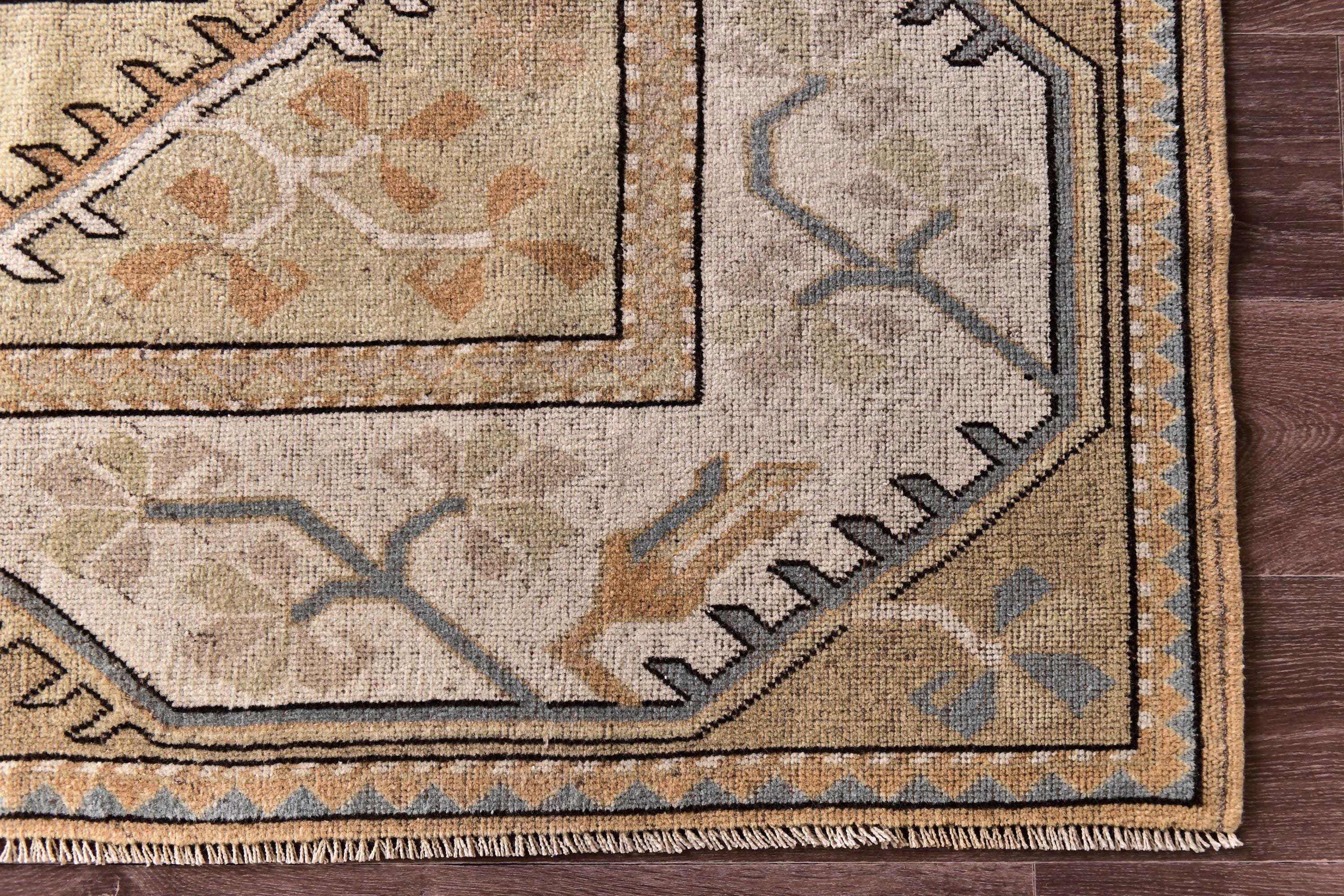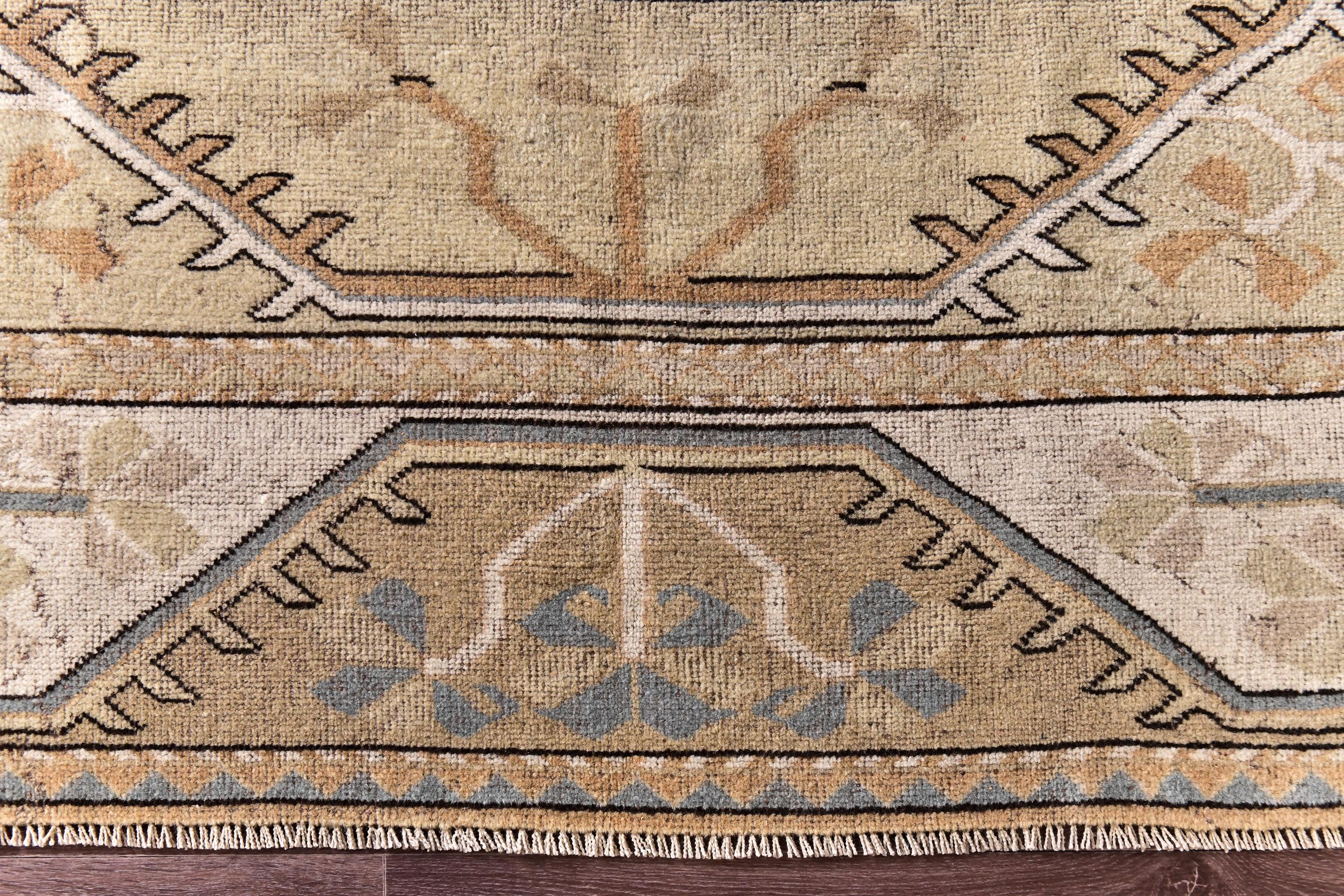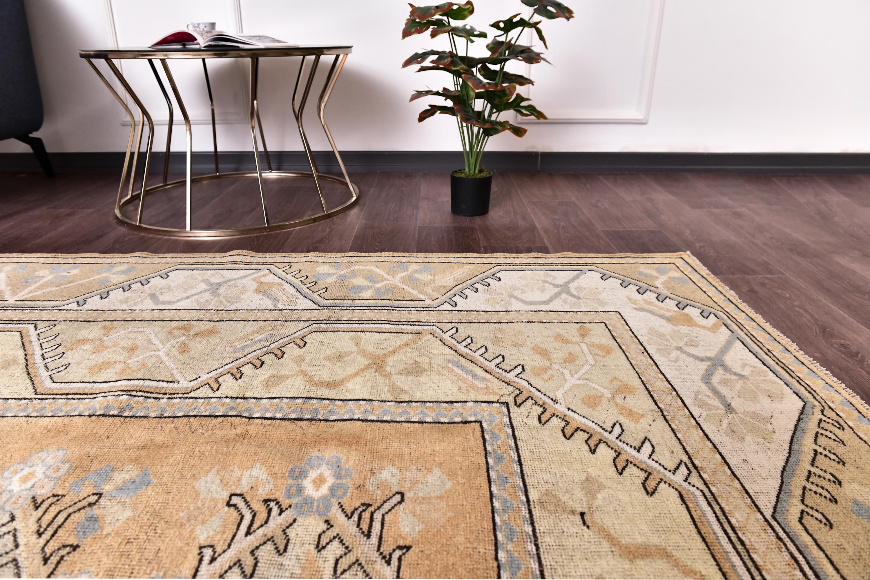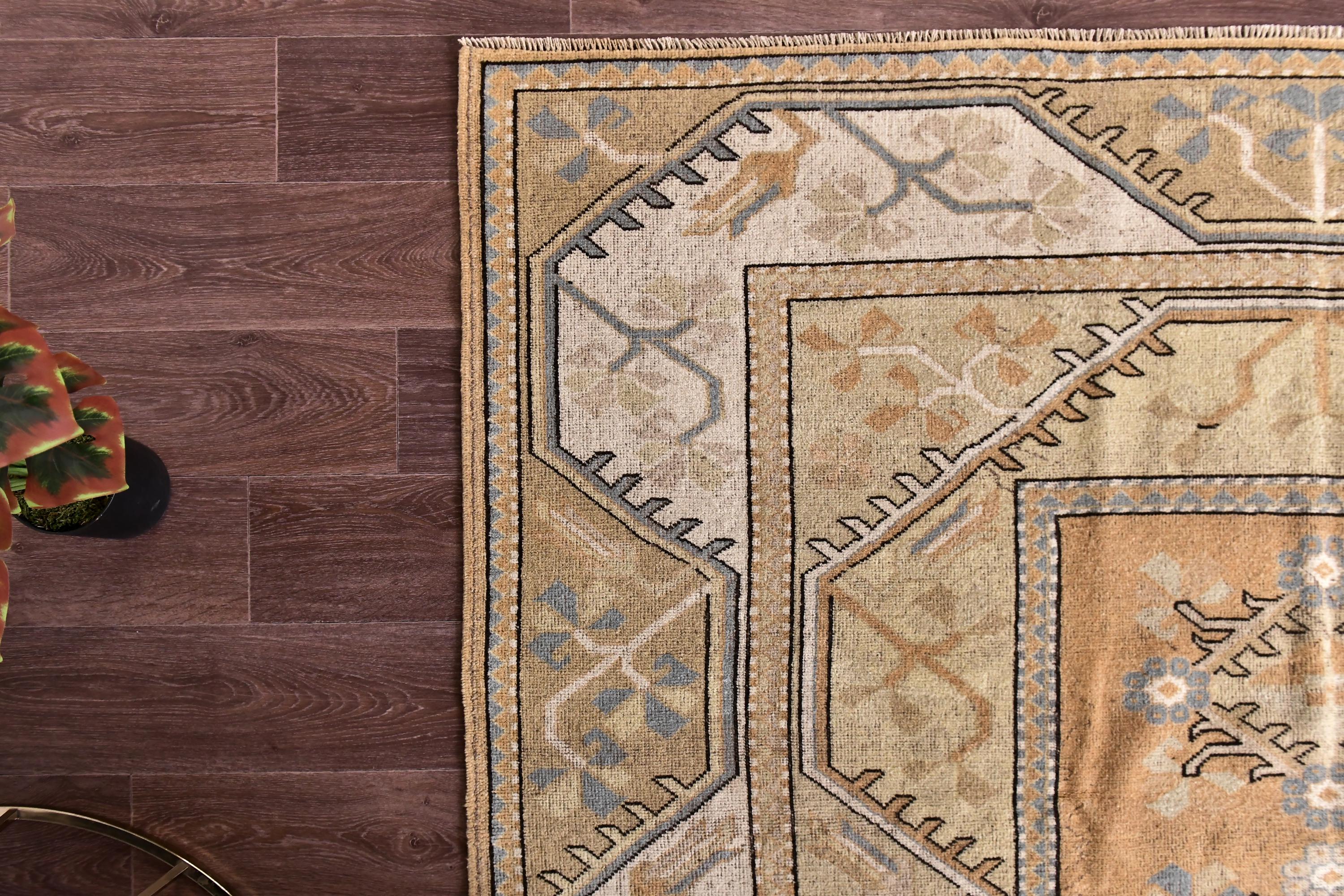 📜📌Vintage Turkish Oushak area rug featuring warm neutral color palette with camel beige, golden tan and soft blue gray accents, showcasing traditional Khotan style design with repeating geometric medallions in center field, wide decorative borders with tribal motifs, hand-knotted wool construction with naturally faded pile perfect for modern bohemian and transitional interiors