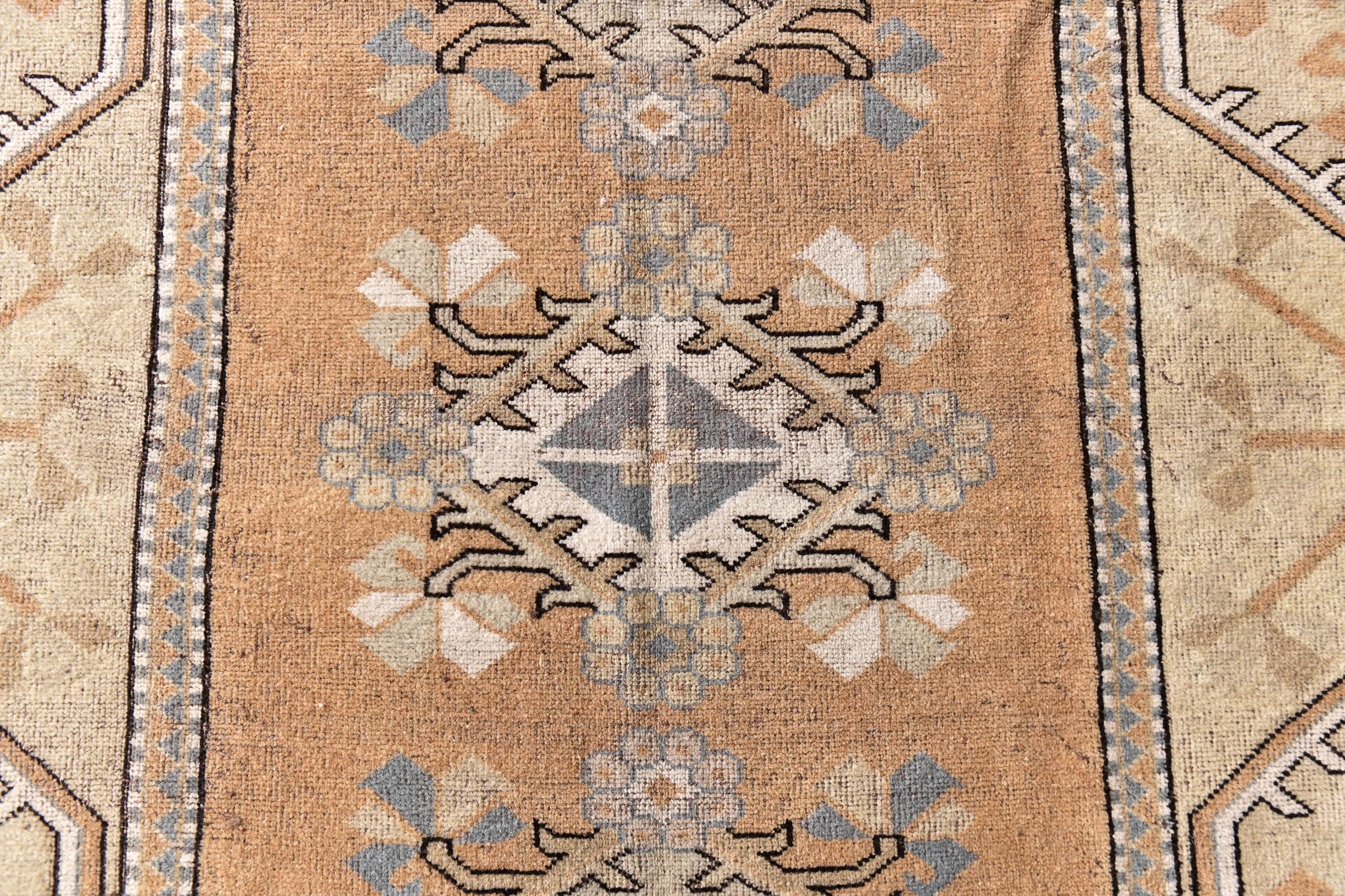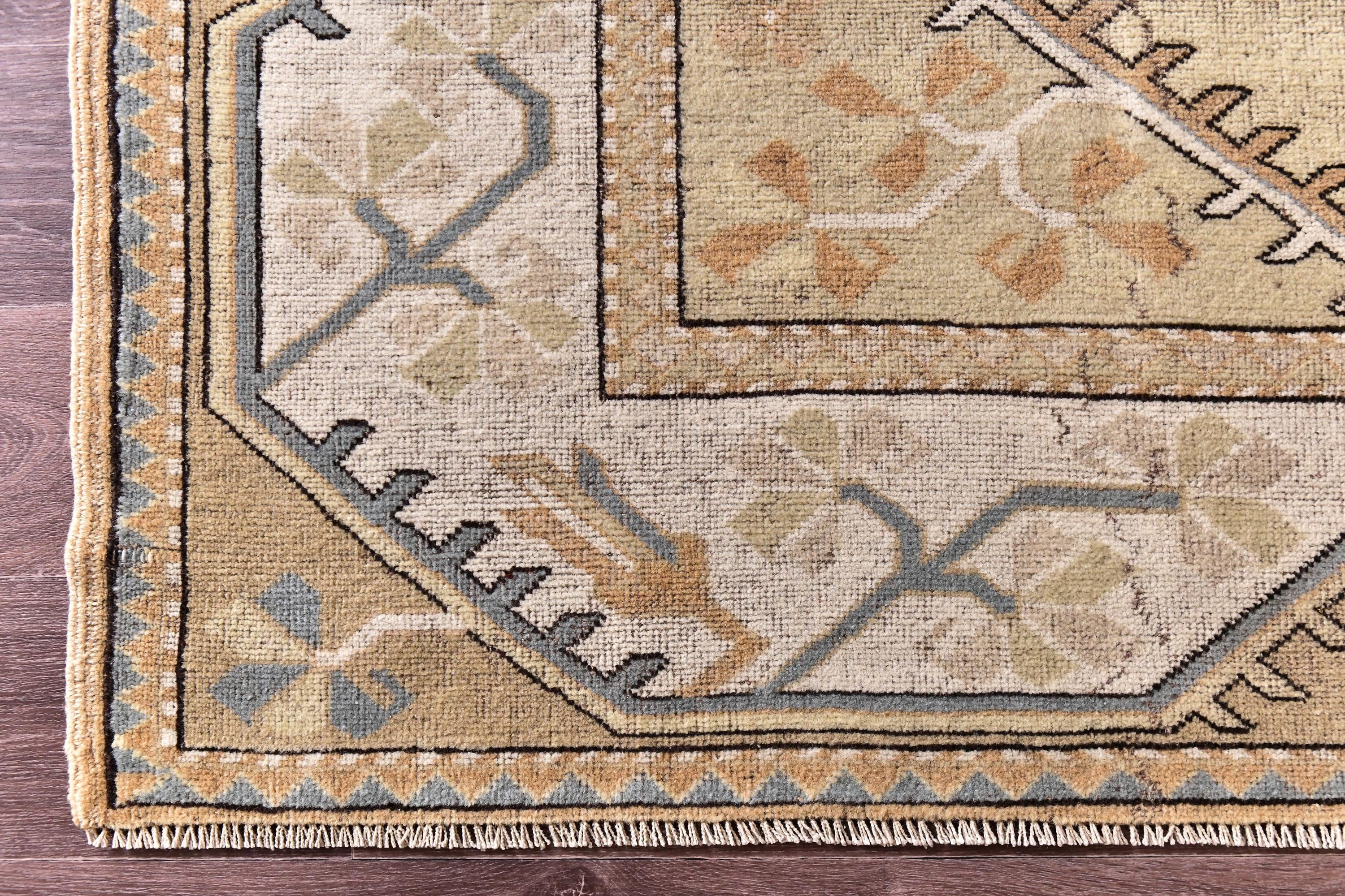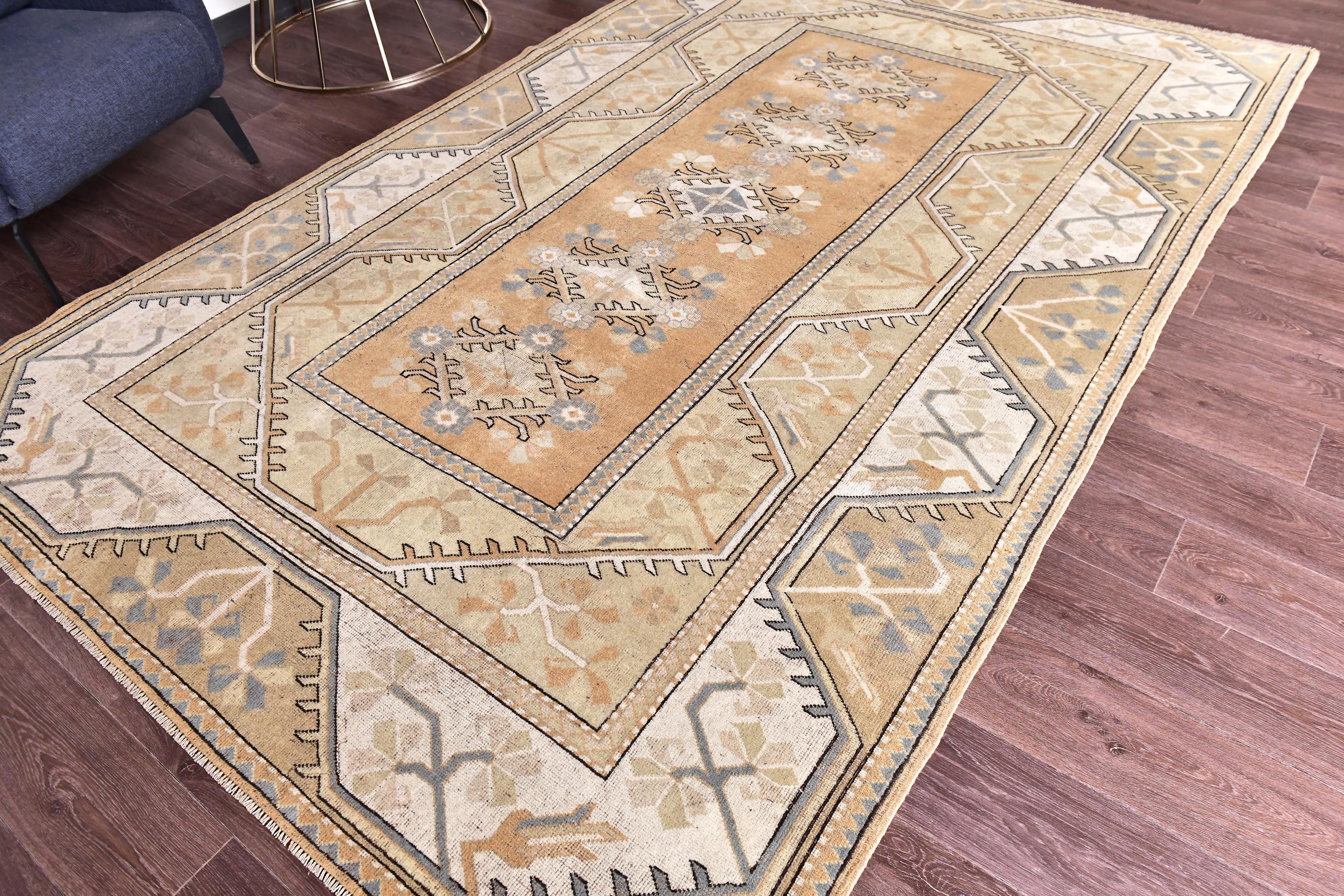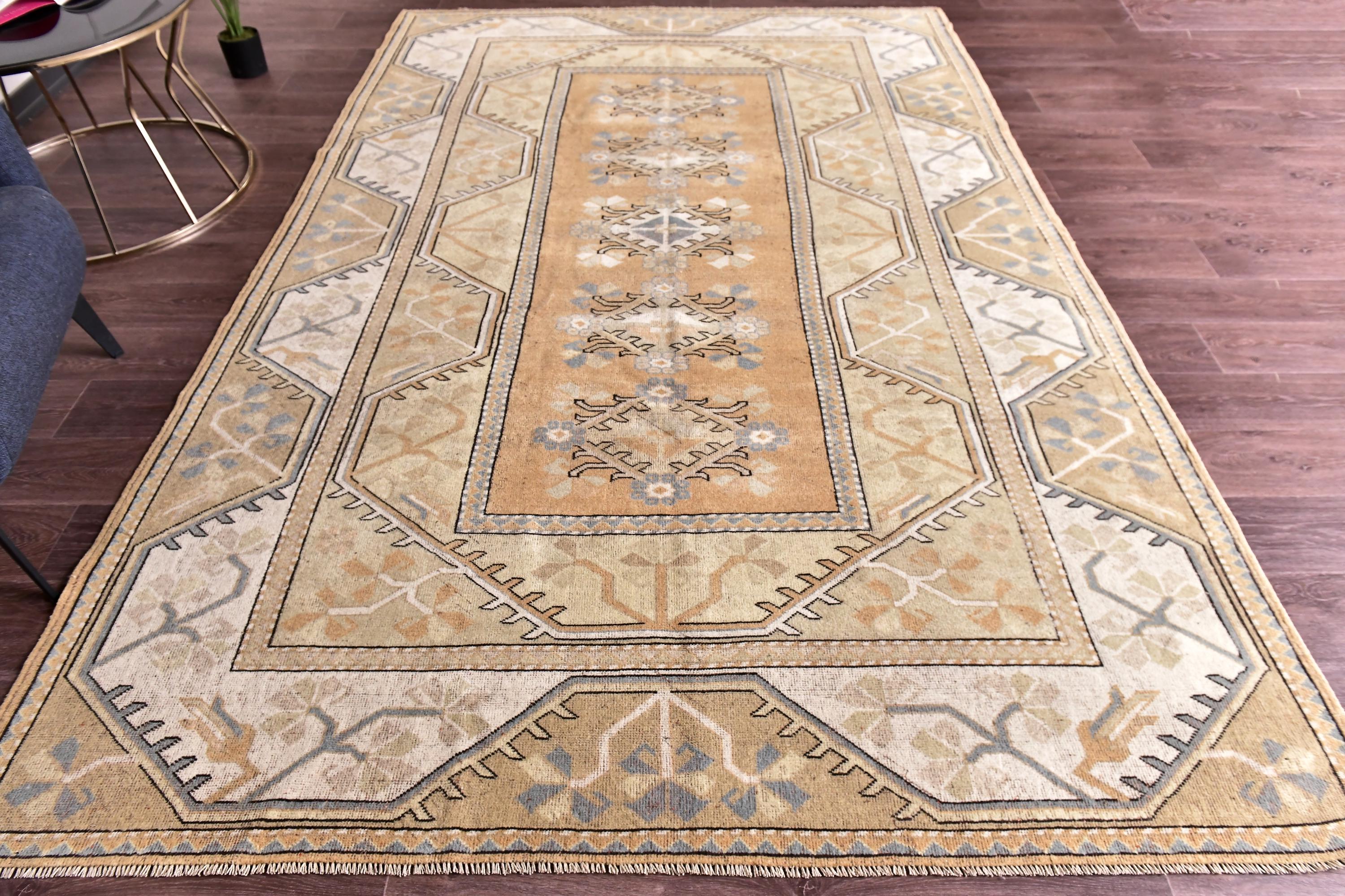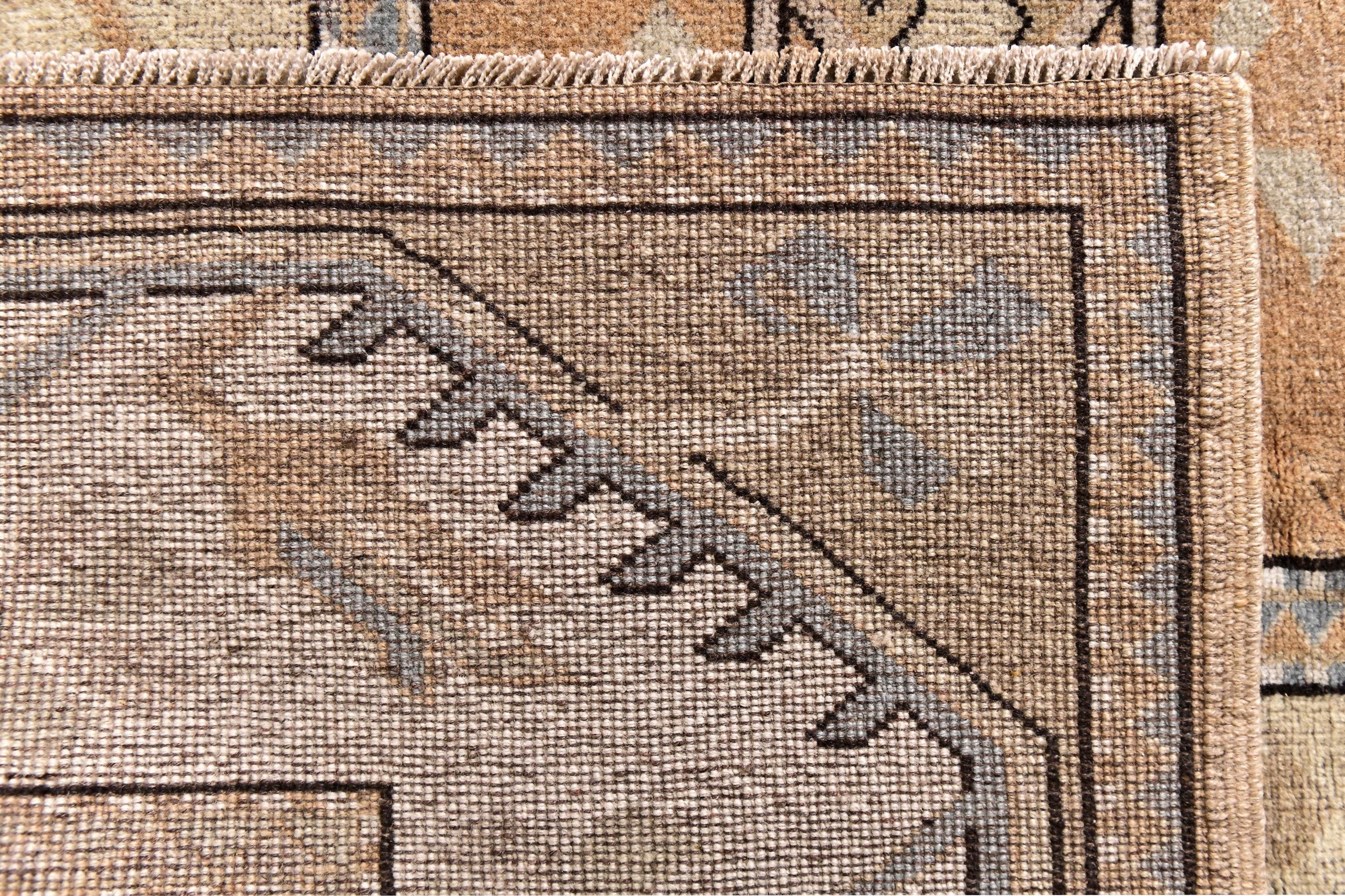 📜📌Vintage Turkish Oushak area rug featuring warm neutral color palette with camel beige, golden tan and soft blue gray accents, showcasing traditional Khotan style design with repeating geometric medallions in center field, wide decorative borders with tribal motifs, hand-knotted wool construction with naturally faded pile perfect for modern bohemian and transitional interiors