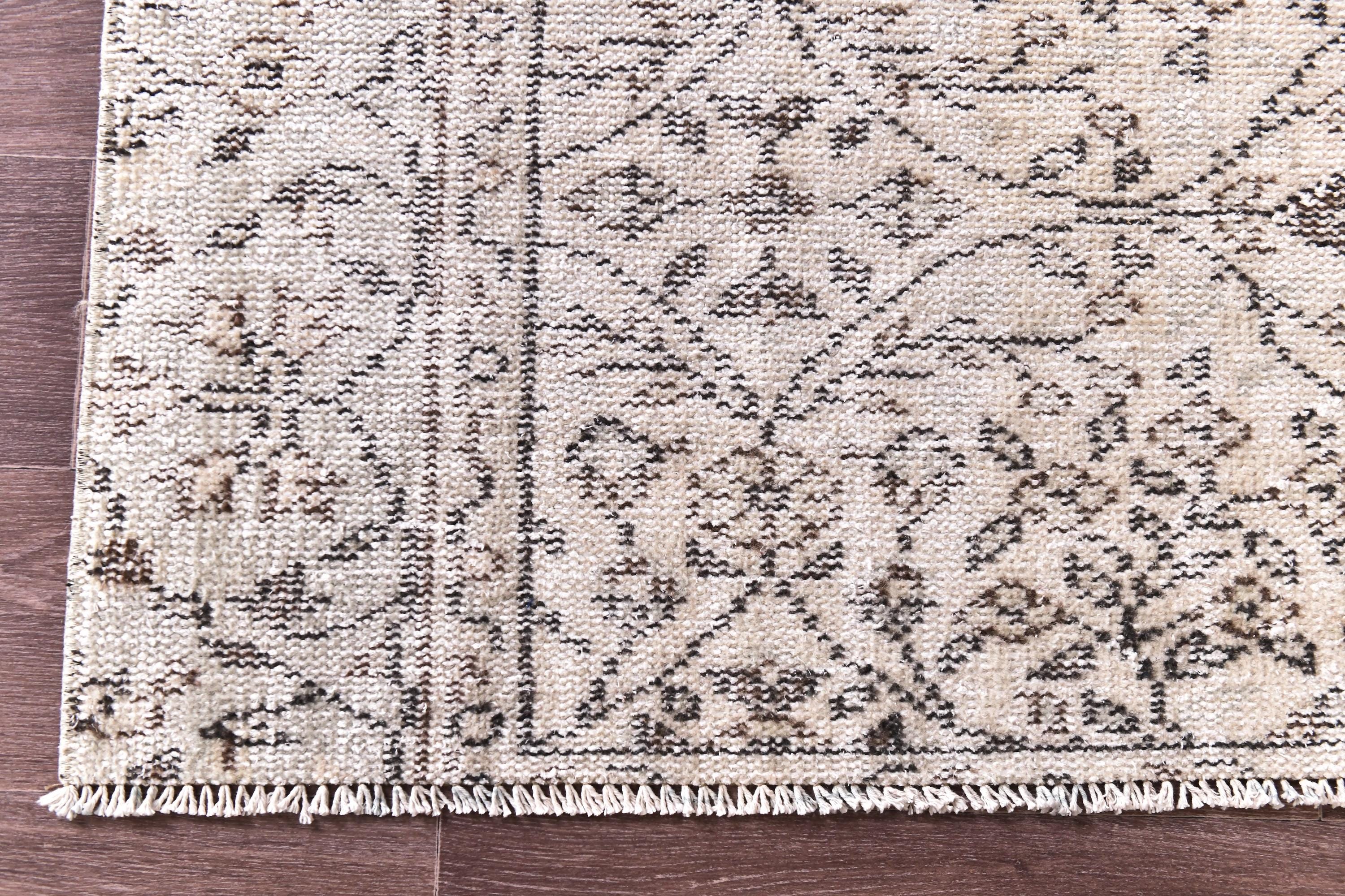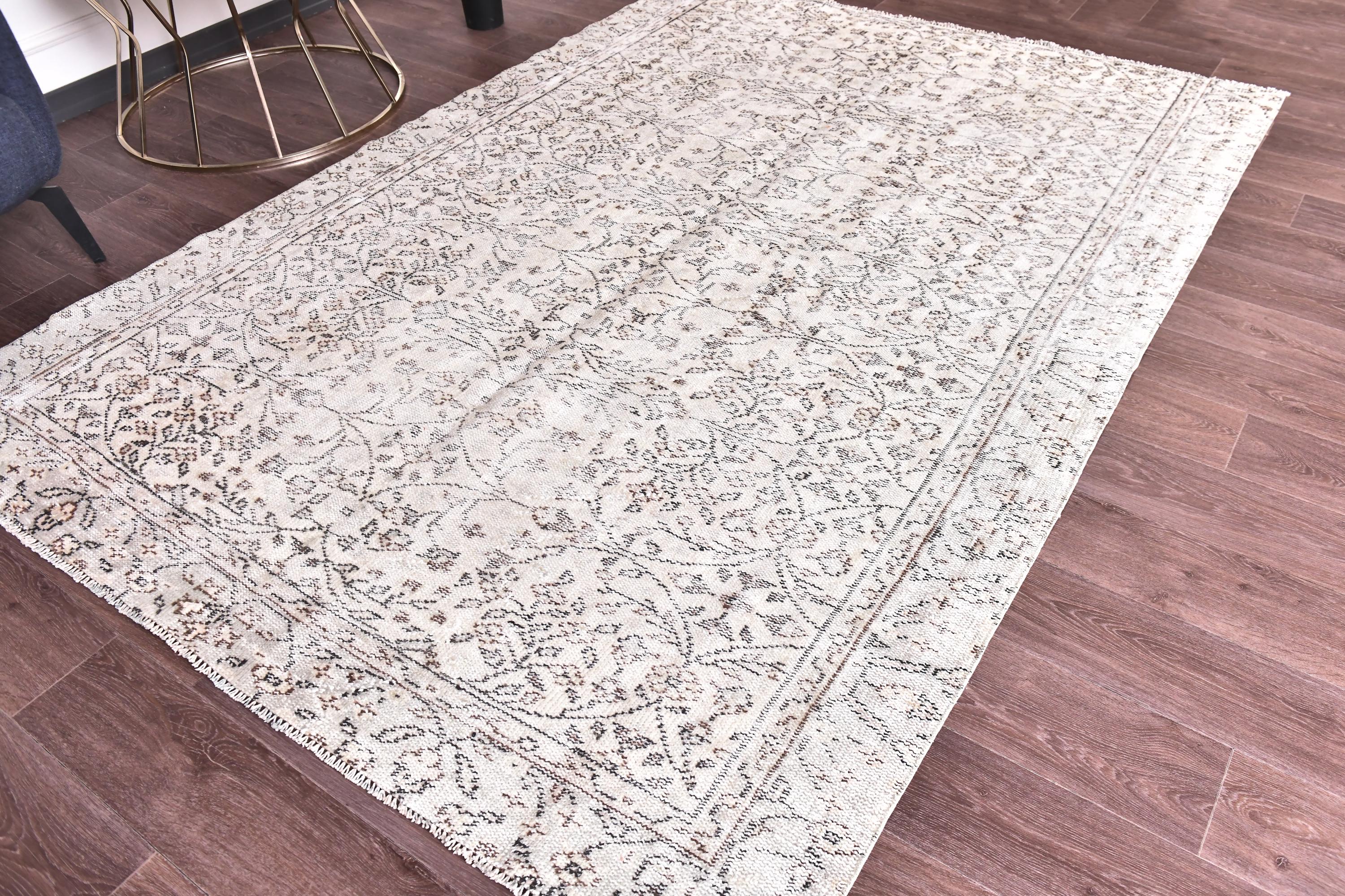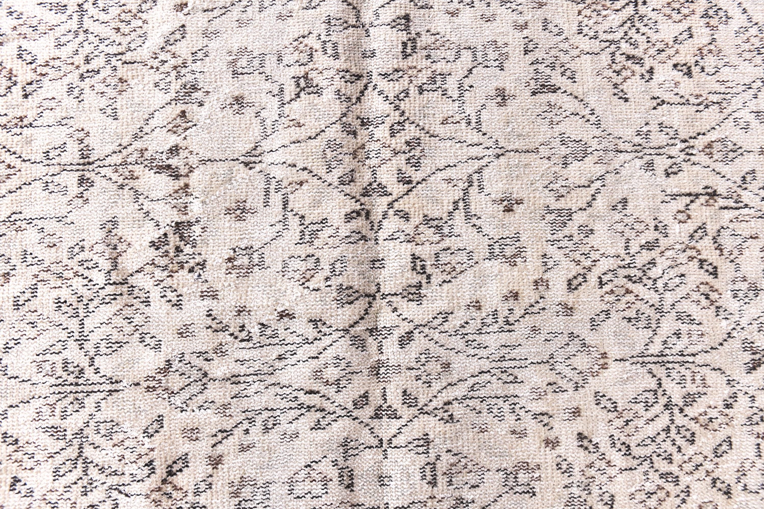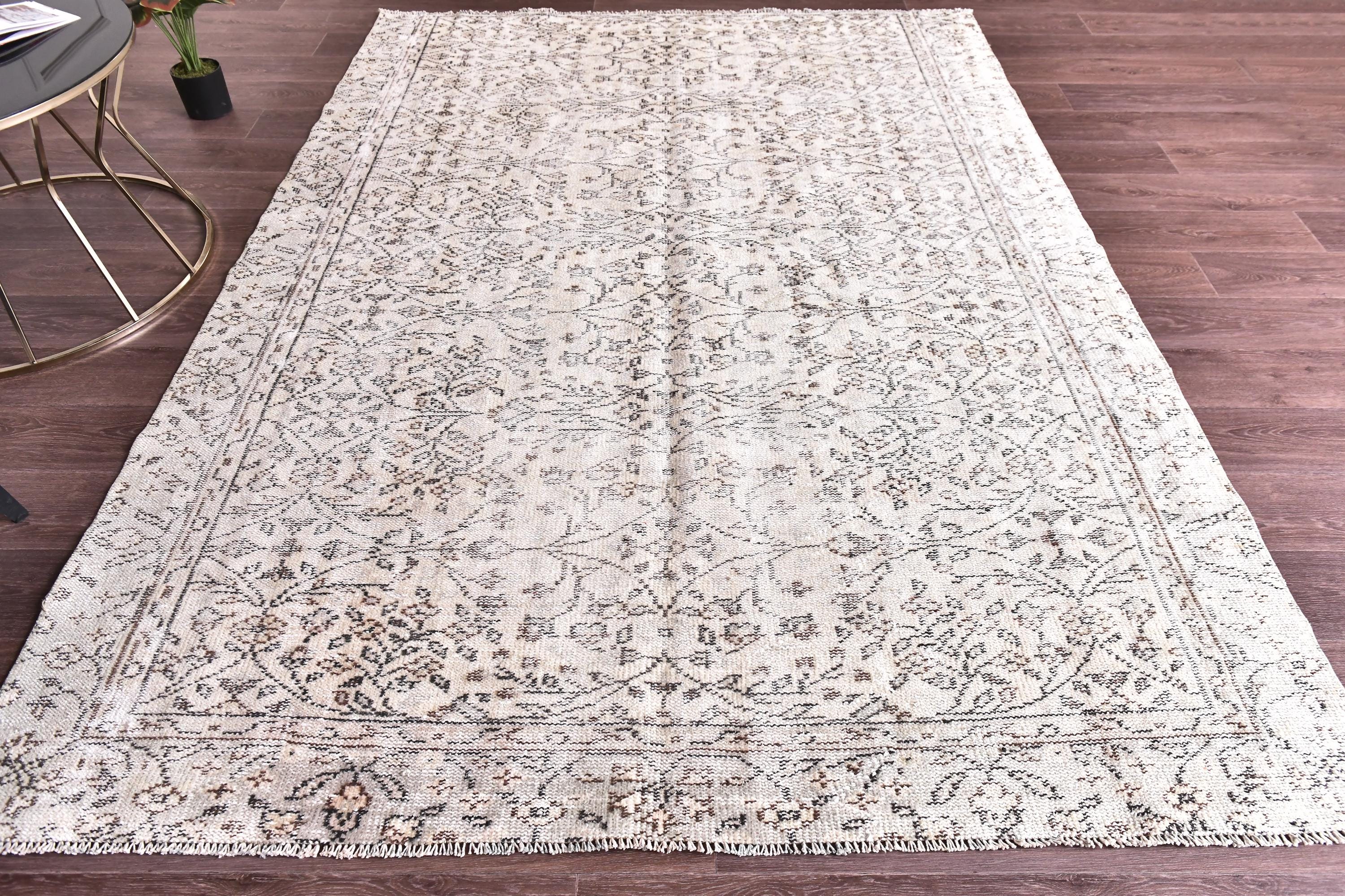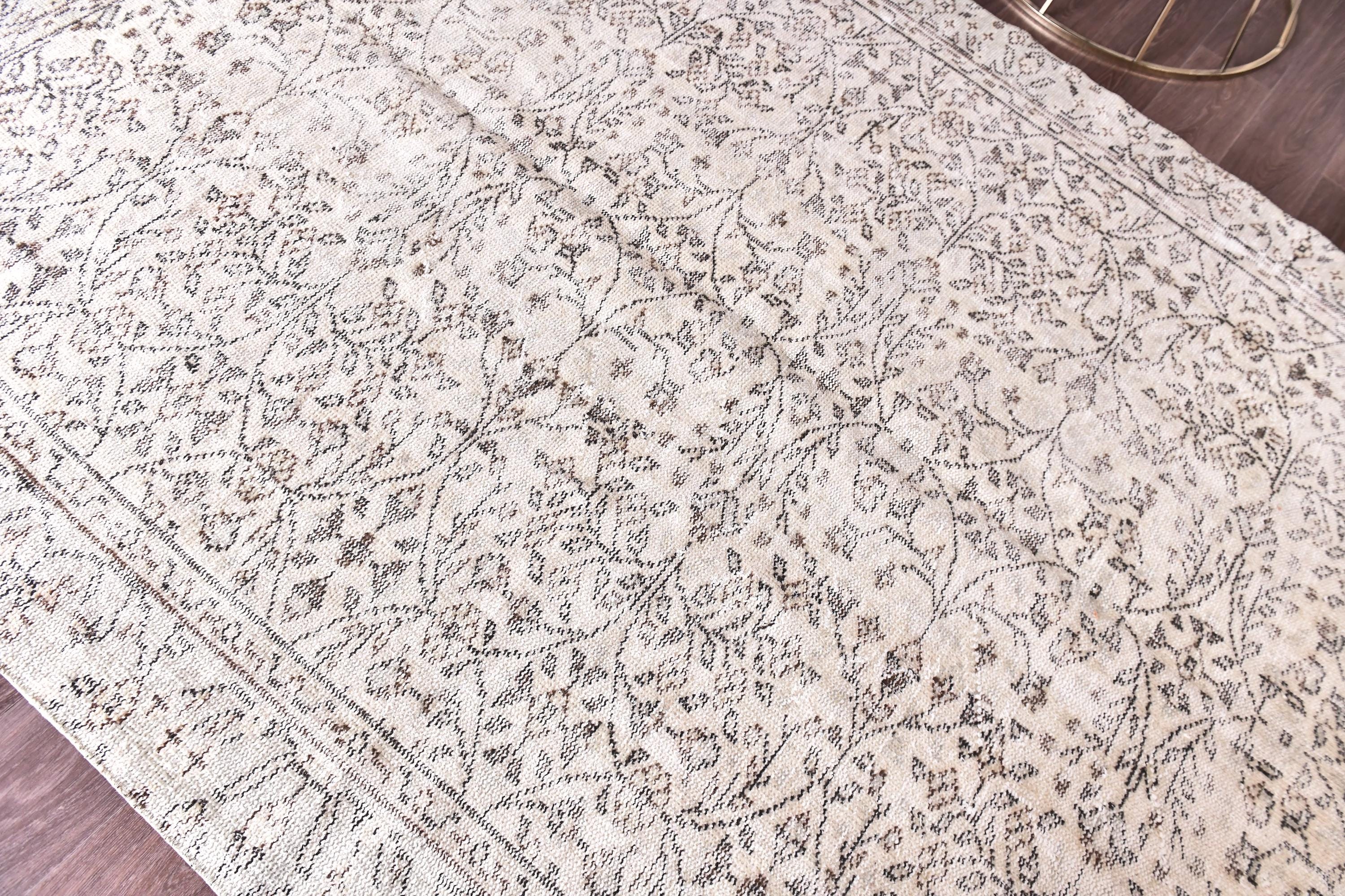 📜📌 Vintage Turkish whitewashed area rug featuring soft neutral palette with ivory cream base and pale gray brown undertones, showcasing traditional center medallion design with intricate floral vine patterns and ornate borders, hand-knotted low pile wool with intentionally faded whitewash treatment creating light airy appearance, perfect versatile foundation piece for shabby chic, modern farmhouse and coastal inspired interiors