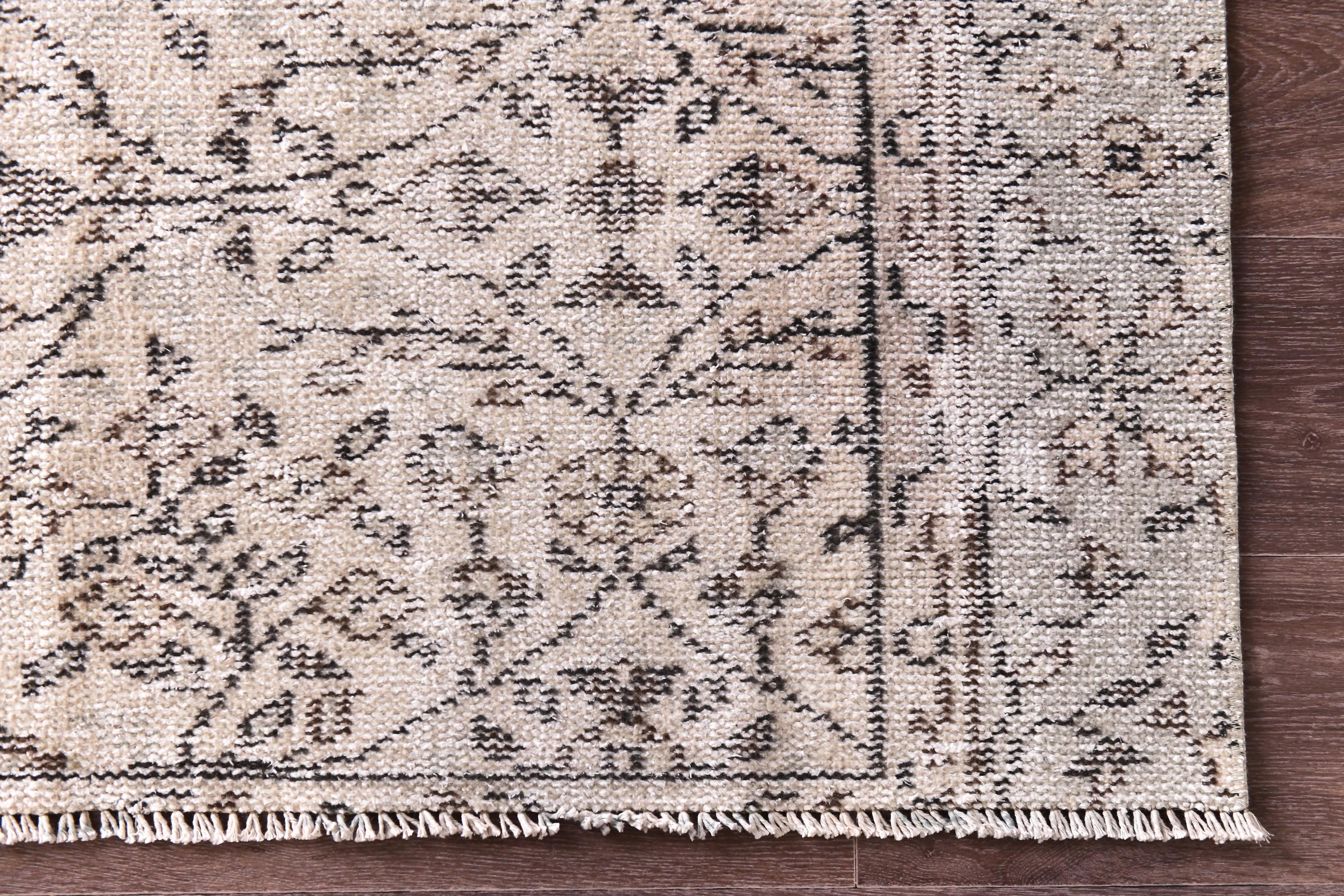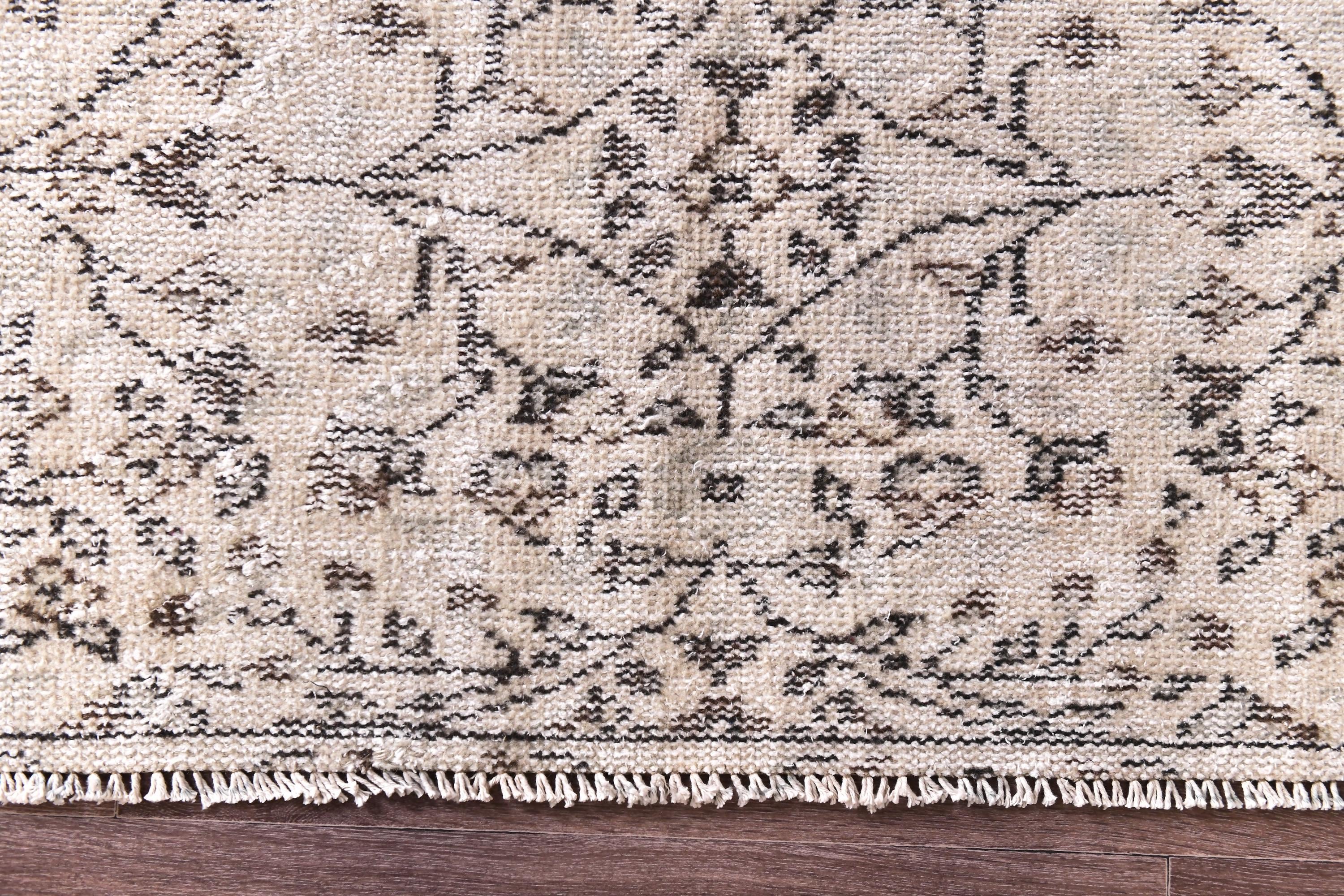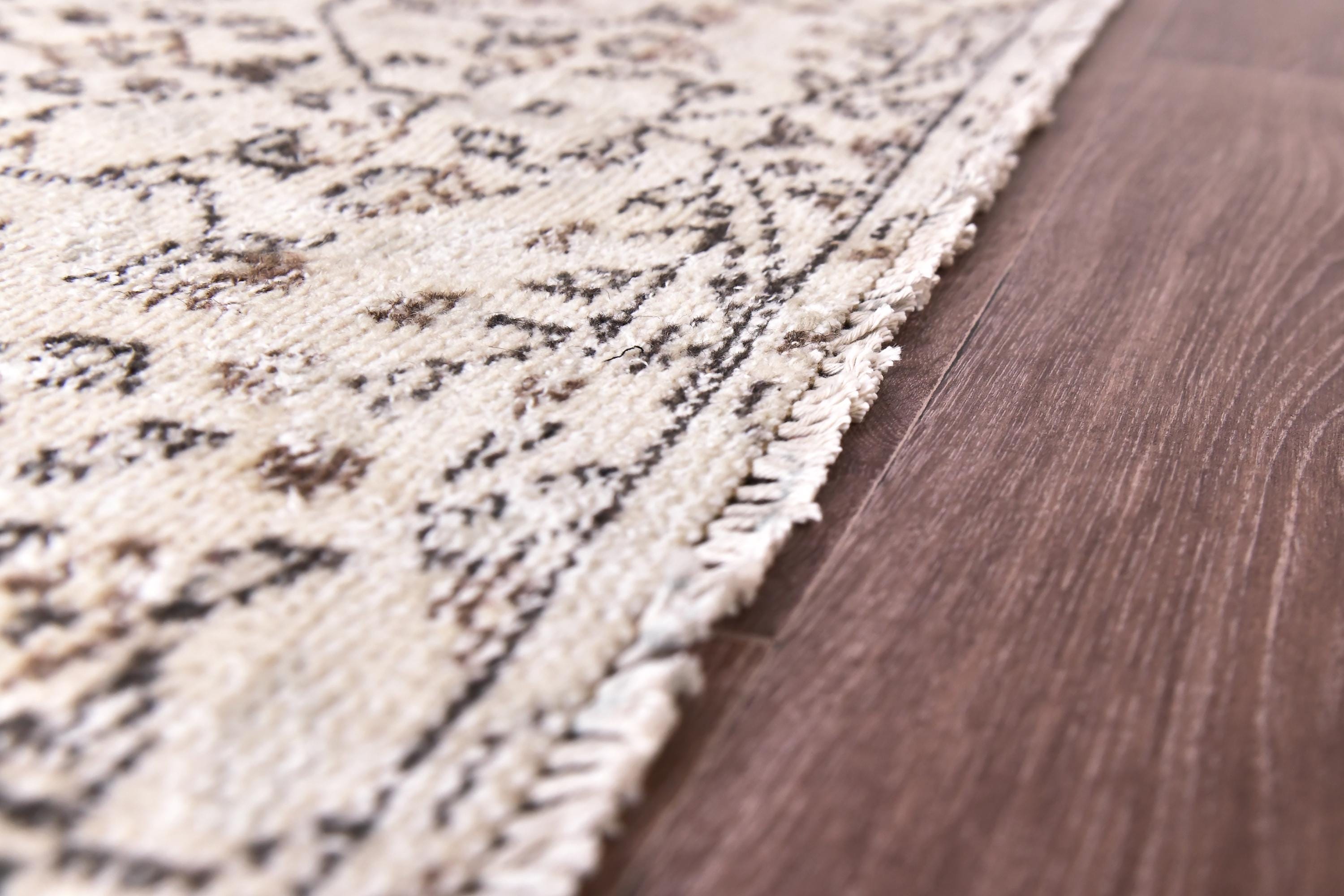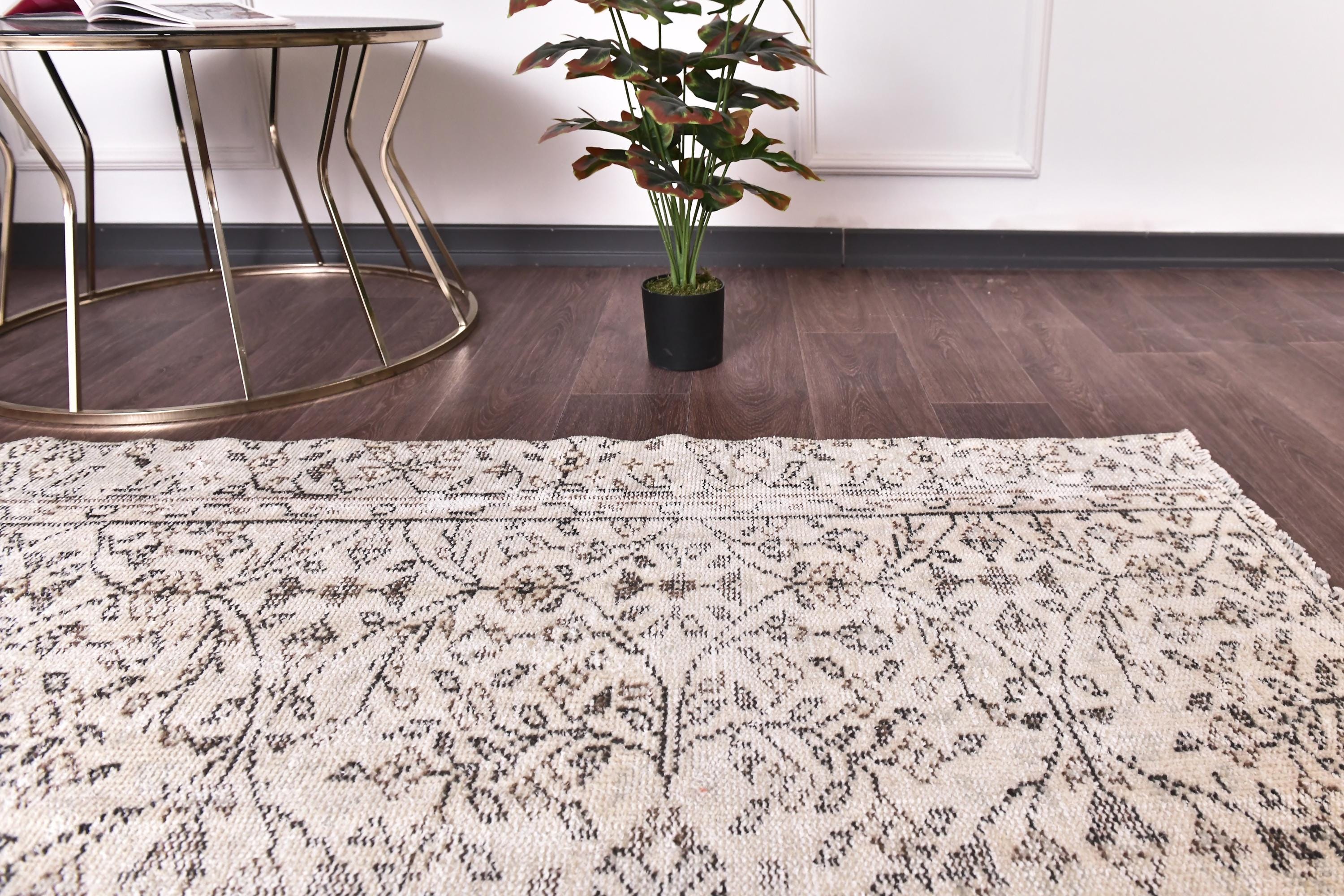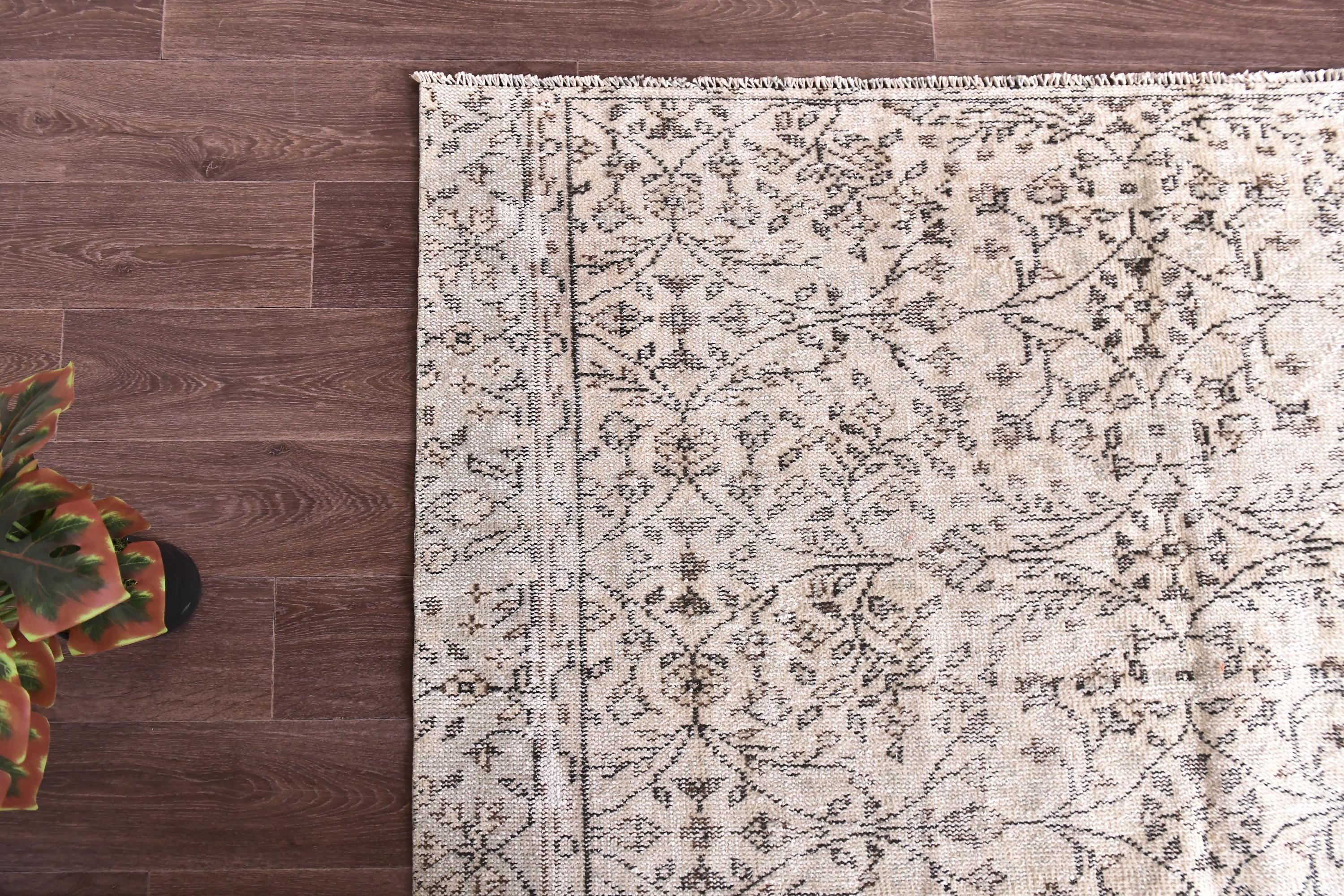 📜📌 Vintage Turkish whitewashed area rug featuring soft neutral palette with ivory cream base and pale gray brown undertones, showcasing traditional center medallion design with intricate floral vine patterns and ornate borders, hand-knotted low pile wool with intentionally faded whitewash treatment creating light airy appearance, perfect versatile foundation piece for shabby chic, modern farmhouse and coastal inspired interiors