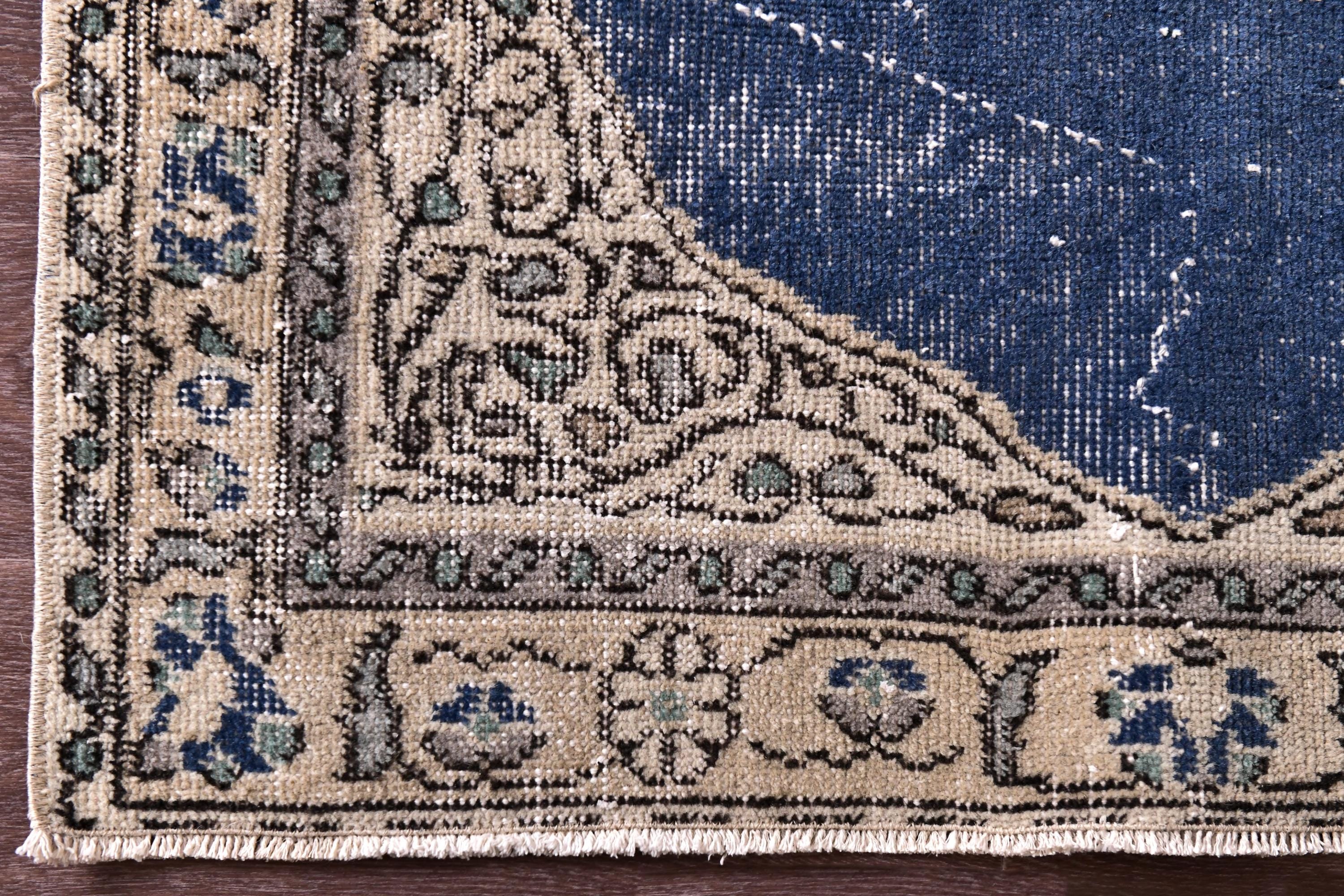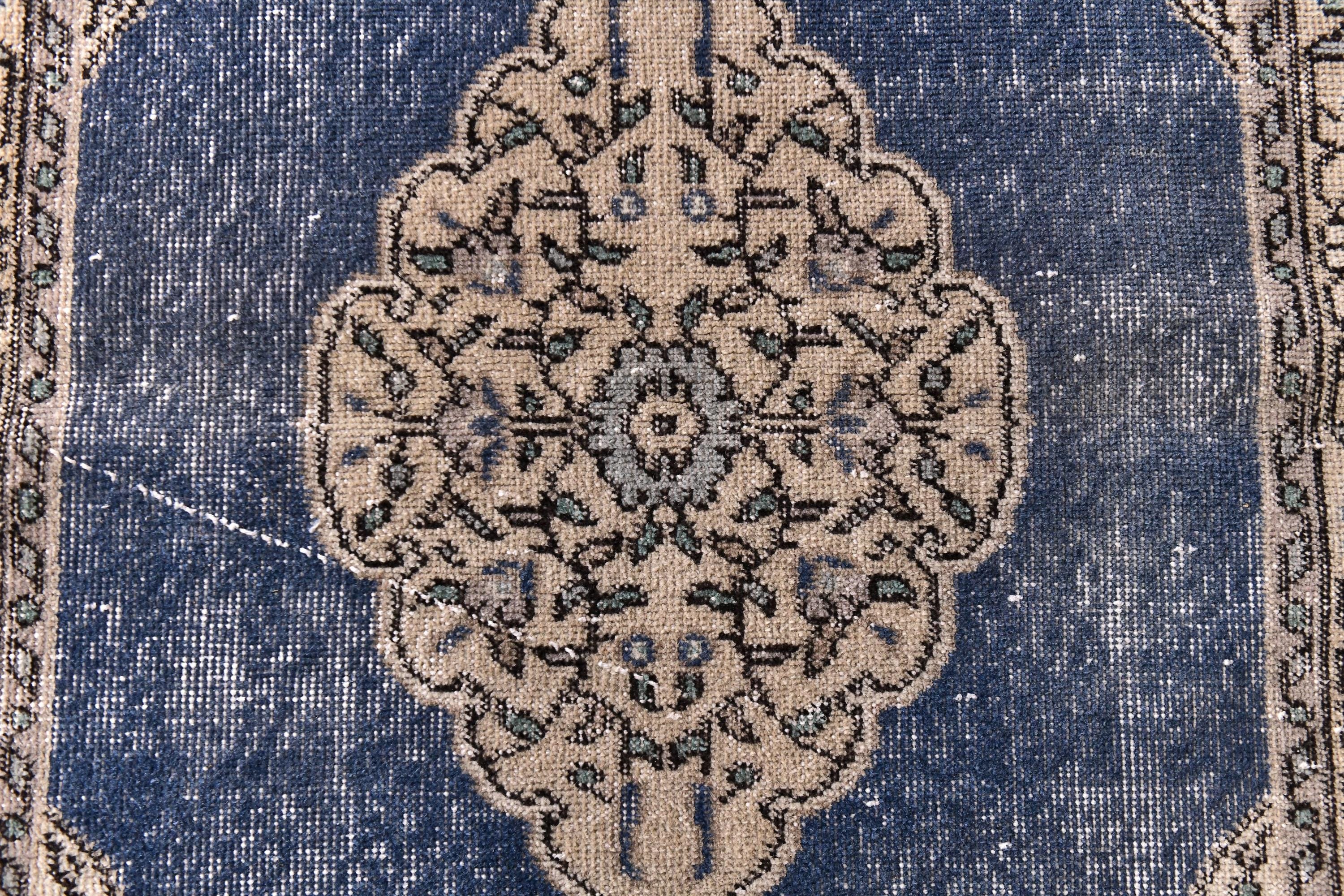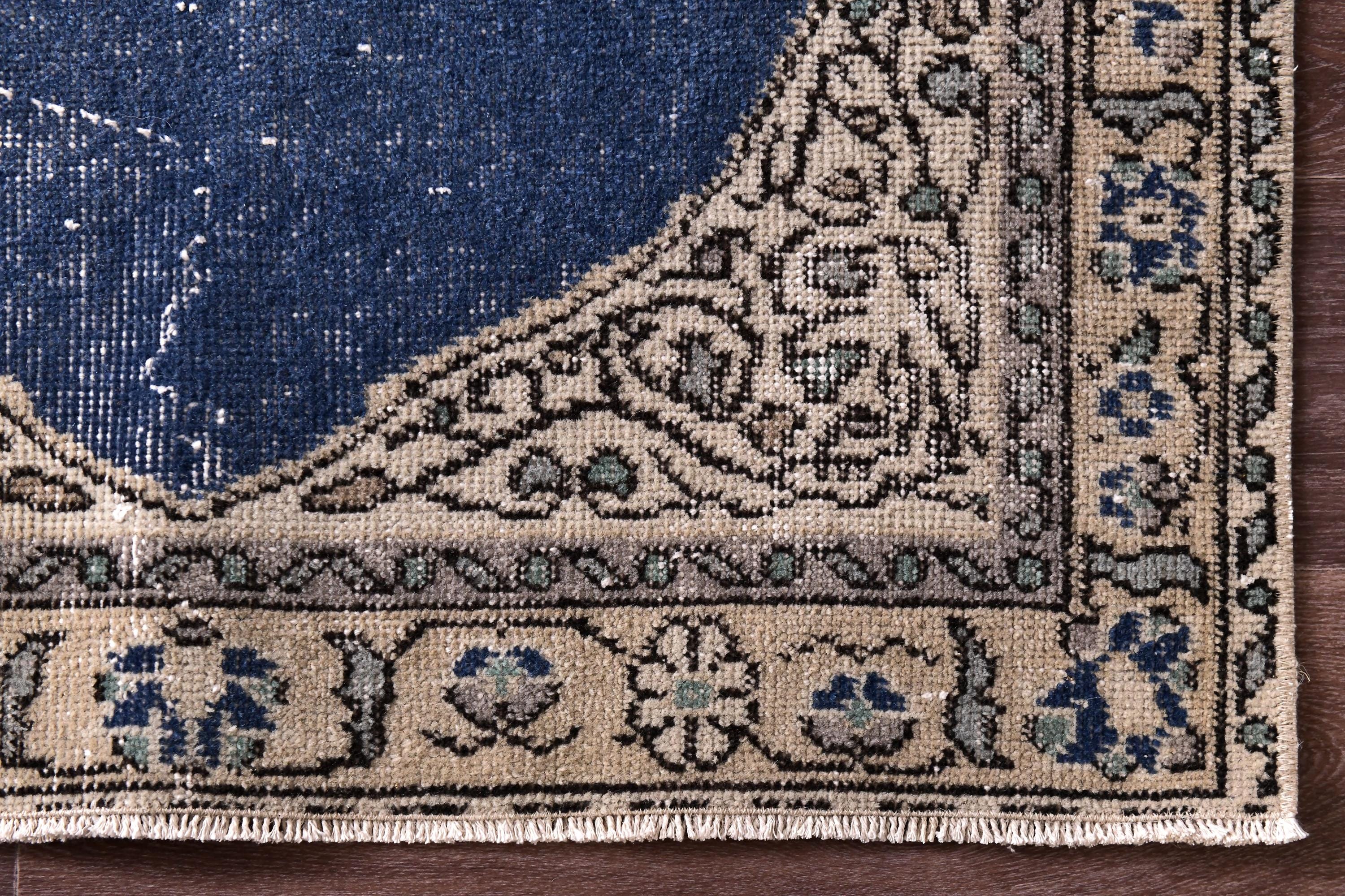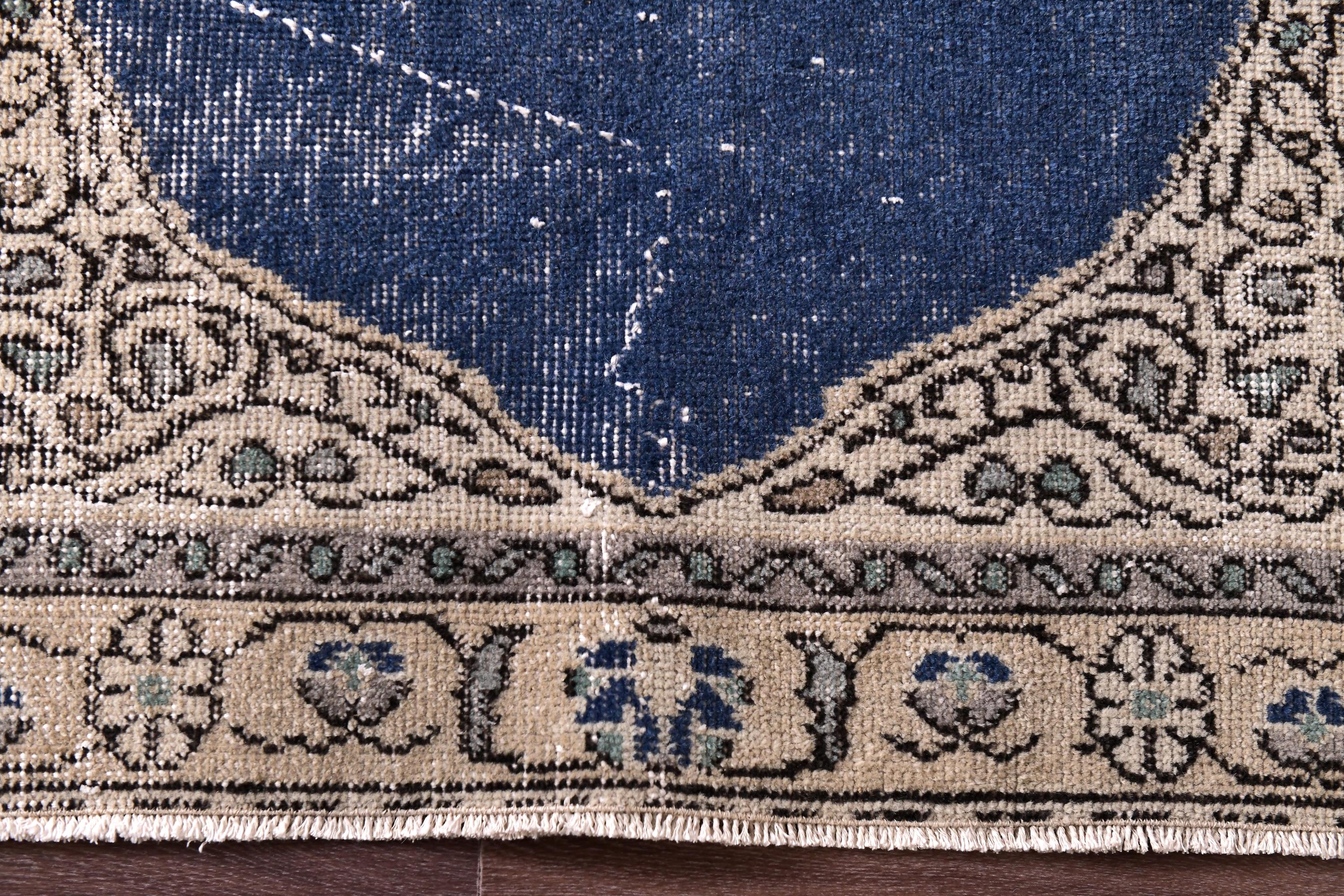 📜📌 Vintage Turkish small area rug featuring striking color contrast with deep navy blue field and cream beige borders, showcasing elegant center medallion with ornate floral design and spade-shaped mihrab niche pattern, hand-knotted low pile wool with naturally distressed texture and faded appearance, perfect versatile size for entryways, kitchen floors, small hallways, bedside placement and layering in bohemian and traditional interiors