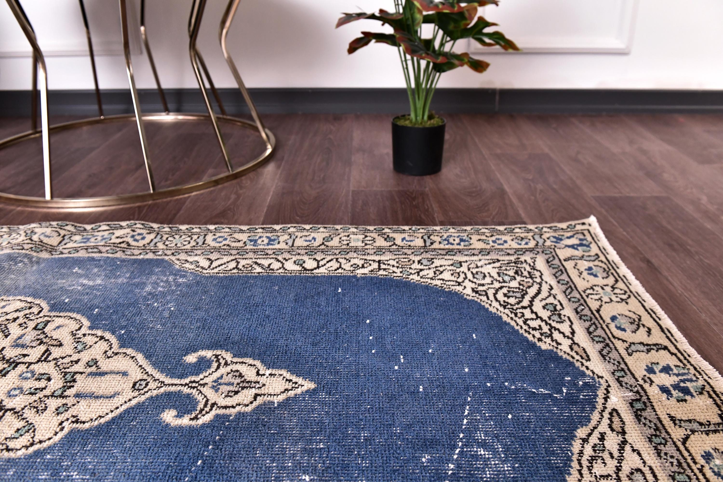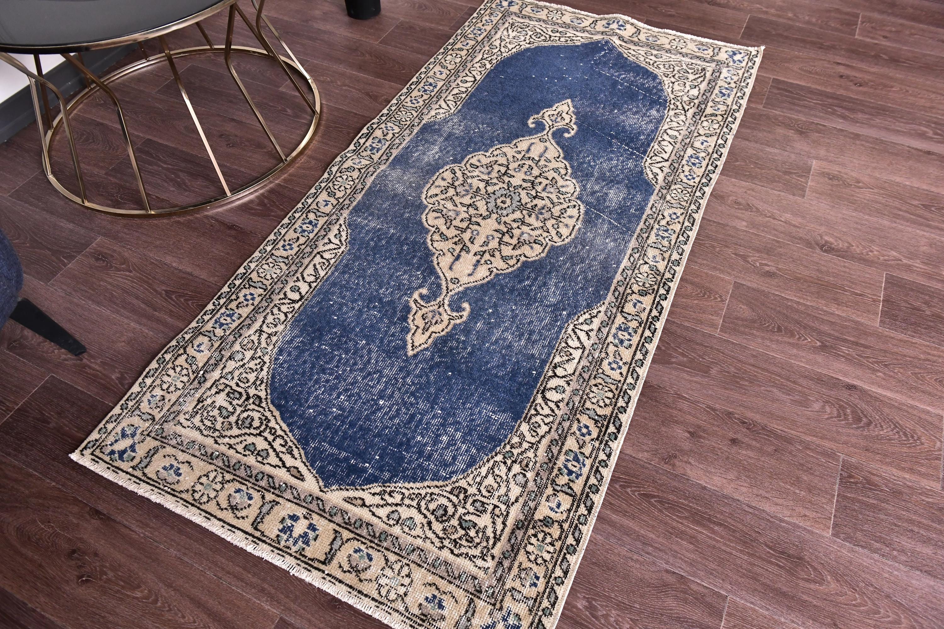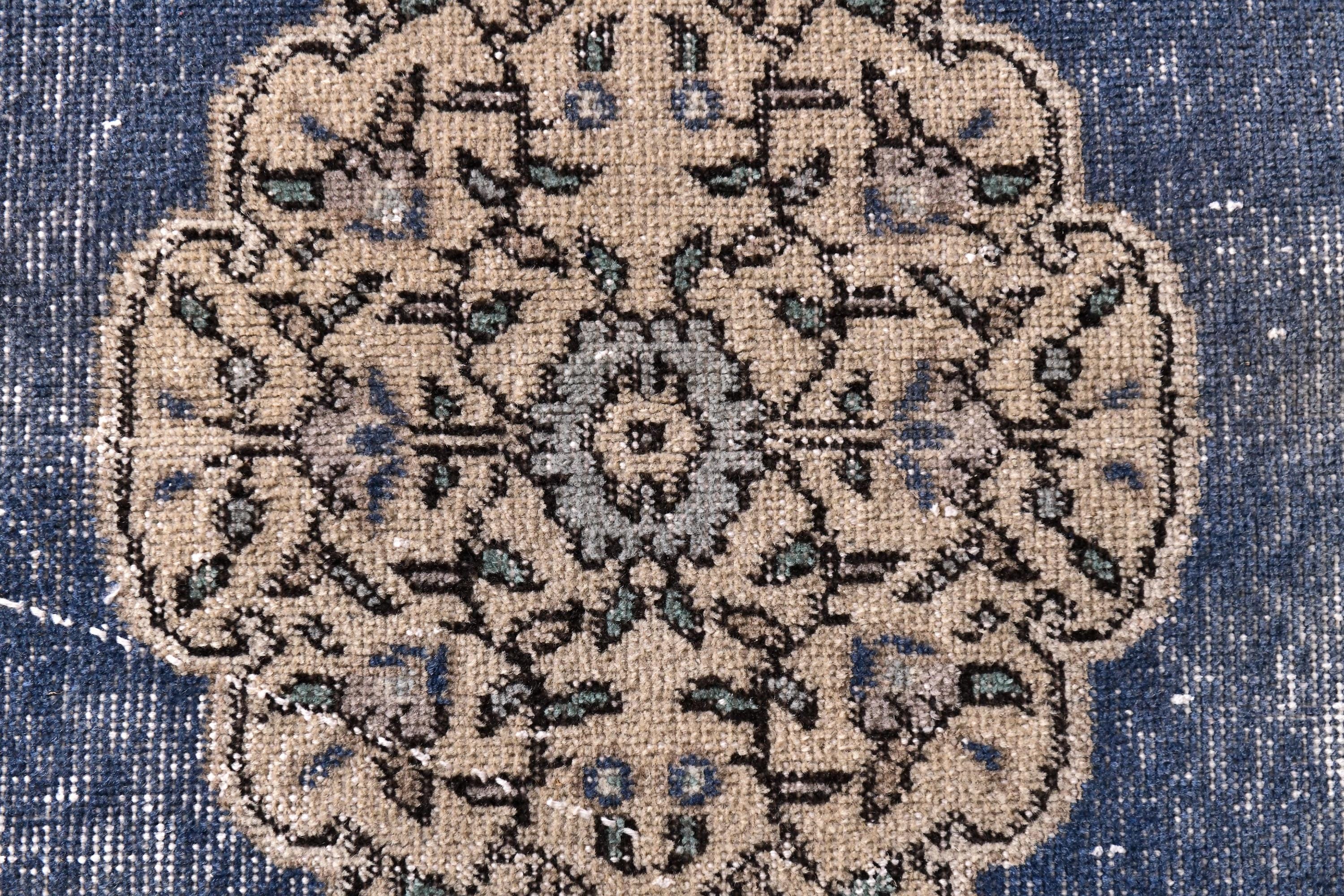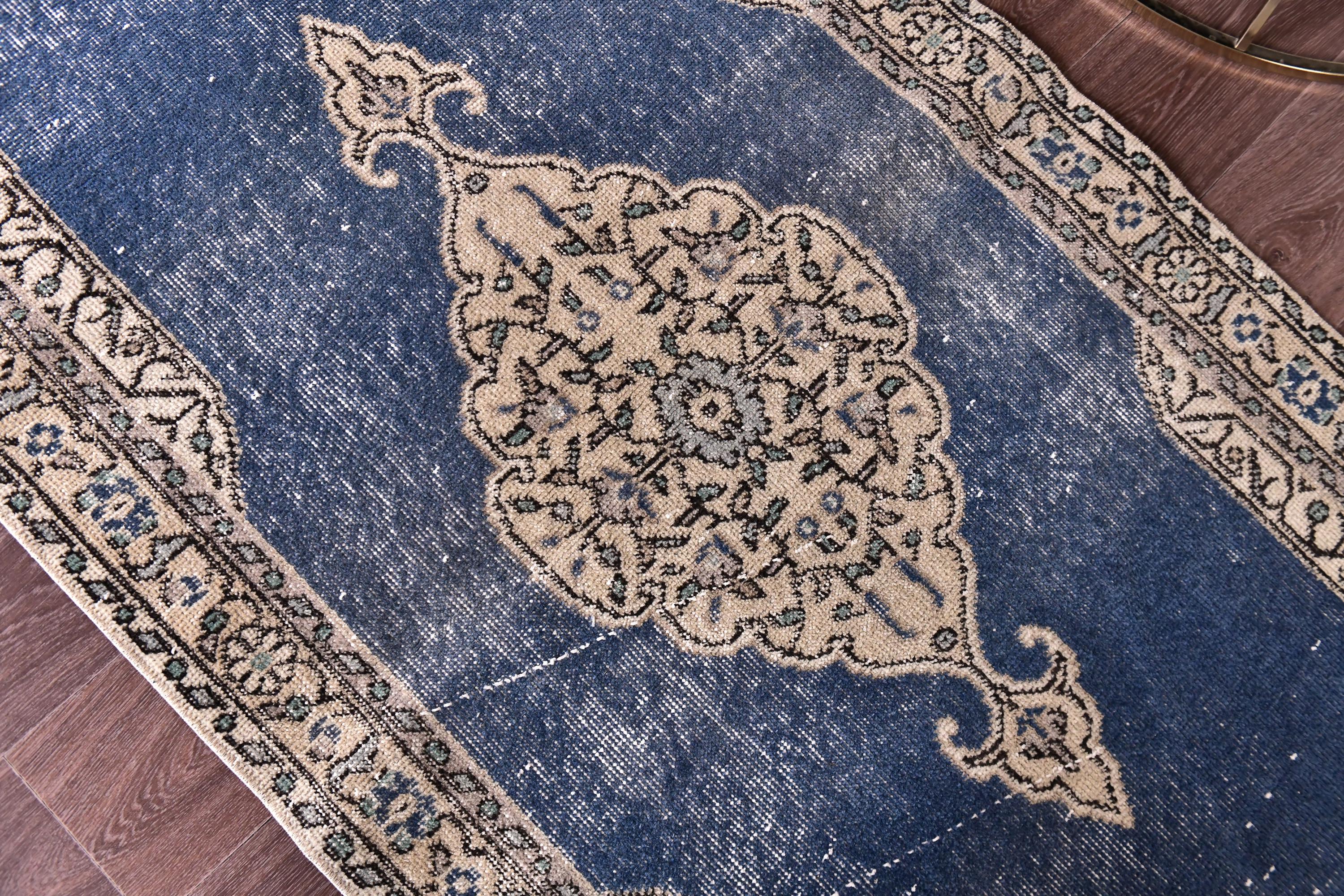 📜📌 Vintage Turkish small area rug featuring striking color contrast with deep navy blue field and cream beige borders, showcasing elegant center medallion with ornate floral design and spade-shaped mihrab niche pattern, hand-knotted low pile wool with naturally distressed texture and faded appearance, perfect versatile size for entryways, kitchen floors, small hallways, bedside placement and layering in bohemian and traditional interiors
