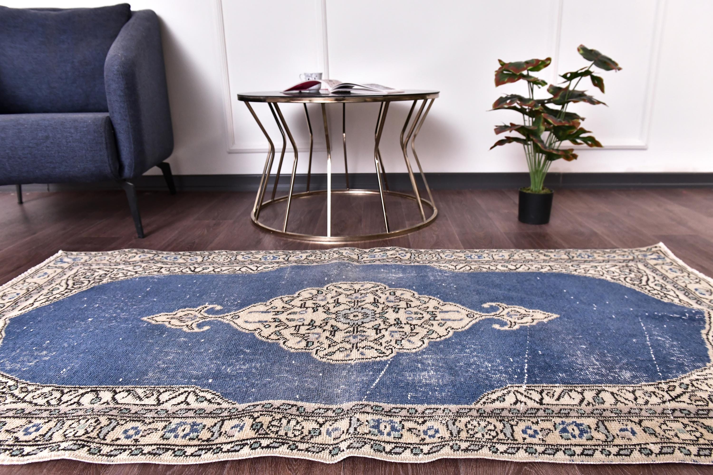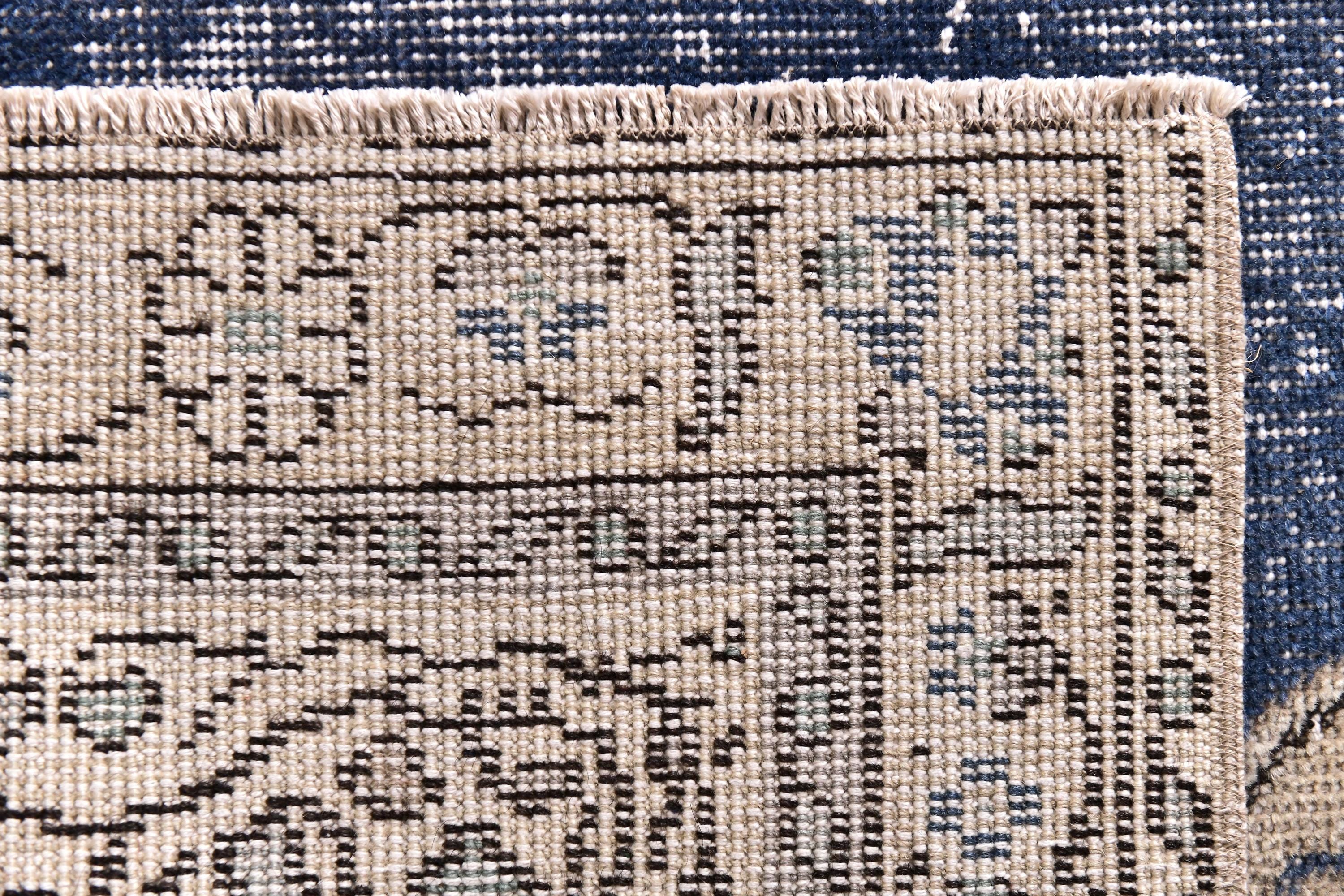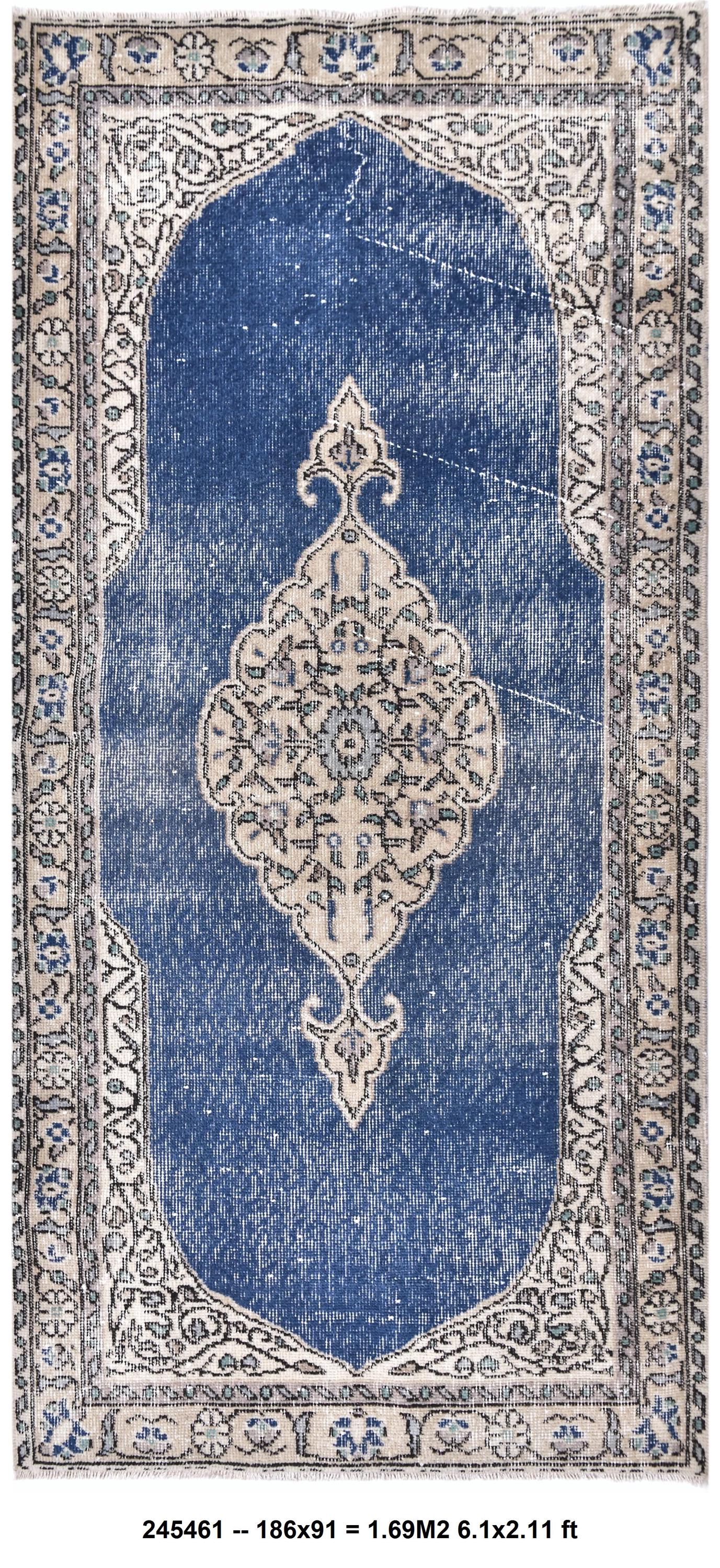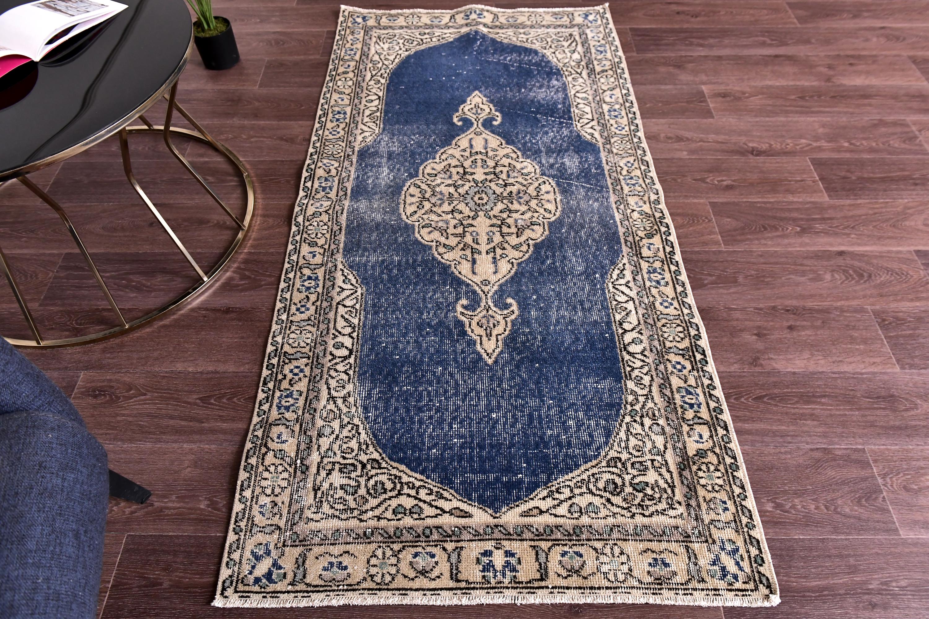 📜📌 Vintage Turkish small area rug featuring striking color contrast with deep navy blue field and cream beige borders, showcasing elegant center medallion with ornate floral design and spade-shaped mihrab niche pattern, hand-knotted low pile wool with naturally distressed texture and faded appearance, perfect versatile size for entryways, kitchen floors, small hallways, bedside placement and layering in bohemian and traditional interiors
